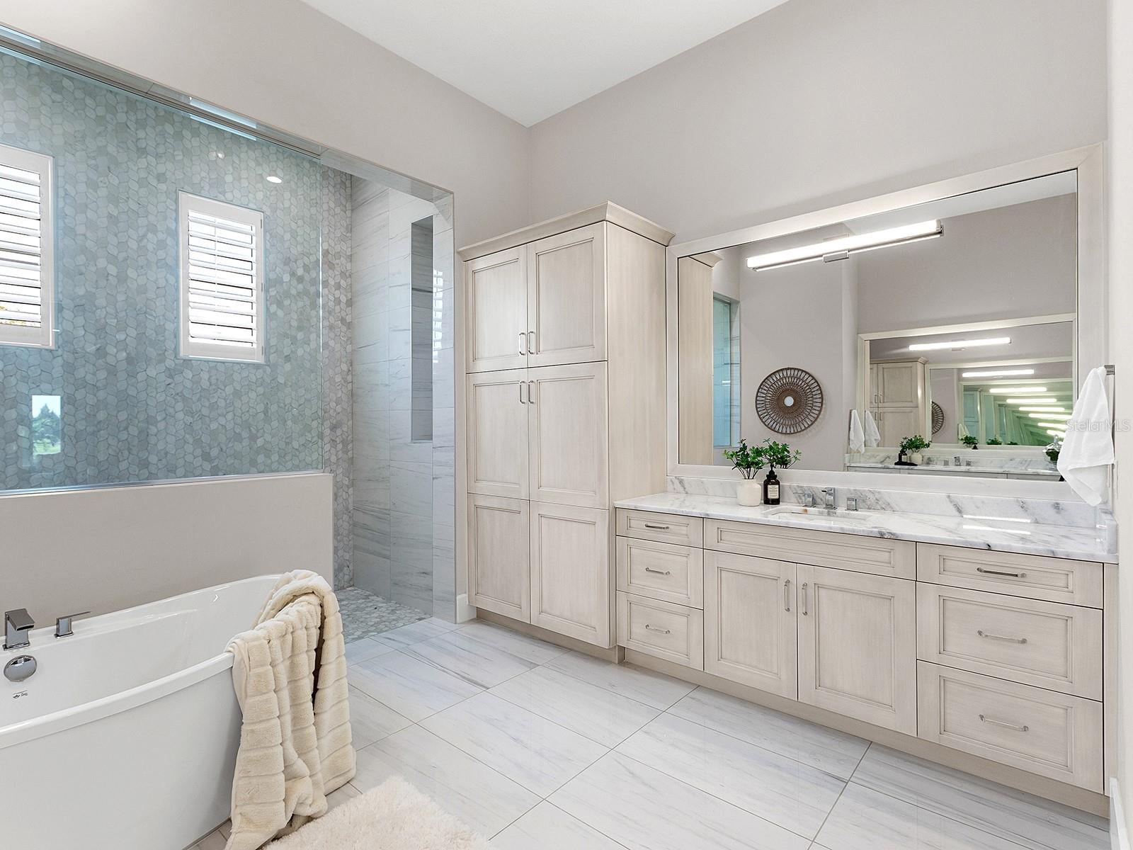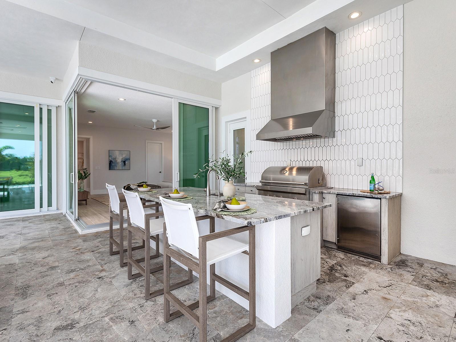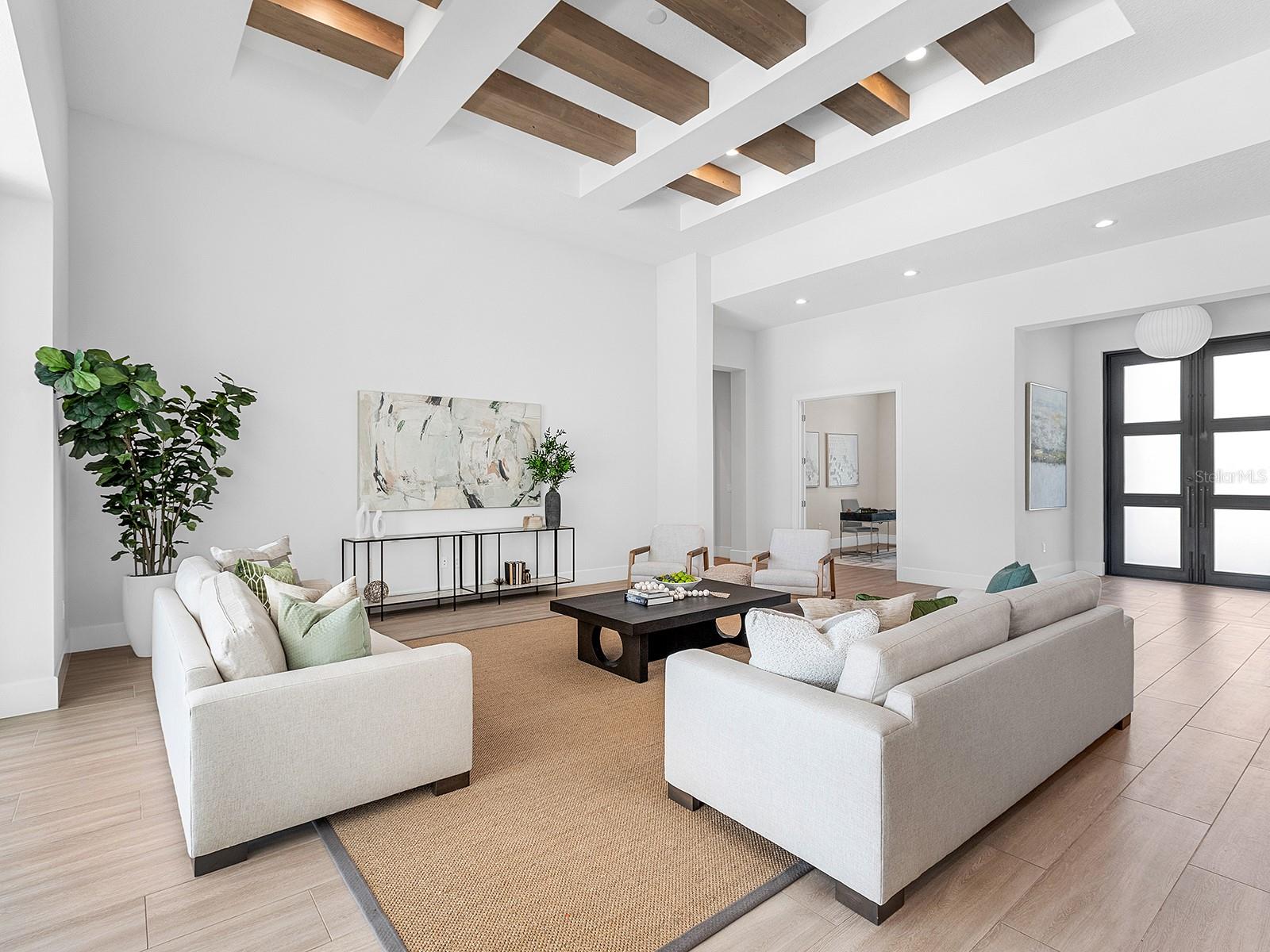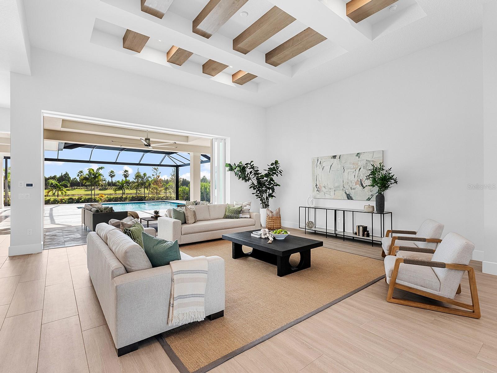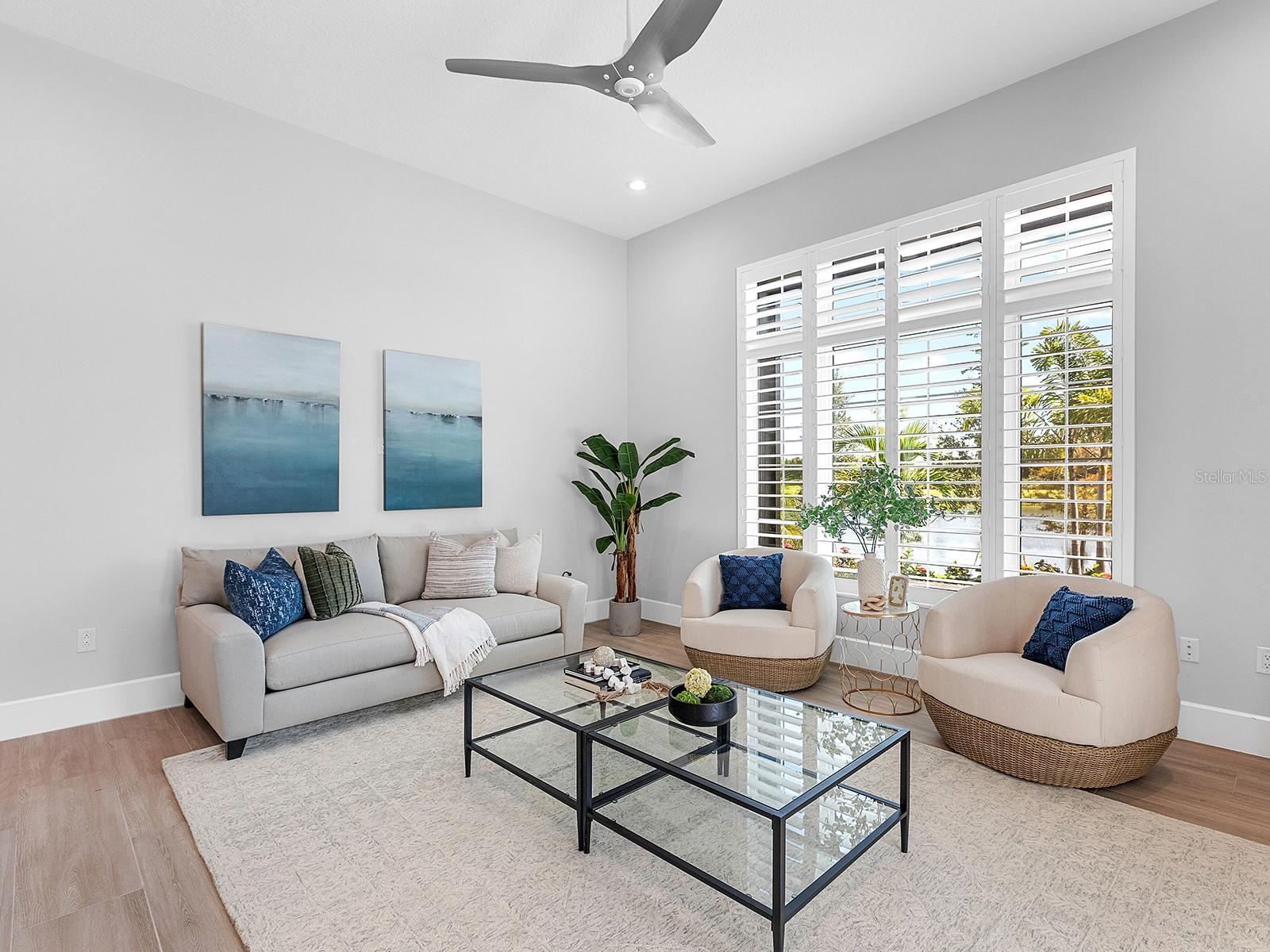 Welcome home to the ideal residence in The Lake Club with gorgeous private water views! One of the most desirable floor plans is this 2023 home offering a coveted separate casita guest house, plus a modern open plan, luxurious primary suite, 3 additional guest bedrooms all with private en-suite bathrooms, study, and expansive air-conditioned 3-car garage. The exterior invites you home with 2025 freshly painted exterior, updated lush landscaping, and wide driveway with parking pad. This residence is filled with clever upgrades that make daily life more enjoyable including IMPACT windows and sliders throughout, security camera system, Wi-Fi extenders, in-ceiling speakers, whole-house water filtration and softener system, Lutron lights, smart home systems, plantation shutters, and wood-look porcelain tile flooring throughout. The great room opens from the foyer with frosted impact glass front door straight onto the lanai through pocketing impact sliding glass doors, offering immediate views of the lake and greenspace beyond, plus a custom ceiling with hand-stained wood beams. The chef's kitchen offers impressive upgrades with an expanded island for extra seating, upscale quartzite counters, custom cabinetry, reverse osmosis, TWO custom walk-in pantries, and high-end appliance suite with 36" side-by-side Sub-Zero refrigerator and freezer, Bosch dishwasher, Wolf dual wall ovens, Wolf gas cooktop and Wolf microwave drawer. Enjoy meals in the dining room featuring a custom dry bar with wine refrigerator and disappearing corner impact sliders. This Florida home was made for an ideal indoor-outdoor entertaining lifestyle with covered dining and living areas on one of the largest lanais in the neighborhood at 3,382 SF. Relax under tray ceilings with oversized modern fans on the travertine lanai; lounge in the sunshine surrounded by the 2024 panoramic extra-strong stainless steel screen enclosure; or dine next to the outdoor kitchen complete with island, stone counters, reverse osmosis, and high-end appliances including Wolf grill, U-Line beverage refrigerator, separate ice maker and Bosch dishwasher. The sparkling saltwater pool is oversized, perfect for swimming laps or splashing in the afternoon, and features a sunken spa with spill-edge perfectly positioned to take in the lake views. Inside the owner's suite offers the ultimate relaxation with tray ceiling, seating area, French doors to the lanai with a porch area and two custom walk-in closets. The primary bathroom rivals a five-star hotel with separate vanities, large linen storage tower, water closet with Toto toilet, freestanding modern tub, walk-in shower with rainhead and 4 body sprayers. Guests will enjoy their own 3 bedrooms all with their own private and luxurious en-suite bathrooms. Plus the rear bedroom can be used as bonus room with a full pool bathroom for even more flexible spaces. The guest house casita is ideal for long-term guests, teens, live-in assistance, an in-law suite or a second office with a large studio bedroom, kitchenette wet bar, private lanai area and en-suite bathroom. Completing this residence is a private study, spacious laundry room with hidden ironing board and guest powder bathroom. The air-conditioned and insulated 3-car garage offers expanded room for cars and toys, 2 AC splitters, custom storage and a dual electric car charger. The Lake Club is an exclusive premier, gated community with a Grande Clubhouse, restaurant, pool, tennis, pickleball and more.