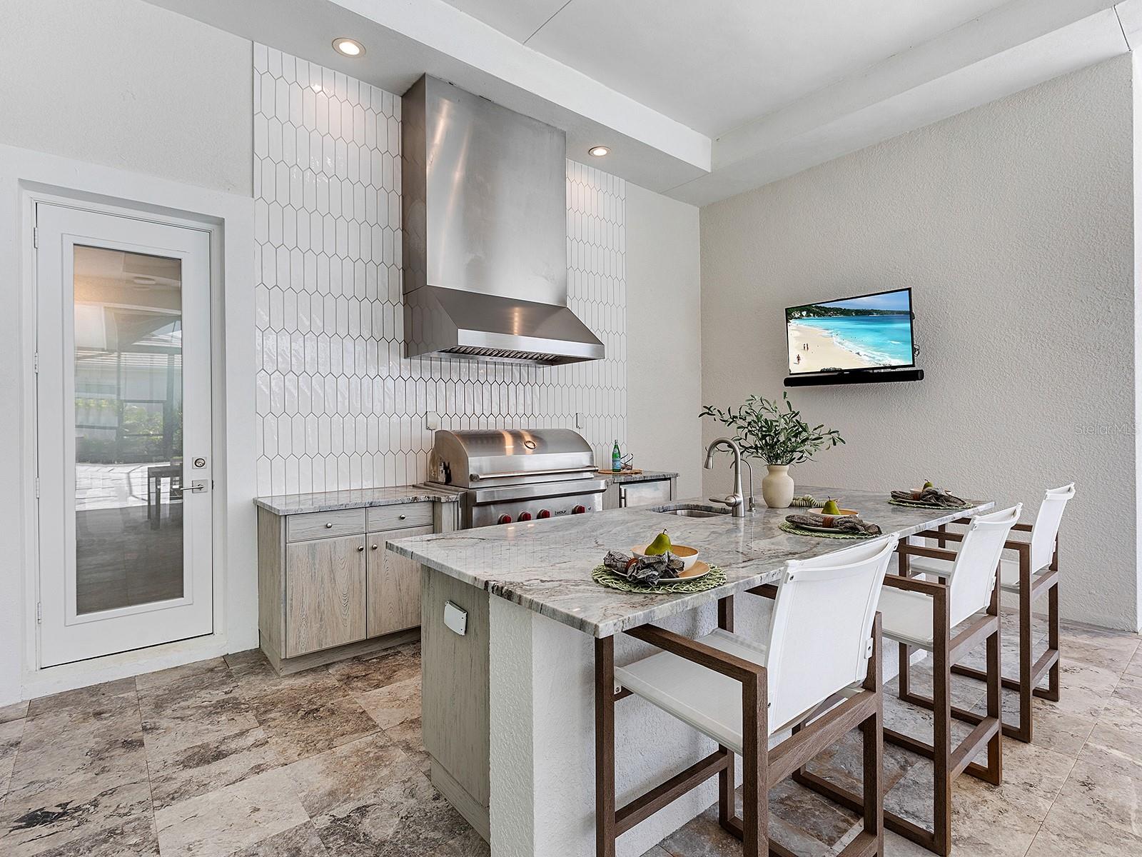 Exterior: French Doors, Lighting, Outdoor Grill, Outdoor Kitchen, Private Mailbox, Rain Gutters, Sidewalk, Sliding Doors