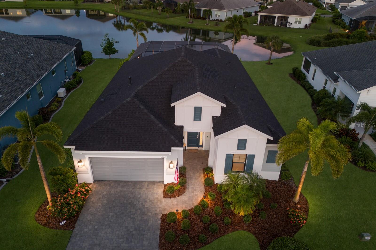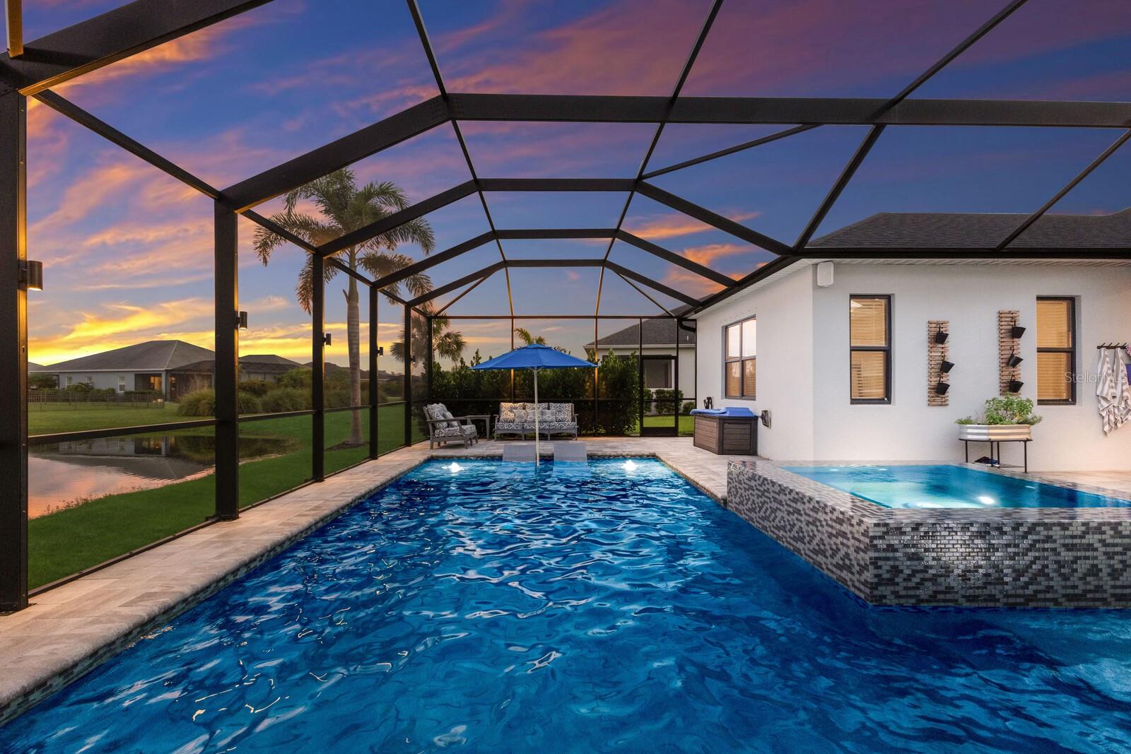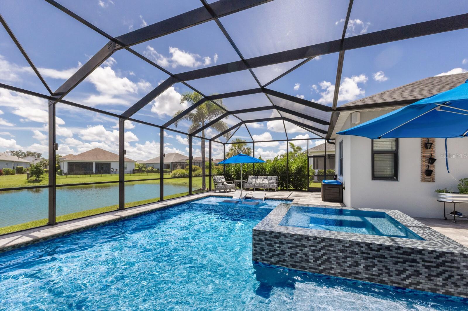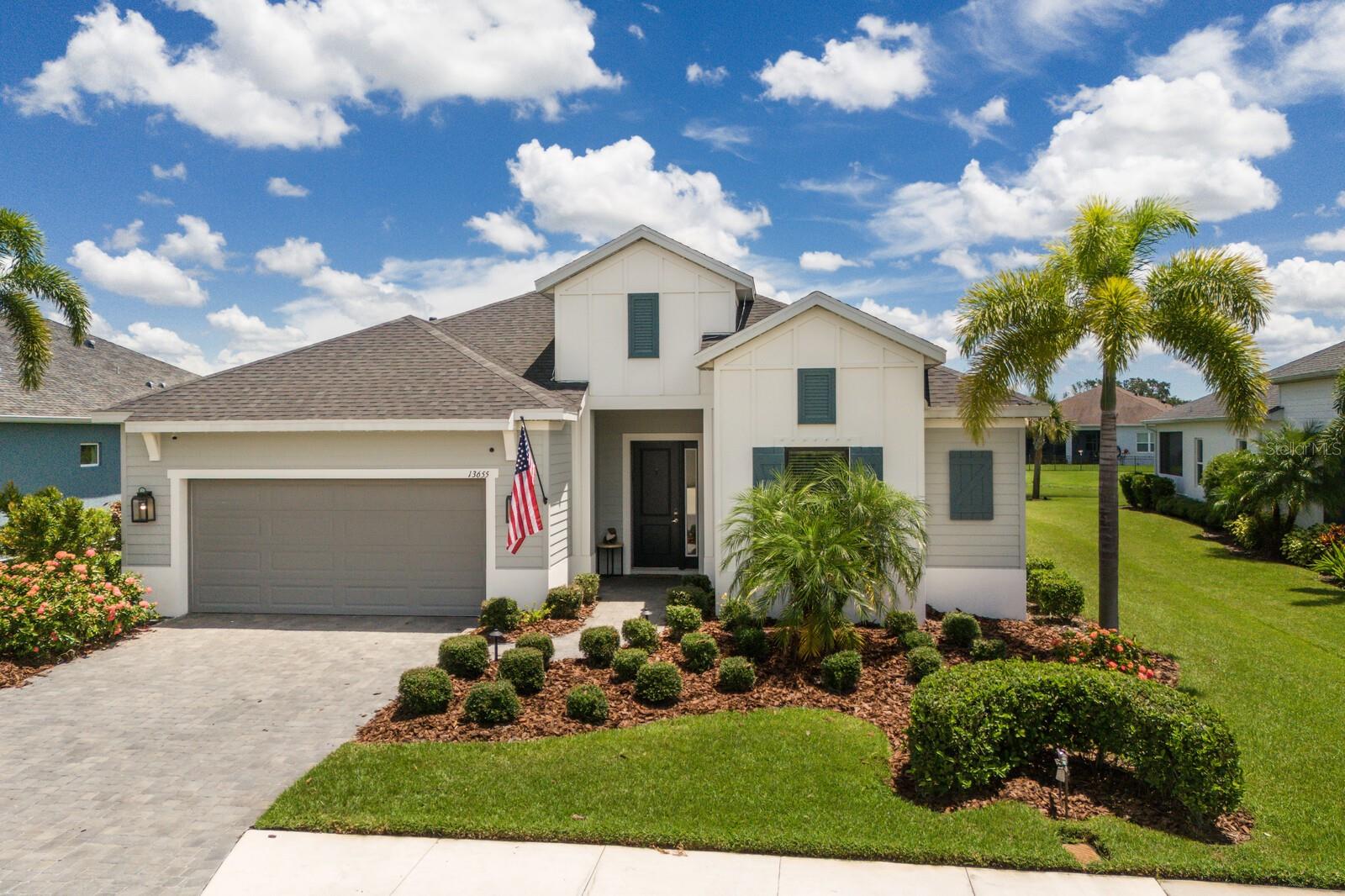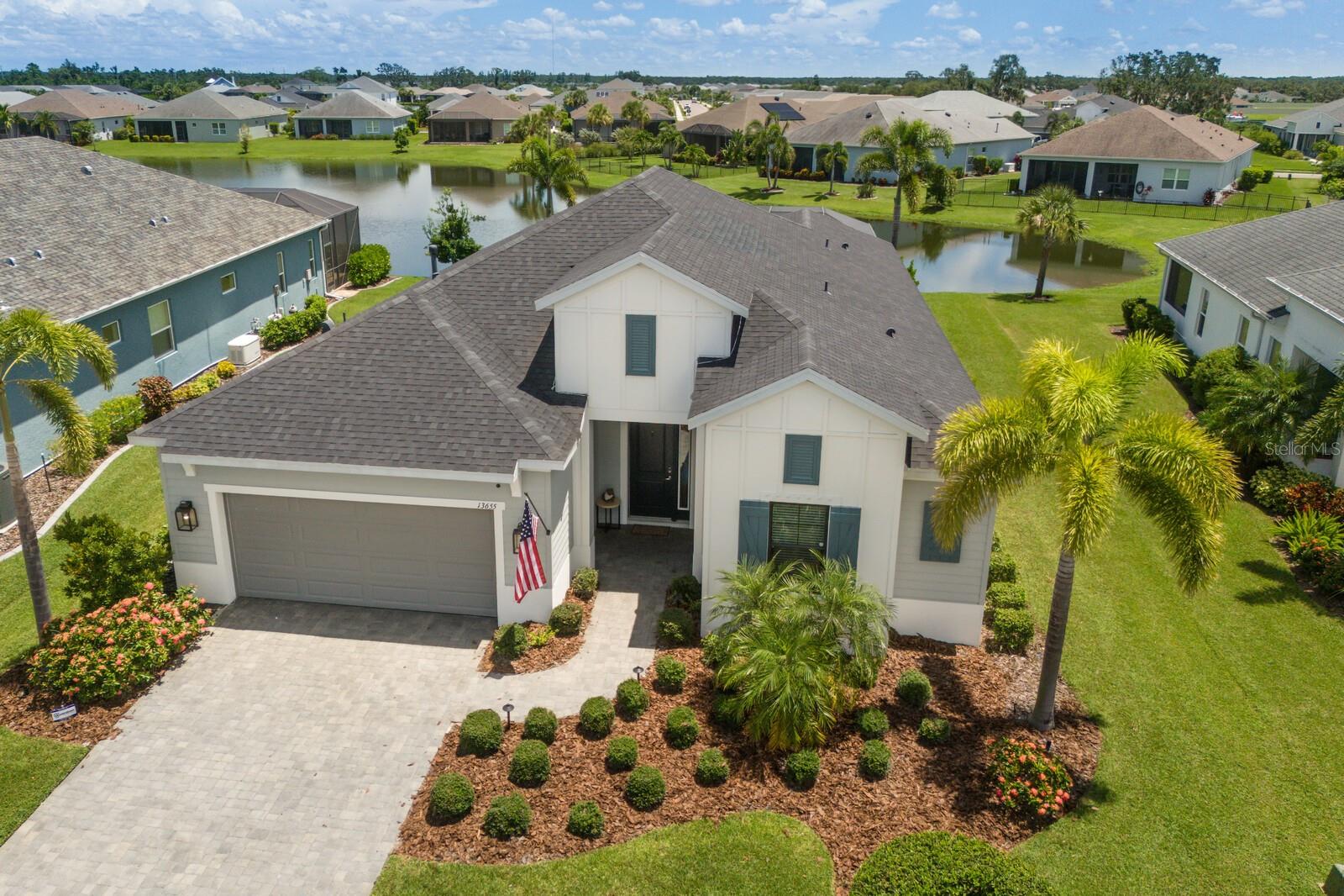 Welcome to this stunning, better-than-new 3 bedroom, 2 bath pool and spa smart home in the highly sought-after gated community of Canoe Creek. With NO CDD fees, this beautifully upgraded and well maintained home is perfectly positioned on a pie-shaped pond lot and showcases striking curb appeal with lush landscaping and a beautifully manicured lawn. Inside, a wide entryway opens to a bright, open floorplan with soaring 10 foot ceilings & no carpet - only ceramic tile & NEWER luxury vinyl plank floors throughout, perfect for those with allergies or pets. The formal dining room features a gorgeous modern chandelier & plenty of space for a large formal dining set. Adjacent is the great room, with a gorgeous octagonal tray ceiling & NEWER (2023) custom stacked stone wall. Off the great room, a large flex room with glass French doors is the perfect space to use as an office, home gym, playroom, or even a 4th bedroom. Overlooking the great room is your beautifully appointed kitchen, featuring 42" cabinetry with pull-out shelving, quartz counters, subway tile backsplash, sink w/newer matte onyx modern faucet, eat-in cafe/nook for casual dining, & dedicated pantry. Stainless appliances, including range w/gas cooktop & a 4-zoned Samsung refrigerator, make cooking a pleasure in this modern culinary space. Sliders off the great room lead to your backyard paradise - the NEARLY NEW (2023) heated smart saltwater pool & champagne spillover spa, complete w/double sun shelf & bubblers, inviting you to unwind while enjoying panoramic views of the tranquil pond. Control everything effortlessly from your phone, from your spa jets to LED pool lighting, to the NEW LED lights on the pool cage (2024) & NEW landscaping lighting (2024). Listen to your favorite tunes while relaxing in your pool with the NEW Sonos amp & lanai speakers that were just installed in 2024. Surrounded by tropical palms & privacy hedges, this private oasis is ideal for entertaining or enjoying a peaceful moment soaking up the Florida sunshine. The Primary Retreat at the back of the home is a serene, sunlit space with views of the lanai. It features two walk-in closets and a spacious en-suite bath w/huge walk-in shower, dual sinks, NEW (2025) lighting, custom mirrors, NEWER faucets (2023), & private water closet. Just off the foyer are two spacious bedrooms with a full bathroom in between that includes NEWER (2023) upgraded matte onyx faucet. The laundry room is conveniently situated just off the kitchen and includes Samsung top-loader washer & gas dryer, as well as handy linen closet. Additional notable upgrades include NEW (2025) ceiling fans; NEW (2025) exterior & interior paint; NEW pool screens (2025); NEW surge protector on breaker box (2024); NEWER (2023) security cameras; NEWLY cleaned/sealed pavered driveway, lanai, & interior grout (2025); 5 1/4" baseboards throughout; LED dimmer switches; gas water heater; epoxy garage floors; & overhead storage rack in garage. Situated in highly desirable Canoe Creek, this master planned gated community is perfect for those looking for the active lifestyle in a vibrant neighborhood, featuring a large clubhouse with fitness center, resort style pool & spa, a full time lifestyle director, pickleball courts, 2 dog parks, fire pit, walking trails, and a robust social calendar. Just minutes from world-class shopping, dining, state parks, and Gulf Coast beaches, this home offers the perfect combination of luxury, convenience, and coastal living.