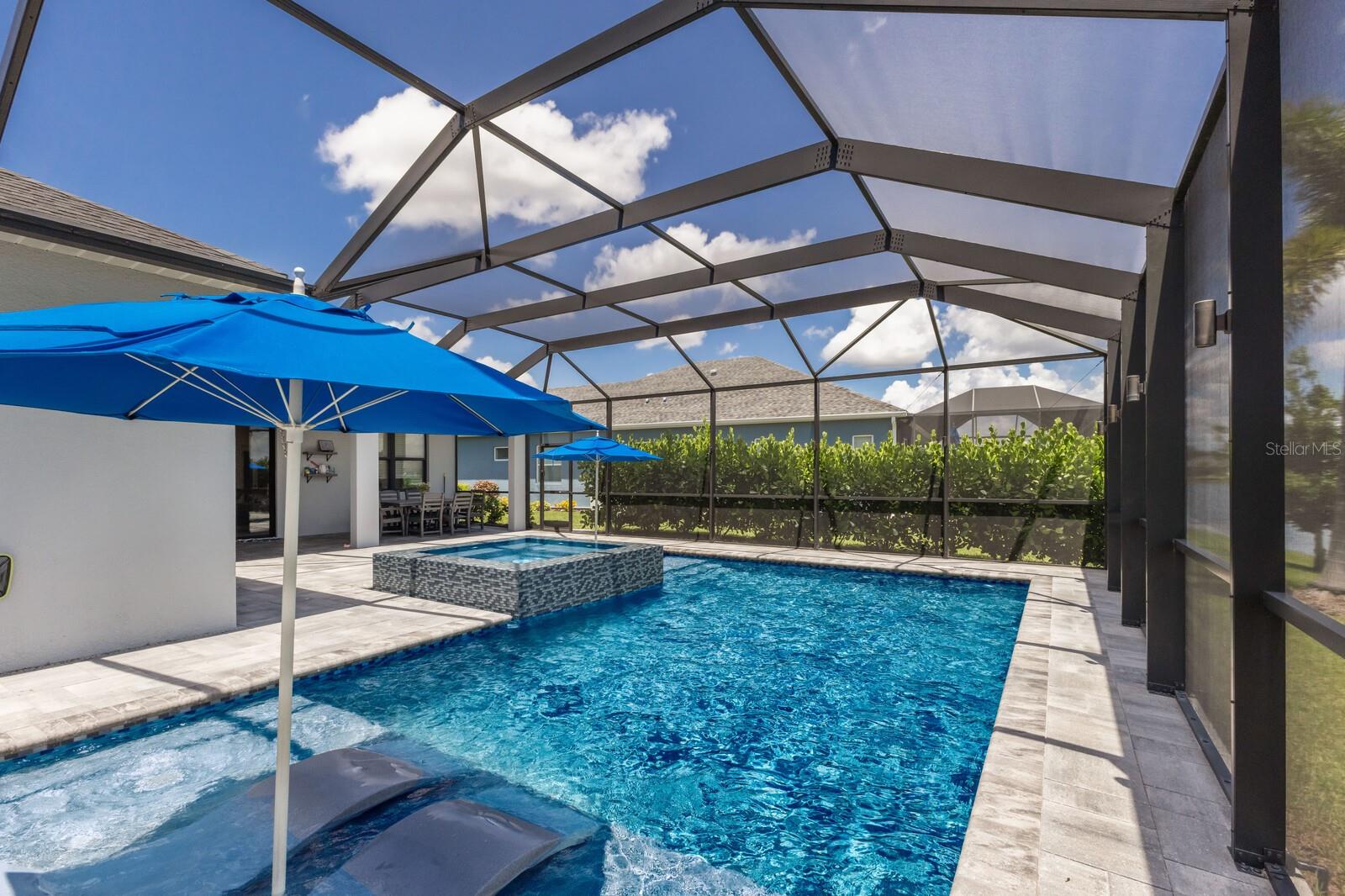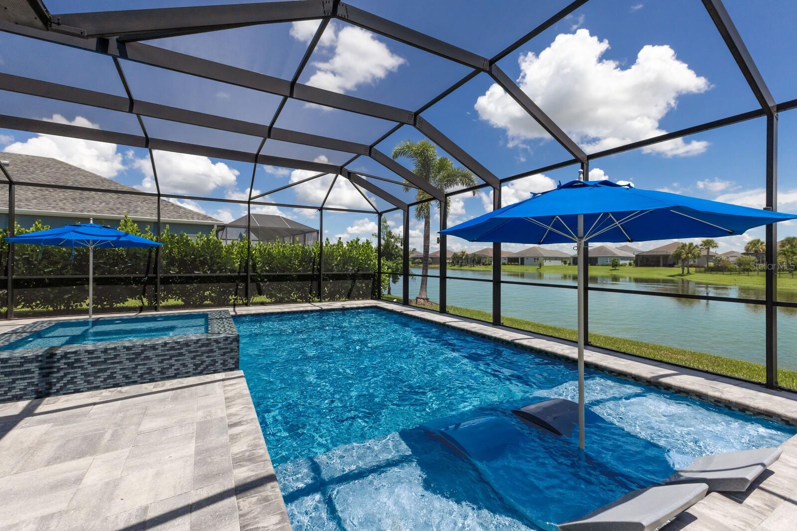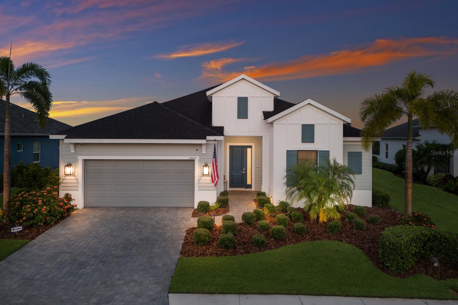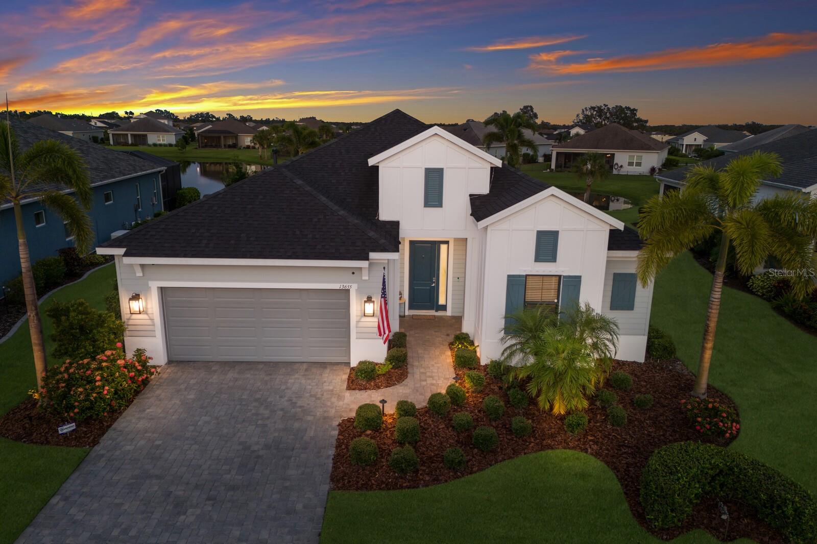 Welcome to this stunning, better-than-new 3 bedroom, 2 bath pool and spa smart home in the highly sought-after gated community of Canoe Creek. With NO CDD fees, this beautifully upgraded and well maintained home is perfectly positioned on a pie-shaped pond lot and showcases striking curb appeal with lush landscaping and a beautifully manicured lawn. Inside, a wide entryway opens to a bright, open floorplan with soaring 10 foot ceilings & no carpet - only ceramic tile & NEWER luxury vinyl plank floors throughout, perfect for those with allergies or pets. The formal dining room features a gorgeous modern chandelier & plenty of space for a large formal dining set. Adjacent is the great room, with a gorgeous octagonal tray ceiling & NEWER (2023) custom stacked stone wall. Off the great room, a large flex room with glass French doors is the perfect space to use as an office, home gym, playroom, or even a 4th bedroom. Overlooking the great room is your beautifully appointed kitchen, featuring 42" cabinetry with pull-out shelving, quartz counters, subway tile backsplash, sink w/newer matte onyx modern faucet, eat-in cafe/nook for casual dining, & dedicated pantry. Stainless appliances, including range w/gas cooktop & a 4-zoned Samsung refrigerator, make cooking a pleasure in this modern culinary space. Sliders off the great room lead to your backyard paradise - the NEARLY NEW (2023) heated smart saltwater pool & champagne spillover spa, complete w/double sun shelf & bubblers, inviting you to unwind while enjoying panoramic views of the tranquil pond. Control everything effortlessly from your phone, from your spa jets to LED pool lighting, to the NEW LED lights on the pool cage (2024) & NEW landscaping lighting (2024). Listen to your favorite tunes while relaxing in your pool with the NEW Sonos amp & lanai speakers that were just installed in 2024. Surrounded by tropical palms & privacy hedges, this private oasis is ideal for entertaining or enjoying a peaceful moment soaking up the Florida sunshine. The Primary Retreat at the back of the home is a serene, sunlit space with views of the lanai. It features two walk-in closets and a spacious en-suite bath w/huge walk-in shower, dual sinks, NEW (2025) lighting, custom mirrors, NEWER faucets (2023), & private water closet. Just off the foyer are two spacious bedrooms with a full bathroom in between that includes NEWER (2023) upgraded matte onyx faucet. The laundry room is conveniently situated just off the kitchen and includes Samsung top-loader washer & gas dryer, as well as handy linen closet. Additional notable upgrades include NEW (2025) ceiling fans; NEW (2025) exterior & interior paint; NEW pool screens (2025); NEW surge protector on breaker box (2024); NEWER (2023) security cameras; NEWLY cleaned/sealed pavered driveway, lanai, & interior grout (2025); 5 1/4" baseboards throughout; LED dimmer switches; gas water heater; epoxy garage floors; & overhead storage rack in garage. Situated in highly desirable Canoe Creek, this master planned gated community is perfect for those looking for the active lifestyle in a vibrant neighborhood, featuring a large clubhouse with fitness center, resort style pool & spa, a full time lifestyle director, pickleball courts, 2 dog parks, fire pit, walking trails, and a robust social calendar. Just minutes from world-class shopping, dining, state parks, and Gulf Coast beaches, this home offers the perfect combination of luxury, convenience, and coastal living.