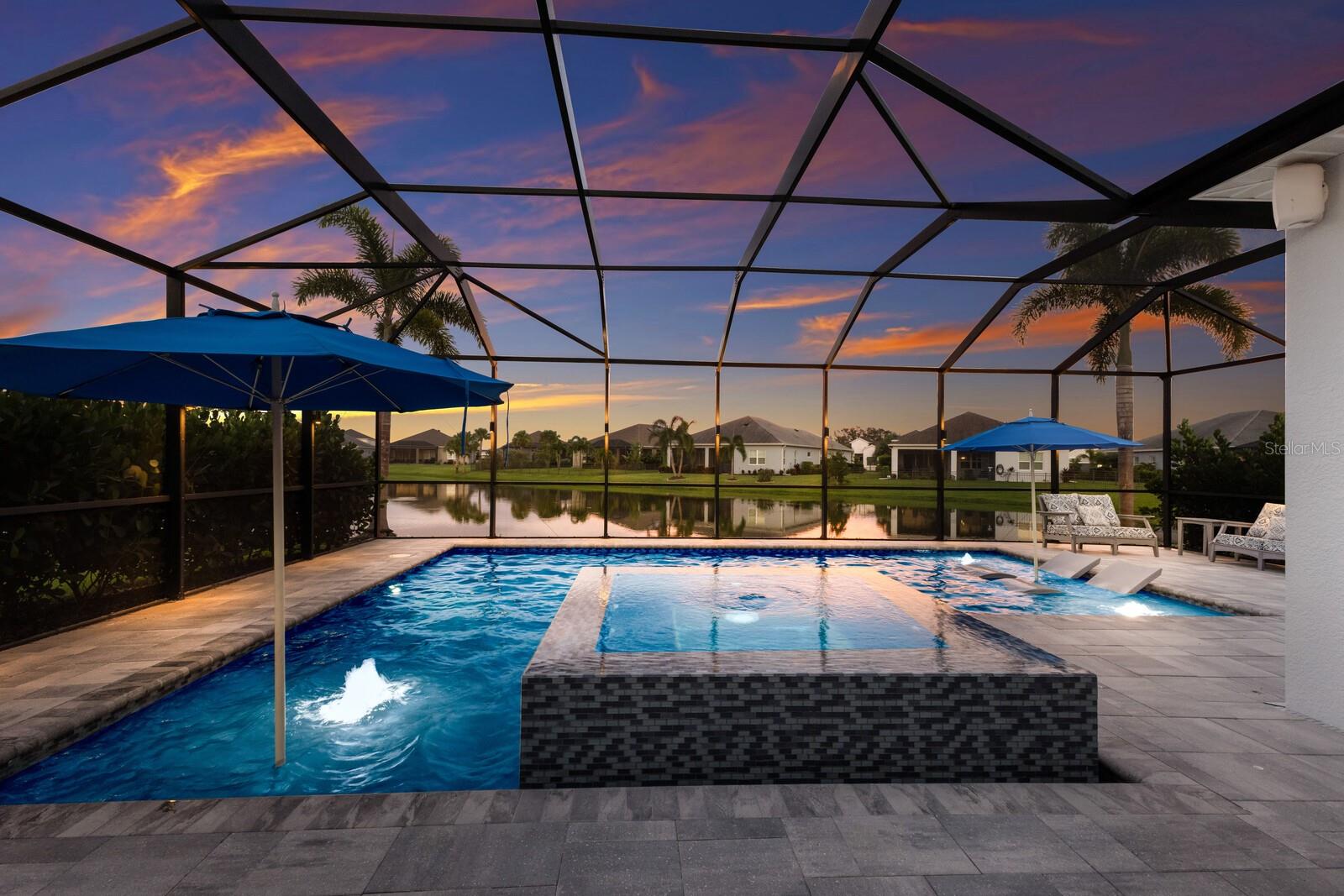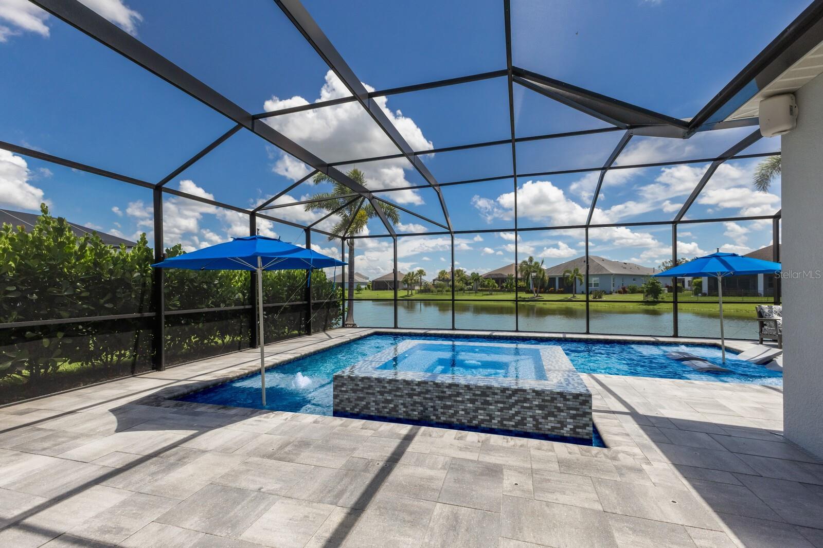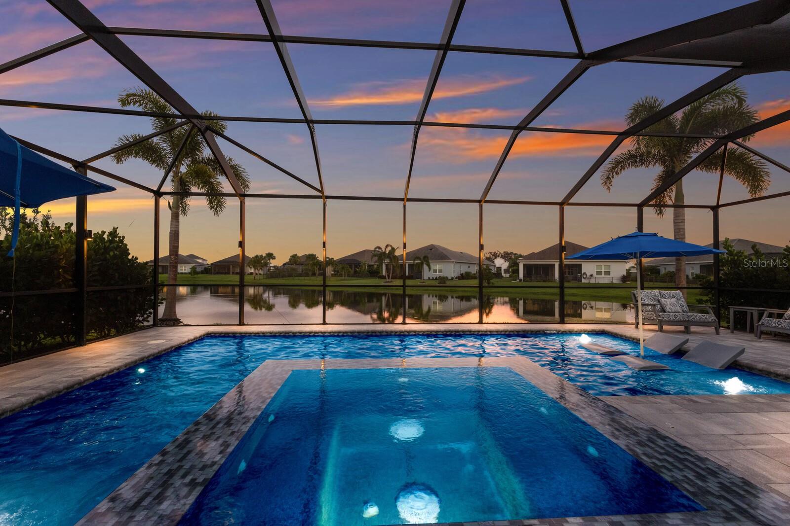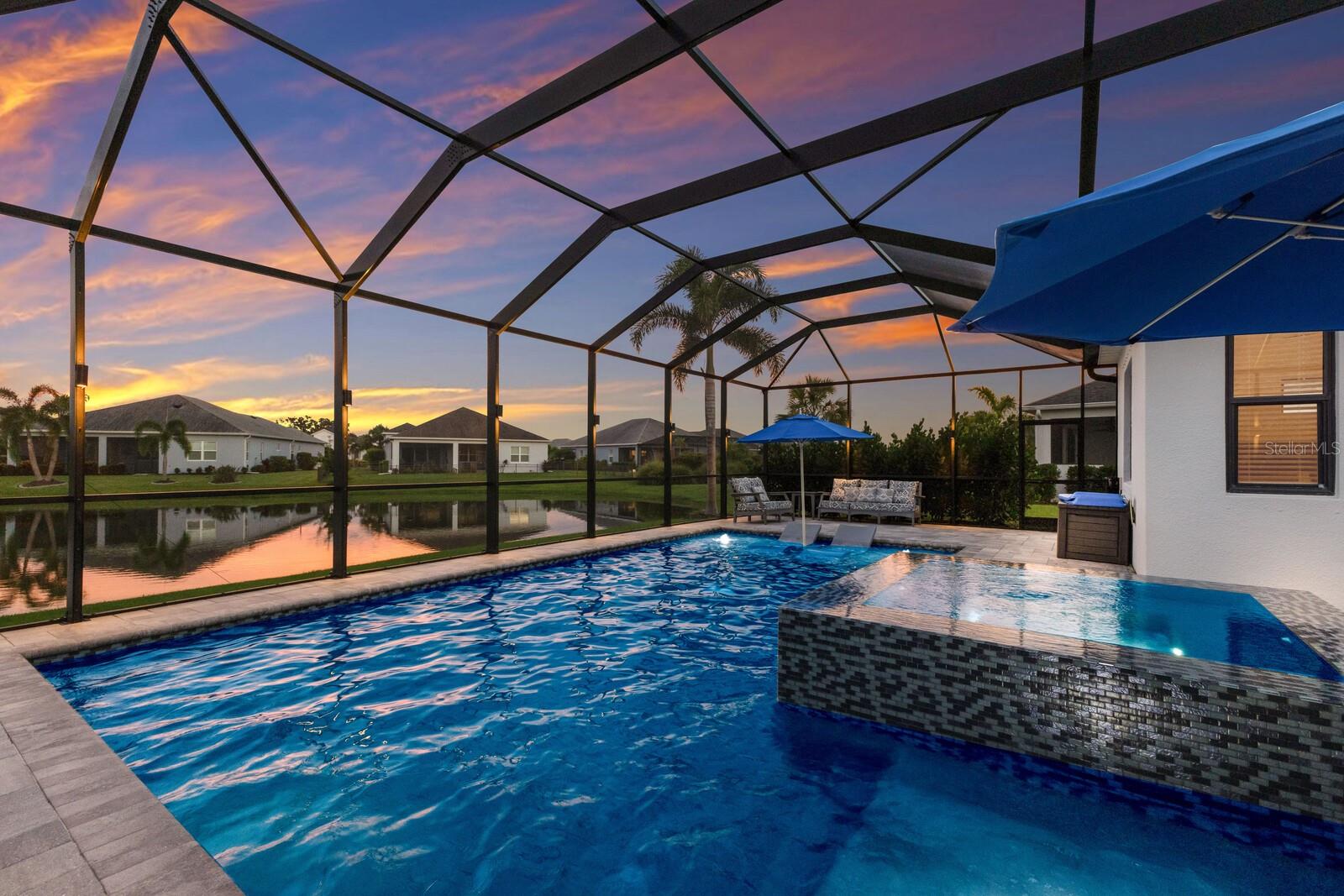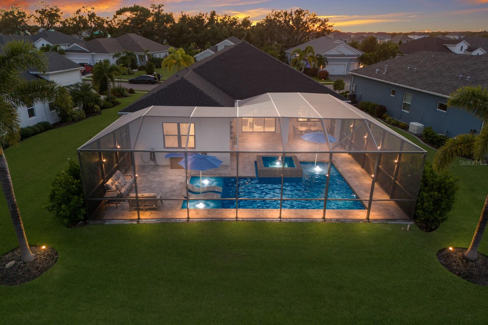 Welcome to this stunning, better-than-new 3 bedroom, 2 bath pool and spa smart home in the highly sought-after gated community of Canoe Creek. With NO CDD fees, this beautifully upgraded and well maintained home is perfectly positioned on a pie-shaped pond lot and showcases striking curb appeal with lush landscaping and a beautifully manicured lawn. Inside, a wide entryway opens to a bright, open floorplan with soaring 10 foot ceilings & no carpet - only ceramic tile & NEWER luxury vinyl plank floors throughout, perfect for those with allergies or pets. The formal dining room features a gorgeous modern chandelier & plenty of space for a large formal dining set. Adjacent is the great room, with a gorgeous octagonal tray ceiling & NEWER (2023) custom stacked stone wall. Off the great room, a large flex room with glass French doors is the perfect space to use as an office, home gym, playroom, or even a 4th bedroom. Overlooking the great room is your beautifully appointed kitchen, featuring 42" cabinetry with pull-out shelving, quartz counters, subway tile backsplash, sink w/newer matte onyx modern faucet, eat-in cafe/nook for casual dining, & dedicated pantry. Stainless appliances, including range w/gas cooktop & a 4-zoned Samsung refrigerator, make cooking a pleasure in this modern culinary space. Sliders off the great room lead to your backyard paradise - the NEARLY NEW (2023) heated smart saltwater pool & champagne spillover spa, complete w/double sun shelf & bubblers, inviting you to unwind while enjoying panoramic views of the tranquil pond. Control everything effortlessly from your phone, from your spa jets to LED pool lighting, to the NEW LED lights on the pool cage (2024) & NEW landscaping lighting (2024). Listen to your favorite tunes while relaxing in your pool with the NEW Sonos amp & lanai speakers that were just installed in 2024. Surrounded by tropical palms & privacy hedges, this private oasis is ideal for entertaining or enjoying a peaceful moment soaking up the Florida sunshine. The Primary Retreat at the back of the home is a serene, sunlit space with views of the lanai. It features two walk-in closets and a spacious en-suite bath w/huge walk-in shower, dual sinks, NEW (2025) lighting, custom mirrors, NEWER faucets (2023), & private water closet. Just off the foyer are two spacious bedrooms with a full bathroom in between that includes NEWER (2023) upgraded matte onyx faucet. The laundry room is conveniently situated just off the kitchen and includes Samsung top-loader washer & gas dryer, as well as handy linen closet. Additional notable upgrades include NEW (2025) ceiling fans; NEW (2025) exterior & interior paint; NEW pool screens (2025); NEW surge protector on breaker box (2024); NEWER (2023) security cameras; NEWLY cleaned/sealed pavered driveway, lanai, & interior grout (2025); 5 1/4" baseboards throughout; LED dimmer switches; gas water heater; epoxy garage floors; & overhead storage rack in garage. Situated in highly desirable Canoe Creek, this master planned gated community is perfect for those looking for the active lifestyle in a vibrant neighborhood, featuring a large clubhouse with fitness center, resort style pool & spa, a full time lifestyle director, pickleball courts, 2 dog parks, fire pit, walking trails, and a robust social calendar. Just minutes from world-class shopping, dining, state parks, and Gulf Coast beaches, this home offers the perfect combination of luxury, convenience, and coastal living.