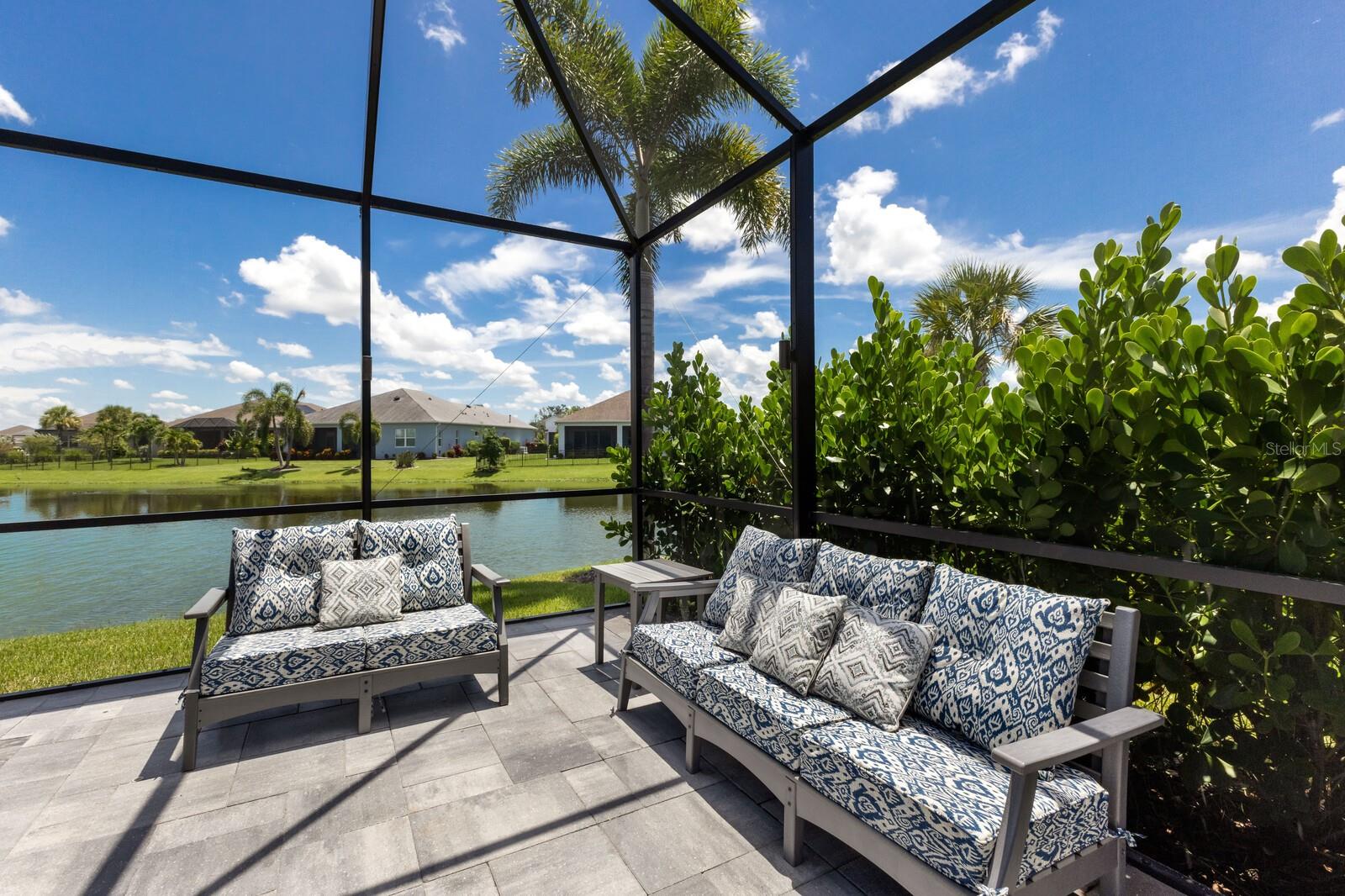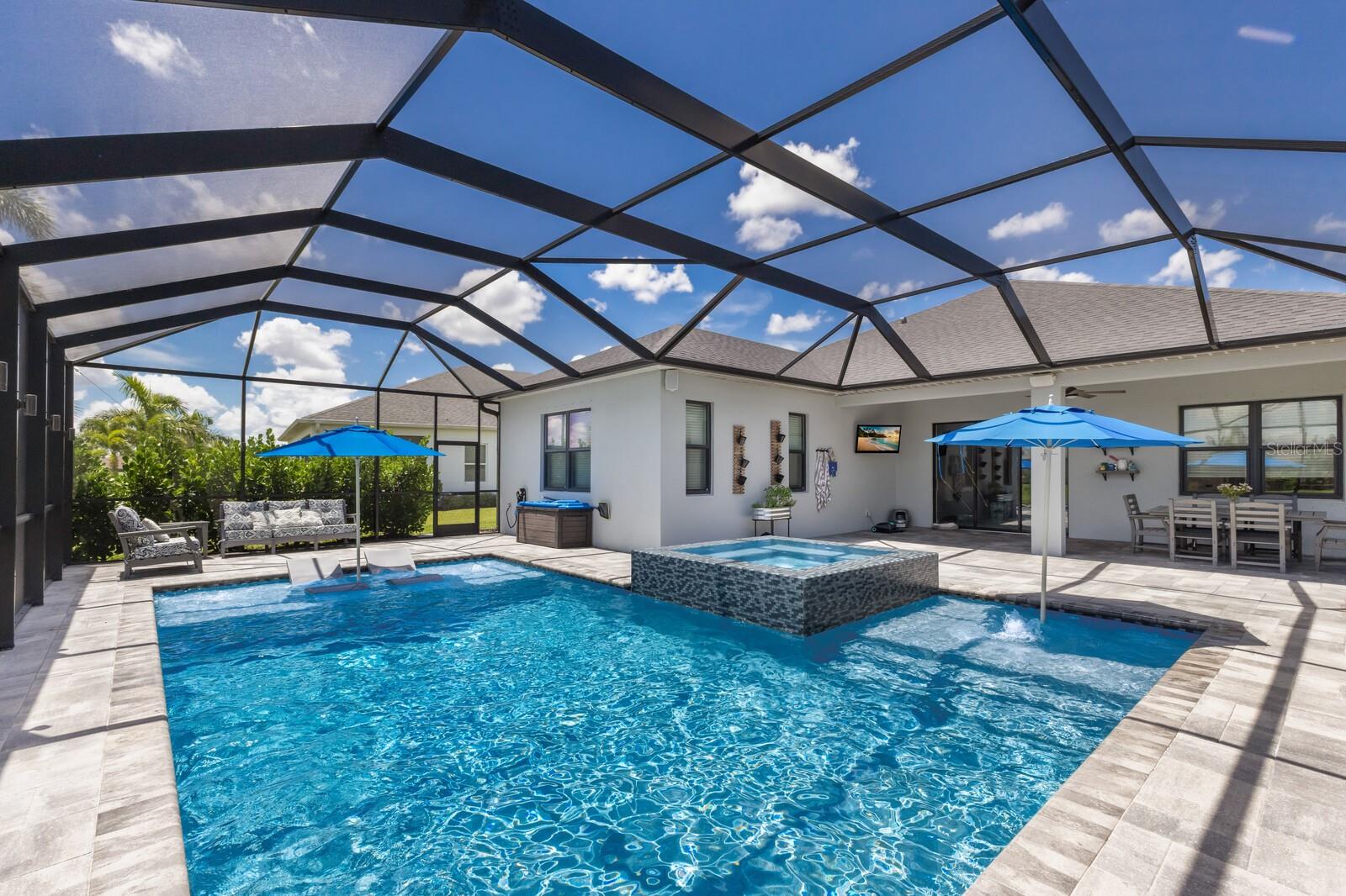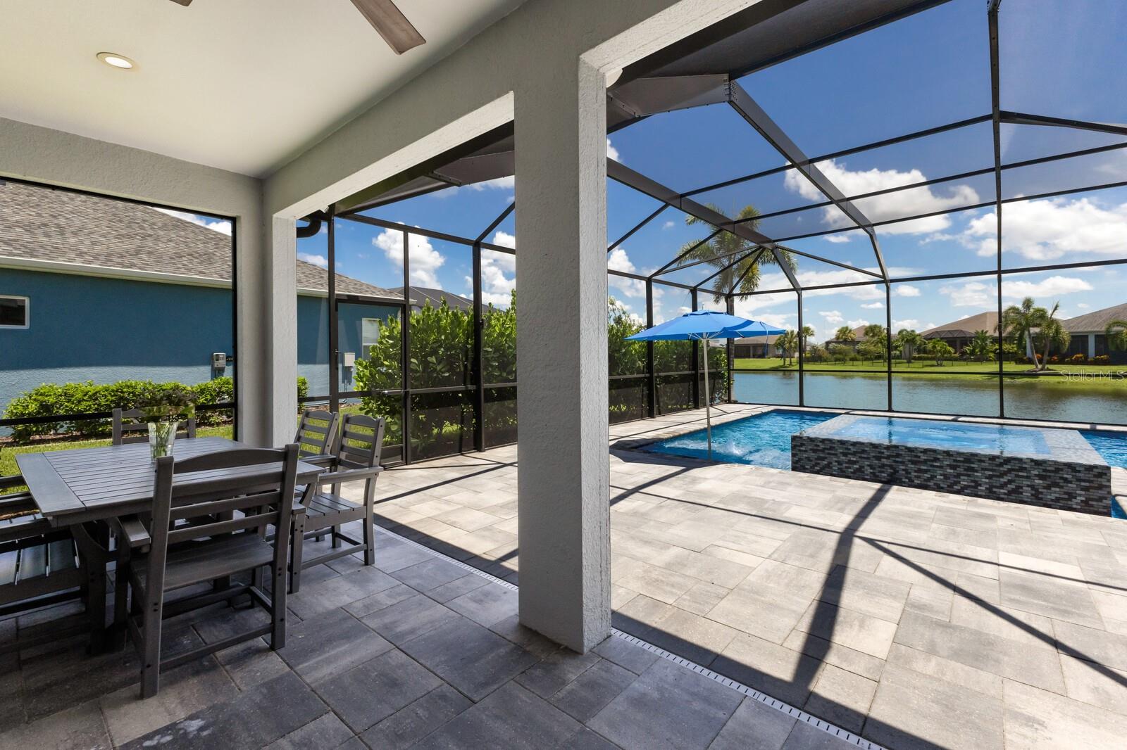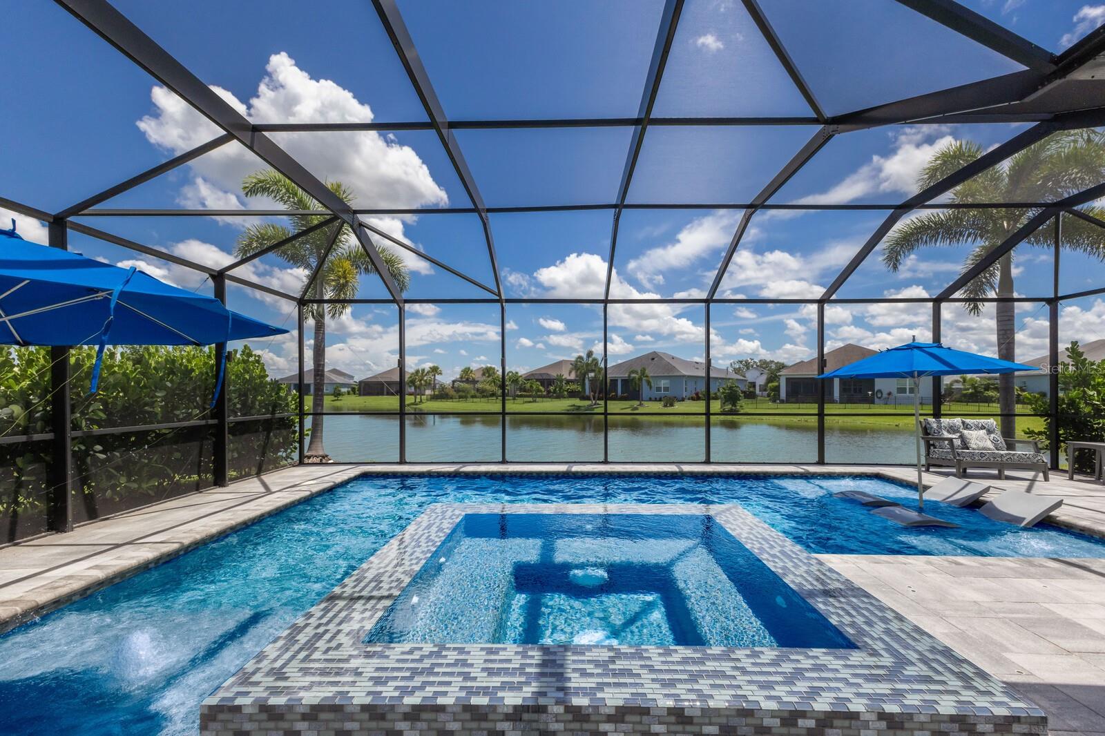 Welcome to this stunning, better-than-new 3 bedroom, 2 bath pool and spa smart home in the highly sought-after gated community of Canoe Creek. With NO CDD fees, this beautifully upgraded and well maintained home is perfectly positioned on a pie-shaped pond lot and showcases striking curb appeal with lush landscaping and a beautifully manicured lawn. Inside, a wide entryway opens to a bright, open floorplan with soaring 10 foot ceilings & no carpet - only ceramic tile & NEWER luxury vinyl plank floors throughout, perfect for those with allergies or pets. The formal dining room features a gorgeous modern chandelier & plenty of space for a large formal dining set. Adjacent is the great room, with a gorgeous octagonal tray ceiling & NEWER (2023) custom stacked stone wall. Off the great room, a large flex room with glass French doors is the perfect space to use as an office, home gym, playroom, or even a 4th bedroom. Overlooking the great room is your beautifully appointed kitchen, featuring 42" cabinetry with pull-out shelving, quartz counters, subway tile backsplash, sink w/newer matte onyx modern faucet, eat-in cafe/nook for casual dining, & dedicated pantry. Stainless appliances, including range w/gas cooktop & a 4-zoned Samsung refrigerator, make cooking a pleasure in this modern culinary space. Sliders off the great room lead to your backyard paradise - the NEARLY NEW (2023) heated smart saltwater pool & champagne spillover spa, complete w/double sun shelf & bubblers, inviting you to unwind while enjoying panoramic views of the tranquil pond. Control everything effortlessly from your phone, from your spa jets to LED pool lighting, to the NEW LED lights on the pool cage (2024) & NEW landscaping lighting (2024). Listen to your favorite tunes while relaxing in your pool with the NEW Sonos amp & lanai speakers that were just installed in 2024. Surrounded by tropical palms & privacy hedges, this private oasis is ideal for entertaining or enjoying a peaceful moment soaking up the Florida sunshine. The Primary Retreat at the back of the home is a serene, sunlit space with views of the lanai. It features two walk-in closets and a spacious en-suite bath w/huge walk-in shower, dual sinks, NEW (2025) lighting, custom mirrors, NEWER faucets (2023), & private water closet. Just off the foyer are two spacious bedrooms with a full bathroom in between that includes NEWER (2023) upgraded matte onyx faucet. The laundry room is conveniently situated just off the kitchen and includes Samsung top-loader washer & gas dryer, as well as handy linen closet. Additional notable upgrades include NEW (2025) ceiling fans; NEW (2025) exterior & interior paint; NEW pool screens (2025); NEW surge protector on breaker box (2024); NEWER (2023) security cameras; NEWLY cleaned/sealed pavered driveway, lanai, & interior grout (2025); 5 1/4" baseboards throughout; LED dimmer switches; gas water heater; epoxy garage floors; & overhead storage rack in garage. Situated in highly desirable Canoe Creek, this master planned gated community is perfect for those looking for the active lifestyle in a vibrant neighborhood, featuring a large clubhouse with fitness center, resort style pool & spa, a full time lifestyle director, pickleball courts, 2 dog parks, fire pit, walking trails, and a robust social calendar. Just minutes from world-class shopping, dining, state parks, and Gulf Coast beaches, this home offers the perfect combination of luxury, convenience, and coastal living.