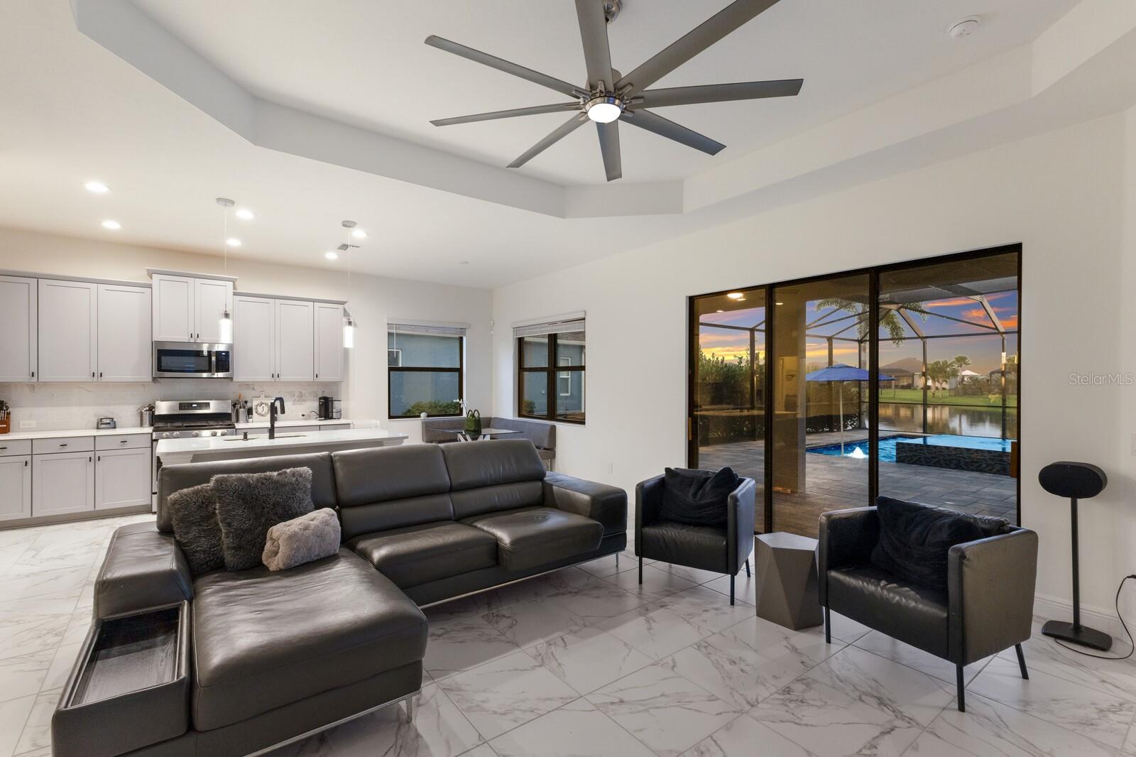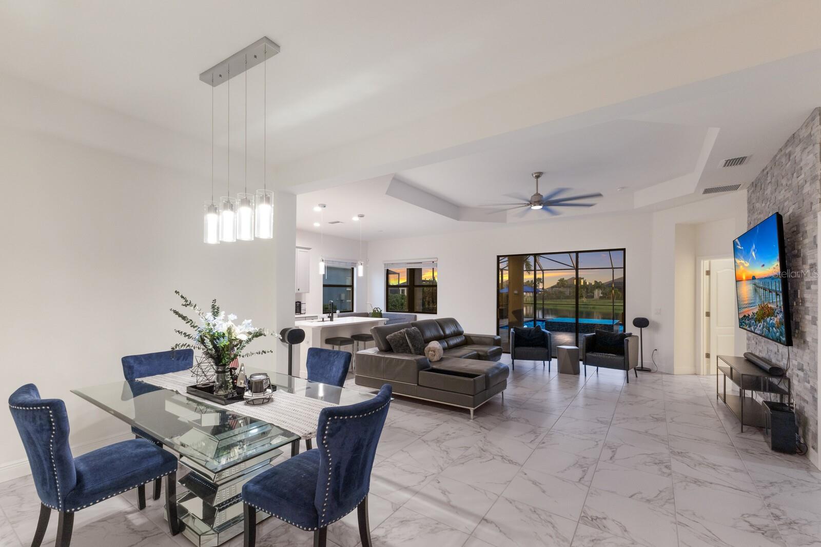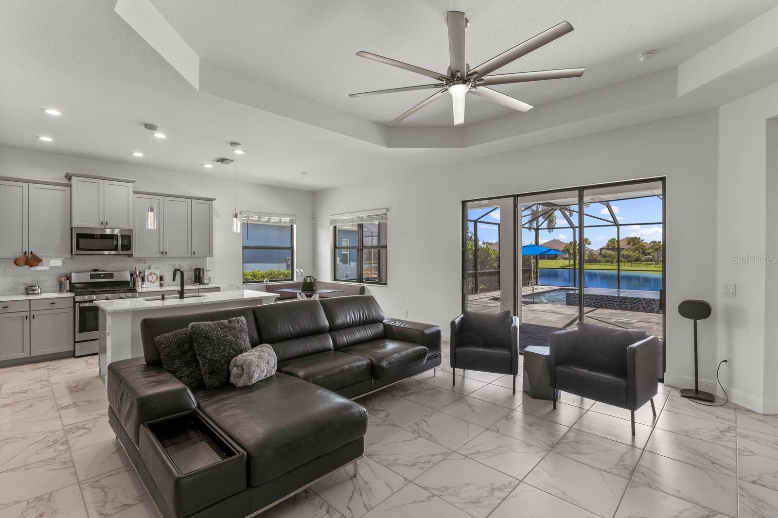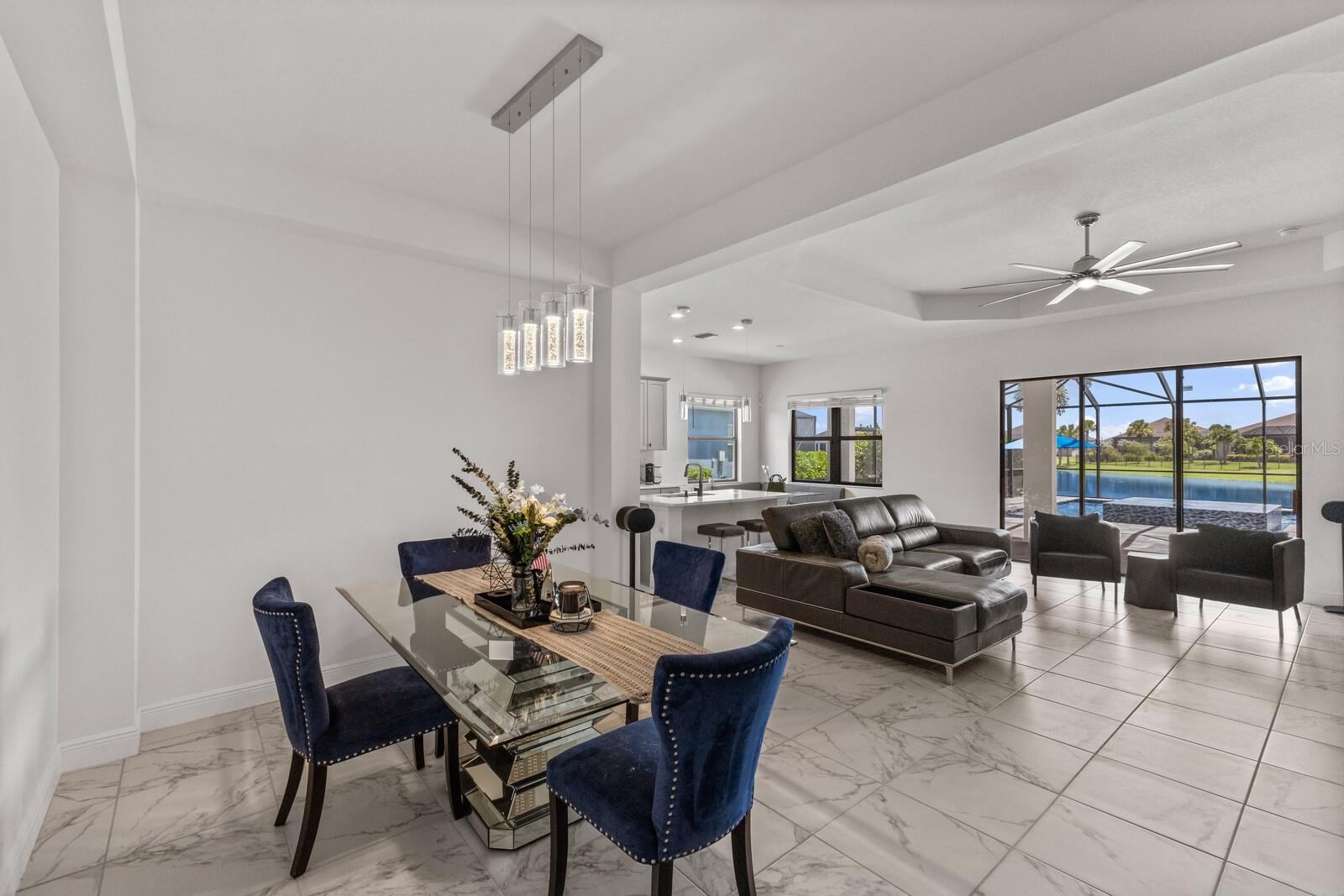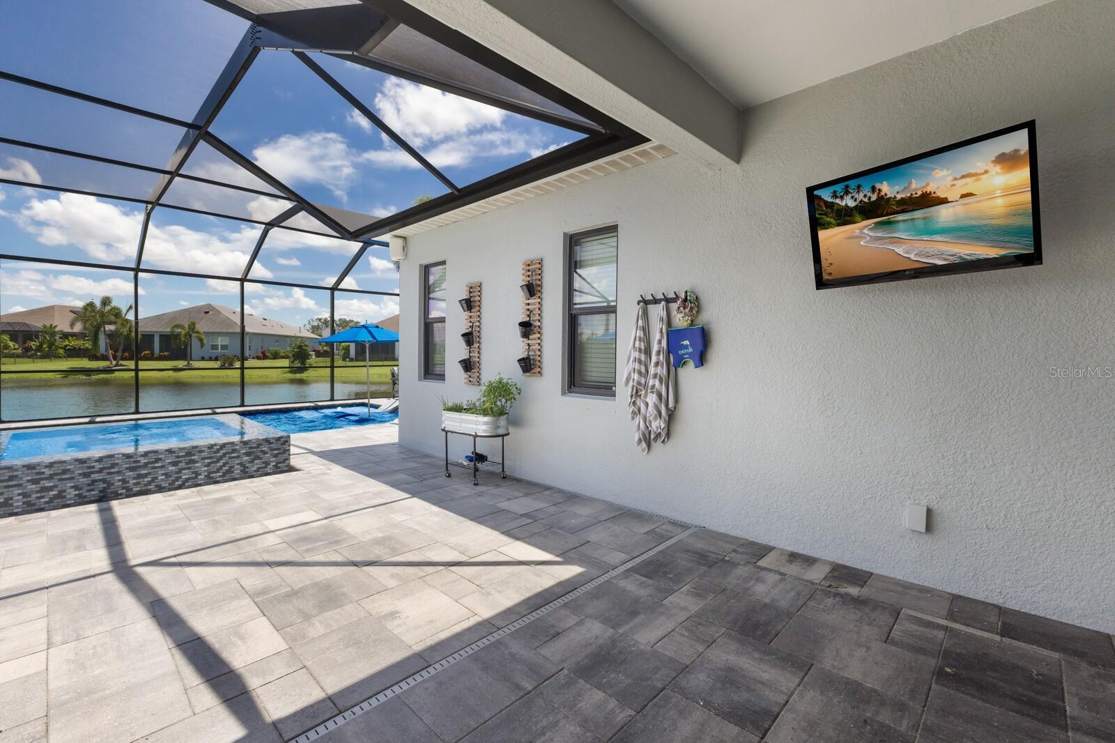 Welcome to this stunning, better-than-new 3 bedroom, 2 bath pool and spa smart home in the highly sought-after gated community of Canoe Creek. With NO CDD fees, this beautifully upgraded and well maintained home is perfectly positioned on a pie-shaped pond lot and showcases striking curb appeal with lush landscaping and a beautifully manicured lawn. Inside, a wide entryway opens to a bright, open floorplan with soaring 10 foot ceilings & no carpet - only ceramic tile & NEWER luxury vinyl plank floors throughout, perfect for those with allergies or pets. The formal dining room features a gorgeous modern chandelier & plenty of space for a large formal dining set. Adjacent is the great room, with a gorgeous octagonal tray ceiling & NEWER (2023) custom stacked stone wall. Off the great room, a large flex room with glass French doors is the perfect space to use as an office, home gym, playroom, or even a 4th bedroom. Overlooking the great room is your beautifully appointed kitchen, featuring 42" cabinetry with pull-out shelving, quartz counters, subway tile backsplash, sink w/newer matte onyx modern faucet, eat-in cafe/nook for casual dining, & dedicated pantry. Stainless appliances, including range w/gas cooktop & a 4-zoned Samsung refrigerator, make cooking a pleasure in this modern culinary space. Sliders off the great room lead to your backyard paradise - the NEARLY NEW (2023) heated smart saltwater pool & champagne spillover spa, complete w/double sun shelf & bubblers, inviting you to unwind while enjoying panoramic views of the tranquil pond. Control everything effortlessly from your phone, from your spa jets to LED pool lighting, to the NEW LED lights on the pool cage (2024) & NEW landscaping lighting (2024). Listen to your favorite tunes while relaxing in your pool with the NEW Sonos amp & lanai speakers that were just installed in 2024. Surrounded by tropical palms & privacy hedges, this private oasis is ideal for entertaining or enjoying a peaceful moment soaking up the Florida sunshine. The Primary Retreat at the back of the home is a serene, sunlit space with views of the lanai. It features two walk-in closets and a spacious en-suite bath w/huge walk-in shower, dual sinks, NEW (2025) lighting, custom mirrors, NEWER faucets (2023), & private water closet. Just off the foyer are two spacious bedrooms with a full bathroom in between that includes NEWER (2023) upgraded matte onyx faucet. The laundry room is conveniently situated just off the kitchen and includes Samsung top-loader washer & gas dryer, as well as handy linen closet. Additional notable upgrades include NEW (2025) ceiling fans; NEW (2025) exterior & interior paint; NEW pool screens (2025); NEW surge protector on breaker box (2024); NEWER (2023) security cameras; NEWLY cleaned/sealed pavered driveway, lanai, & interior grout (2025); 5 1/4" baseboards throughout; LED dimmer switches; gas water heater; epoxy garage floors; & overhead storage rack in garage. Situated in highly desirable Canoe Creek, this master planned gated community is perfect for those looking for the active lifestyle in a vibrant neighborhood, featuring a large clubhouse with fitness center, resort style pool & spa, a full time lifestyle director, pickleball courts, 2 dog parks, fire pit, walking trails, and a robust social calendar. Just minutes from world-class shopping, dining, state parks, and Gulf Coast beaches, this home offers the perfect combination of luxury, convenience, and coastal living.