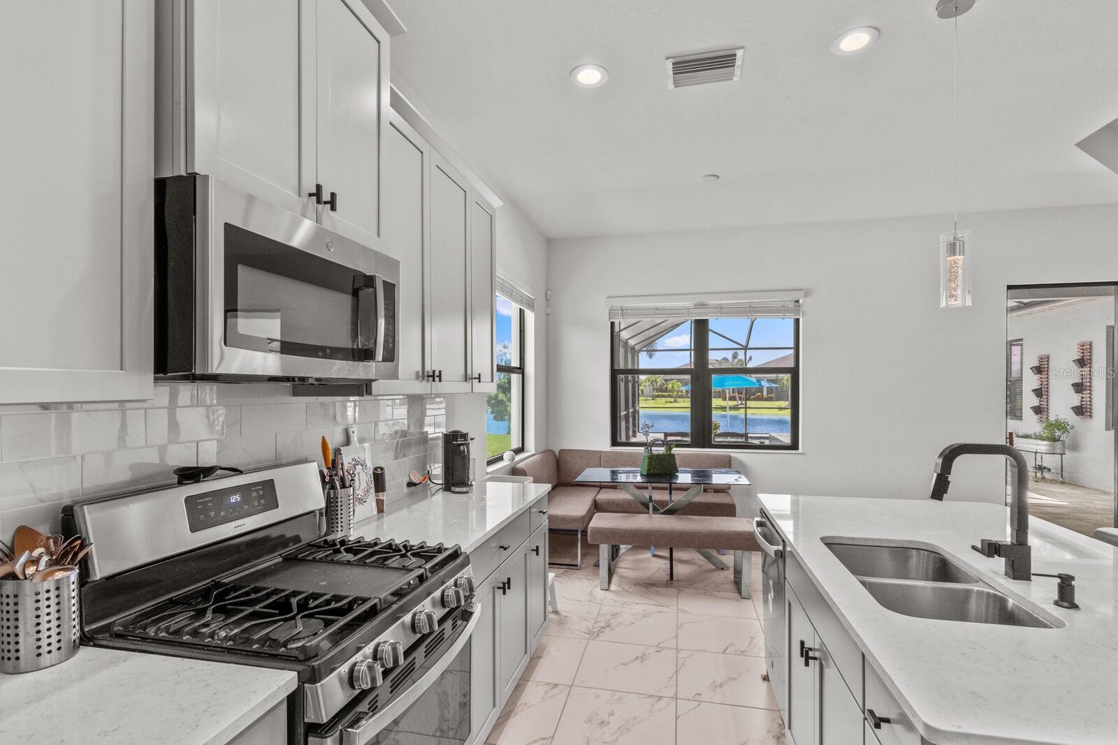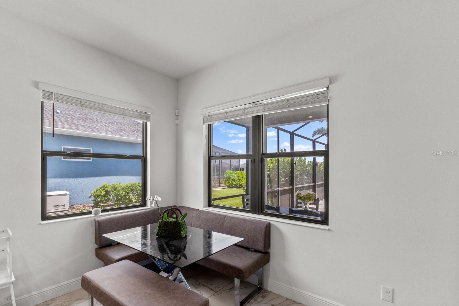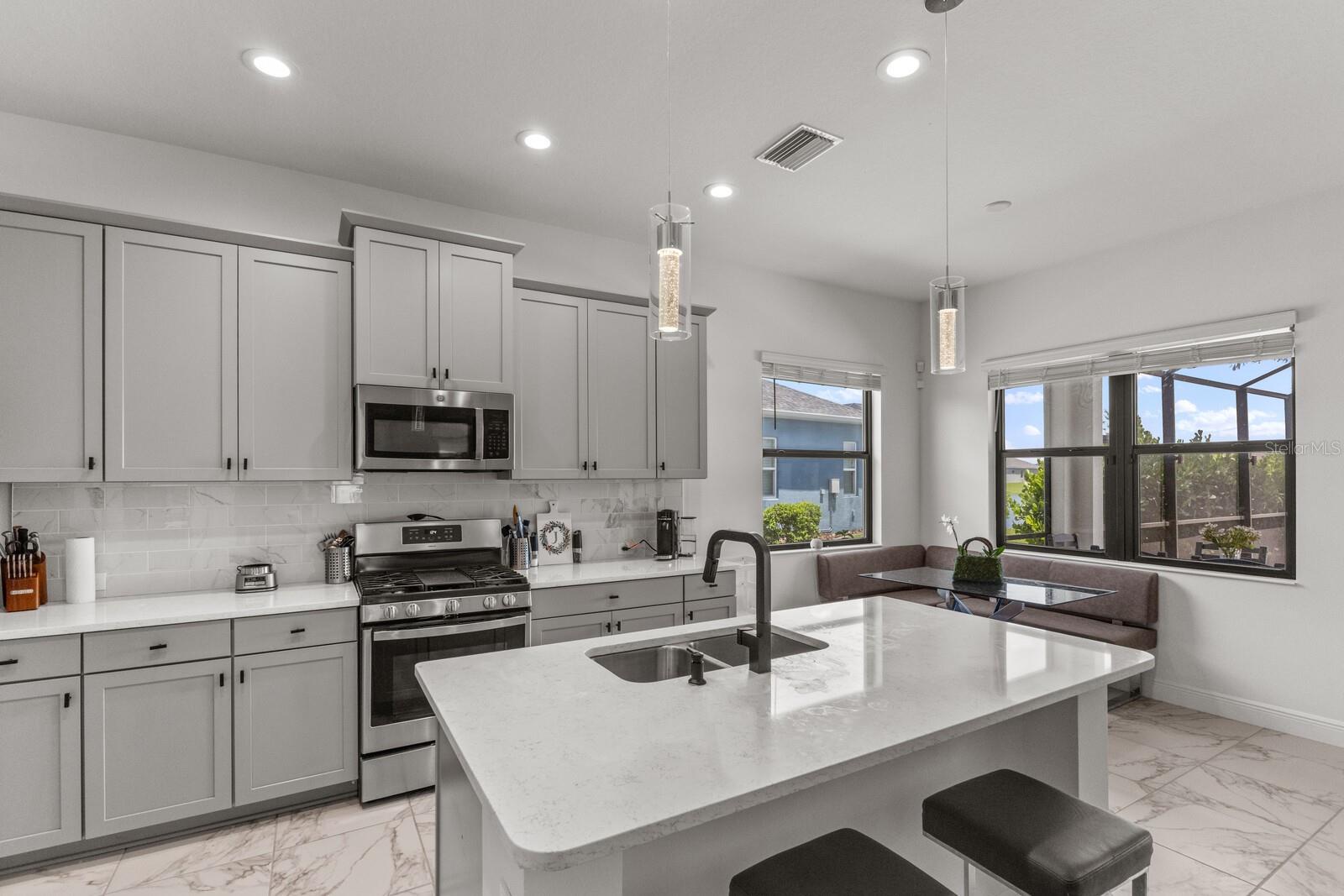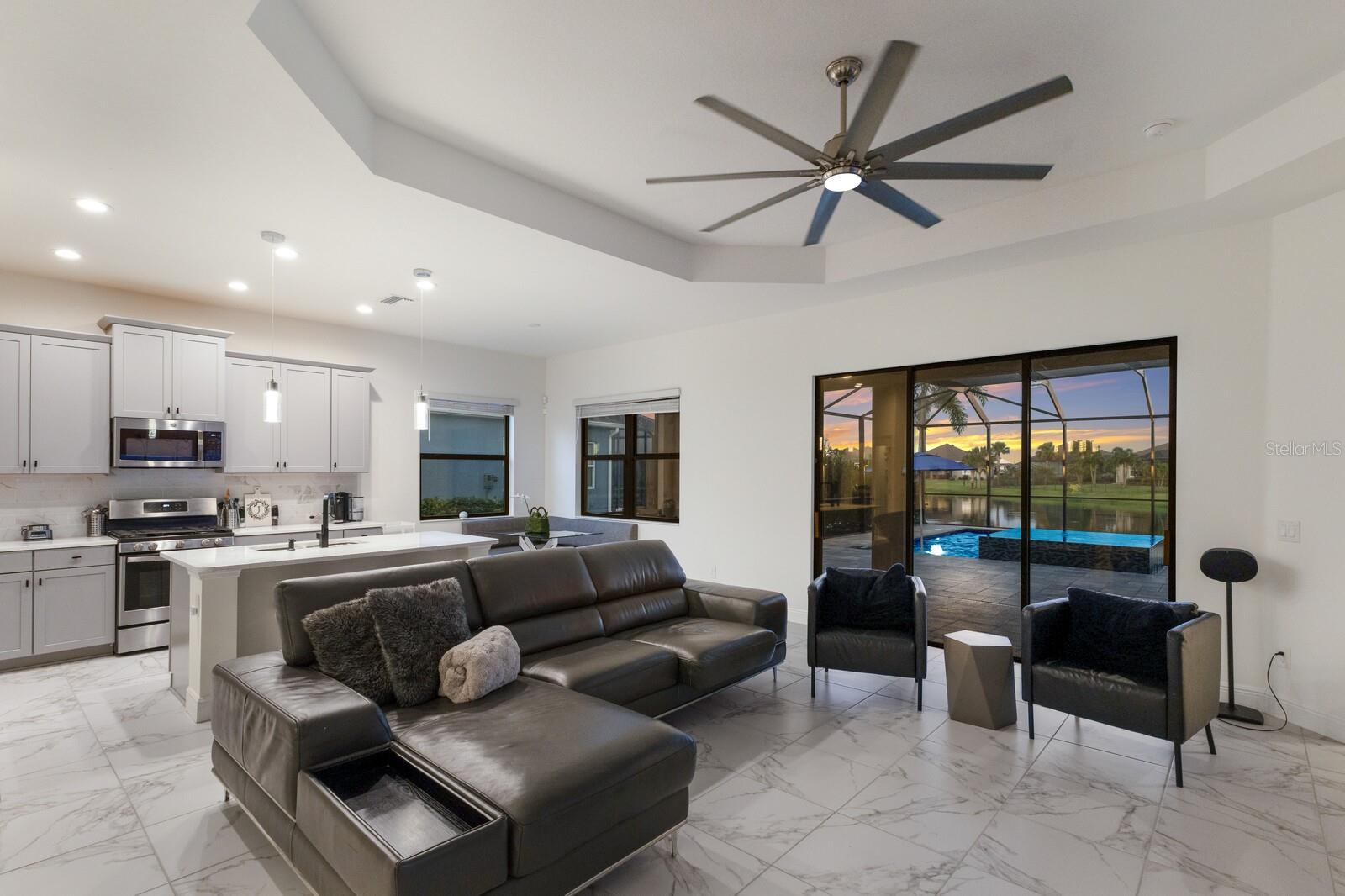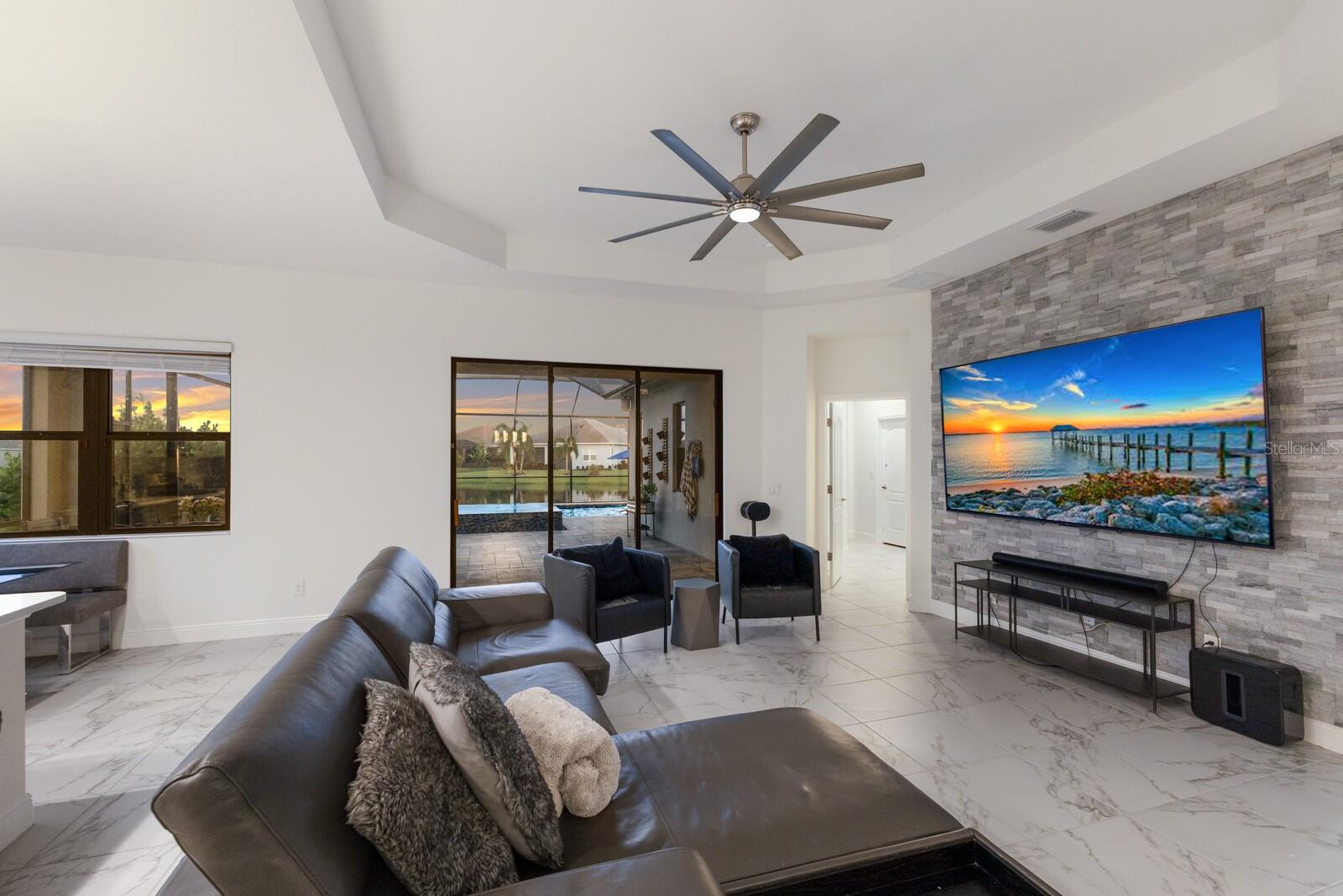 Welcome to this stunning, better-than-new 3 bedroom, 2 bath pool and spa smart home in the highly sought-after gated community of Canoe Creek. With NO CDD fees, this beautifully upgraded and well maintained home is perfectly positioned on a pie-shaped pond lot and showcases striking curb appeal with lush landscaping and a beautifully manicured lawn. Inside, a wide entryway opens to a bright, open floorplan with soaring 10 foot ceilings & no carpet - only ceramic tile & NEWER luxury vinyl plank floors throughout, perfect for those with allergies or pets. The formal dining room features a gorgeous modern chandelier & plenty of space for a large formal dining set. Adjacent is the great room, with a gorgeous octagonal tray ceiling & NEWER (2023) custom stacked stone wall. Off the great room, a large flex room with glass French doors is the perfect space to use as an office, home gym, playroom, or even a 4th bedroom. Overlooking the great room is your beautifully appointed kitchen, featuring 42" cabinetry with pull-out shelving, quartz counters, subway tile backsplash, sink w/newer matte onyx modern faucet, eat-in cafe/nook for casual dining, & dedicated pantry. Stainless appliances, including range w/gas cooktop & a 4-zoned Samsung refrigerator, make cooking a pleasure in this modern culinary space. Sliders off the great room lead to your backyard paradise - the NEARLY NEW (2023) heated smart saltwater pool & champagne spillover spa, complete w/double sun shelf & bubblers, inviting you to unwind while enjoying panoramic views of the tranquil pond. Control everything effortlessly from your phone, from your spa jets to LED pool lighting, to the NEW LED lights on the pool cage (2024) & NEW landscaping lighting (2024). Listen to your favorite tunes while relaxing in your pool with the NEW Sonos amp & lanai speakers that were just installed in 2024. Surrounded by tropical palms & privacy hedges, this private oasis is ideal for entertaining or enjoying a peaceful moment soaking up the Florida sunshine. The Primary Retreat at the back of the home is a serene, sunlit space with views of the lanai. It features two walk-in closets and a spacious en-suite bath w/huge walk-in shower, dual sinks, NEW (2025) lighting, custom mirrors, NEWER faucets (2023), & private water closet. Just off the foyer are two spacious bedrooms with a full bathroom in between that includes NEWER (2023) upgraded matte onyx faucet. The laundry room is conveniently situated just off the kitchen and includes Samsung top-loader washer & gas dryer, as well as handy linen closet. Additional notable upgrades include NEW (2025) ceiling fans; NEW (2025) exterior & interior paint; NEW pool screens (2025); NEW surge protector on breaker box (2024); NEWER (2023) security cameras; NEWLY cleaned/sealed pavered driveway, lanai, & interior grout (2025); 5 1/4" baseboards throughout; LED dimmer switches; gas water heater; epoxy garage floors; & overhead storage rack in garage. Situated in highly desirable Canoe Creek, this master planned gated community is perfect for those looking for the active lifestyle in a vibrant neighborhood, featuring a large clubhouse with fitness center, resort style pool & spa, a full time lifestyle director, pickleball courts, 2 dog parks, fire pit, walking trails, and a robust social calendar. Just minutes from world-class shopping, dining, state parks, and Gulf Coast beaches, this home offers the perfect combination of luxury, convenience, and coastal living.