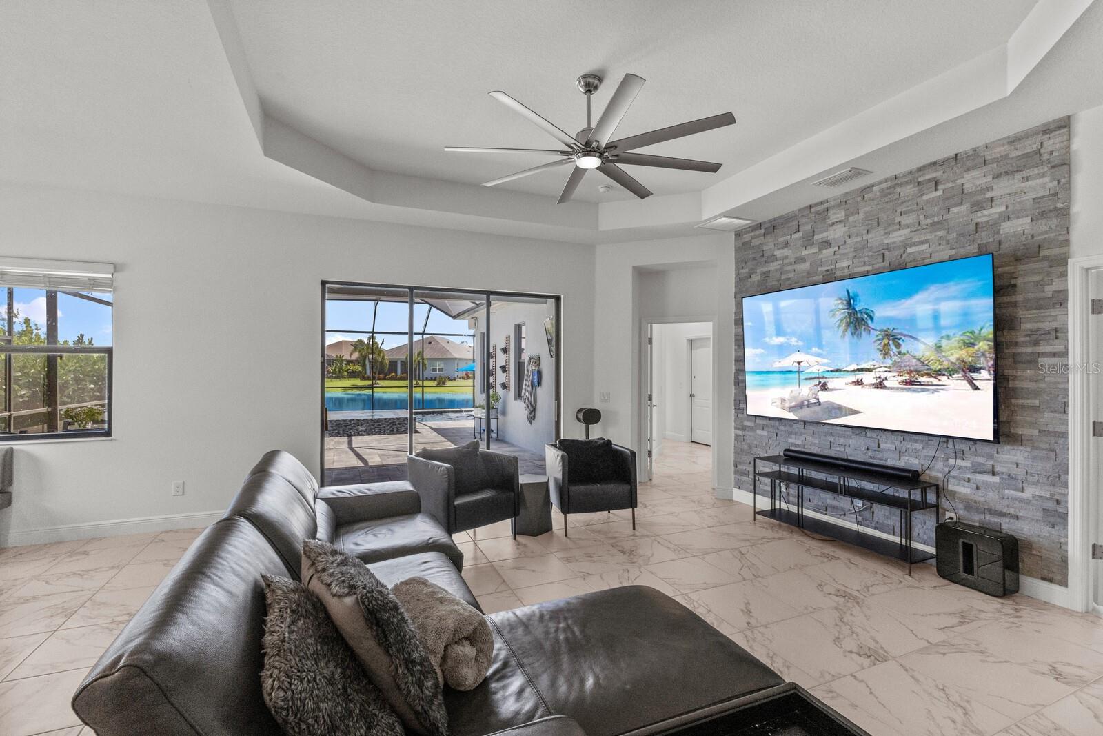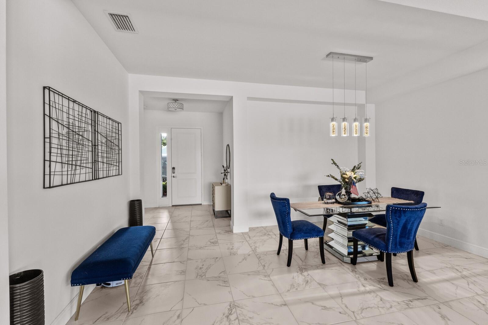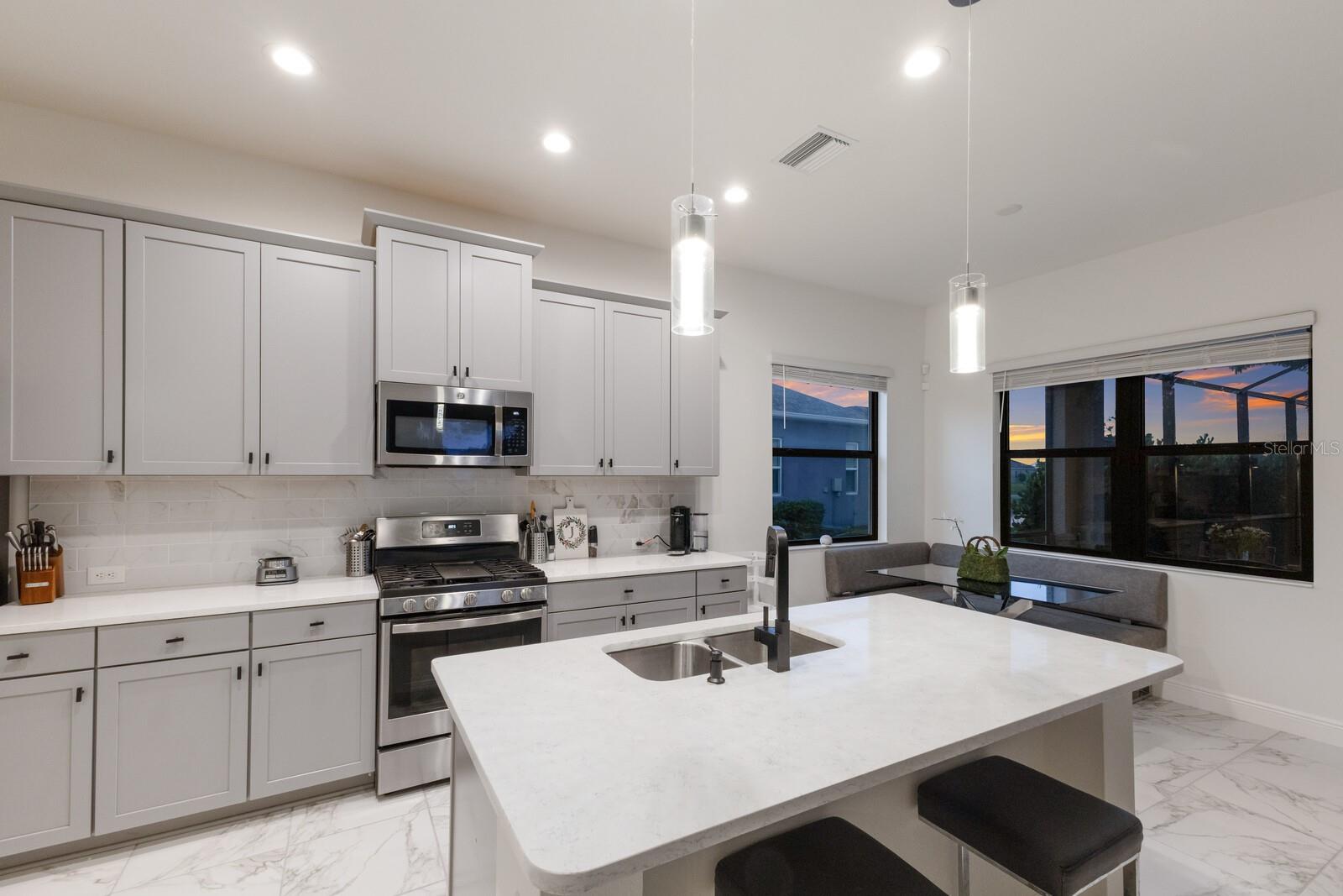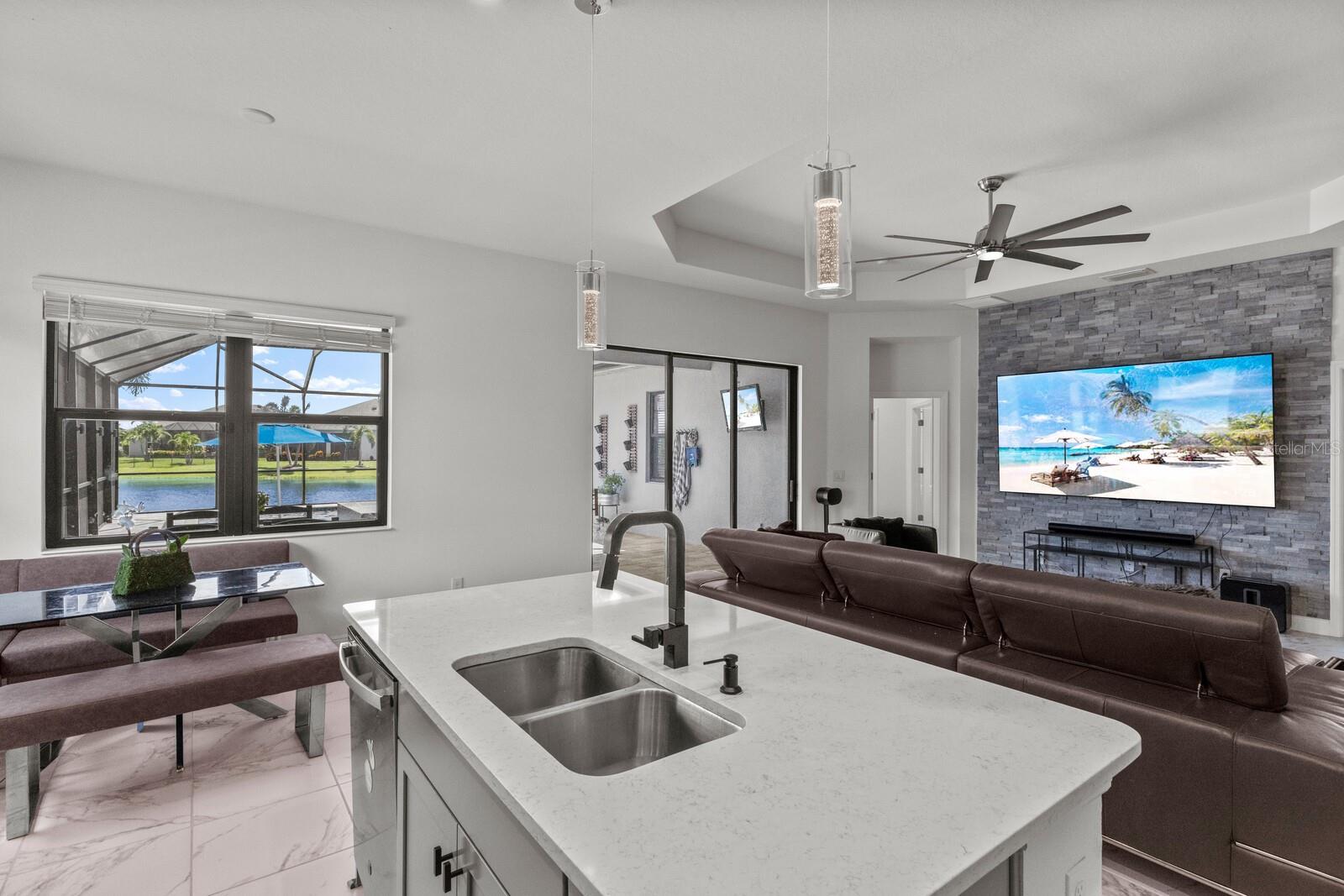 Welcome to this stunning, better-than-new 3 bedroom, 2 bath pool and spa smart home in the highly sought-after gated community of Canoe Creek. With NO CDD fees, this beautifully upgraded and well maintained home is perfectly positioned on a pie-shaped pond lot and showcases striking curb appeal with lush landscaping and a beautifully manicured lawn. Inside, a wide entryway opens to a bright, open floorplan with soaring 10 foot ceilings & no carpet - only ceramic tile & NEWER luxury vinyl plank floors throughout, perfect for those with allergies or pets. The formal dining room features a gorgeous modern chandelier & plenty of space for a large formal dining set. Adjacent is the great room, with a gorgeous octagonal tray ceiling & NEWER (2023) custom stacked stone wall. Off the great room, a large flex room with glass French doors is the perfect space to use as an office, home gym, playroom, or even a 4th bedroom. Overlooking the great room is your beautifully appointed kitchen, featuring 42" cabinetry with pull-out shelving, quartz counters, subway tile backsplash, sink w/newer matte onyx modern faucet, eat-in cafe/nook for casual dining, & dedicated pantry. Stainless appliances, including range w/gas cooktop & a 4-zoned Samsung refrigerator, make cooking a pleasure in this modern culinary space. Sliders off the great room lead to your backyard paradise - the NEARLY NEW (2023) heated smart saltwater pool & champagne spillover spa, complete w/double sun shelf & bubblers, inviting you to unwind while enjoying panoramic views of the tranquil pond. Control everything effortlessly from your phone, from your spa jets to LED pool lighting, to the NEW LED lights on the pool cage (2024) & NEW landscaping lighting (2024). Listen to your favorite tunes while relaxing in your pool with the NEW Sonos amp & lanai speakers that were just installed in 2024. Surrounded by tropical palms & privacy hedges, this private oasis is ideal for entertaining or enjoying a peaceful moment soaking up the Florida sunshine. The Primary Retreat at the back of the home is a serene, sunlit space with views of the lanai. It features two walk-in closets and a spacious en-suite bath w/huge walk-in shower, dual sinks, NEW (2025) lighting, custom mirrors, NEWER faucets (2023), & private water closet. Just off the foyer are two spacious bedrooms with a full bathroom in between that includes NEWER (2023) upgraded matte onyx faucet. The laundry room is conveniently situated just off the kitchen and includes Samsung top-loader washer & gas dryer, as well as handy linen closet. Additional notable upgrades include NEW (2025) ceiling fans; NEW (2025) exterior & interior paint; NEW pool screens (2025); NEW surge protector on breaker box (2024); NEWER (2023) security cameras; NEWLY cleaned/sealed pavered driveway, lanai, & interior grout (2025); 5 1/4" baseboards throughout; LED dimmer switches; gas water heater; epoxy garage floors; & overhead storage rack in garage. Situated in highly desirable Canoe Creek, this master planned gated community is perfect for those looking for the active lifestyle in a vibrant neighborhood, featuring a large clubhouse with fitness center, resort style pool & spa, a full time lifestyle director, pickleball courts, 2 dog parks, fire pit, walking trails, and a robust social calendar. Just minutes from world-class shopping, dining, state parks, and Gulf Coast beaches, this home offers the perfect combination of luxury, convenience, and coastal living.