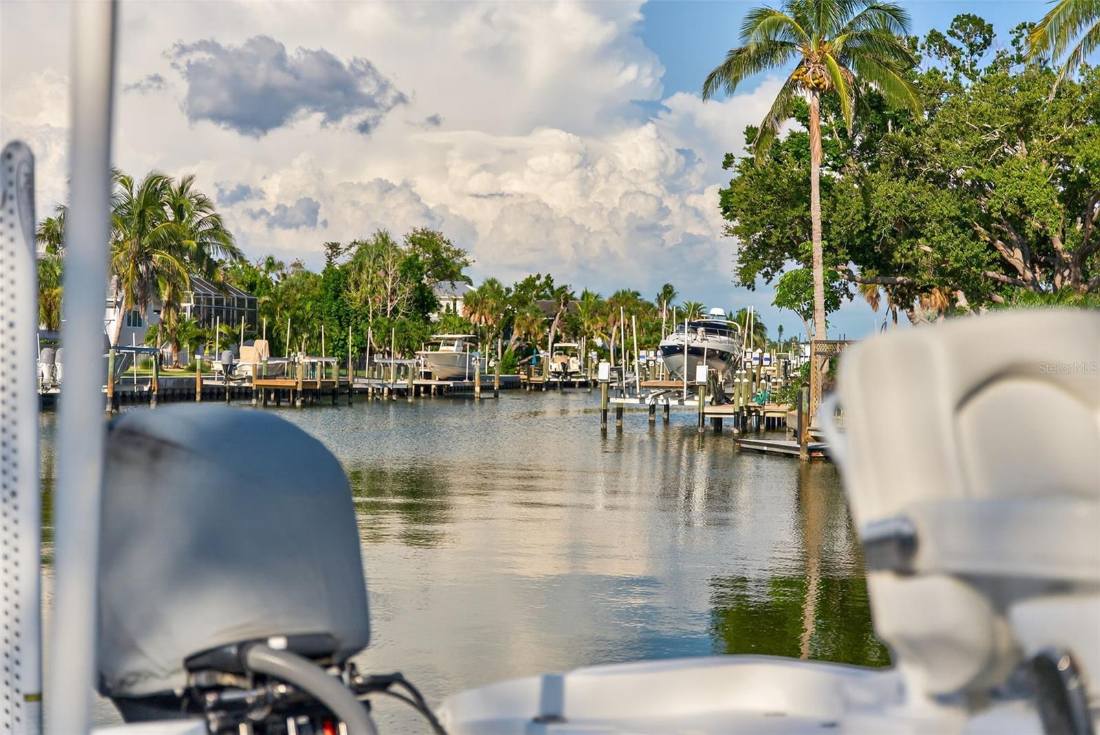 One or more photo(s) has been virtually staged. Exceptional Waterfront - North Siesta Key's Bay Island Boater's Dream - Exerience the best of coastal living in this elegant 4bd/4ba residence - just minutes to the Intracoastal Waterway. The home features a 2023 14,000lb dock/lift with electric and 3pnt moorage. Step inside a welcoming slate tile entry foyer to discover timeless quality design with Brazilian Ipe hardwood flooring throughout, hurricane rated windows and French doors and volume ceilings. At the heart of the home is a true cook's kitchen with Wolff Gas Range, built-in Sub-Zero stainless refrigerator, Fisher Paykel diswasher and soap-stone counter-tops. A true Chef's pantry, abundant cabinetry and full bar with wine refrigeration elevate the entertaining experience. The Primary Bedroom Suite, set in its own private wing, offers a tranquil retreat w/French Doors opening to a full private deck, perfect to enjoy sunrise and coffee; generous closet space and spa-inspired Bath; Guests Private wing and other rooms offer flexibility; French doors, automated window coverings, and architectural details create a refined and comfortable atmosphere. A full laundry room w/sink, office nook and mudroom are conveniently located off the 3-car garage. Outdoors, enjoy multiple covered decks, one with gas-fireplace for perfect evening waterfront ambiance; overlooking heated salt-water pool/spa; lush tropical landscape; Minutes to downtown Sarasota.