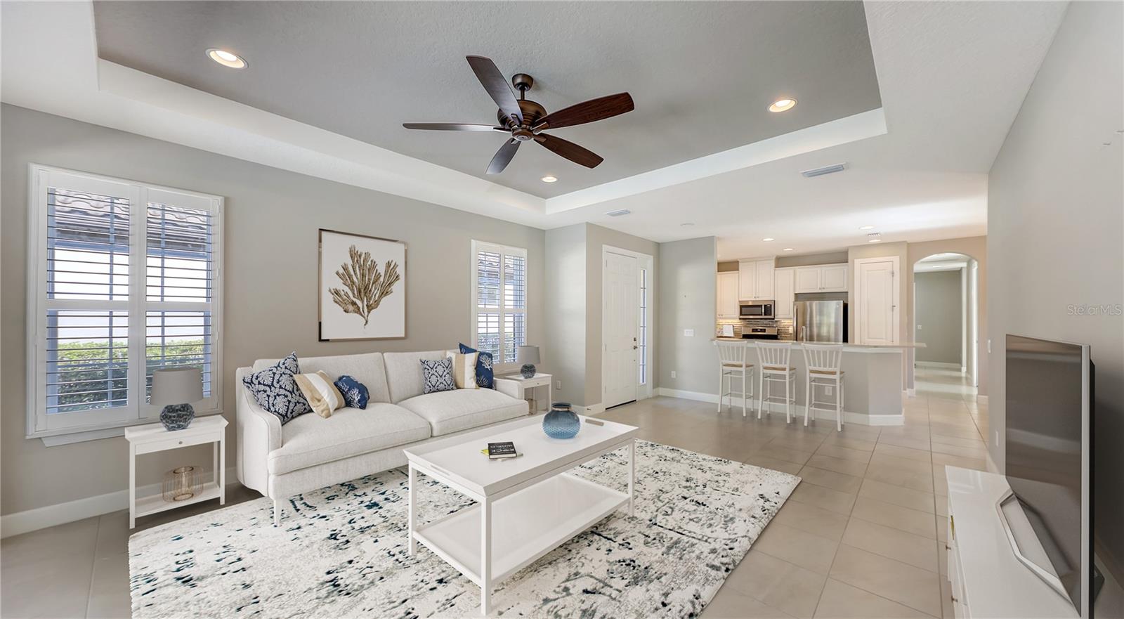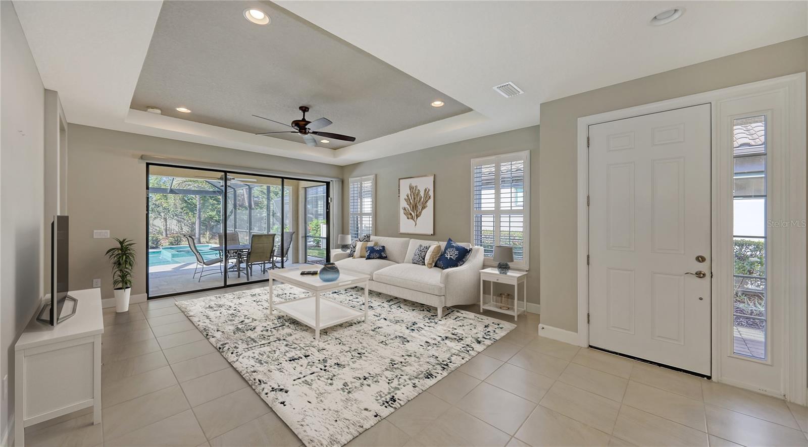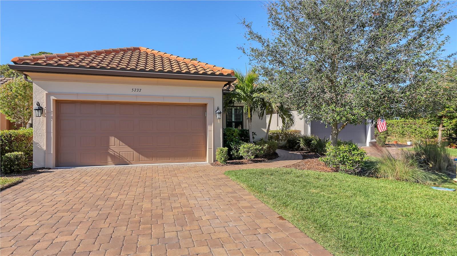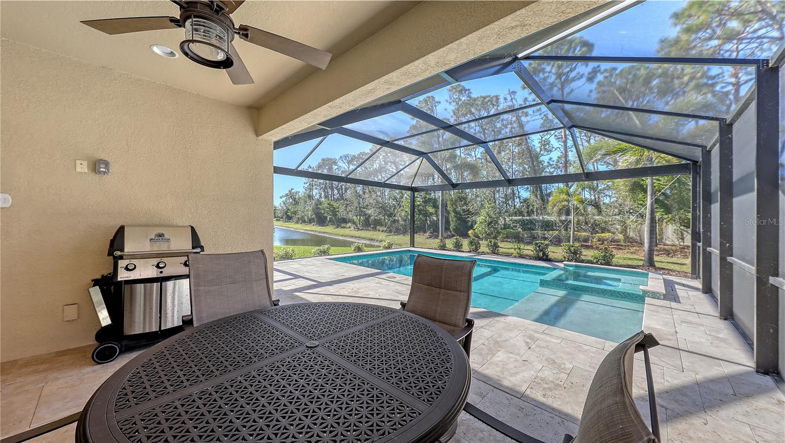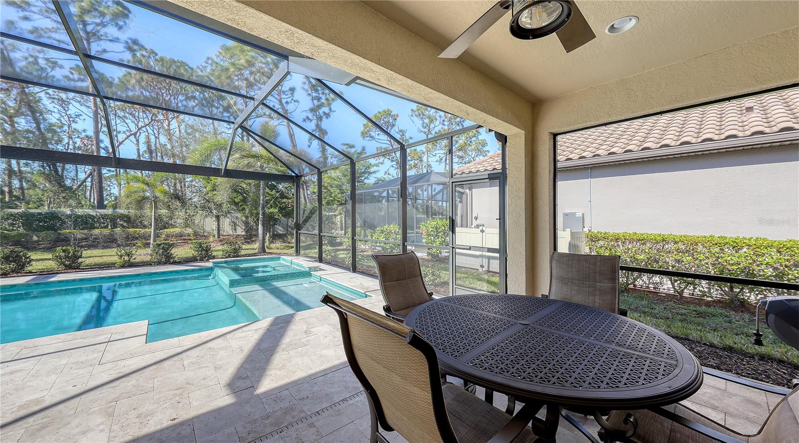 One or more photo(s) has been virtually staged. Welcome to this beautiful 3-bedroom plus den Arezzo Model, perfectly positioned on a premier lot in the highly desirable Bellacina by Esplanade community. Enjoy ultimate privacy with serene south-facing water views that create your own tropical retreat. A heated pool and spa complete the picture, offering the perfect setting for everyday relaxation or entertaining. The open floor plan is ideal for gatherings, while the natural gas kitchen is a dream for cooking enthusiasts. Notable upgrades include elegant plantation shutters, a spacious laundry room with abundant storage, reverse osmosis water filtration, a custom master closet by Affordable Closets, clear span pool cage screens, room-darkening shades in the primary suite, and a Tesla charging station in the garage. Upscale clubhouse with catering kitchen, fitness center overlooking the resort-style pool with cabanas, outdoor spa and firepit, pickleball, tennis, and bocce ball courts, cornhole and playground Two dog parks, full-time activities director for a vibrant social calendar. No CDD fees. Lawn care included in HOA fees. Direct gated access to Sarasota's Legacy Trail. Minutes to Nokomis Beach, Venice Beach, and Siesta Key Beach, plus nearby shopping, dining, and grocery stores. Don't miss the chance to own in one of Sarasota's most sought-after lifestyle communities. Schedule your private showing today and start living the Florida dream!