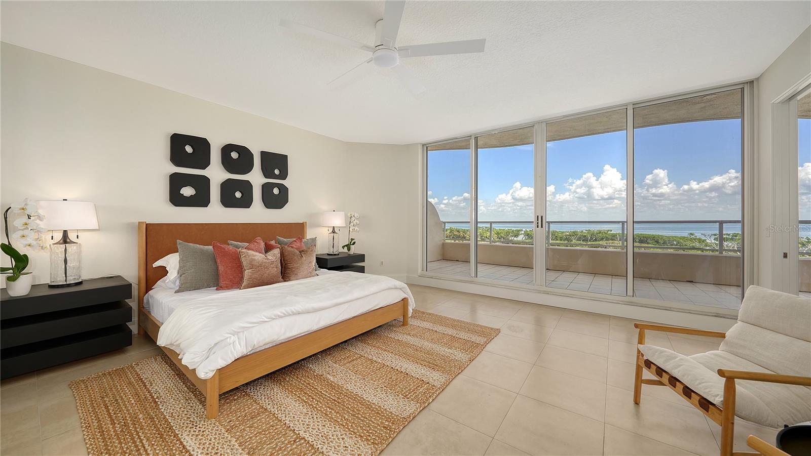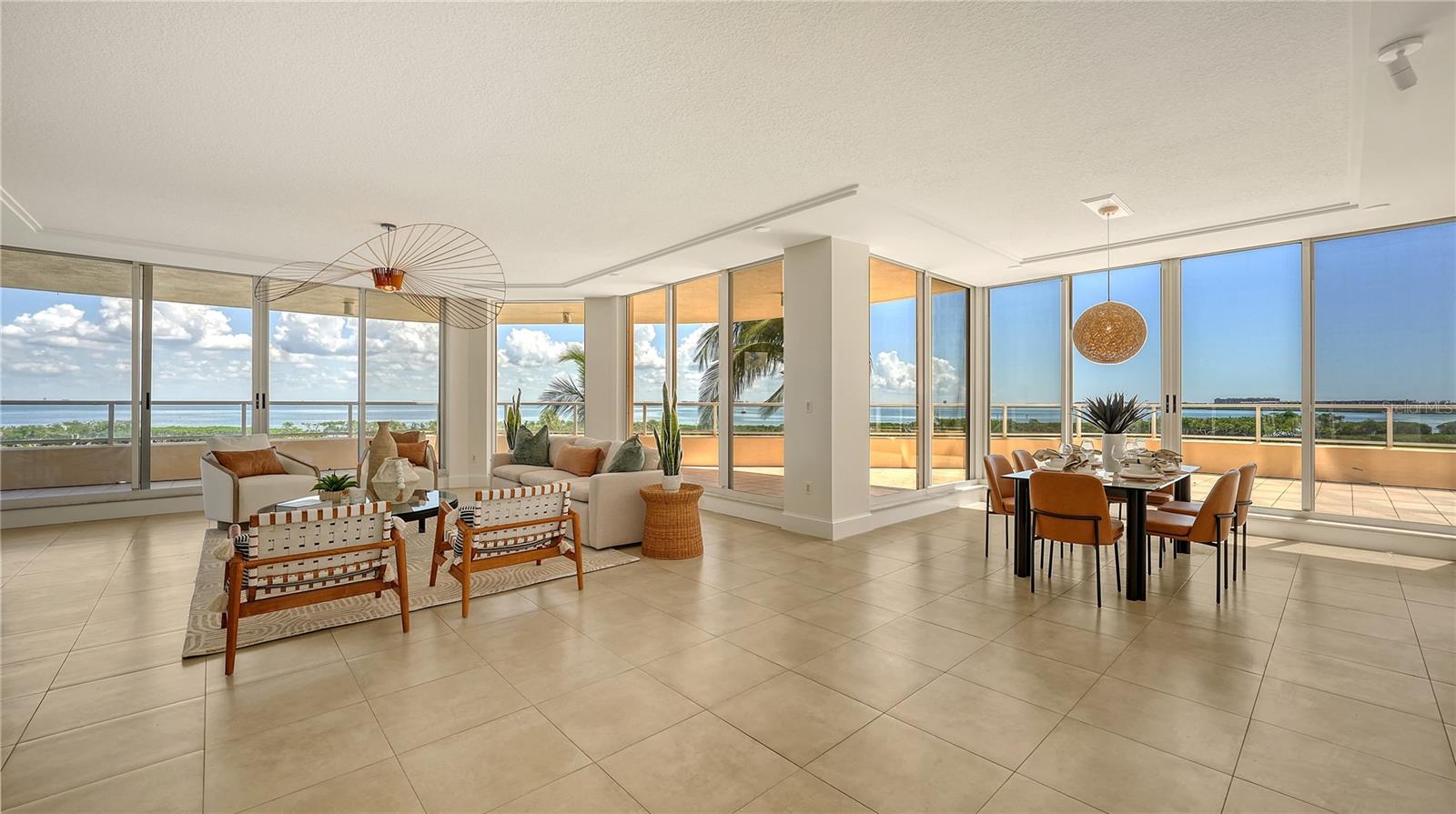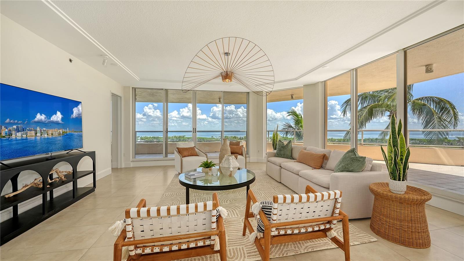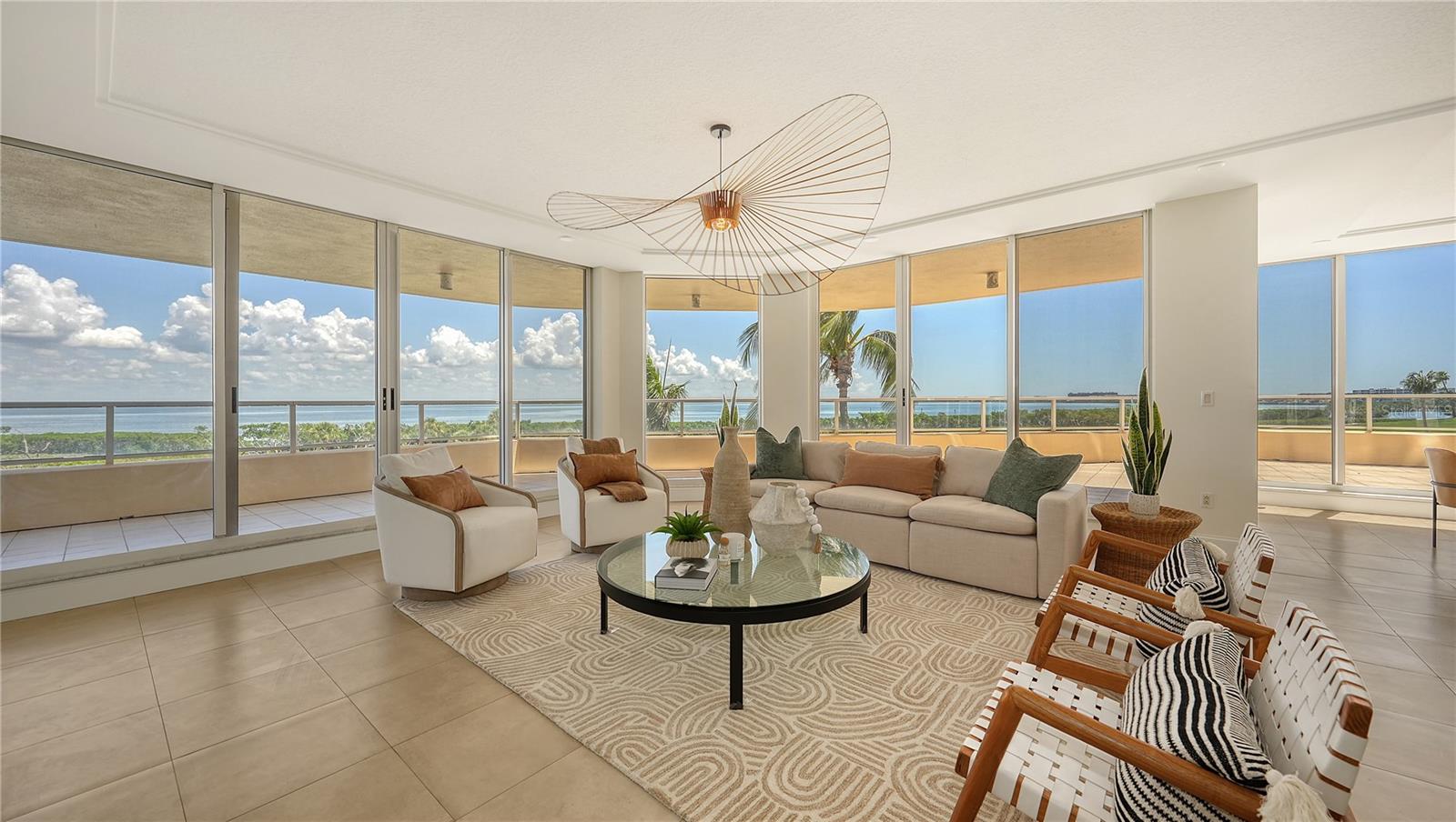 Beautifully furnished and move-in ready, this expansive three-bedroom residence offers an enviable bayfront lifestyle within Longboat Key's sought-after Grand Bay community. Spanning nearly 3,000 square feet, the open Antigua layout is framed by floor-to-ceiling glass walls that fill the interiors with natural light and connect nearly every room to the sweeping wraparound terrace. The main living space is designed for both relaxation and entertaining, with diagonal tile flooring connecting the living and dining areas. The adjacent eat-in kitchen features a center island, sleek countertops, double built-in ovens, and a breakfast nook surrounded by windows that showcase sparkling water views. The secluded primary suite is a private retreat with direct access to the terrace, a spacious walk-in closet, additional built-in closets, and marble en-suite bath with dual vanities, soaking tub, and separate glass shower. Two guest suites provide comfort and privacy for overnight visitors: one located in the northeast spot with access to the larger terrace, and the other tucked into the southwest wing with its own private balcony. Additional conveniences include a dedicated laundry room, one secure under-building parking space, and climate-controlled storage. Residents of Grand Bay enjoy a host of resort-style amenities: two heated swimming pools with sundecks, Har-Tru tennis courts, a modern fitness center, clubhouse, and a vibrant calendar of social activities. On-site management and 24-hour security provide peace of mind in this meticulously maintained community. As an exclusive benefit, owners have deeded access to the private Bay Isles Beach Club, where pristine sands of the Gulf of Mexico await. Spend the day at the beachside pavilion, host a barbecue, or join in a game of volleyball just steps from the water. Nestled on Longboat Key, Grand Bay balances privacy with proximity. Just minutes away are the boutiques and fine dining of St. Armands Circle, the cultural attractions of downtown Sarasota, and the renowned beaches of Lido and Siesta Key. From theater and art to world-class marinas and championship golf, the very best of Sarasota living is within easy reach.