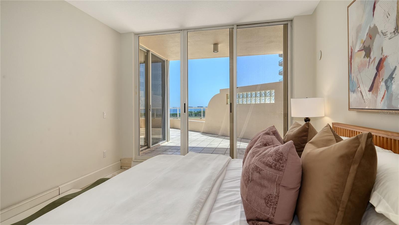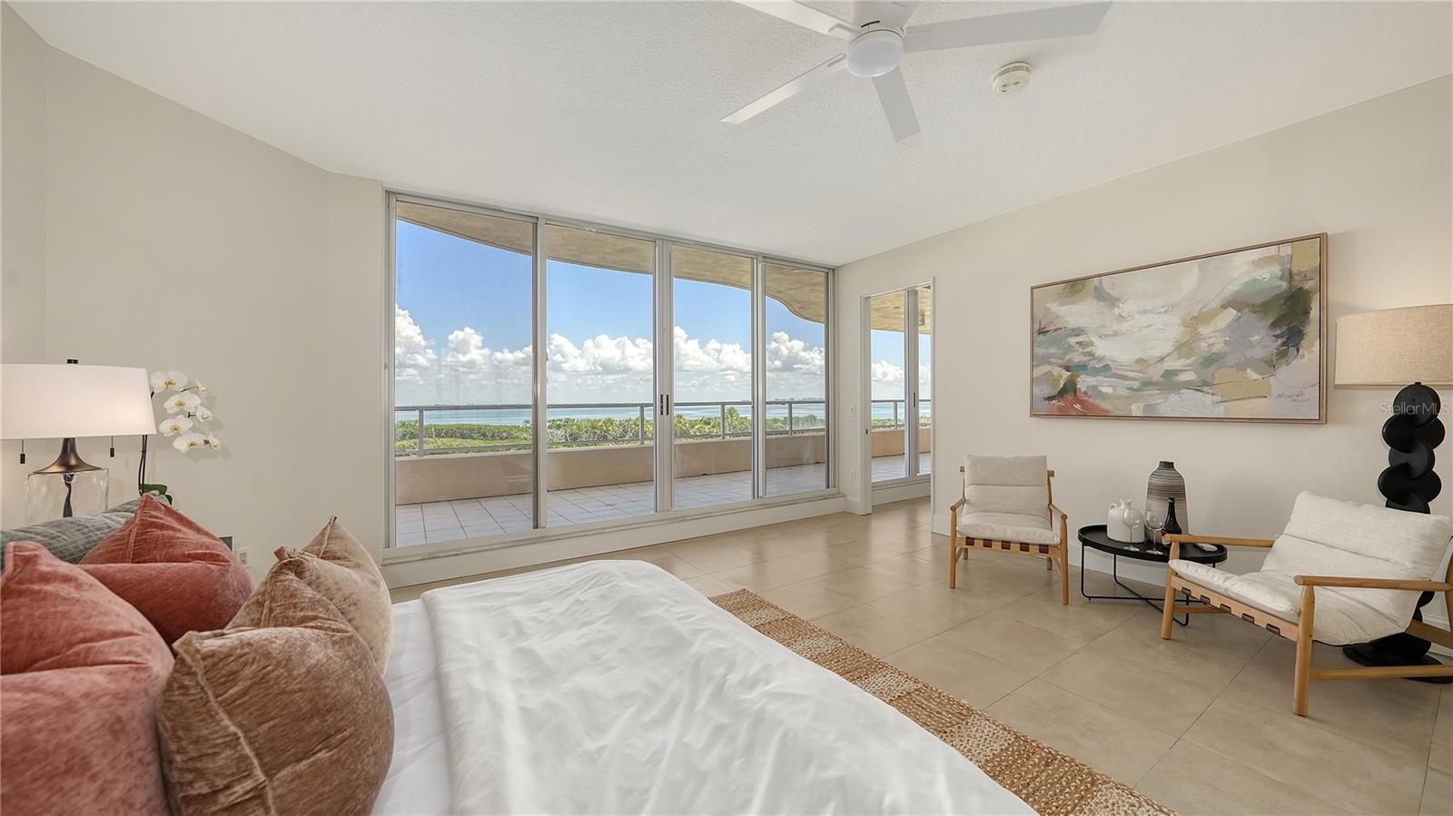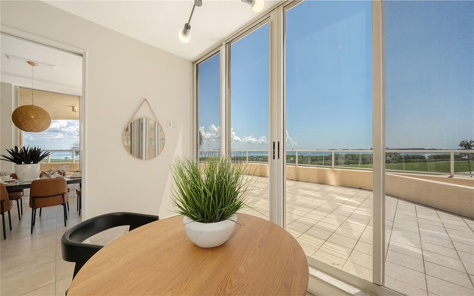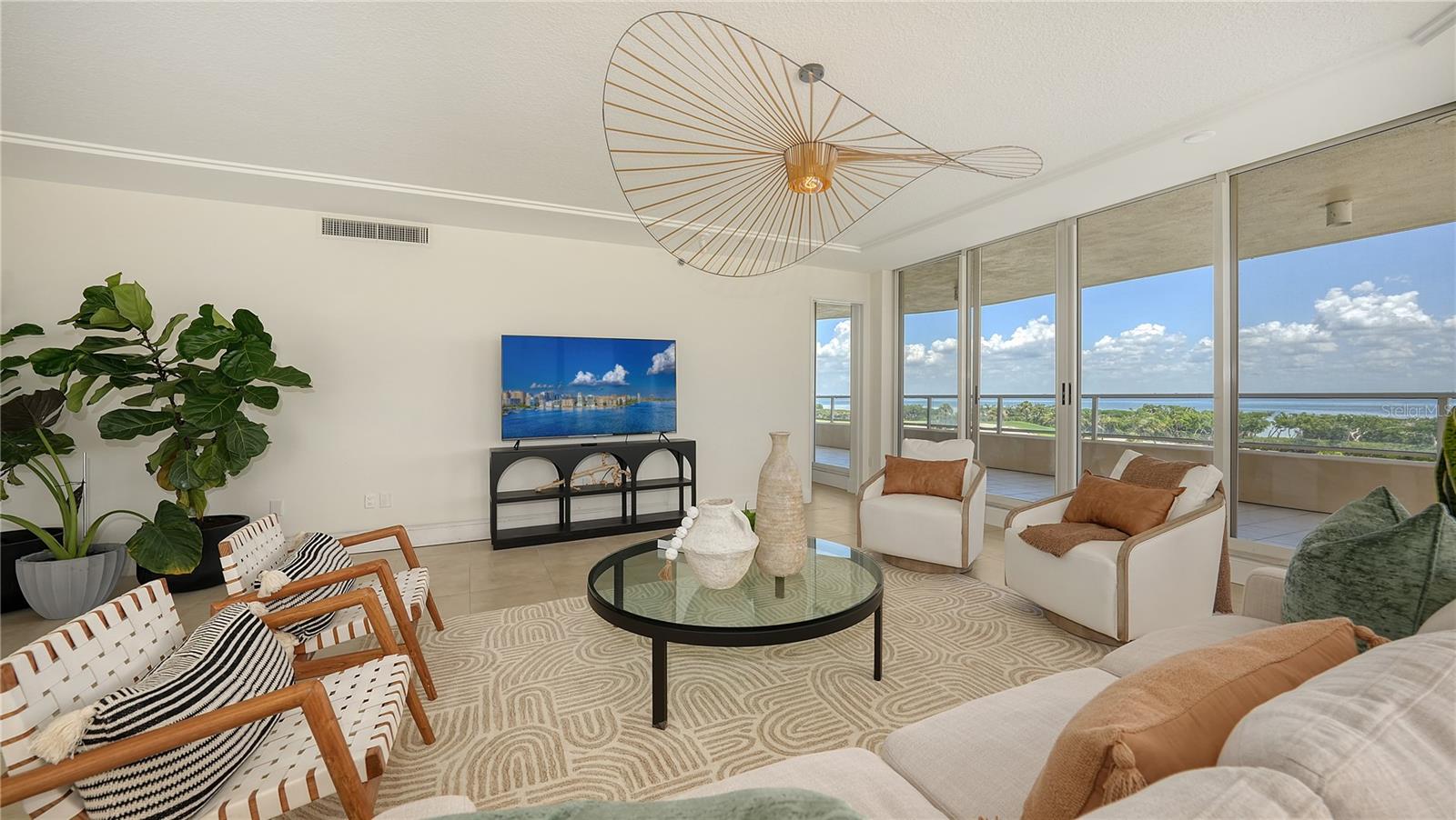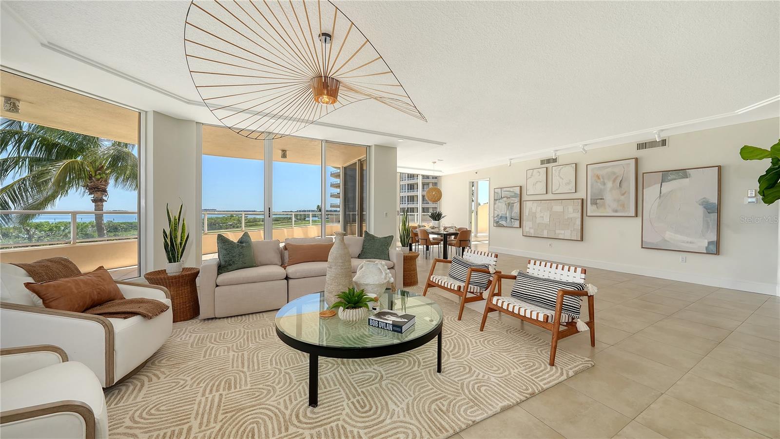 Beautifully furnished and move-in ready, this expansive three-bedroom residence offers an enviable bayfront lifestyle within Longboat Key's sought-after Grand Bay community. Spanning nearly 3,000 square feet, the open Antigua layout is framed by floor-to-ceiling glass walls that fill the interiors with natural light and connect nearly every room to the sweeping wraparound terrace. The main living space is designed for both relaxation and entertaining, with diagonal tile flooring connecting the living and dining areas. The adjacent eat-in kitchen features a center island, sleek countertops, double built-in ovens, and a breakfast nook surrounded by windows that showcase sparkling water views. The secluded primary suite is a private retreat with direct access to the terrace, a spacious walk-in closet, additional built-in closets, and marble en-suite bath with dual vanities, soaking tub, and separate glass shower. Two guest suites provide comfort and privacy for overnight visitors: one located in the northeast spot with access to the larger terrace, and the other tucked into the southwest wing with its own private balcony. Additional conveniences include a dedicated laundry room, one secure under-building parking space, and climate-controlled storage. Residents of Grand Bay enjoy a host of resort-style amenities: two heated swimming pools with sundecks, Har-Tru tennis courts, a modern fitness center, clubhouse, and a vibrant calendar of social activities. On-site management and 24-hour security provide peace of mind in this meticulously maintained community. As an exclusive benefit, owners have deeded access to the private Bay Isles Beach Club, where pristine sands of the Gulf of Mexico await. Spend the day at the beachside pavilion, host a barbecue, or join in a game of volleyball just steps from the water. Nestled on Longboat Key, Grand Bay balances privacy with proximity. Just minutes away are the boutiques and fine dining of St. Armands Circle, the cultural attractions of downtown Sarasota, and the renowned beaches of Lido and Siesta Key. From theater and art to world-class marinas and championship golf, the very best of Sarasota living is within easy reach.