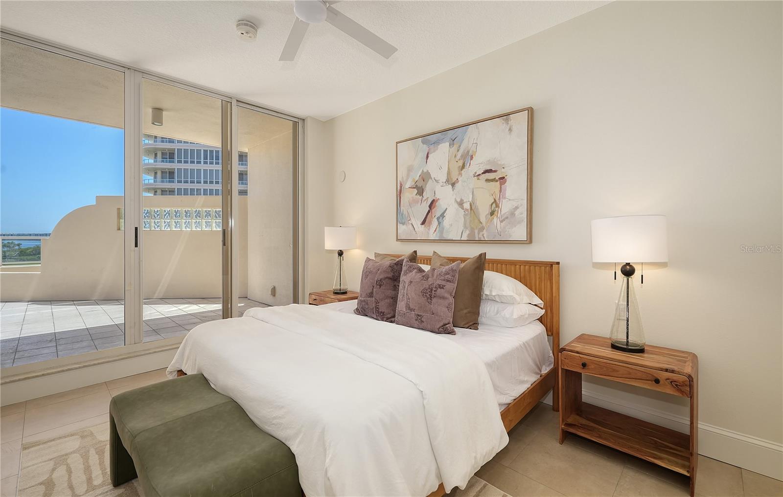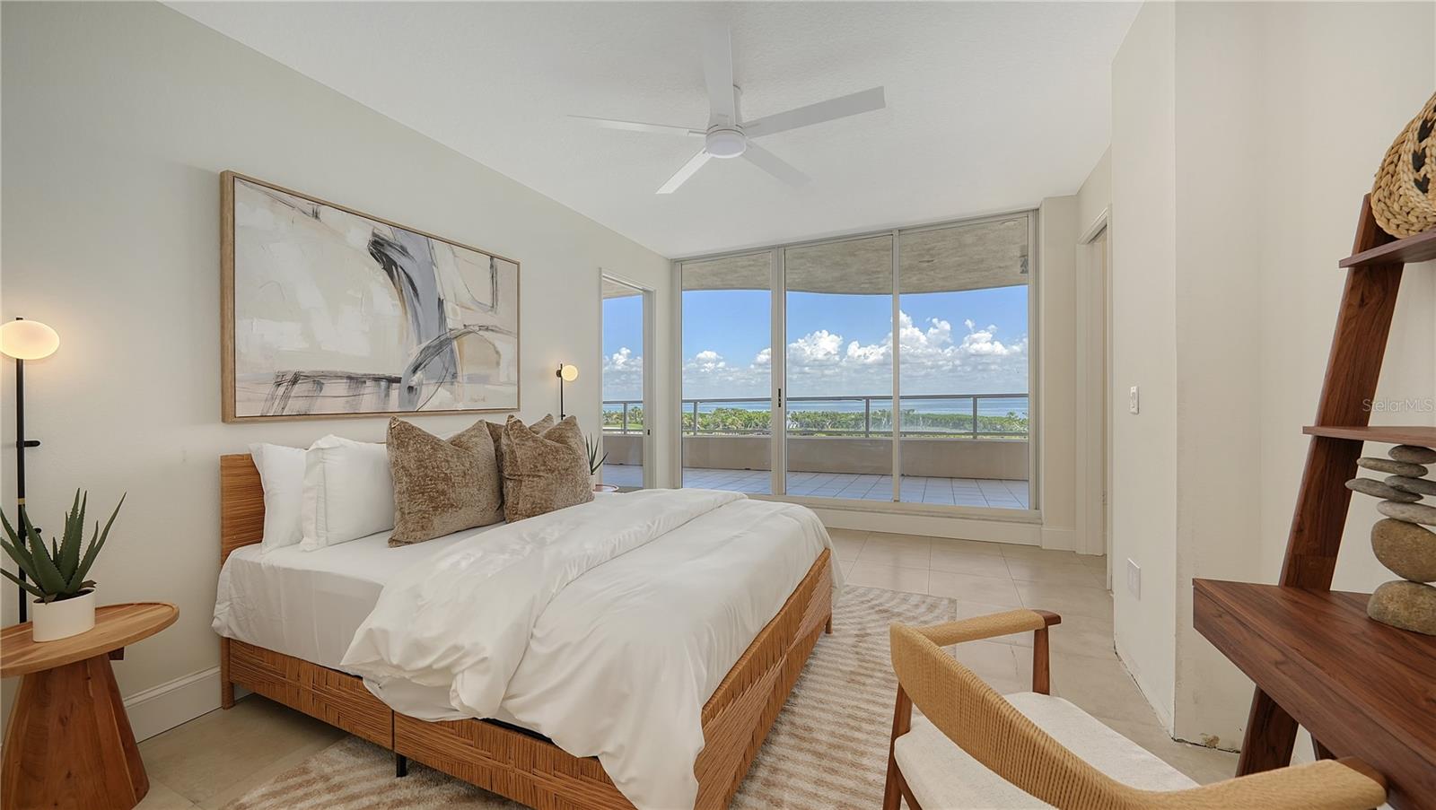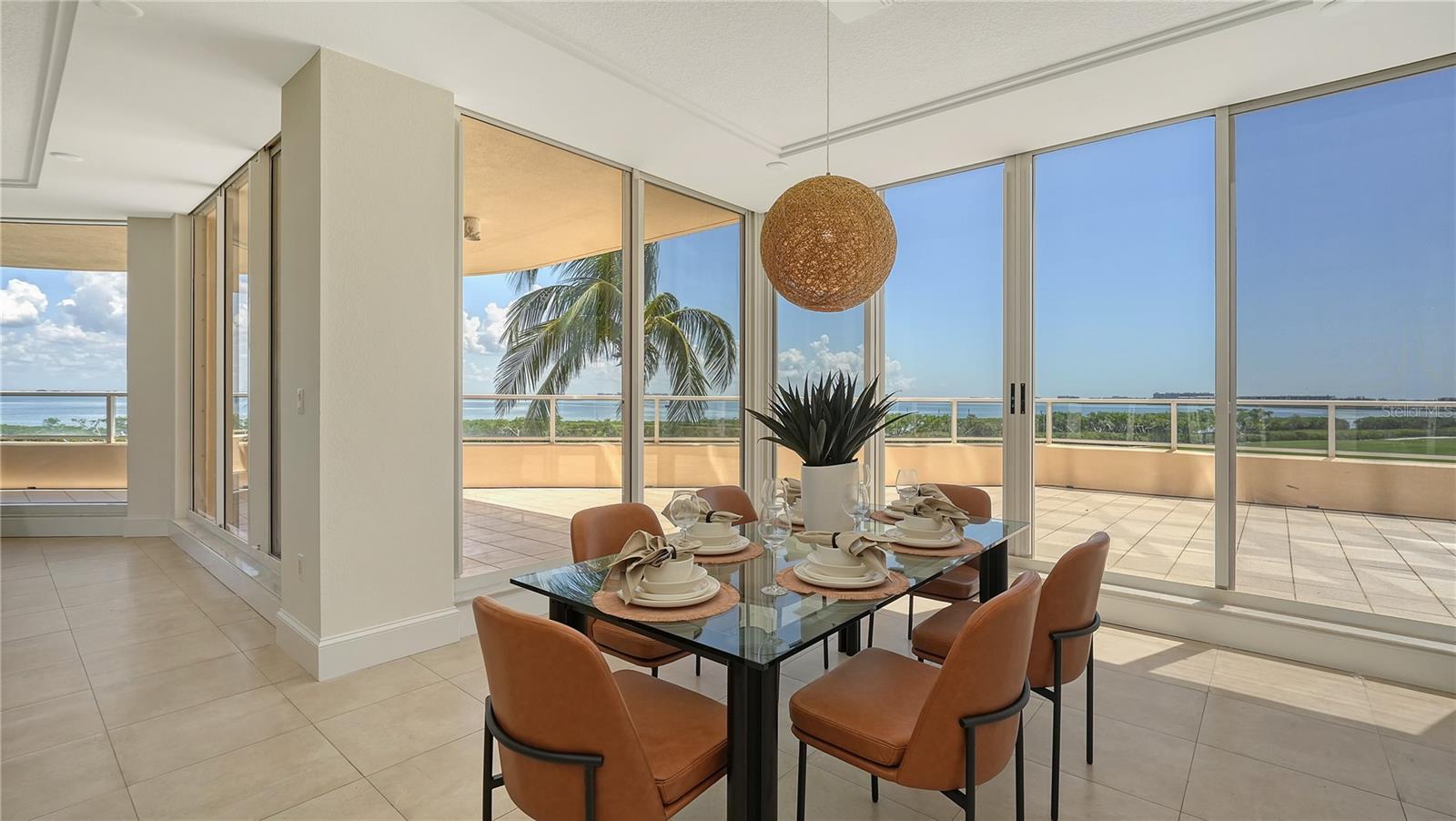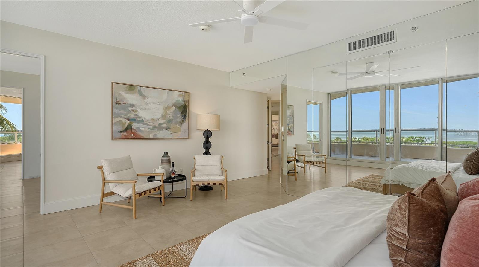 Beautifully furnished and move-in ready, this expansive three-bedroom residence offers an enviable bayfront lifestyle within Longboat Key's sought-after Grand Bay community. Spanning nearly 3,000 square feet, the open Antigua layout is framed by floor-to-ceiling glass walls that fill the interiors with natural light and connect nearly every room to the sweeping wraparound terrace. The main living space is designed for both relaxation and entertaining, with diagonal tile flooring connecting the living and dining areas. The adjacent eat-in kitchen features a center island, sleek countertops, double built-in ovens, and a breakfast nook surrounded by windows that showcase sparkling water views. The secluded primary suite is a private retreat with direct access to the terrace, a spacious walk-in closet, additional built-in closets, and marble en-suite bath with dual vanities, soaking tub, and separate glass shower. Two guest suites provide comfort and privacy for overnight visitors: one located in the northeast spot with access to the larger terrace, and the other tucked into the southwest wing with its own private balcony. Additional conveniences include a dedicated laundry room, one secure under-building parking space, and climate-controlled storage. Residents of Grand Bay enjoy a host of resort-style amenities: two heated swimming pools with sundecks, Har-Tru tennis courts, a modern fitness center, clubhouse, and a vibrant calendar of social activities. On-site management and 24-hour security provide peace of mind in this meticulously maintained community. As an exclusive benefit, owners have deeded access to the private Bay Isles Beach Club, where pristine sands of the Gulf of Mexico await. Spend the day at the beachside pavilion, host a barbecue, or join in a game of volleyball just steps from the water. Nestled on Longboat Key, Grand Bay balances privacy with proximity. Just minutes away are the boutiques and fine dining of St. Armands Circle, the cultural attractions of downtown Sarasota, and the renowned beaches of Lido and Siesta Key. From theater and art to world-class marinas and championship golf, the very best of Sarasota living is within easy reach.