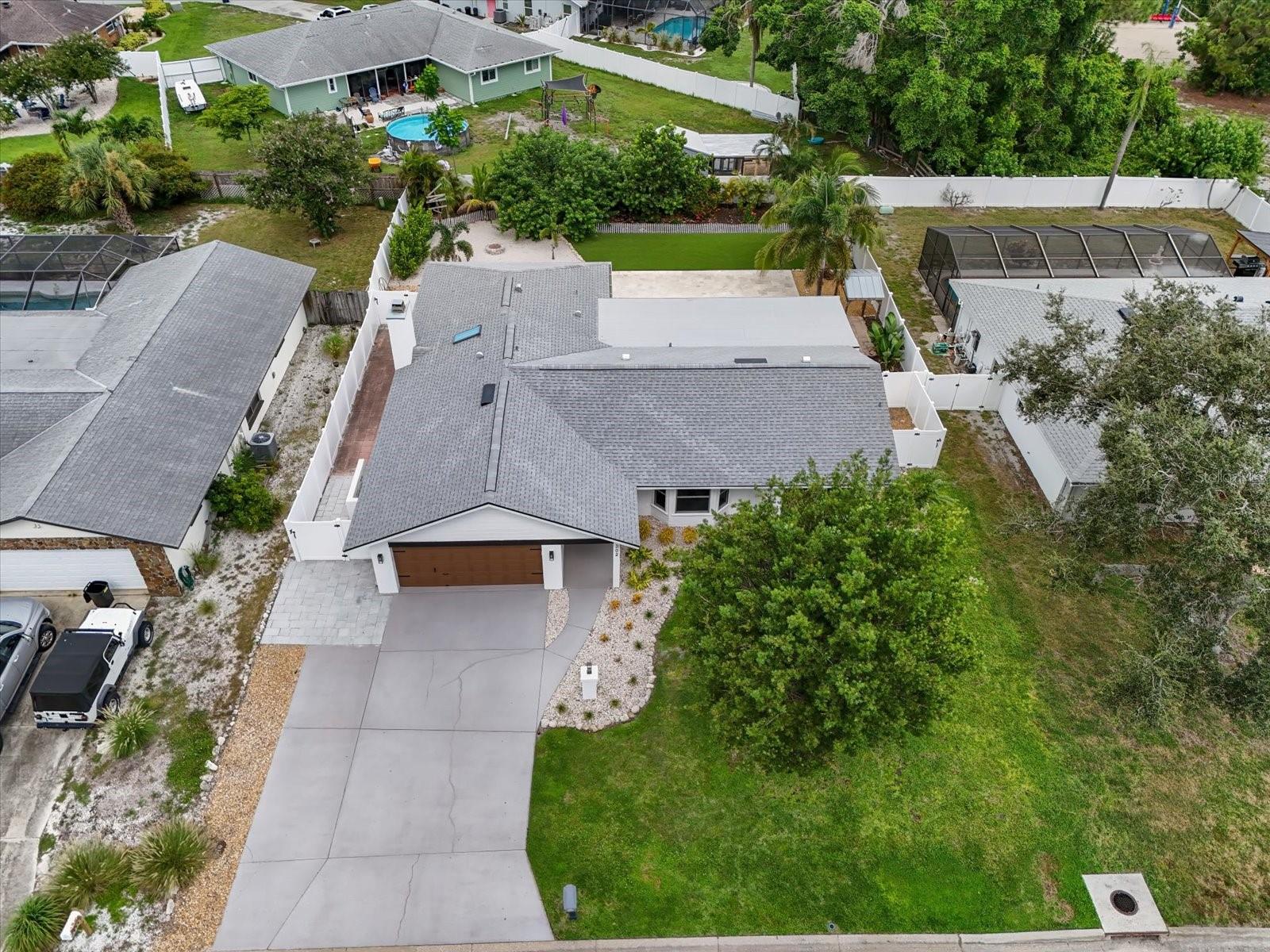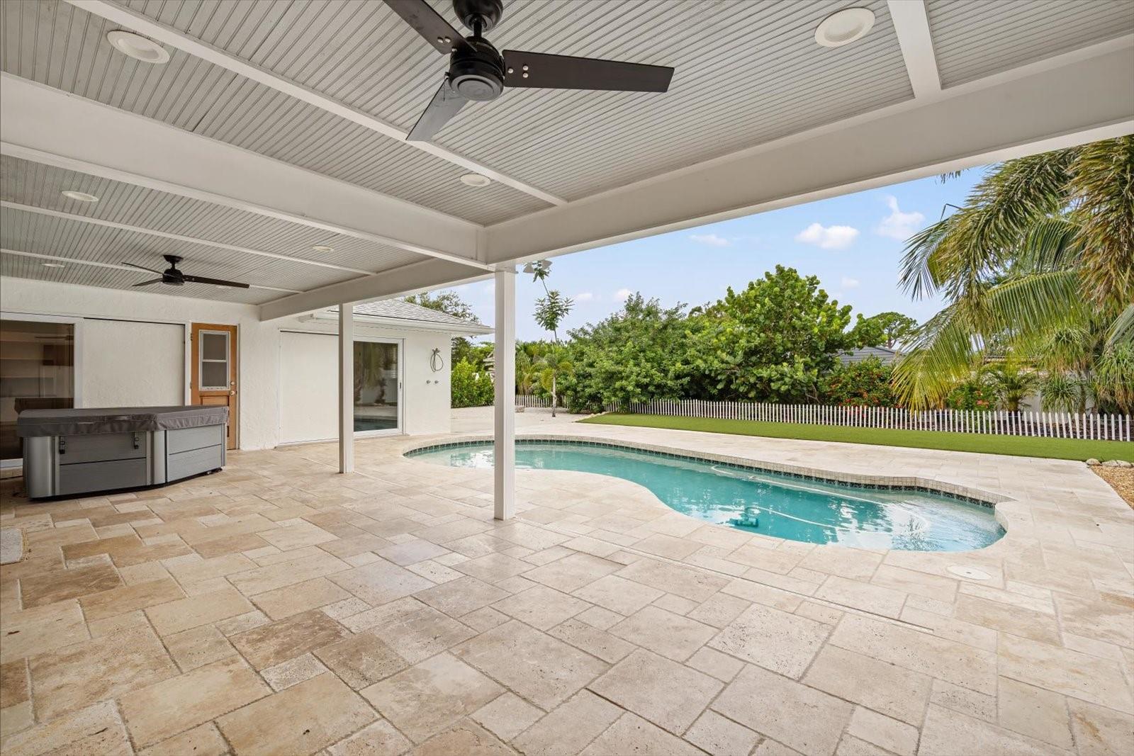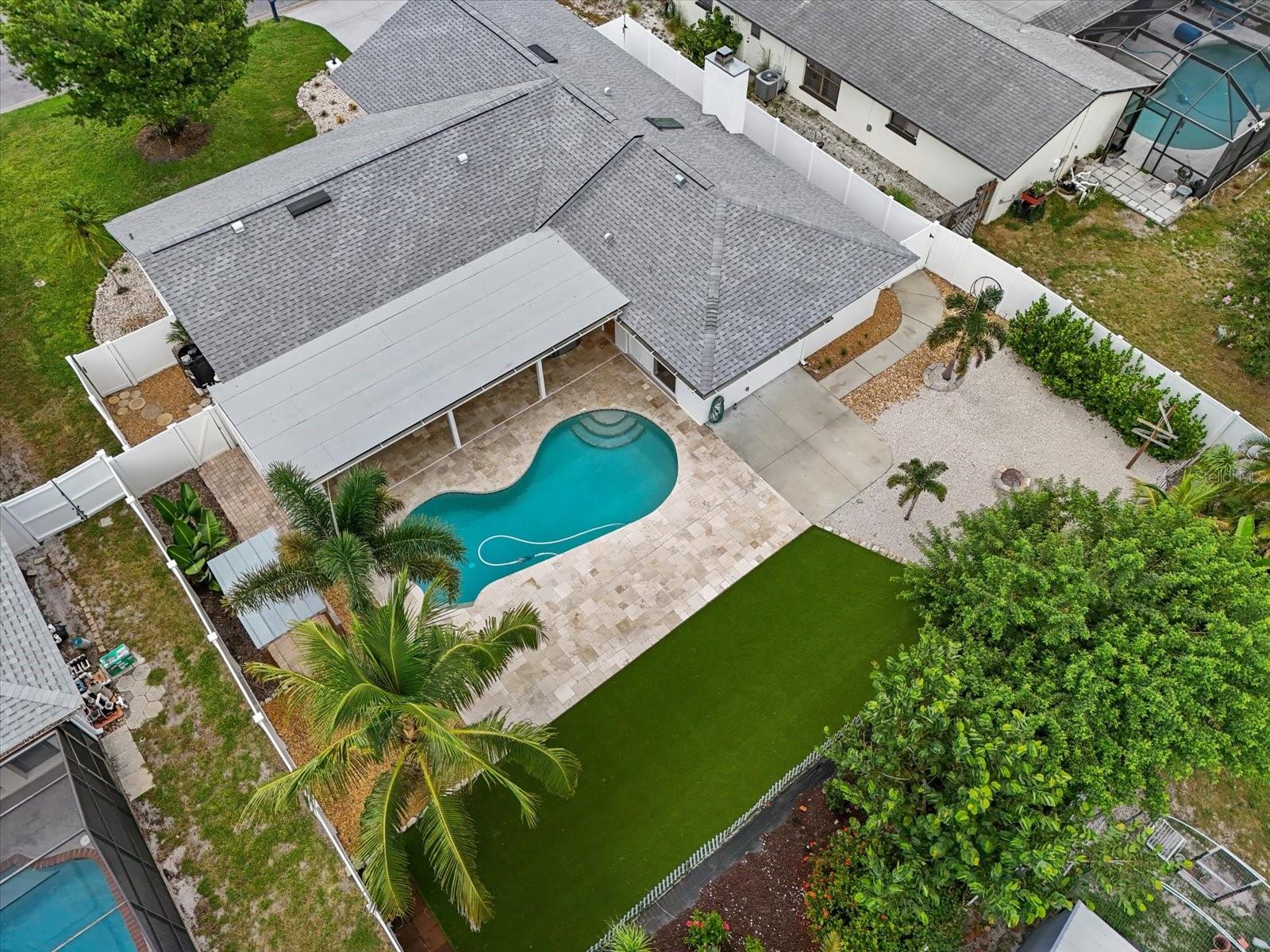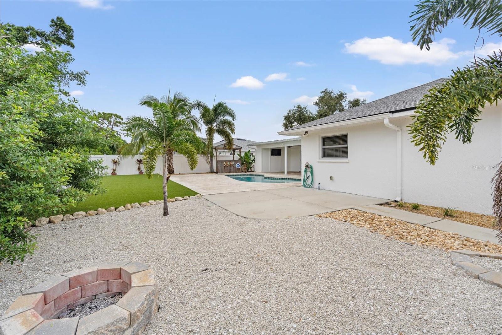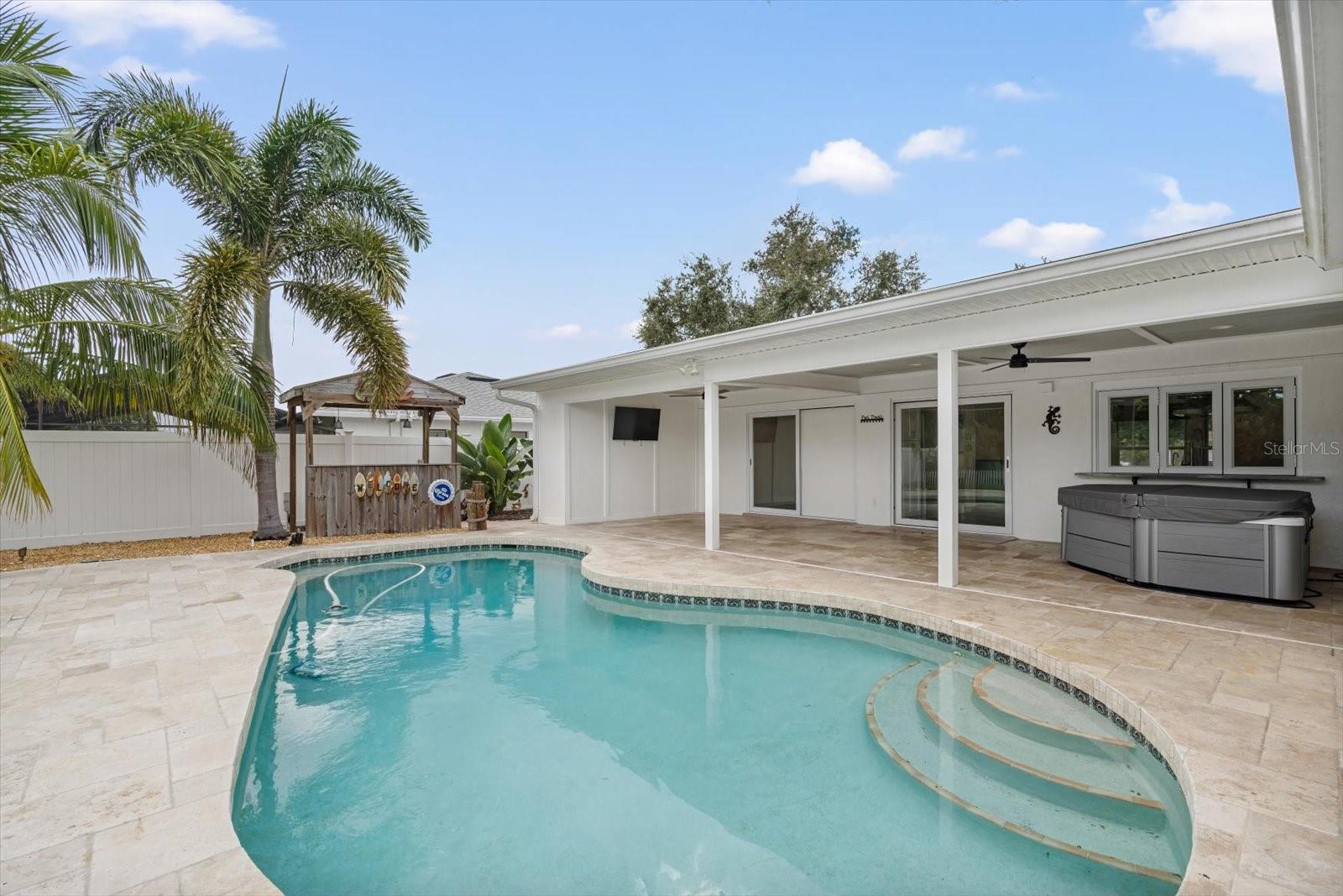 One or more photo(s) has been virtually staged. This beautifully updated pool home offers the perfect blend of comfort and peace of mind with hurricane impact windows, 200-amp electric service (2023), and a tankless water heater (2020). The home was freshly painted outside and includes a car charging station (2023)--a modern convenience for today's lifestyle.Inside, the inviting open floor plan features high ceilings, built-ins, and a cozy wood-burning fireplace in the living room. The chef's kitchen is a showstopper with a massive island with bar seating, granite countertops, stainless steel appliances, a Frigidaire Professional double-door refrigerator, abundant cabinetry, under-sink water filtration, and a convenient pass-through window to the lanai.The split-bedroom design provides privacy for the primary suite, complete with sliding doors to the pool concealed with a barn door, a large walk-in closet plus linen closet, and a spa-style ensuite featuring a granite vanity and walk-in shower. Across the home, two guest bedrooms--each with a walk-in closet--share a bathroom with granite countertops and a tub/shower combo, all tucked behind a pocket door for added privacy.A functional laundry room with washer/dryer, storage cabinetry, utility sink, and a pocket door to keep it out of view adds everyday convenience. The spacious two-car garage offers extra storage space.Step outside to your backyard oasis with a heated saltwater pool and recent upgrades, including a Hayward pool vacuum (2024), new salt cell (2025), LED multi-colored pool lights (2024), and a new pump/motor (2025). Enjoy an expansive covered lanai with hot tub, outdoor shower, firepit, and grilling station with electric and lighting. New landscaping and artificial turf complete the low-maintenance outdoor retreat.With a low HOA of just $230 per year, excellent rental and Airbnb potential, and a prime location only 9 miles from Manatee Public Beach, this NW Bradenton gem checks every box.