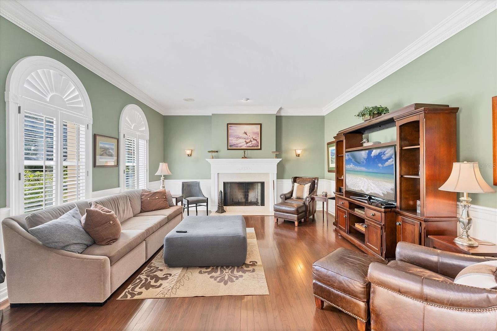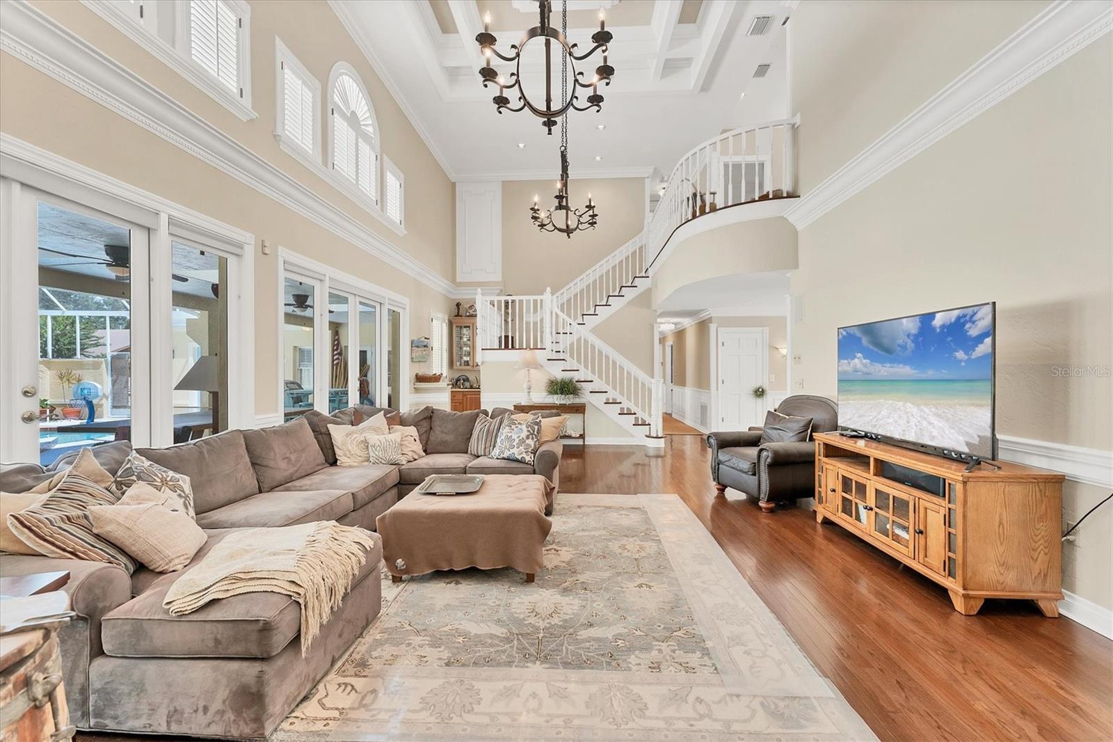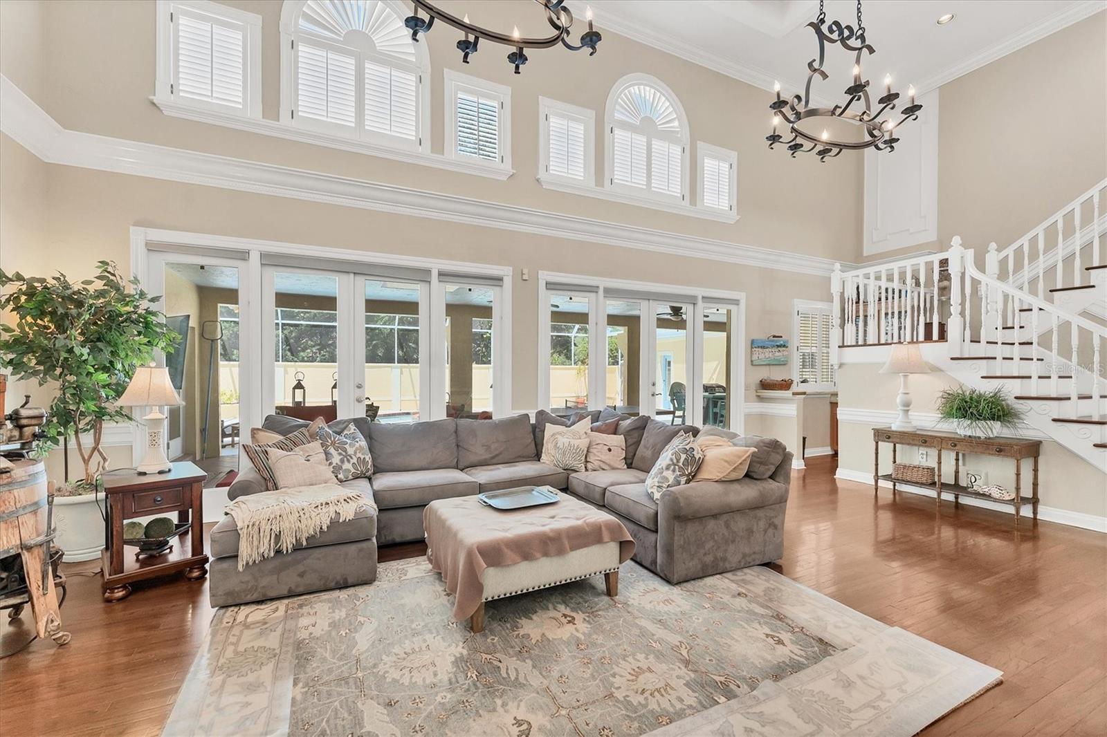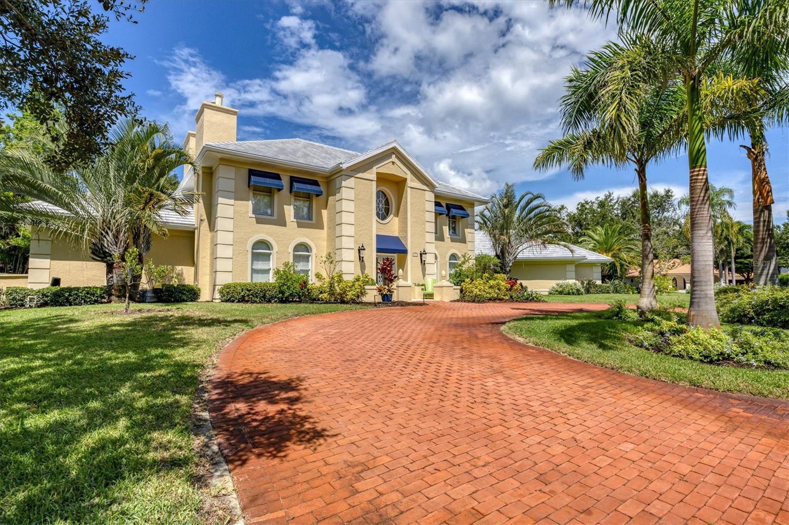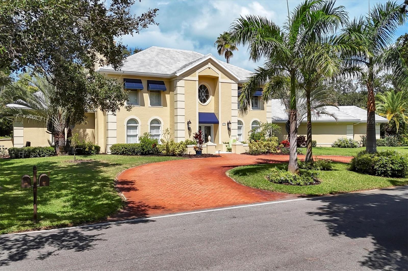 Grand 2 Story Colonial 5BR, 3.5 Bath & 3.5 Car Gar., Pool home sitting on almost an acre within "The Landings", a majestic West of Trail 24/7 attended guard-gated tennis community (membership optional). As you drive in you will surely see, Moms and Dads riding bikes or roller blading with kids, sisters walking the family dog, or boys with fishing poles heading down to the intracoastal/bay. Arriving to your inviting, charming and elegant home, you would enter the triple wide brick driveway to a side loading garages, and guests are welcomed over a brick half circle driveway to the front and greeted by pineapple topped pillars and black carriage lights to enter through glass haint blue double doors and into the foyer. Upon entering, you know you are in a special space that is warm and inviting with recently refinished real hardwood floors, chair rail, and wainscoting that wraps the walls and is carried through to the Den/Family room w/ wood-burning fireplace to the left, and the right an elegant dining room with a chandelier and ceiling medallion. Stepping straight ahead you'll pass by the wood staircase with white railings, turned balusters, and acorn-topped newel posts, into the 20' soaring ceiling living room where the exquisite wood work it taken to another level literally with chair rail, wall molding, upper windows with plantation shutters, and colonial detailed stacked crown molding, highlighted with multi-depth coffered ceiling punctuated by two large iron oval candelabra chandeliers. Of course, this room is also anchored with a grand wood-burning fireplace and mantle. Two quadruple-paned French doors lead out to the massive 43'x14' covered lanai and 52'x30' walled and screen-enclosed all privately housing the 35'x14' heated pool with a 8-person circular spa. This home is a must-see, and I could wax on and on, as each room has the same level of craftsmanship, grandeur with built-ins, bonus spaces plus some hidden features to delight. BRAND NEW $100K ROOF, and Freshly Painted Exterior just completed in Aug. of this year! Enjoy the conveniences of GAS 6-Burner Stove, on-demand water heater, and pool heater. 4 zones of HVAC, two of which are 1 year old, well for irrigation with a Rid-o-rust injector an American Hydro system ensuring happy plants and a lush lawn. These types of homes don't come on the market very often. Make this spectacular home your home now - before someone else does!