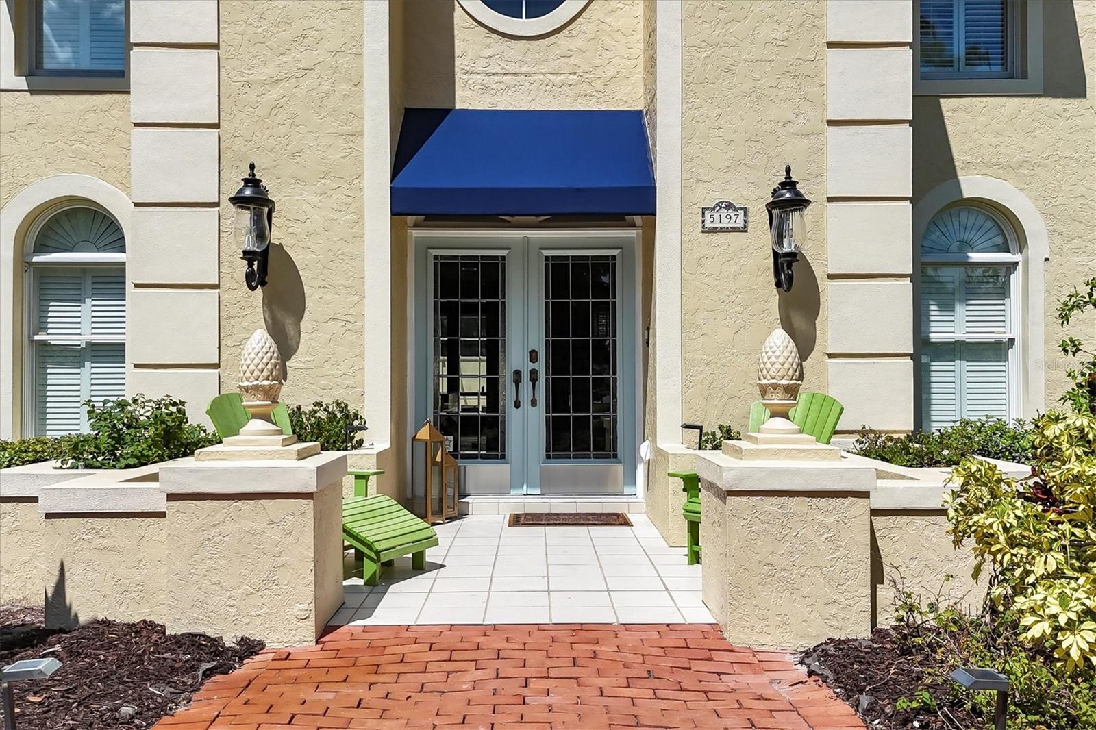 Exterior: French Doors, Lighting, Private Mailbox, Rain Gutters