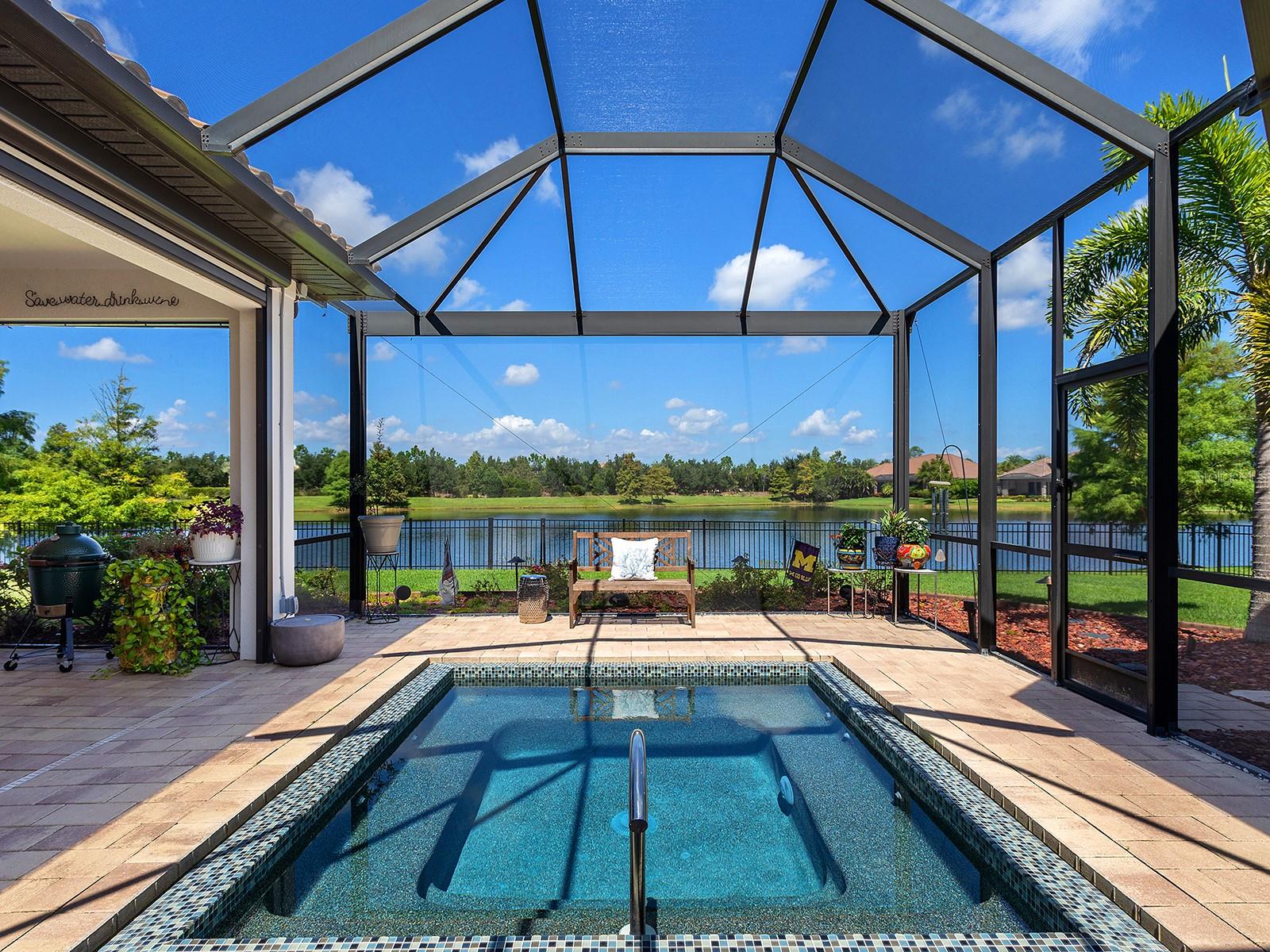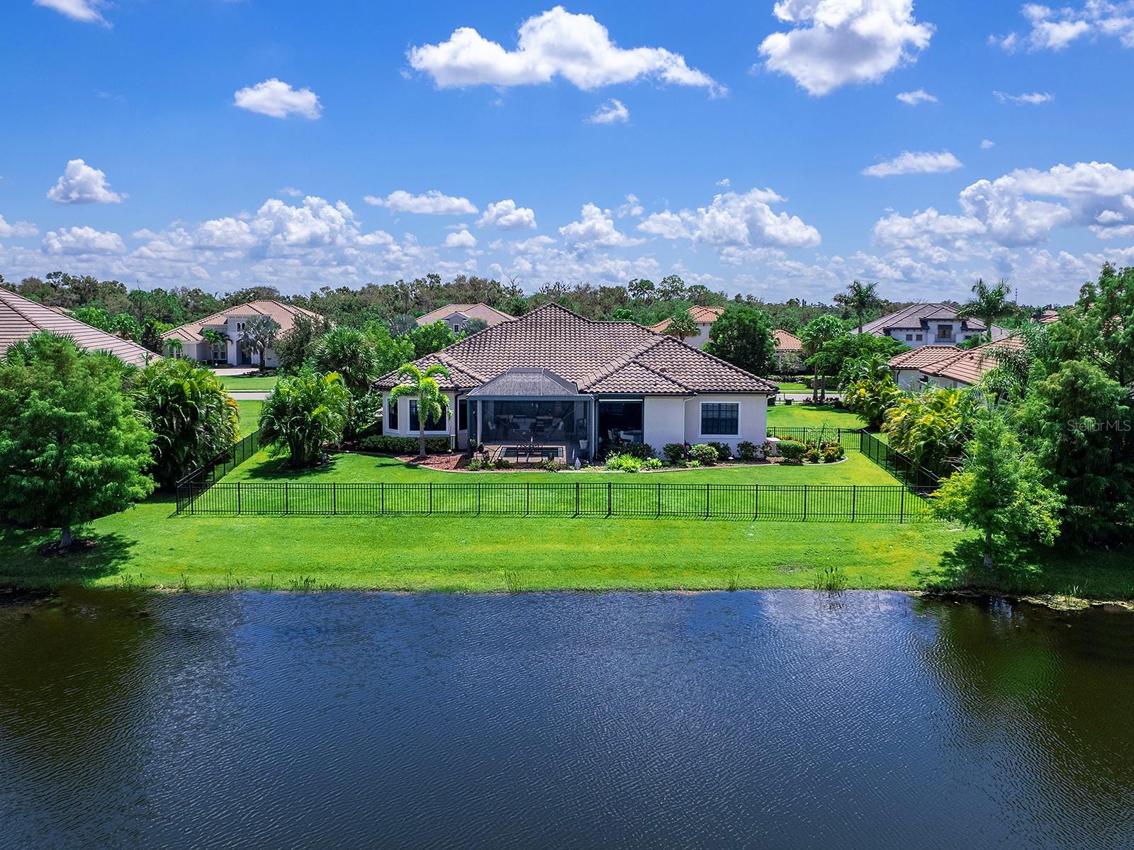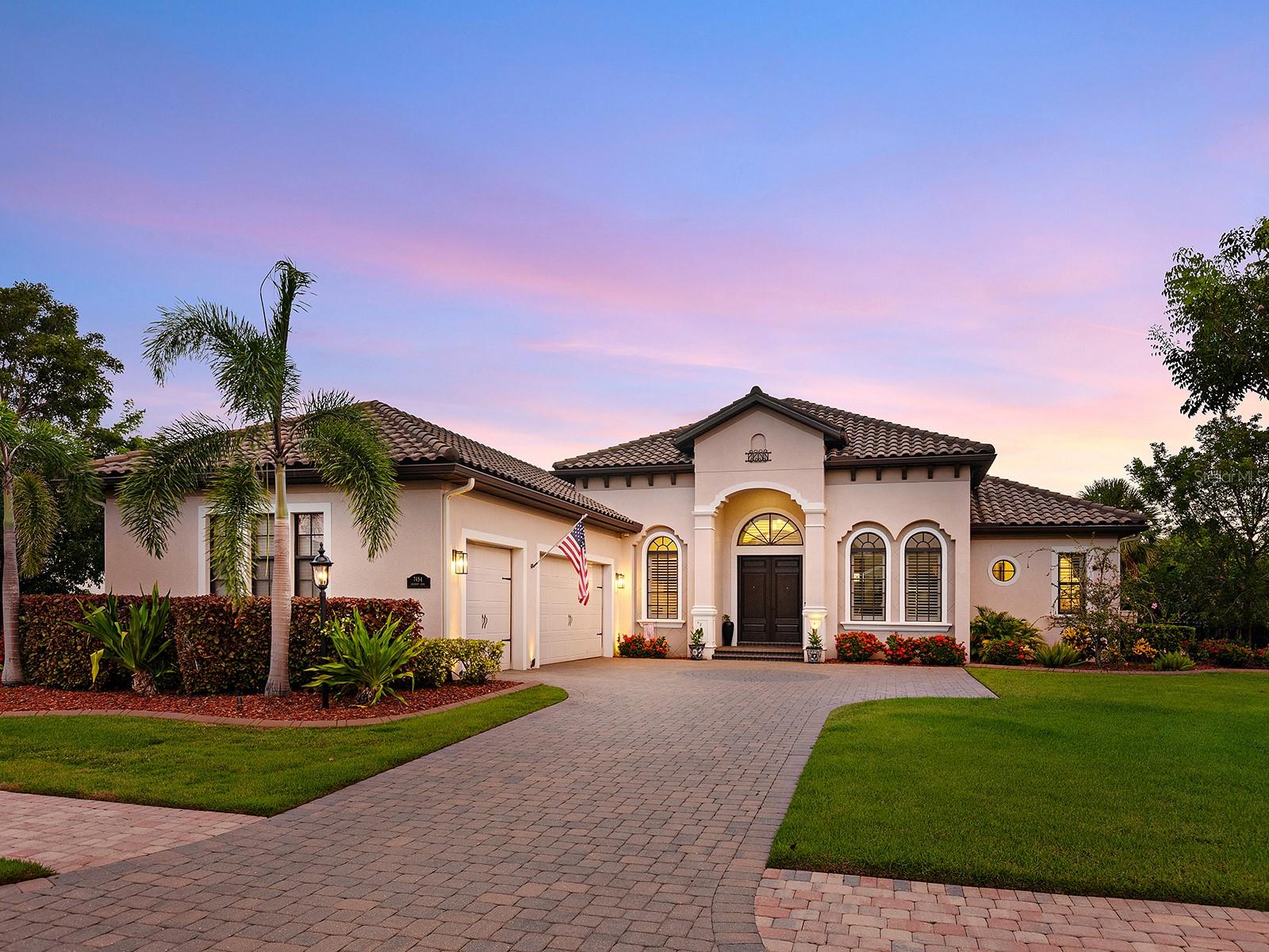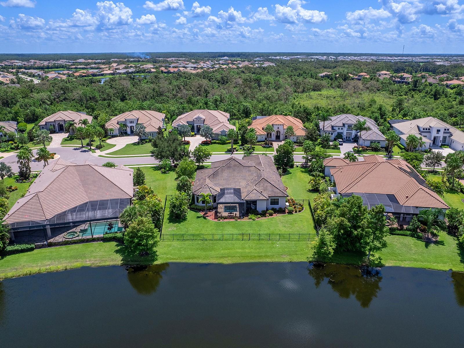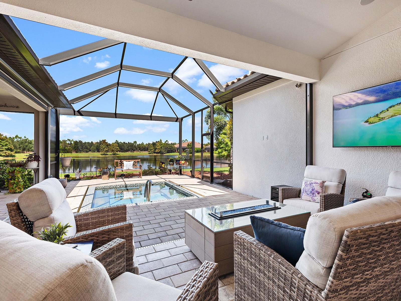 Sunset views and one of the largest homesites in Seacroft set the stage for this custom John Cannon home in Country Club East. With 4 bedrooms, 3.5 baths, a private office, and expansive indoor-outdoor living, the residence showcases lake vistas, unforgettable sunsets, and a rare oversized fenced yard--now offered at a value that reflects both the quality and extensive upgrades.The great room blends 12' ceilings, wood floors, designer lighting and fans, 10' impact sliders with remote-controlled shades, and seamless access to the lanai. A chef's dream, the kitchen offers a 48" Sub-Zero refrigerator, new Bosch dishwasher, oversized island, custom pantry shelving, wood cabinetry, and beam-and-beadboard ceiling detail opening to the dining area. The owner's suite features wood floors (2023), tranquil lake views, dual custom walk-in closets, granite vanities, an oversized shower with rainhead and dual faucets, and a soaking tub. Three additional bedrooms--one en-suite--plus an updated powder room (2024) complete the thoughtful plan.Outdoor living is exceptional with an oversized spa, outdoor kitchen with Lynx grill, refrigerator, and granite bar, new no-see-um screens (2023), hurricane-rated drop-down screens (2024), cage and landscape lighting, and a retractable front-door screen for cross-breezes. The oversized lot with new fencing (2023) creates privacy and a sense of space rarely found in the community.Recent updates elevate peace of mind: freshly painted interior/exterior (2023), impact windows and doors, whole-house generator (2023), 3-zone HVAC with allergen-friendly blue light, plantation shutters and wood blinds (2024), new washer/dryer (2025), and luxury vinyl plank in bedrooms 2-4 (2023). All mounted TVs convey, including two on the lanai plus those in the great room, owner's suite, and bedrooms. The garage is climate-controlled with a mini-split A/C (2023), Icynene insulation, custom flooring, built-in cabinetry, and overhead storage.Country Club East residents enjoy three resort-style pools, fitness, and optional membership at Lakewood Ranch Golf & Country Club. Just outside the gates: Waterside Place, Main Street, dining, shopping, medical facilities, and Gulf beaches all within minutes.