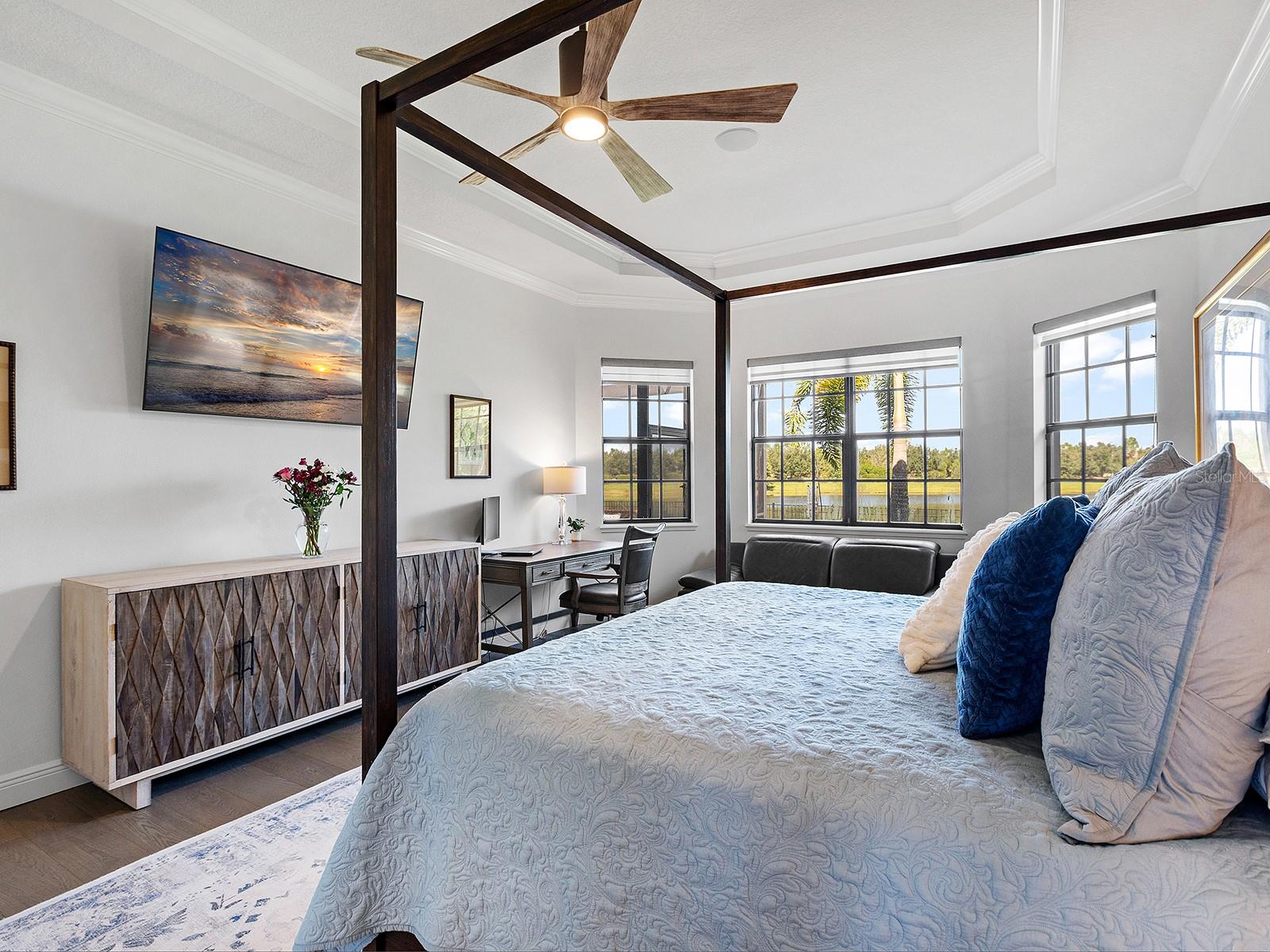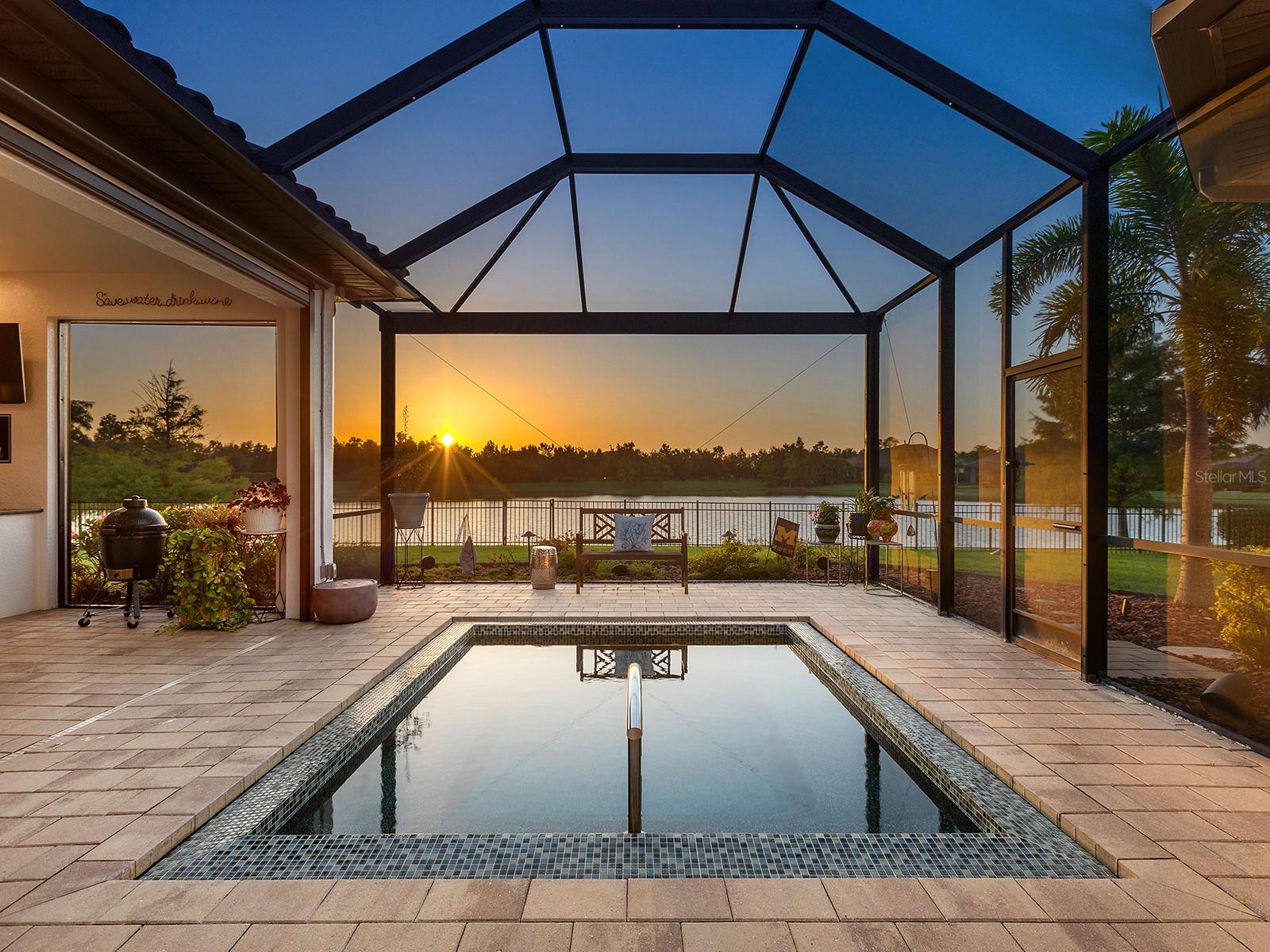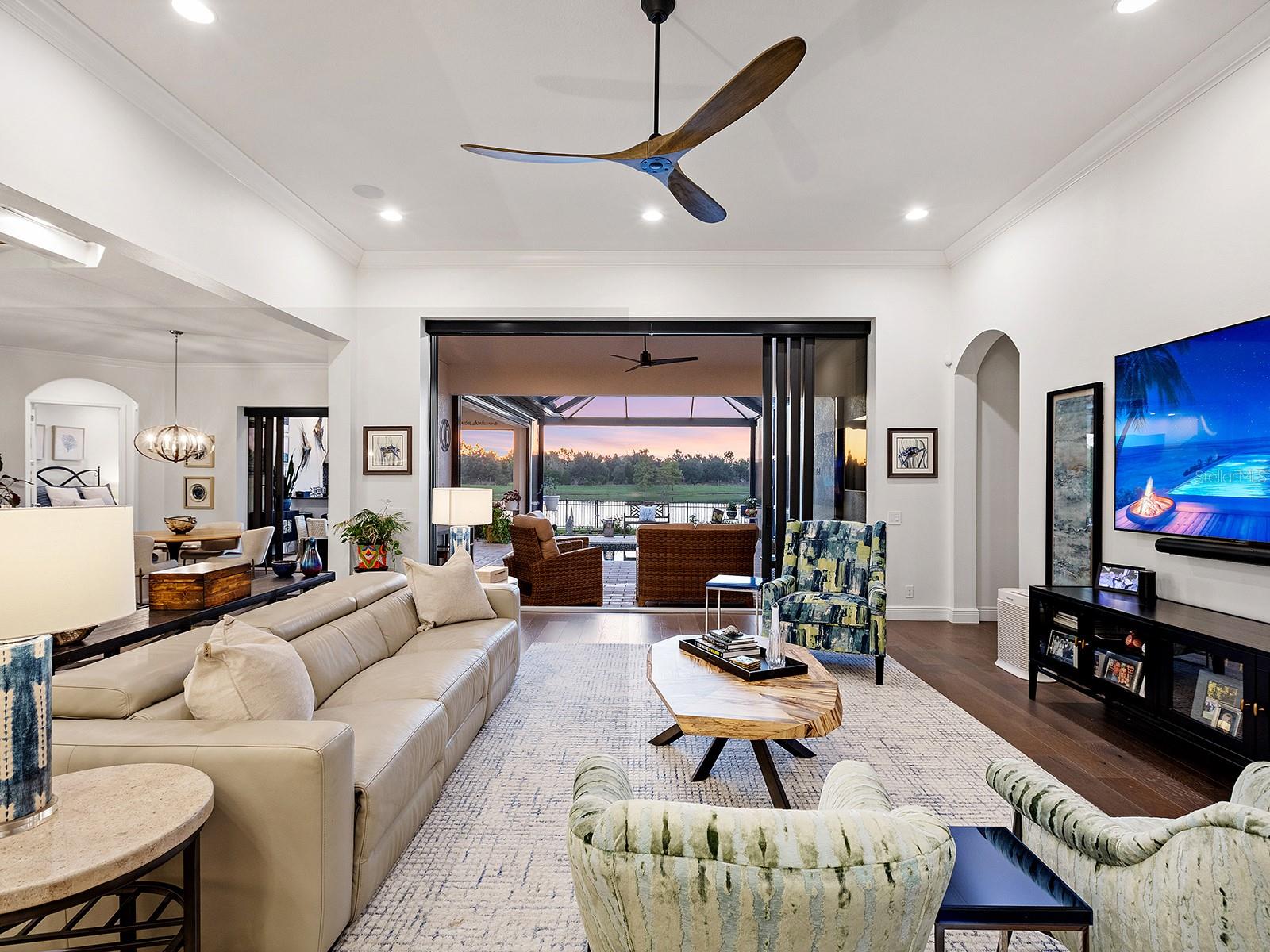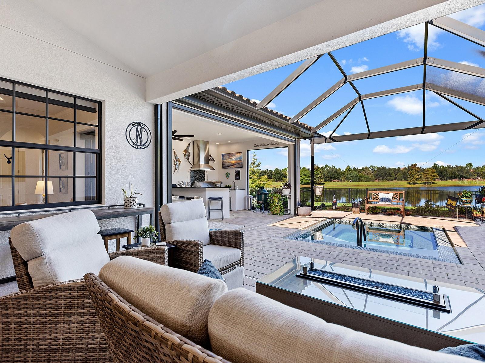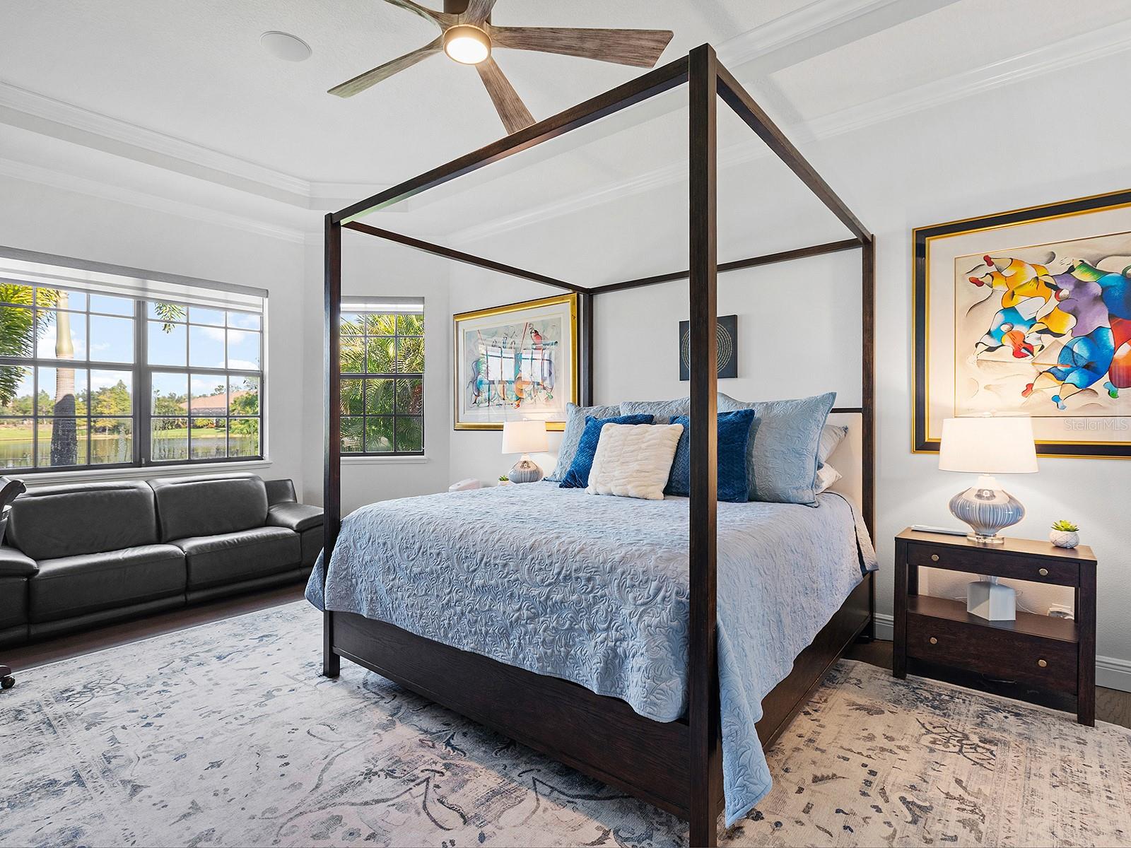 Sunset views and one of the largest homesites in Seacroft set the stage for this custom John Cannon home in Country Club East. With 4 bedrooms, 3.5 baths, a private office, and expansive indoor-outdoor living, the residence showcases lake vistas, unforgettable sunsets, and a rare oversized fenced yard--now offered at a value that reflects both the quality and extensive upgrades.The great room blends 12' ceilings, wood floors, designer lighting and fans, 10' impact sliders with remote-controlled shades, and seamless access to the lanai. A chef's dream, the kitchen offers a 48" Sub-Zero refrigerator, new Bosch dishwasher, oversized island, custom pantry shelving, wood cabinetry, and beam-and-beadboard ceiling detail opening to the dining area. The owner's suite features wood floors (2023), tranquil lake views, dual custom walk-in closets, granite vanities, an oversized shower with rainhead and dual faucets, and a soaking tub. Three additional bedrooms--one en-suite--plus an updated powder room (2024) complete the thoughtful plan.Outdoor living is exceptional with an oversized spa, outdoor kitchen with Lynx grill, refrigerator, and granite bar, new no-see-um screens (2023), hurricane-rated drop-down screens (2024), cage and landscape lighting, and a retractable front-door screen for cross-breezes. The oversized lot with new fencing (2023) creates privacy and a sense of space rarely found in the community.Recent updates elevate peace of mind: freshly painted interior/exterior (2023), impact windows and doors, whole-house generator (2023), 3-zone HVAC with allergen-friendly blue light, plantation shutters and wood blinds (2024), new washer/dryer (2025), and luxury vinyl plank in bedrooms 2-4 (2023). All mounted TVs convey, including two on the lanai plus those in the great room, owner's suite, and bedrooms. The garage is climate-controlled with a mini-split A/C (2023), Icynene insulation, custom flooring, built-in cabinetry, and overhead storage.Country Club East residents enjoy three resort-style pools, fitness, and optional membership at Lakewood Ranch Golf & Country Club. Just outside the gates: Waterside Place, Main Street, dining, shopping, medical facilities, and Gulf beaches all within minutes.