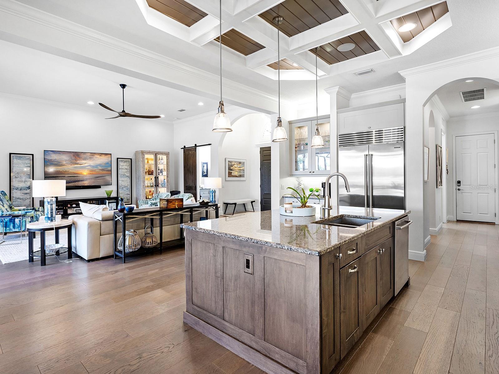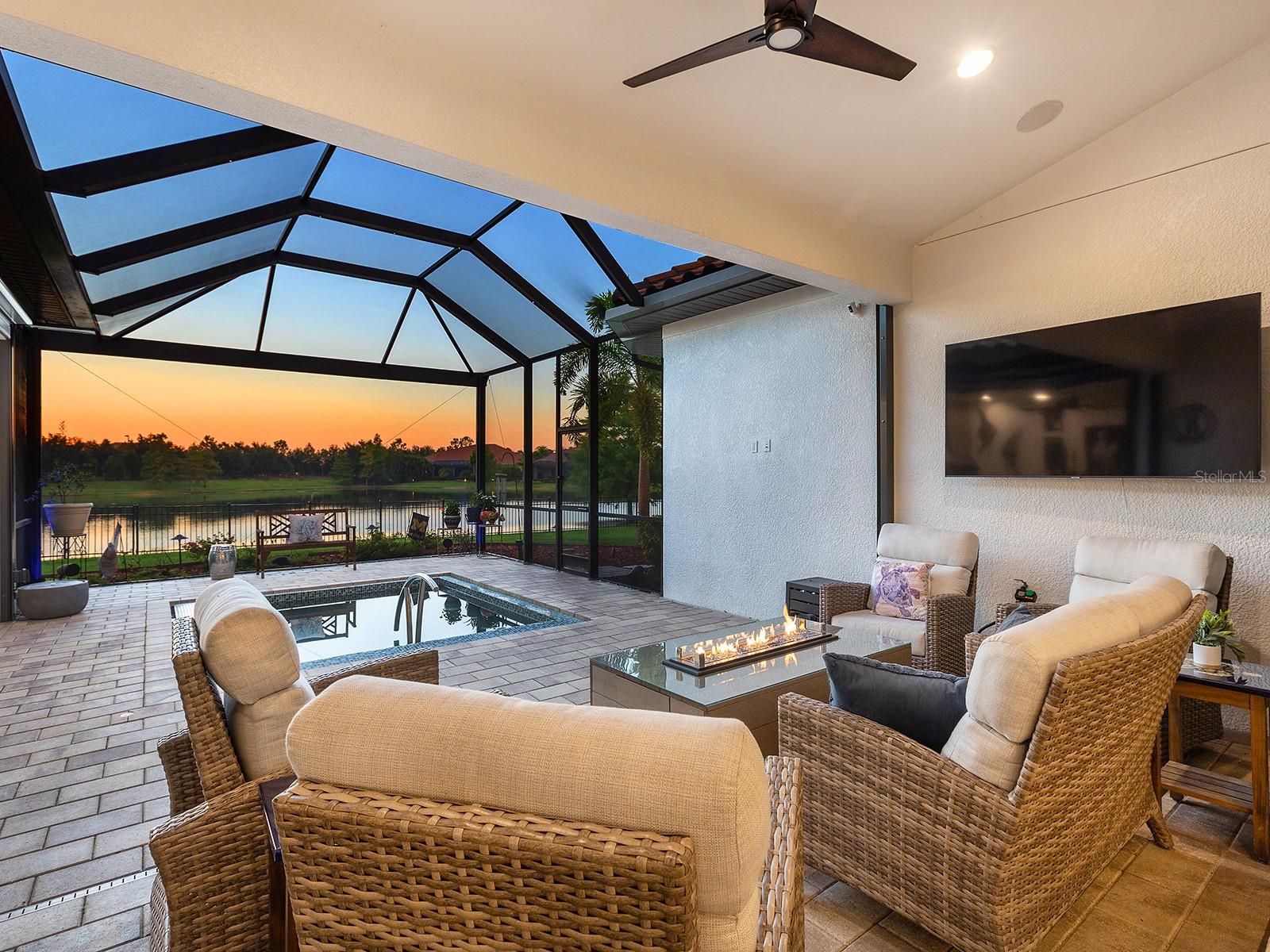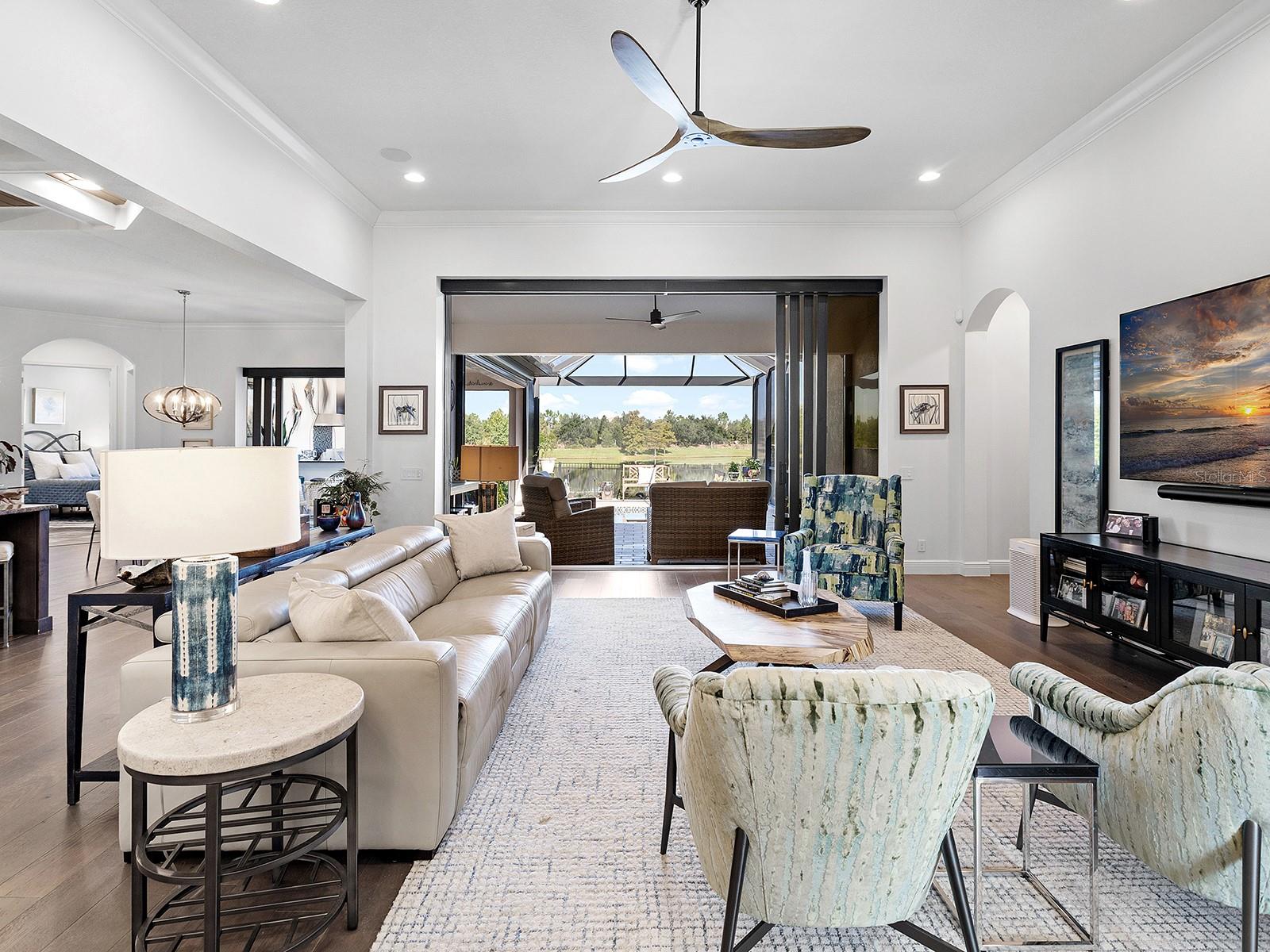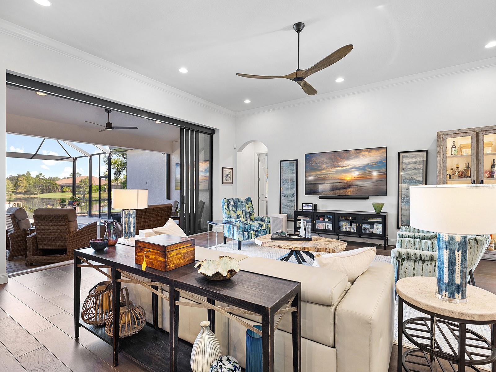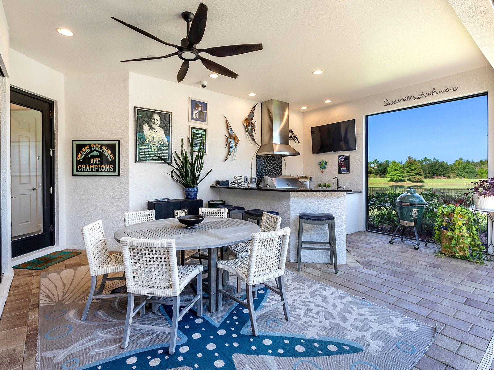 Sunset views and one of the largest homesites in Seacroft set the stage for this custom John Cannon home in Country Club East. With 4 bedrooms, 3.5 baths, a private office, and expansive indoor-outdoor living, the residence showcases lake vistas, unforgettable sunsets, and a rare oversized fenced yard--now offered at a value that reflects both the quality and extensive upgrades.The great room blends 12' ceilings, wood floors, designer lighting and fans, 10' impact sliders with remote-controlled shades, and seamless access to the lanai. A chef's dream, the kitchen offers a 48" Sub-Zero refrigerator, new Bosch dishwasher, oversized island, custom pantry shelving, wood cabinetry, and beam-and-beadboard ceiling detail opening to the dining area. The owner's suite features wood floors (2023), tranquil lake views, dual custom walk-in closets, granite vanities, an oversized shower with rainhead and dual faucets, and a soaking tub. Three additional bedrooms--one en-suite--plus an updated powder room (2024) complete the thoughtful plan.Outdoor living is exceptional with an oversized spa, outdoor kitchen with Lynx grill, refrigerator, and granite bar, new no-see-um screens (2023), hurricane-rated drop-down screens (2024), cage and landscape lighting, and a retractable front-door screen for cross-breezes. The oversized lot with new fencing (2023) creates privacy and a sense of space rarely found in the community.Recent updates elevate peace of mind: freshly painted interior/exterior (2023), impact windows and doors, whole-house generator (2023), 3-zone HVAC with allergen-friendly blue light, plantation shutters and wood blinds (2024), new washer/dryer (2025), and luxury vinyl plank in bedrooms 2-4 (2023). All mounted TVs convey, including two on the lanai plus those in the great room, owner's suite, and bedrooms. The garage is climate-controlled with a mini-split A/C (2023), Icynene insulation, custom flooring, built-in cabinetry, and overhead storage.Country Club East residents enjoy three resort-style pools, fitness, and optional membership at Lakewood Ranch Golf & Country Club. Just outside the gates: Waterside Place, Main Street, dining, shopping, medical facilities, and Gulf beaches all within minutes.