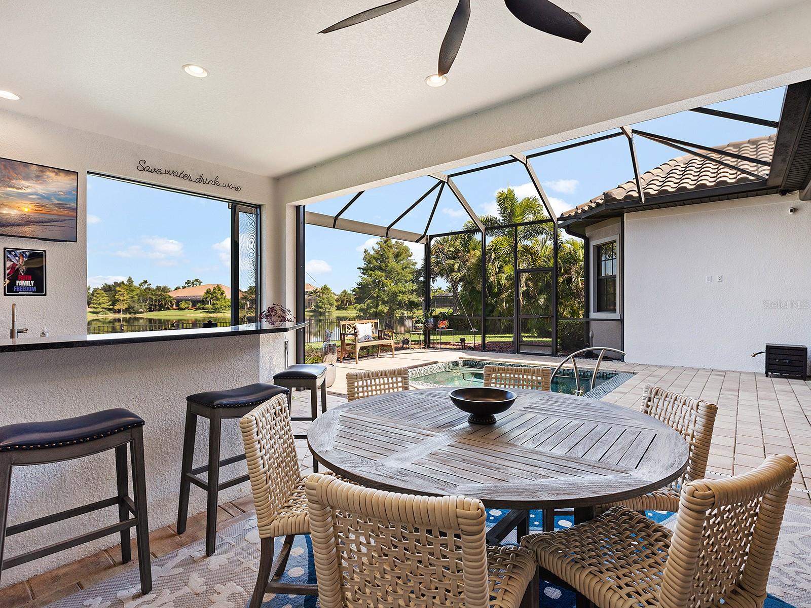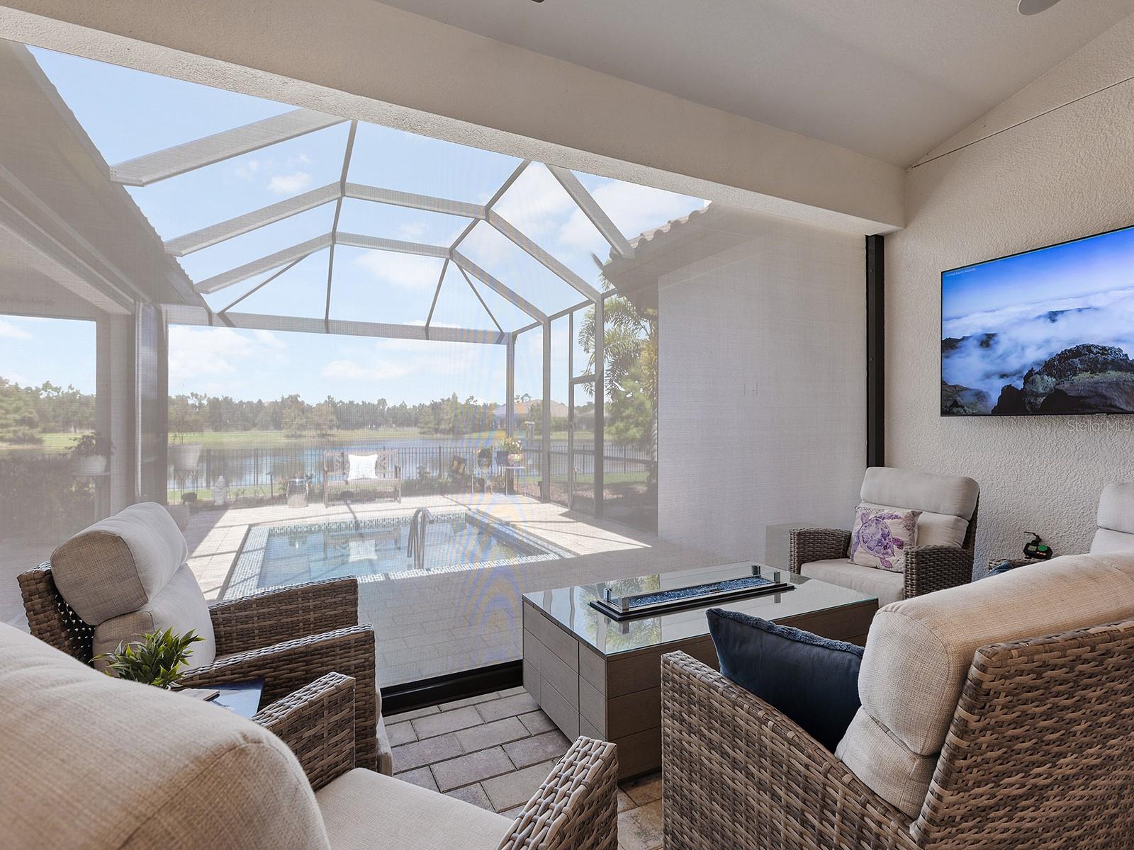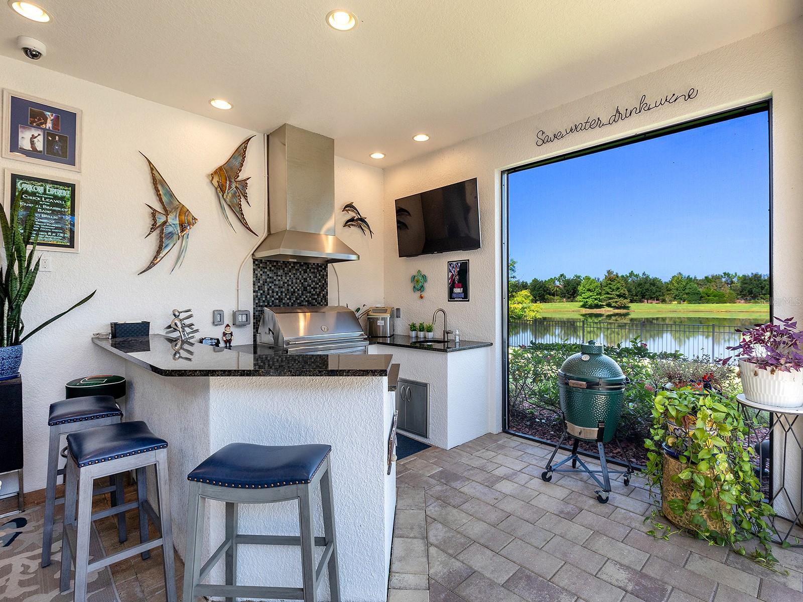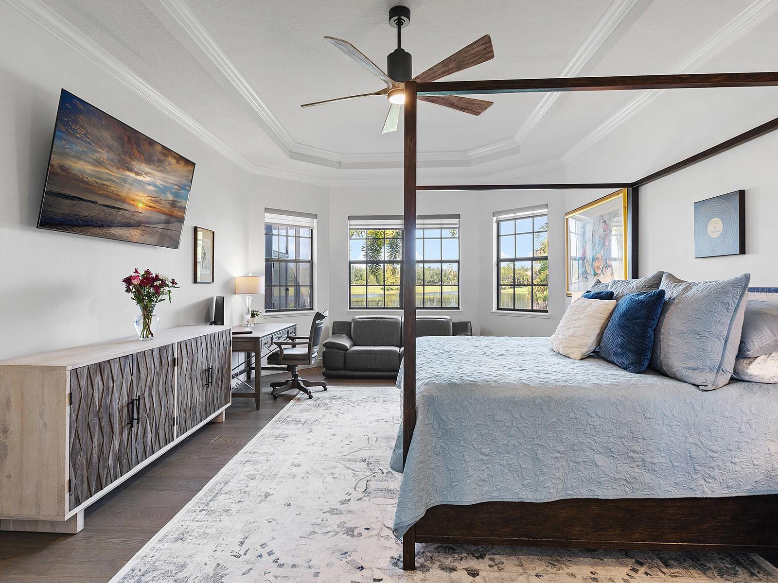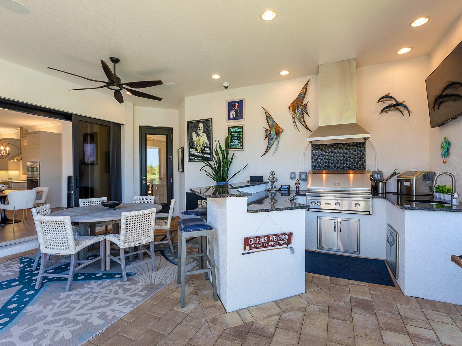 Sunset views and one of the largest homesites in Seacroft set the stage for this custom John Cannon home in Country Club East. With 4 bedrooms, 3.5 baths, a private office, and expansive indoor-outdoor living, the residence showcases lake vistas, unforgettable sunsets, and a rare oversized fenced yard--now offered at a value that reflects both the quality and extensive upgrades.The great room blends 12' ceilings, wood floors, designer lighting and fans, 10' impact sliders with remote-controlled shades, and seamless access to the lanai. A chef's dream, the kitchen offers a 48" Sub-Zero refrigerator, new Bosch dishwasher, oversized island, custom pantry shelving, wood cabinetry, and beam-and-beadboard ceiling detail opening to the dining area. The owner's suite features wood floors (2023), tranquil lake views, dual custom walk-in closets, granite vanities, an oversized shower with rainhead and dual faucets, and a soaking tub. Three additional bedrooms--one en-suite--plus an updated powder room (2024) complete the thoughtful plan.Outdoor living is exceptional with an oversized spa, outdoor kitchen with Lynx grill, refrigerator, and granite bar, new no-see-um screens (2023), hurricane-rated drop-down screens (2024), cage and landscape lighting, and a retractable front-door screen for cross-breezes. The oversized lot with new fencing (2023) creates privacy and a sense of space rarely found in the community.Recent updates elevate peace of mind: freshly painted interior/exterior (2023), impact windows and doors, whole-house generator (2023), 3-zone HVAC with allergen-friendly blue light, plantation shutters and wood blinds (2024), new washer/dryer (2025), and luxury vinyl plank in bedrooms 2-4 (2023). All mounted TVs convey, including two on the lanai plus those in the great room, owner's suite, and bedrooms. The garage is climate-controlled with a mini-split A/C (2023), Icynene insulation, custom flooring, built-in cabinetry, and overhead storage.Country Club East residents enjoy three resort-style pools, fitness, and optional membership at Lakewood Ranch Golf & Country Club. Just outside the gates: Waterside Place, Main Street, dining, shopping, medical facilities, and Gulf beaches all within minutes.