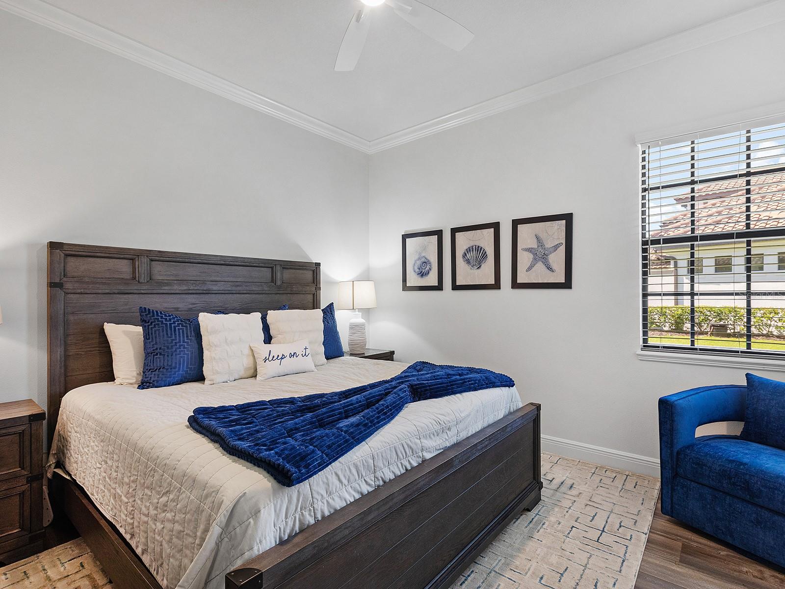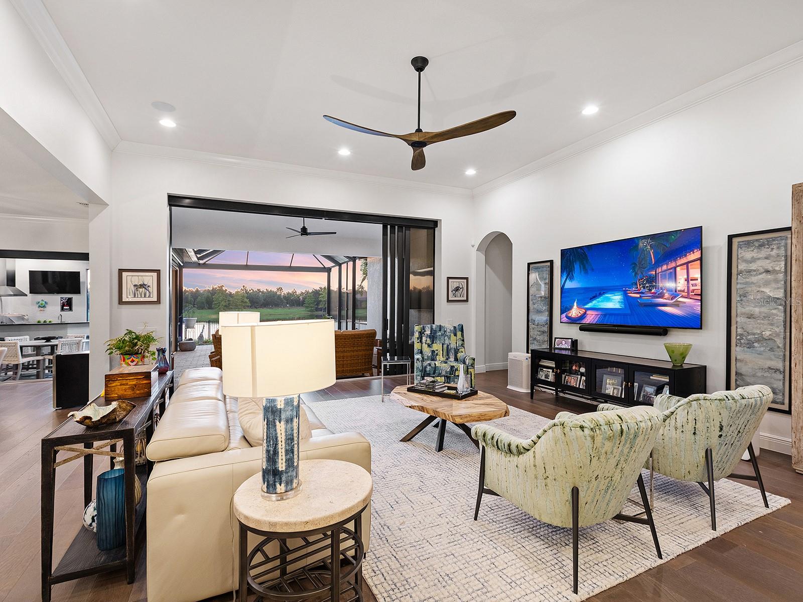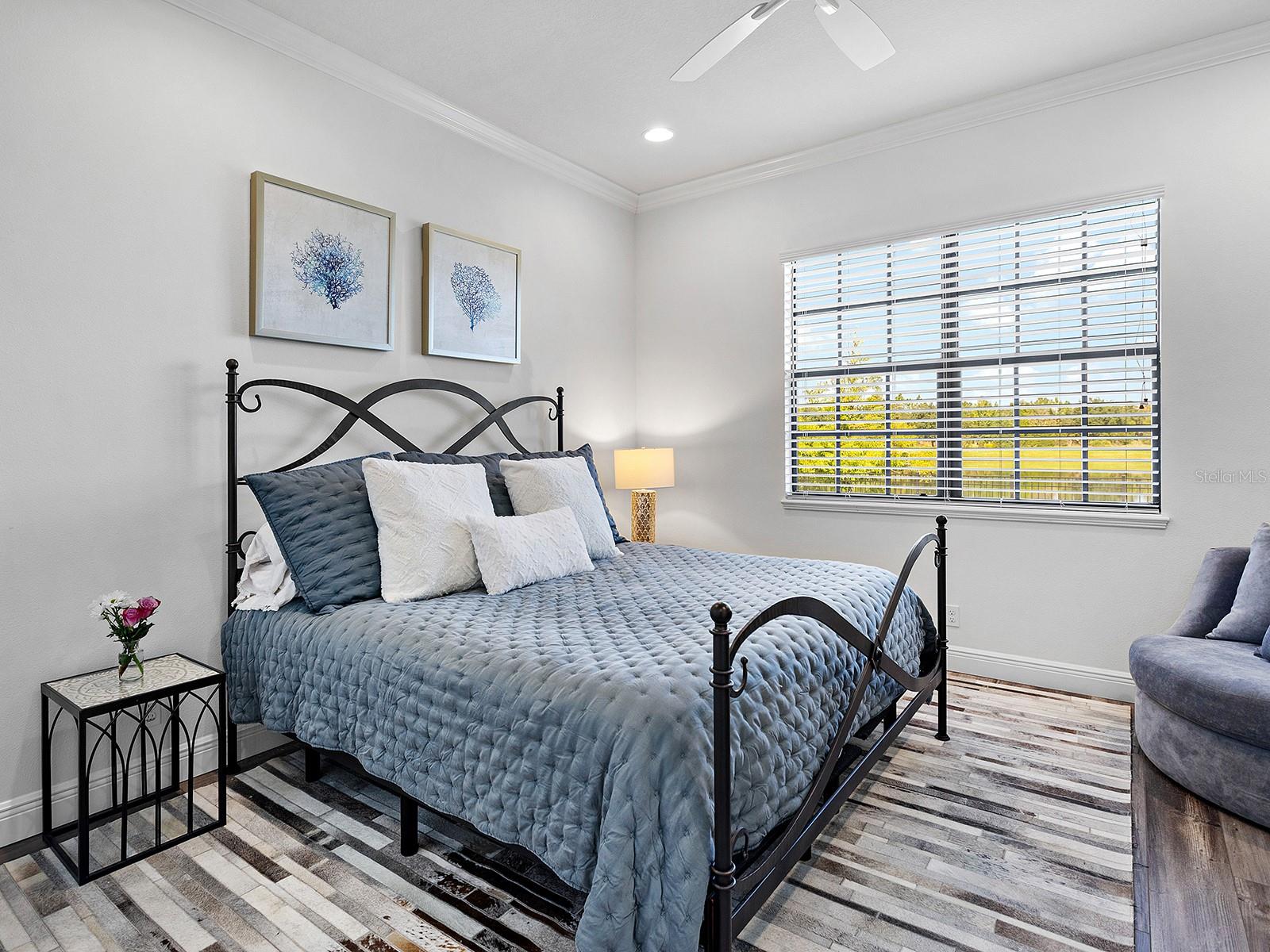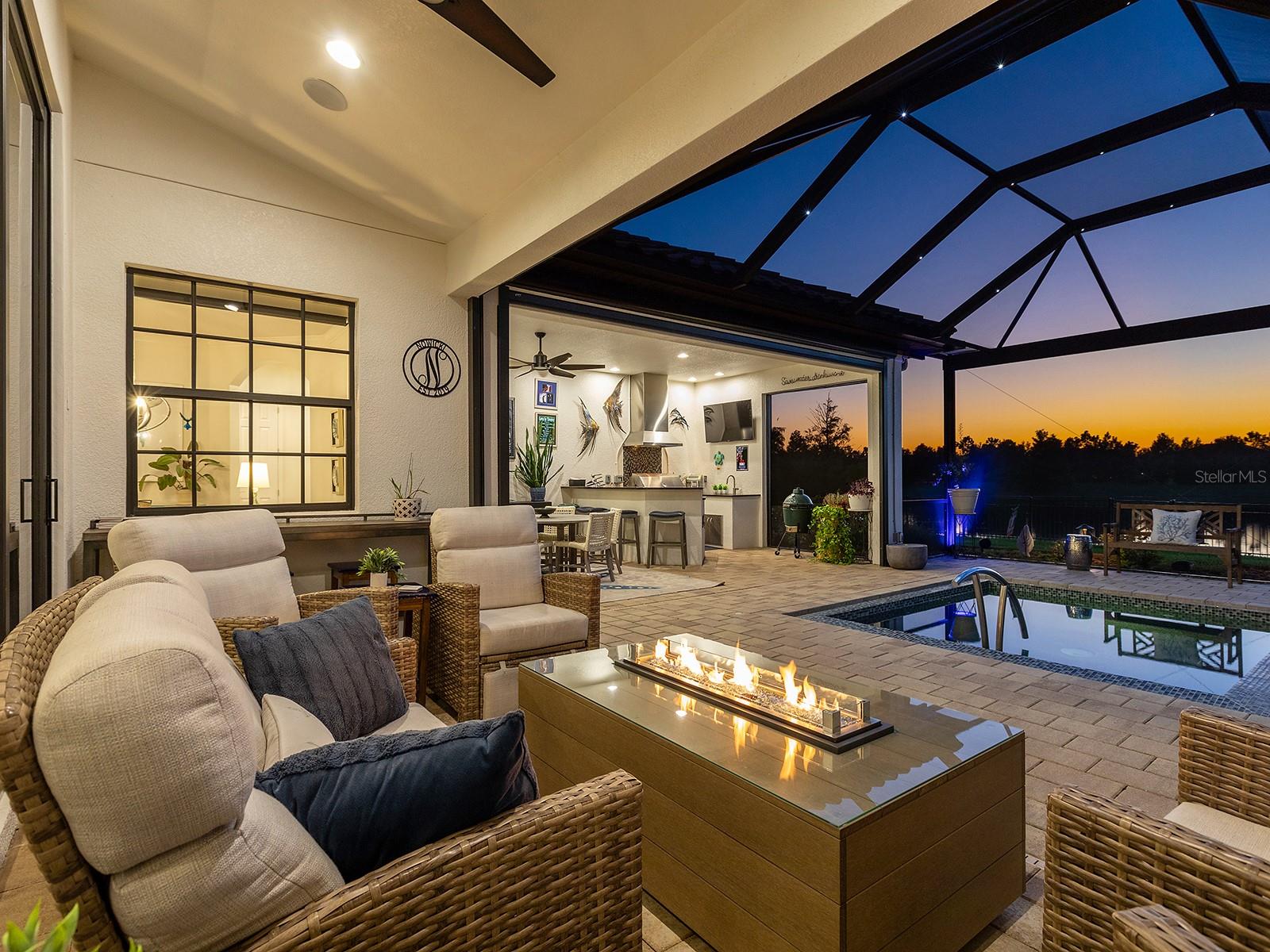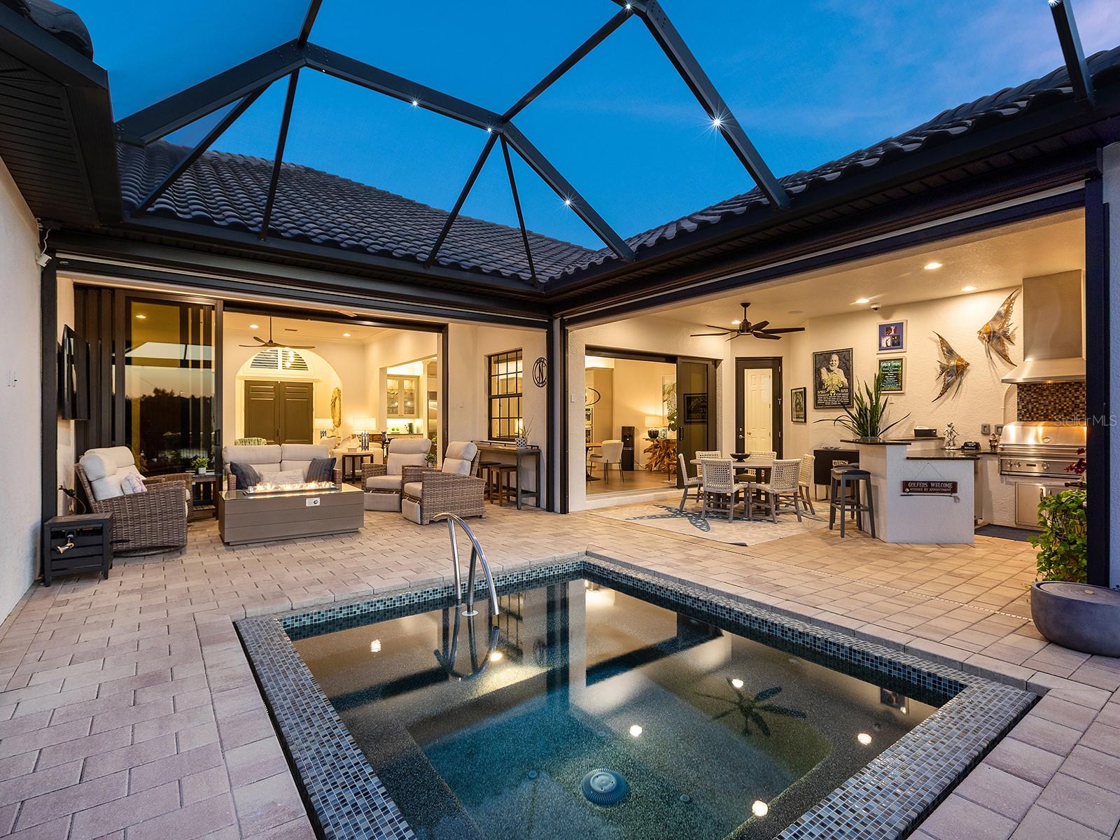 Sunset views and one of the largest homesites in Seacroft set the stage for this custom John Cannon home in Country Club East. With 4 bedrooms, 3.5 baths, a private office, and expansive indoor-outdoor living, the residence showcases lake vistas, unforgettable sunsets, and a rare oversized fenced yard--now offered at a value that reflects both the quality and extensive upgrades.The great room blends 12' ceilings, wood floors, designer lighting and fans, 10' impact sliders with remote-controlled shades, and seamless access to the lanai. A chef's dream, the kitchen offers a 48" Sub-Zero refrigerator, new Bosch dishwasher, oversized island, custom pantry shelving, wood cabinetry, and beam-and-beadboard ceiling detail opening to the dining area. The owner's suite features wood floors (2023), tranquil lake views, dual custom walk-in closets, granite vanities, an oversized shower with rainhead and dual faucets, and a soaking tub. Three additional bedrooms--one en-suite--plus an updated powder room (2024) complete the thoughtful plan.Outdoor living is exceptional with an oversized spa, outdoor kitchen with Lynx grill, refrigerator, and granite bar, new no-see-um screens (2023), hurricane-rated drop-down screens (2024), cage and landscape lighting, and a retractable front-door screen for cross-breezes. The oversized lot with new fencing (2023) creates privacy and a sense of space rarely found in the community.Recent updates elevate peace of mind: freshly painted interior/exterior (2023), impact windows and doors, whole-house generator (2023), 3-zone HVAC with allergen-friendly blue light, plantation shutters and wood blinds (2024), new washer/dryer (2025), and luxury vinyl plank in bedrooms 2-4 (2023). All mounted TVs convey, including two on the lanai plus those in the great room, owner's suite, and bedrooms. The garage is climate-controlled with a mini-split A/C (2023), Icynene insulation, custom flooring, built-in cabinetry, and overhead storage.Country Club East residents enjoy three resort-style pools, fitness, and optional membership at Lakewood Ranch Golf & Country Club. Just outside the gates: Waterside Place, Main Street, dining, shopping, medical facilities, and Gulf beaches all within minutes.
