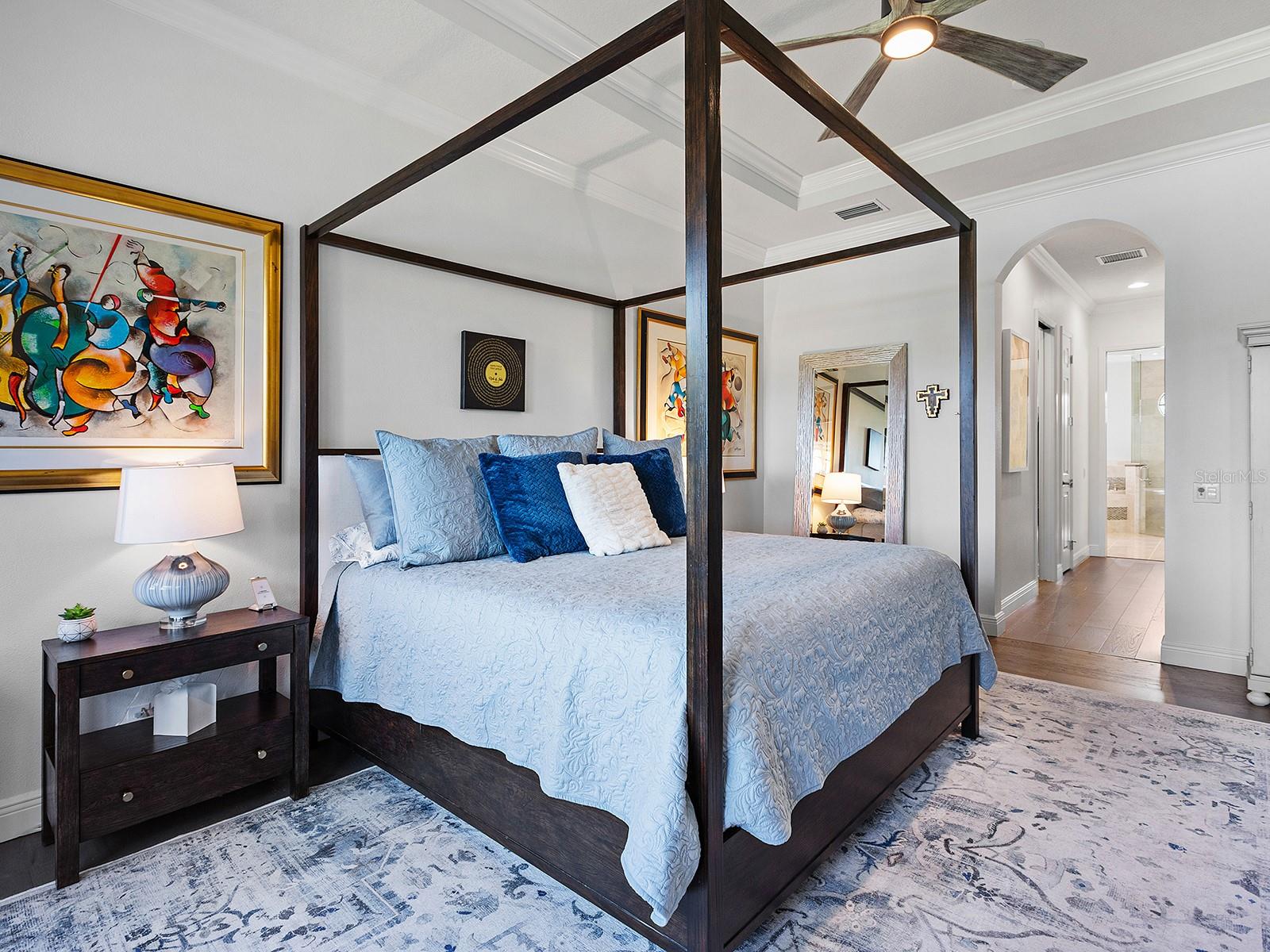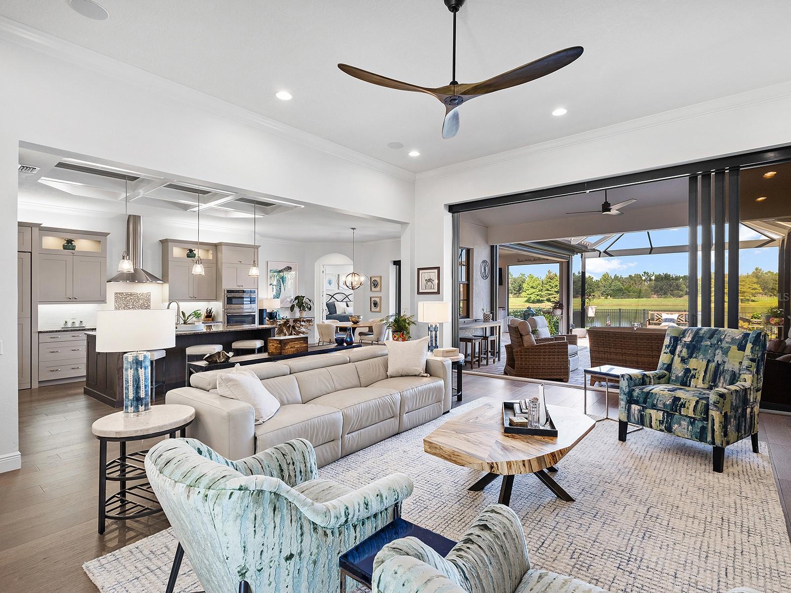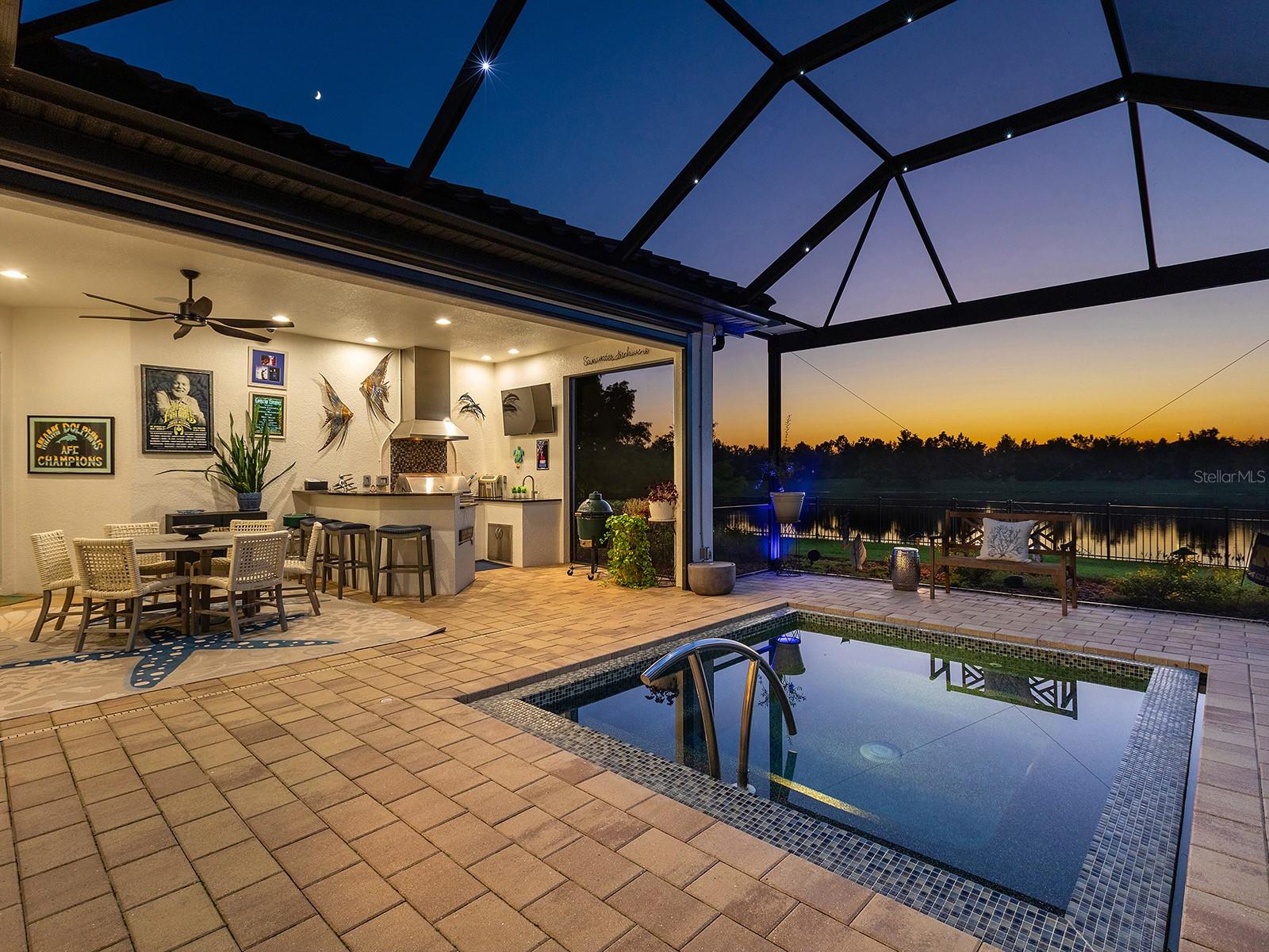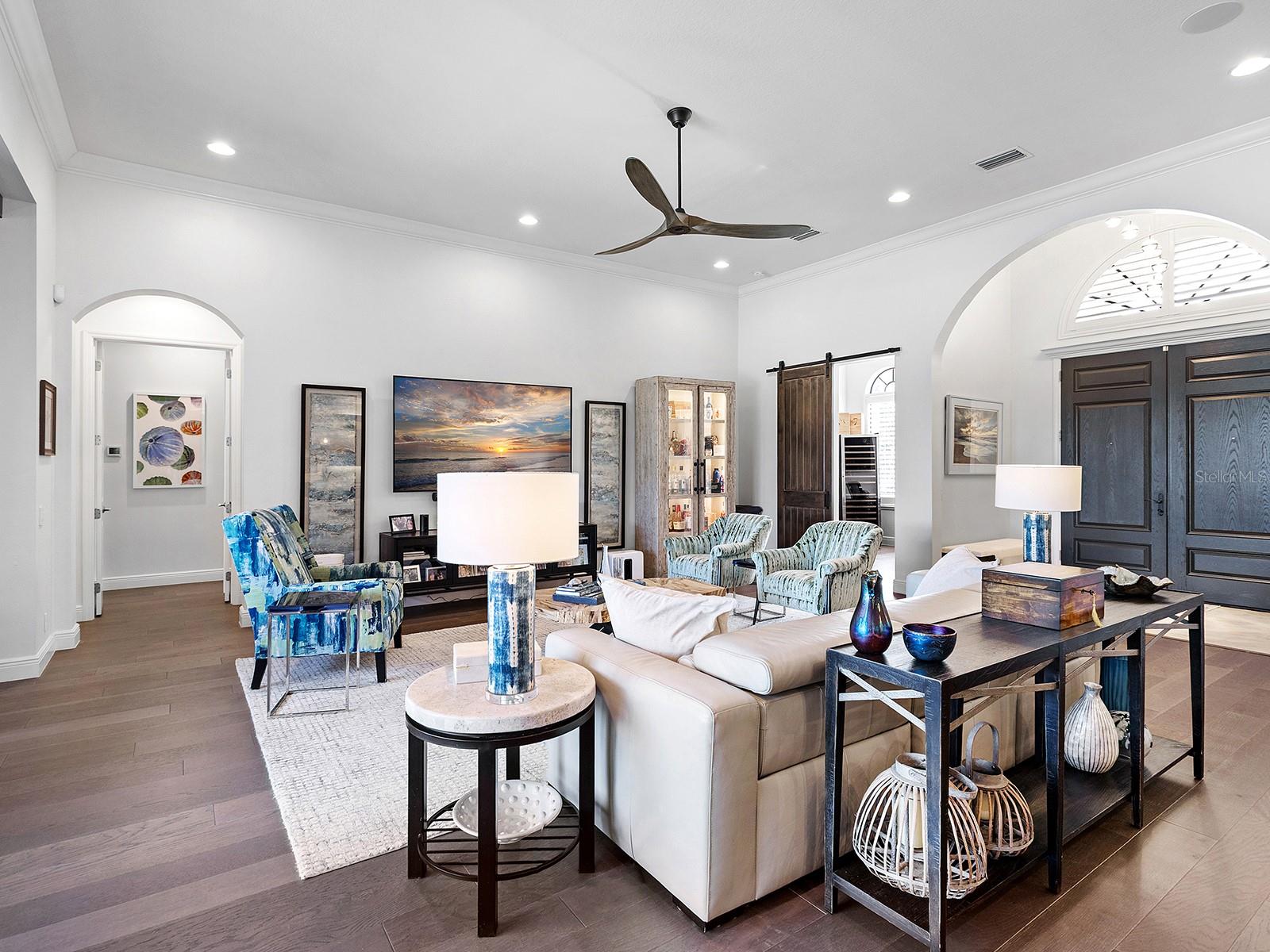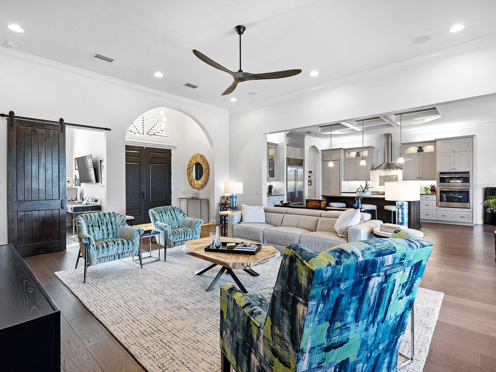 Sunset views and one of the largest homesites in Seacroft set the stage for this custom John Cannon home in Country Club East. With 4 bedrooms, 3.5 baths, a private office, and expansive indoor-outdoor living, the residence showcases lake vistas, unforgettable sunsets, and a rare oversized fenced yard--now offered at a value that reflects both the quality and extensive upgrades.The great room blends 12' ceilings, wood floors, designer lighting and fans, 10' impact sliders with remote-controlled shades, and seamless access to the lanai. A chef's dream, the kitchen offers a 48" Sub-Zero refrigerator, new Bosch dishwasher, oversized island, custom pantry shelving, wood cabinetry, and beam-and-beadboard ceiling detail opening to the dining area. The owner's suite features wood floors (2023), tranquil lake views, dual custom walk-in closets, granite vanities, an oversized shower with rainhead and dual faucets, and a soaking tub. Three additional bedrooms--one en-suite--plus an updated powder room (2024) complete the thoughtful plan.Outdoor living is exceptional with an oversized spa, outdoor kitchen with Lynx grill, refrigerator, and granite bar, new no-see-um screens (2023), hurricane-rated drop-down screens (2024), cage and landscape lighting, and a retractable front-door screen for cross-breezes. The oversized lot with new fencing (2023) creates privacy and a sense of space rarely found in the community.Recent updates elevate peace of mind: freshly painted interior/exterior (2023), impact windows and doors, whole-house generator (2023), 3-zone HVAC with allergen-friendly blue light, plantation shutters and wood blinds (2024), new washer/dryer (2025), and luxury vinyl plank in bedrooms 2-4 (2023). All mounted TVs convey, including two on the lanai plus those in the great room, owner's suite, and bedrooms. The garage is climate-controlled with a mini-split A/C (2023), Icynene insulation, custom flooring, built-in cabinetry, and overhead storage.Country Club East residents enjoy three resort-style pools, fitness, and optional membership at Lakewood Ranch Golf & Country Club. Just outside the gates: Waterside Place, Main Street, dining, shopping, medical facilities, and Gulf beaches all within minutes.
