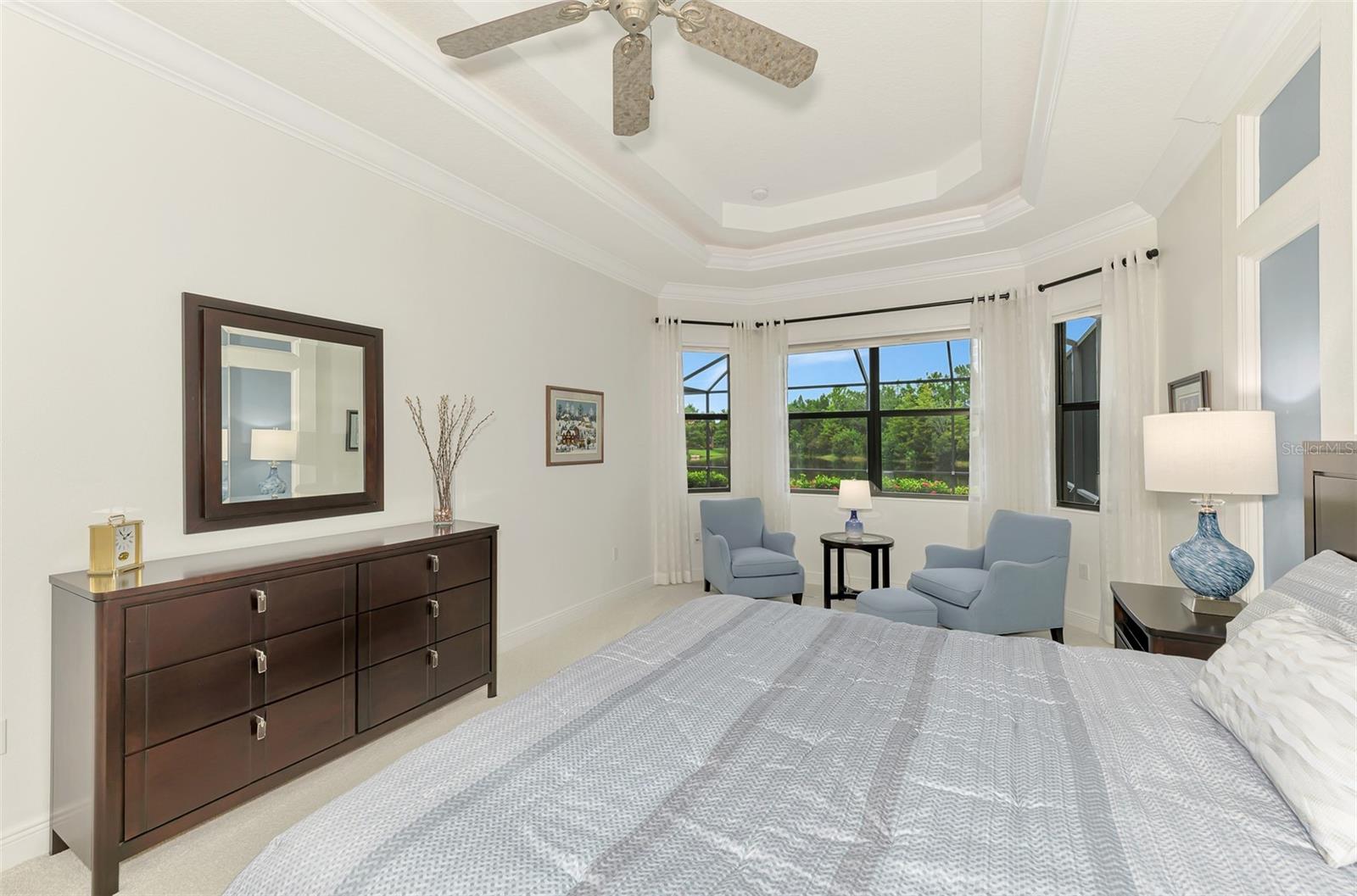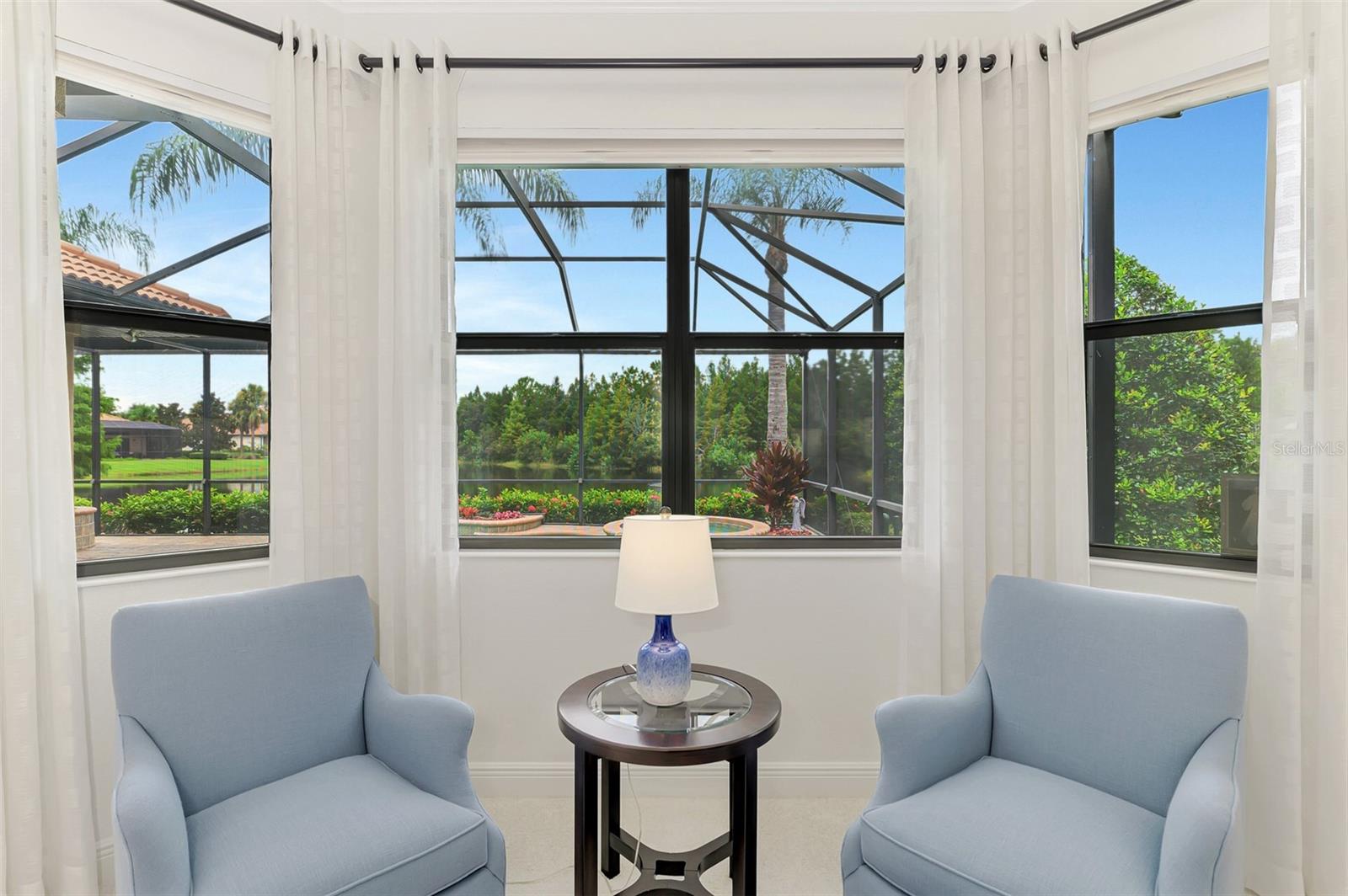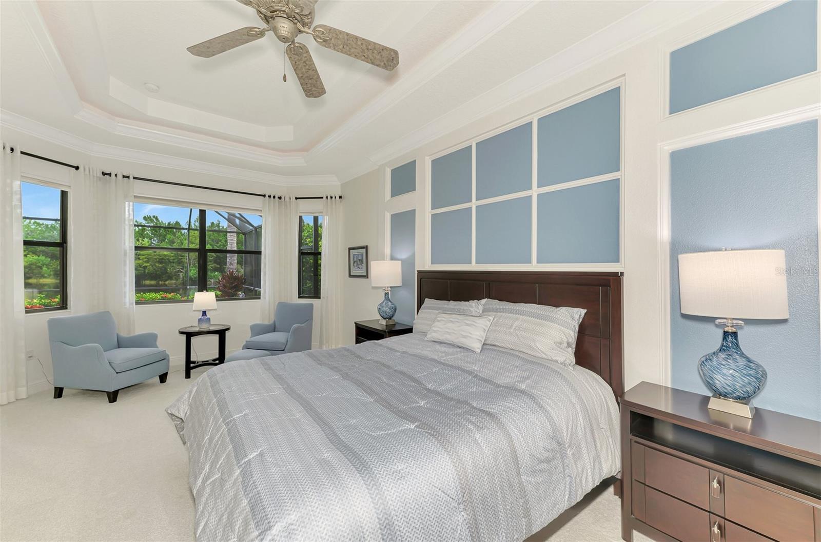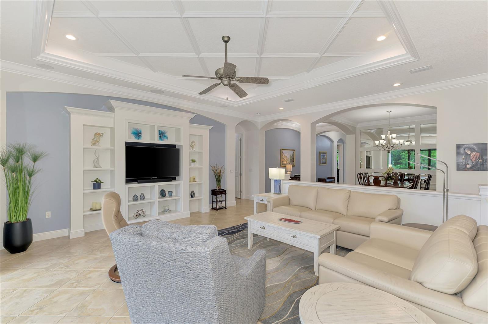 Welcome to luxury living in the exclusive gated community of Country Club East! This impeccably maintained 2,934 sq ft custom Lee Wetherington home is nestled on a serene and private homesite with breathtaking water views, offering 3 bedrooms, an office, a separate workout room/flex space and 2.5 baths. Perfectly blending refined indoor living with a true resort-style outdoor experience, this home is ideal for entertaining or relaxing in total privacy. Designed with quality and comfort in mind, the home features HIGH IMPACT DOORS & WINDOWS, a whole-house generator, tankless hot water heater (2023), and a Trane AC system (2023), whole house water refining system and Reverse Osmosis. DeHart Security Camera System monitors the entire perimeter, complete with a command center and video monitor to be used with Zuum app that is discreetly located in the hall closet. The heart of the home is the gourmet chef's kitchen, boasting custom cabinetry and top-tier appliances: Wolf oven and microwave, Thermador gas cooktop, Bosch dishwasher, and Uline dual-zone wine chiller. Solid wood shelving in the pantry & wood shelving in all closets elevates organization with a clean, luxurious aesthetic.The spacious primary suite is filled with natural light and offers serene views, custom closet systems & Duette double view blinds with custom coordinating window treatments. The secondary bedrooms features a Jack & Jill bathroom with double sinks. The large den is perfect as a home office or additional flex space for all of today's lifestyle needs. The grand great room showcases a stunning coffered ceiling with accent lighting. All lighting in the home has been upgraded to LED. Natural light floods in from the double set of triple sliding doors leading to the lanai. Step outside to your own private retreat featuring a sparkling saltwater pool and spa, raised irrigated planters, natural gas fire pit and color changing pool lighting. The lanai is an entertainer's dream, complete with a fully equipped outdoor kitchen featuring a Lynx grill and Proline hood and convenient dedicated pool bath.The 3rd-car garage space has been thoughtfully converted into a home gym with its own EcoBee/Thermostat Energy Saver system. The bonus space can be converted back into garage space. The garage has a separate ductless mini-split system (2023) to keep you and your garage items cool, NewAge garage cabinet system, ceiling-mounted storage, and a chainless LiftMaster door opener (2022) along with a dedicated breaker and switch for the garage refrigerator. The impressive laundry room has an abundance of additional cabinets, and a huge walk in closet along with an additional storage closet. Luxury finishes extend throughout the home with lit tray ceilings, detailed crown molding, surround sound in the great room, and thoughtfully curated designer touches.This home has been maintained with pristine care and is an opportunity to own a turnkey, high-end home in the heart of Lakewood Ranch.Country Club East offers the perfect blend of luxury and lifestyle, with resort-style community pools including The Retreat--featuring a spa, fitness center, outdoor kitchen, and scenic nature trails all in a beautiful and pristine community. This private, gated community provides an unparalleled experience with nearby top-rated schools, world-class dining, shopping, medical facilities, and easy access to I-75. Close to the #1 beaches in the country, Sarasota, St. Pete and Tampa!