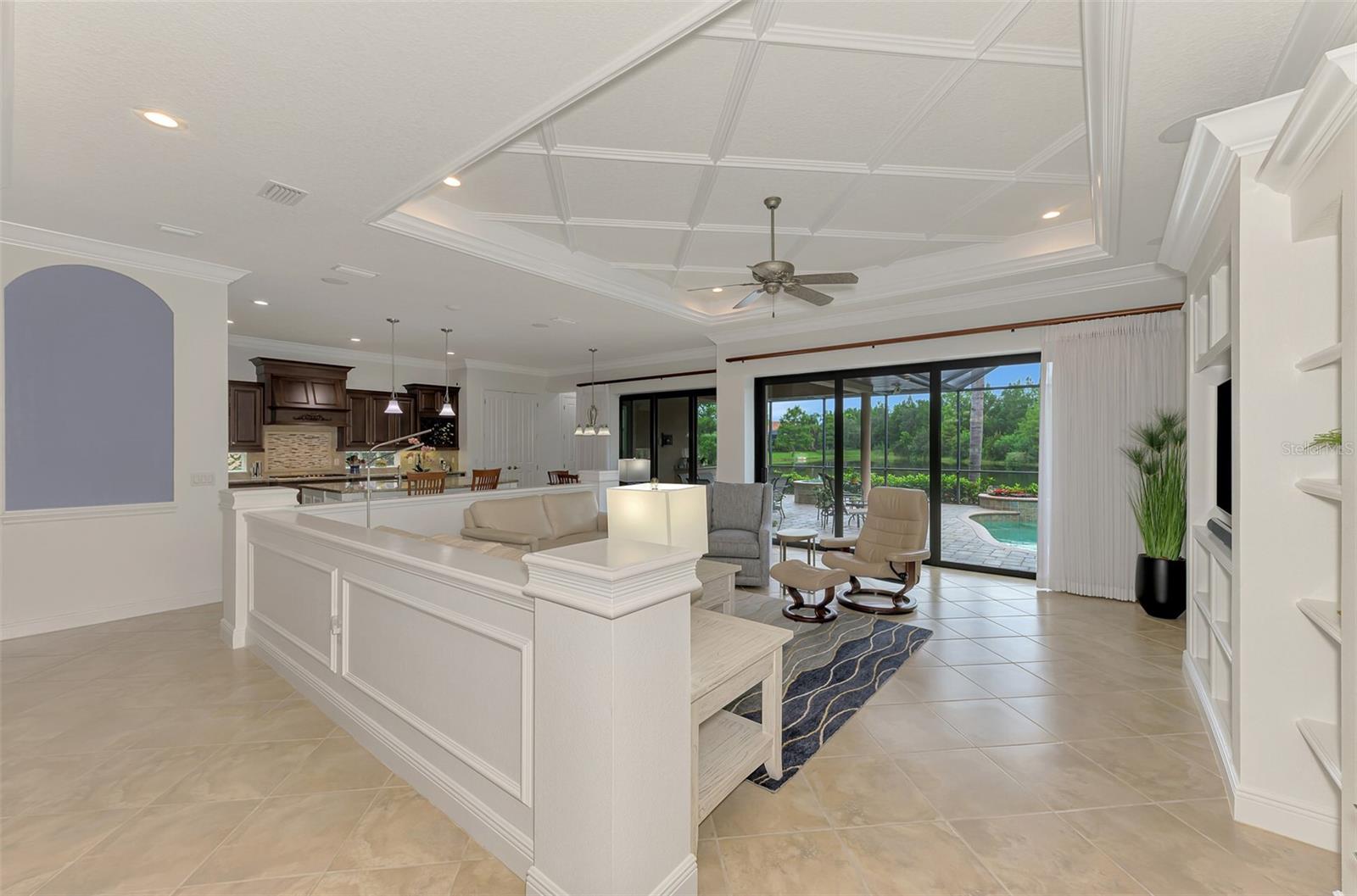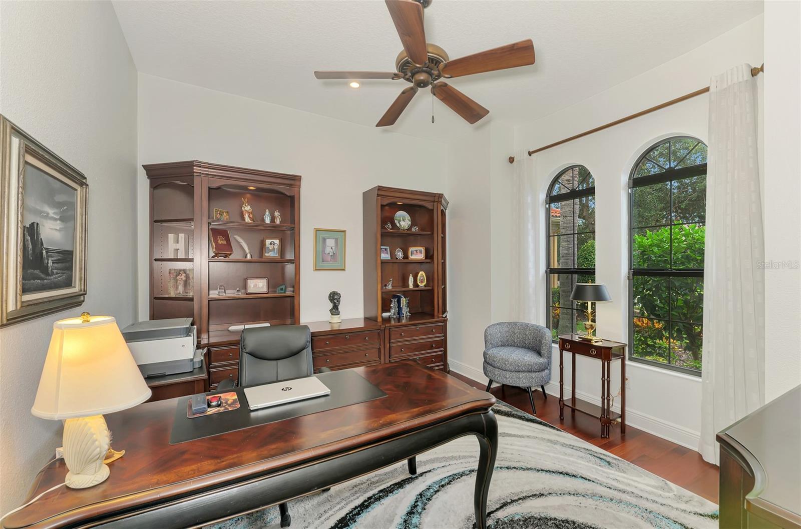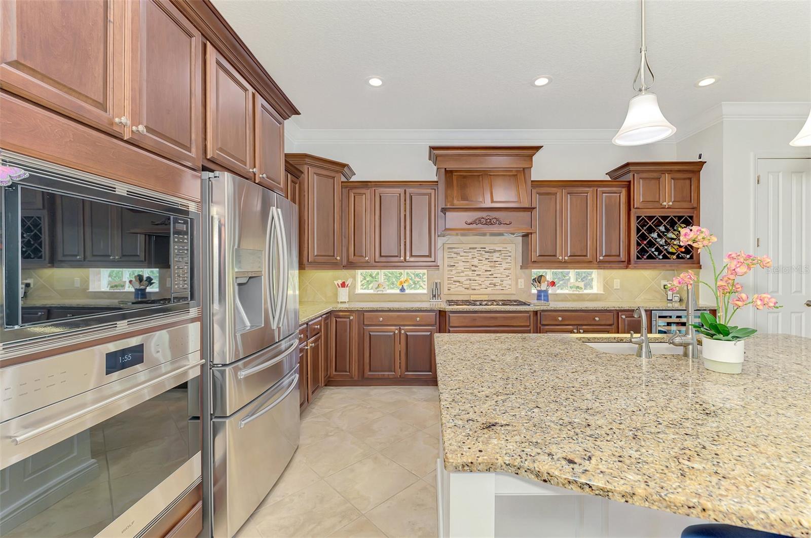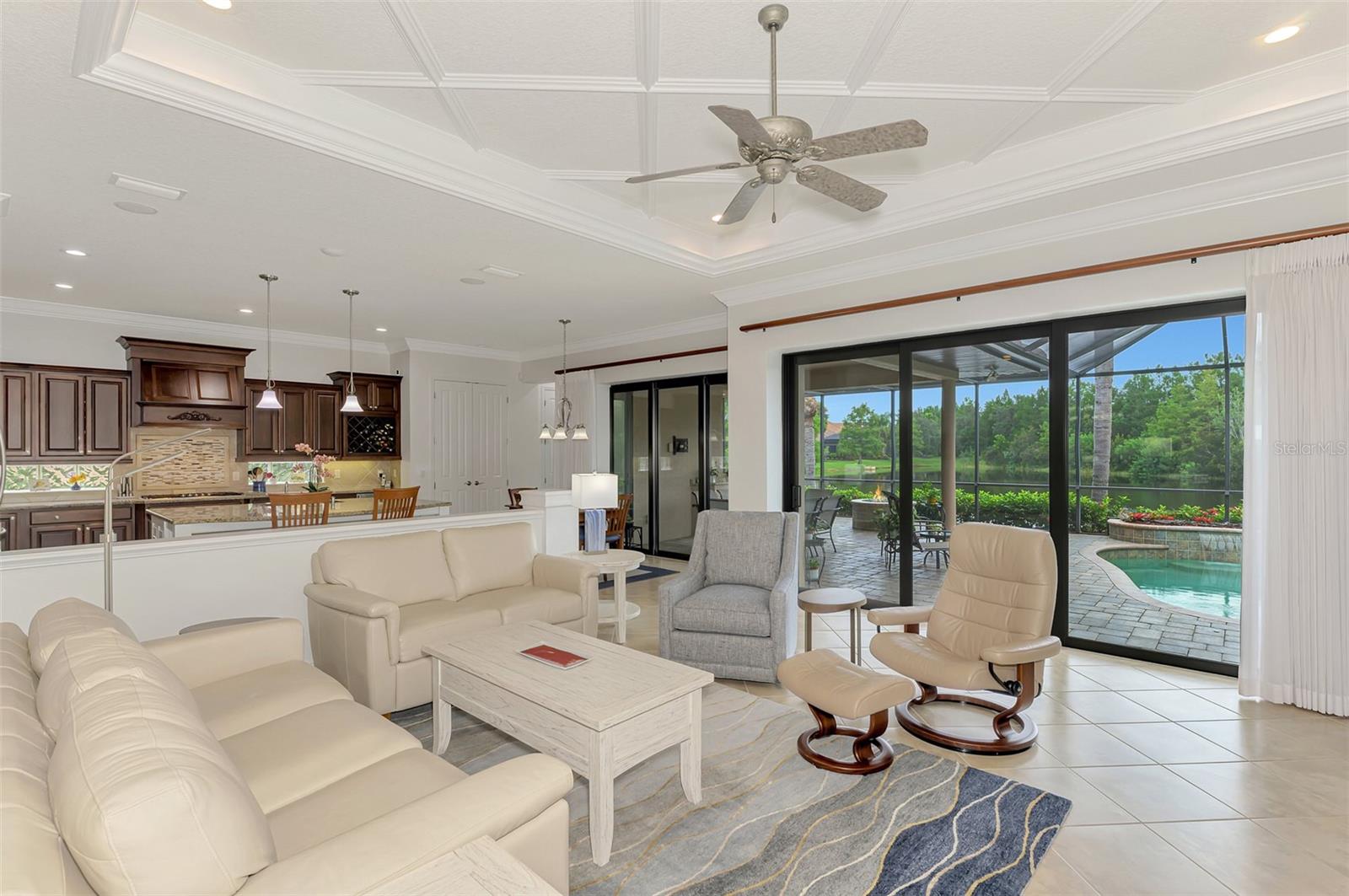 Welcome to luxury living in the exclusive gated community of Country Club East! This impeccably maintained 2,934 sq ft custom Lee Wetherington home is nestled on a serene and private homesite with breathtaking water views, offering 3 bedrooms, an office, a separate workout room/flex space and 2.5 baths. Perfectly blending refined indoor living with a true resort-style outdoor experience, this home is ideal for entertaining or relaxing in total privacy. Designed with quality and comfort in mind, the home features HIGH IMPACT DOORS & WINDOWS, a whole-house generator, tankless hot water heater (2023), and a Trane AC system (2023), whole house water refining system and Reverse Osmosis. DeHart Security Camera System monitors the entire perimeter, complete with a command center and video monitor to be used with Zuum app that is discreetly located in the hall closet. The heart of the home is the gourmet chef's kitchen, boasting custom cabinetry and top-tier appliances: Wolf oven and microwave, Thermador gas cooktop, Bosch dishwasher, and Uline dual-zone wine chiller. Solid wood shelving in the pantry & wood shelving in all closets elevates organization with a clean, luxurious aesthetic.The spacious primary suite is filled with natural light and offers serene views, custom closet systems & Duette double view blinds with custom coordinating window treatments. The secondary bedrooms features a Jack & Jill bathroom with double sinks. The large den is perfect as a home office or additional flex space for all of today's lifestyle needs. The grand great room showcases a stunning coffered ceiling with accent lighting. All lighting in the home has been upgraded to LED. Natural light floods in from the double set of triple sliding doors leading to the lanai. Step outside to your own private retreat featuring a sparkling saltwater pool and spa, raised irrigated planters, natural gas fire pit and color changing pool lighting. The lanai is an entertainer's dream, complete with a fully equipped outdoor kitchen featuring a Lynx grill and Proline hood and convenient dedicated pool bath.The 3rd-car garage space has been thoughtfully converted into a home gym with its own EcoBee/Thermostat Energy Saver system. The bonus space can be converted back into garage space. The garage has a separate ductless mini-split system (2023) to keep you and your garage items cool, NewAge garage cabinet system, ceiling-mounted storage, and a chainless LiftMaster door opener (2022) along with a dedicated breaker and switch for the garage refrigerator. The impressive laundry room has an abundance of additional cabinets, and a huge walk in closet along with an additional storage closet. Luxury finishes extend throughout the home with lit tray ceilings, detailed crown molding, surround sound in the great room, and thoughtfully curated designer touches.This home has been maintained with pristine care and is an opportunity to own a turnkey, high-end home in the heart of Lakewood Ranch.Country Club East offers the perfect blend of luxury and lifestyle, with resort-style community pools including The Retreat--featuring a spa, fitness center, outdoor kitchen, and scenic nature trails all in a beautiful and pristine community. This private, gated community provides an unparalleled experience with nearby top-rated schools, world-class dining, shopping, medical facilities, and easy access to I-75. Close to the #1 beaches in the country, Sarasota, St. Pete and Tampa!