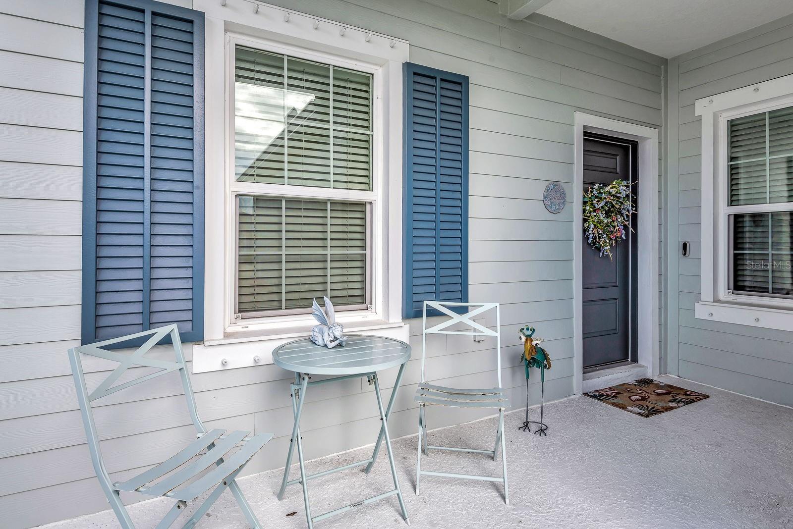 Exterior: Hurricane Shutters, Rain Gutters, Sidewalk, Sliding Doors