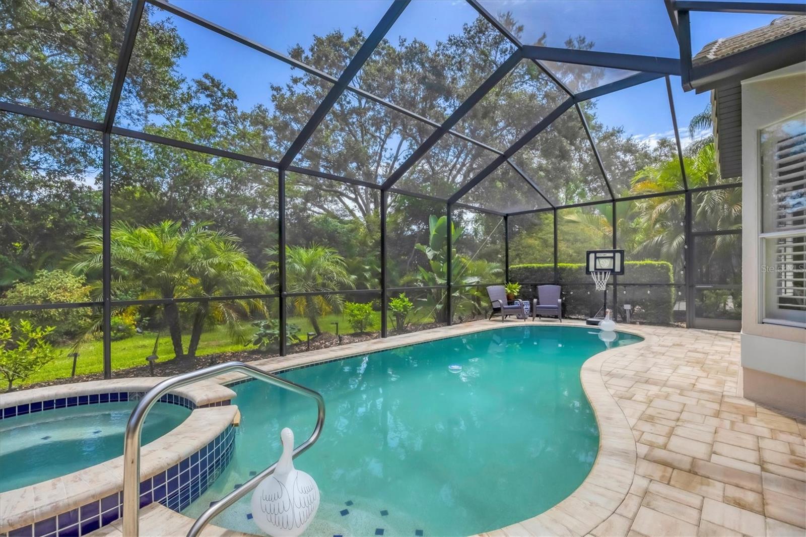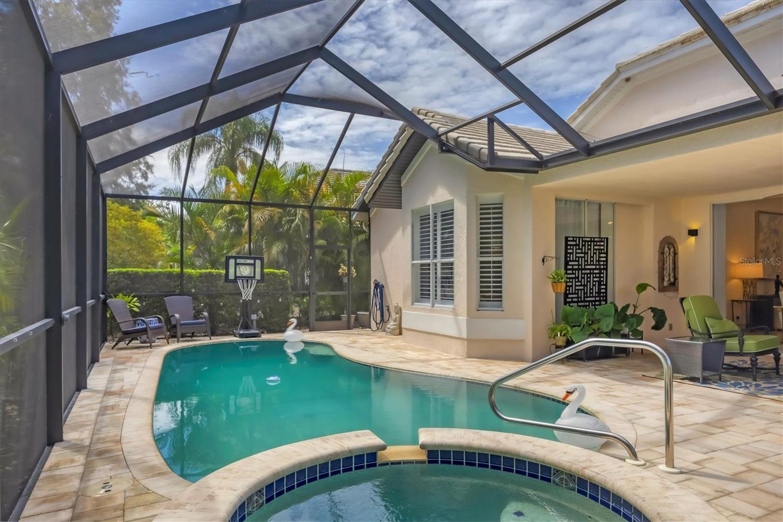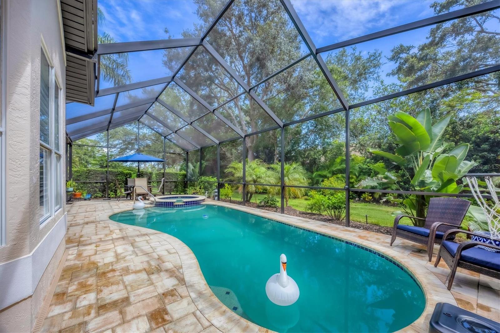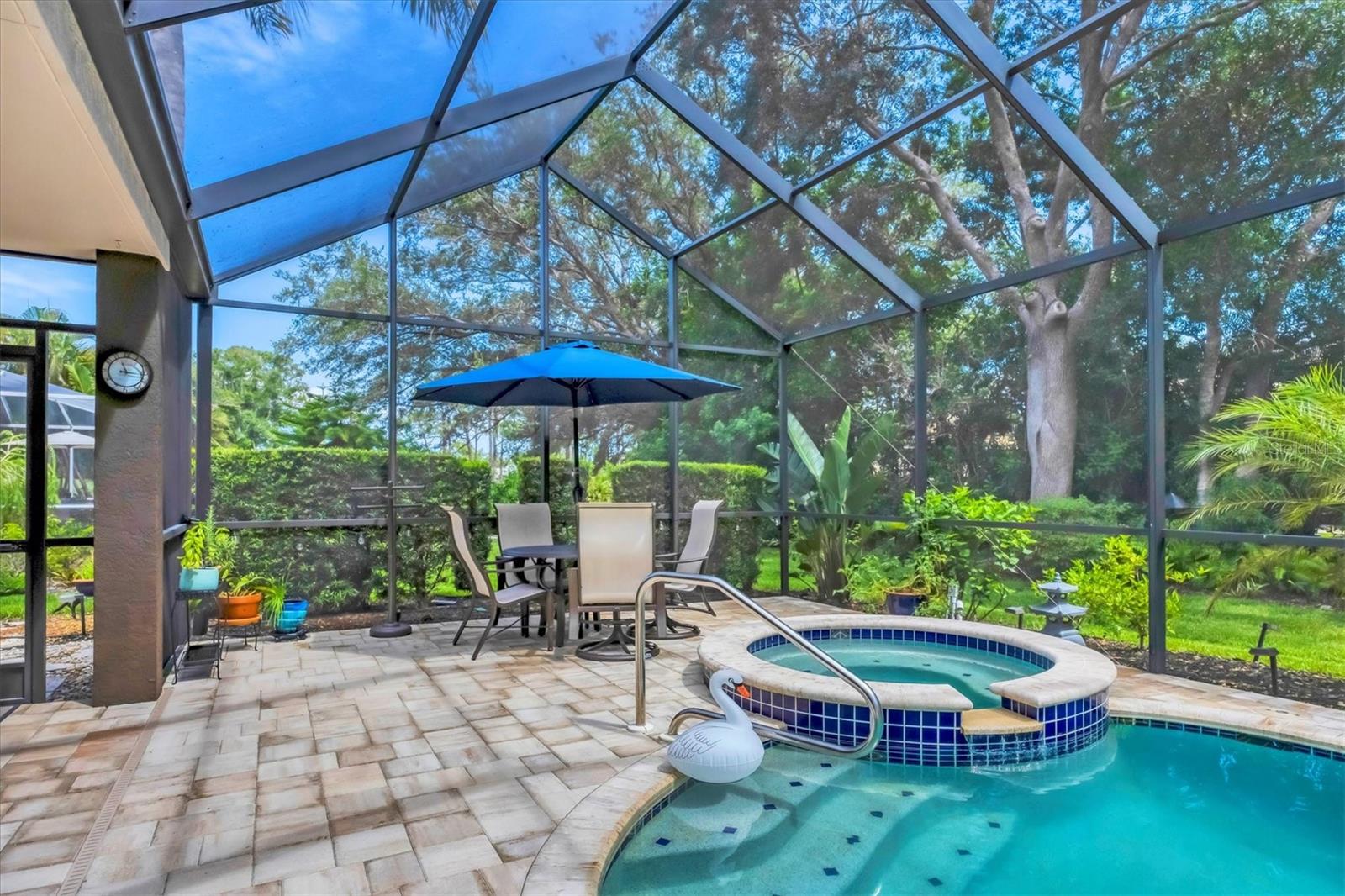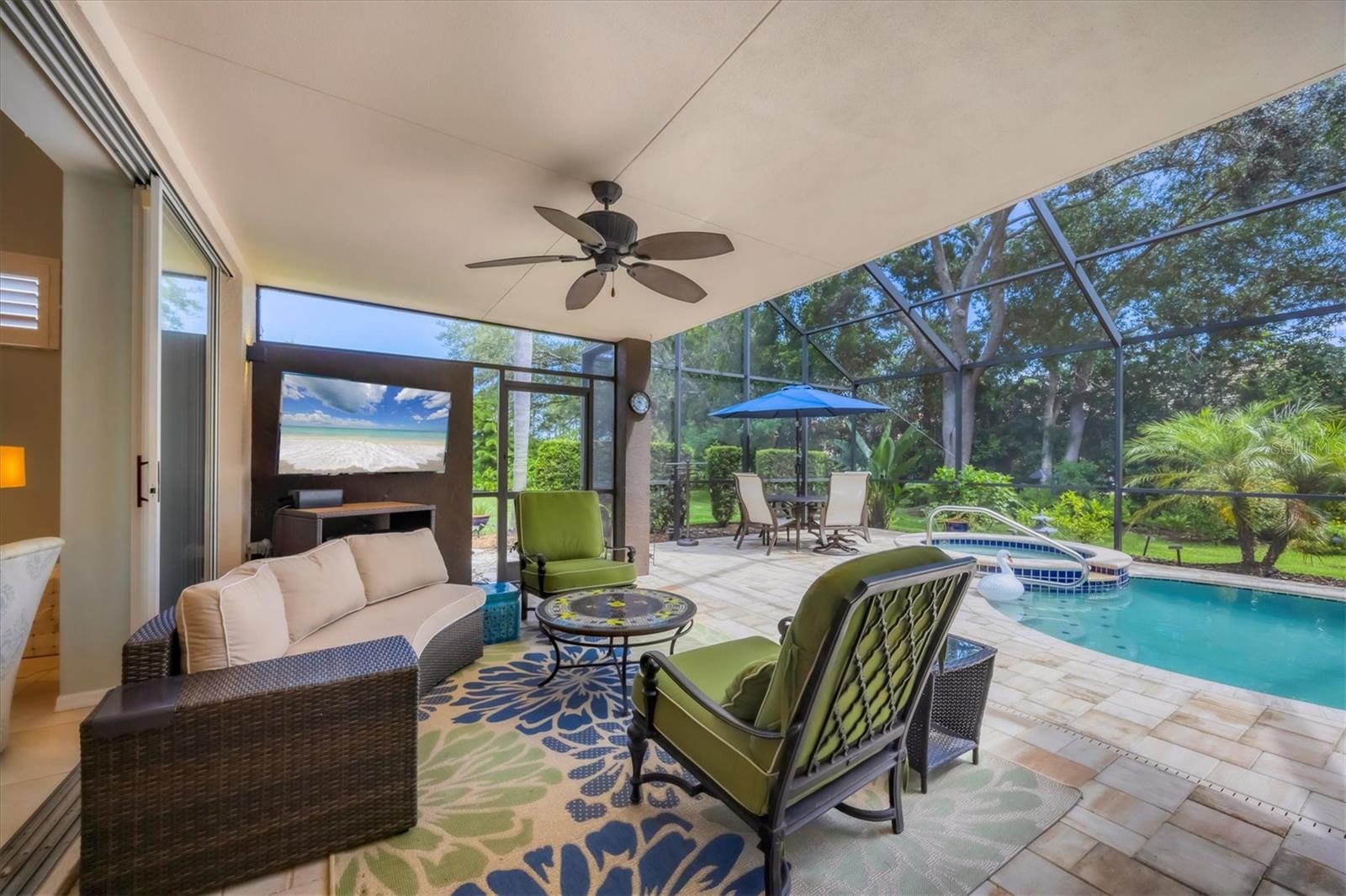 NEW AC (2021) Welcome to this exquisite residence, perfectly nestled on a quiet cul-de-sac in the prestigious University Park. Designed for the buyer seeking a private, resort-style retreat, this home offers a seamless blend of sophistication, comfort, and maintenance-free living. This beautifully maintained home features an open-concept floor plan with a desirable split-bedroom layout that ensures privacy and spacious living. The grand open great room flows effortlessly onto the expansive screened lanai, creating an ideal space for both entertaining and peaceful outdoor relaxation. Step outside to your private caged, heated pool and spa, beautifully finished with Pebble Tec, offering a serene, resort-inspired experience. The outdoor retreat provides ample space for lounging, dining, and enjoying the Florida lifestyle. The chef's kitchen is thoughtfully designed with granite countertops, under-cabinet LED lighting, and a bright breakfast nook surrounded by garden views. Recent updates include a new stove, refrigerator, and dishwasher, combining style and modern convenience. The owner's suite is a true sanctuary, featuring oak flooring, a large custom walk-in closet, and a fully renovated bath with a new soaking tub, glass-enclosed shower, dual vanities, and tasteful designer finishes. The second bedroom, accented by French doors, is currently used as a light-filled office with two generous closets, offering versatility for a variety of needs. The additional guest suites are equally welcoming, with a renovated bath that features modern vanities and soft under-cabinet lighting. A dedicated utility room with a built-in sink and an adjacent oversized storage area provides excellent functionality and organization. Surrounded by lush, maintenance-free landscaping, this home offers a truly effortless lifestyle. A short walk leads to the exclusive Hampton Green community pool, where residents can relax or socialize in a tranquil setting. This exceptional property offers a rare opportunity to enjoy timeless elegance, complete privacy, and a relaxed, resort-inspired lifestyle. Location: University Park Country Club With its mature landscape and sprawling natural beauty, University Park is the premier master-planned community in the Sarasota area. Behind the secured, staffed entrance is an award-winning, resident-owned community featuring 27 holes of four-star rated golf, eleven lighted Har-Tru tennis courts, four pickleball courts, a fitness center, croquet, miles of tree-lined streets for walking or biking, and first-class dining. The community also offers numerous social activities and clubs designed to fit a variety of interests. Located just four miles from downtown Sarasota and its vibrant arts scene, museums, shopping, dining, and first-class healthcare, University Park provides an oasis from the city while keeping all its amenities within easy reach. A short 15-minute drive to the international airport and a 30-minute drive to some of America's finest beaches, superb outdoor recreation areas--including the internationally renowned Nathan Benderson Park--the famed Ringling Museum, various boating options, and the acclaimed St. Armands Circle. Less than five minutes away from UTC luxury shopping and dining, University Park's breathtaking beauty is unmatched by any other, offering a rare opportunity to own a home in one of Sarasota's most coveted communities