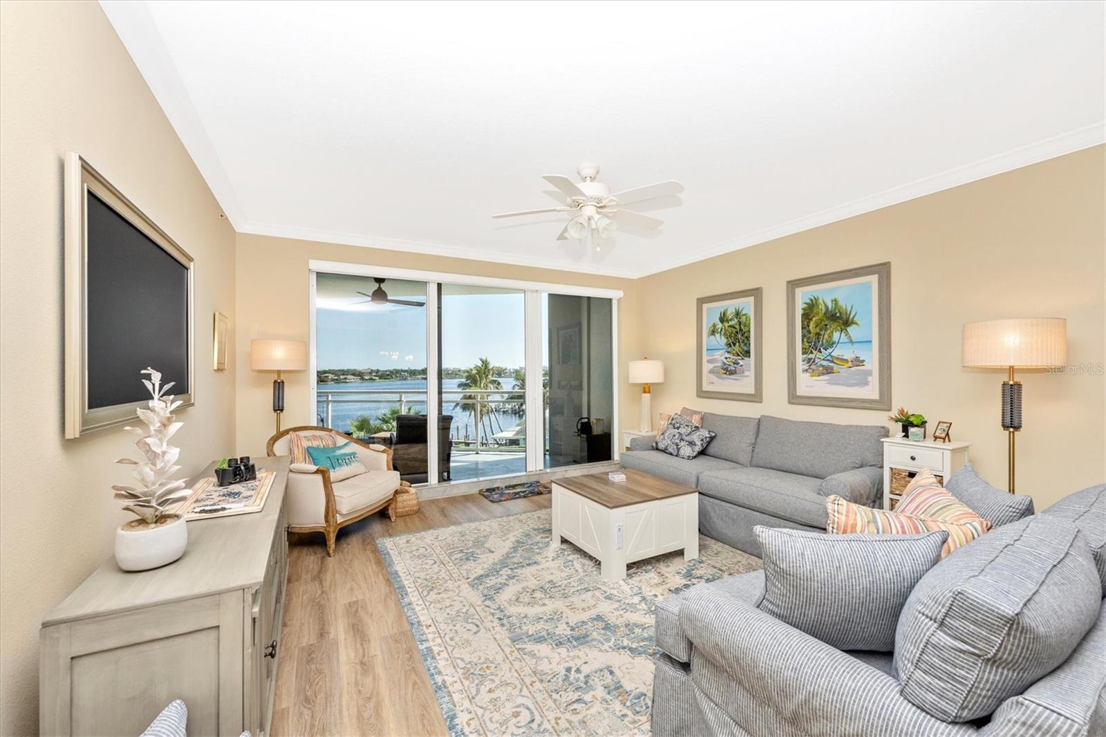 Discover waterfront luxury living at Harbor Villas at Don Bay in this stunning 3-bedroom, 3.5-bath residence offering over 2,300 square feet of elegant space with high ceilings and Luxury Vinyl Plank flooring throughout. This home is being sold turn-key furnished with two bicycles and two kayaks and features an open floor plan with a spacious living and dining area that flows into a gourmet kitchen with pantry and table space, perfect for both entertaining and everyday living. Each bedroom has its own en-suite bath, while the master suite boasts sliding hurricane-rated glass doors that open to a private balcony overlooking Don Bay, where you can enjoy tranquil sunrises and breathtaking sunsets on the water. The two front bedrooms overlook sunrise views on Shakett Creek. Designed with privacy in mind, the split layout provides comfort and functionality. Large Balcony with ceiling fans provides gorgeous saltwater views of Dona Bay. Community amenities include a heated pool, spa, fitness room on 4th floor, and 2 reserved parking spaces in secure garage on ground floor with bicycle rack and kayak storage, boat dock with kayak lift with direct access to the Intracoastal Waterway and Gulf to enjoy the sandbar, small islands and all salt water life has to offe r. Ideally located just minutes from Nokomis, Venice, and Sarasota beaches, this is not only convenien and beautiful, this offers life balance in one of Southwest Florida's most desirable settings. All dock measurements and other measurements and information must be verified by buyer; info provided is approximate and to best knowledge of seller but seller makes no warranty.