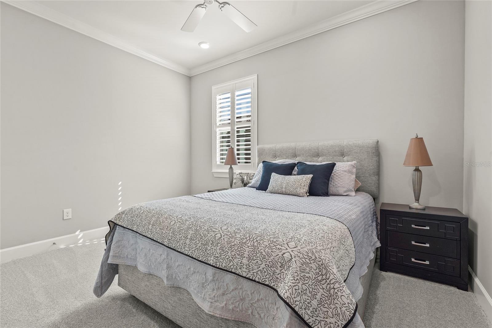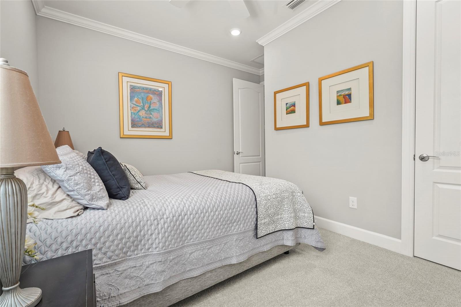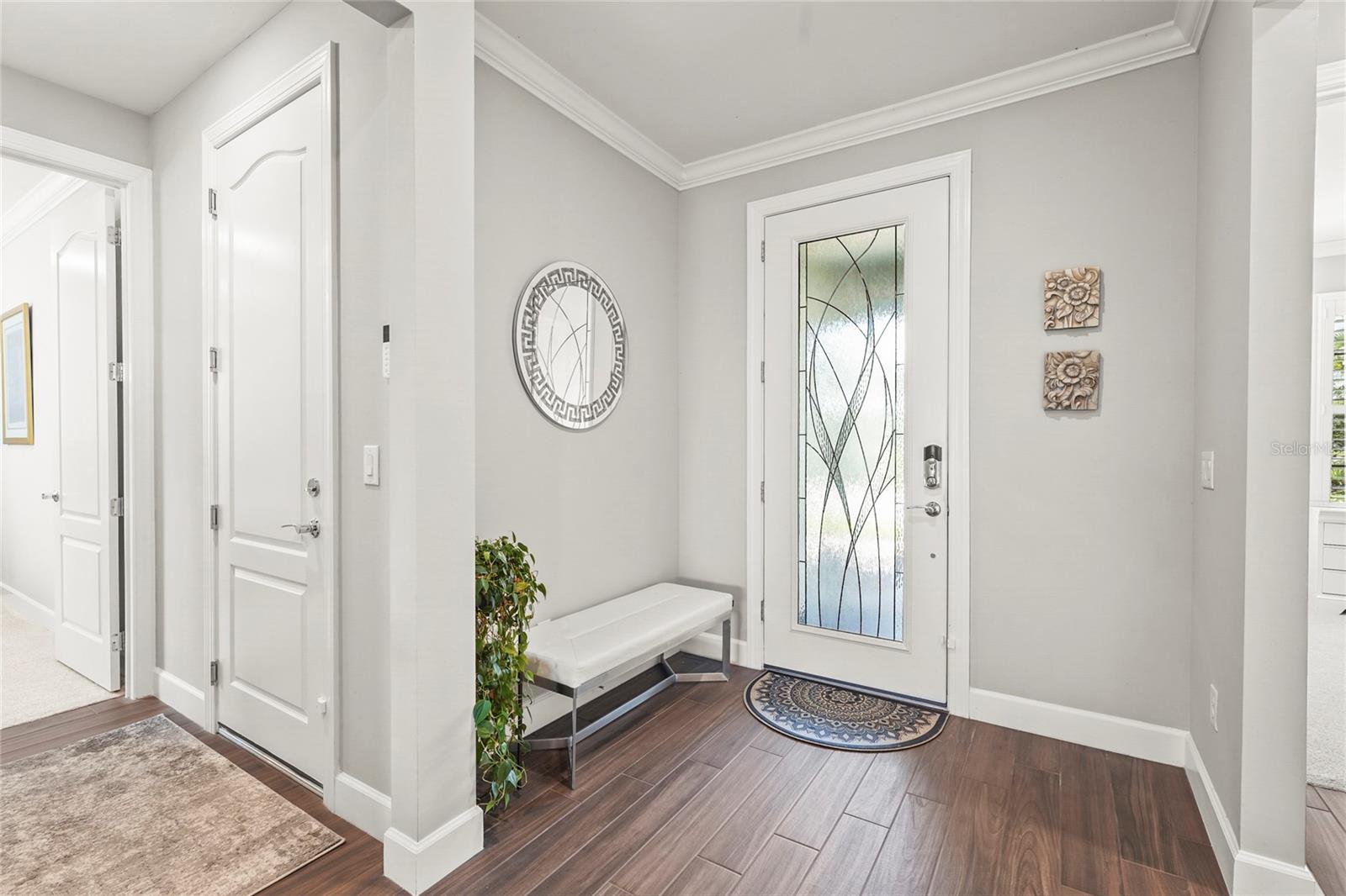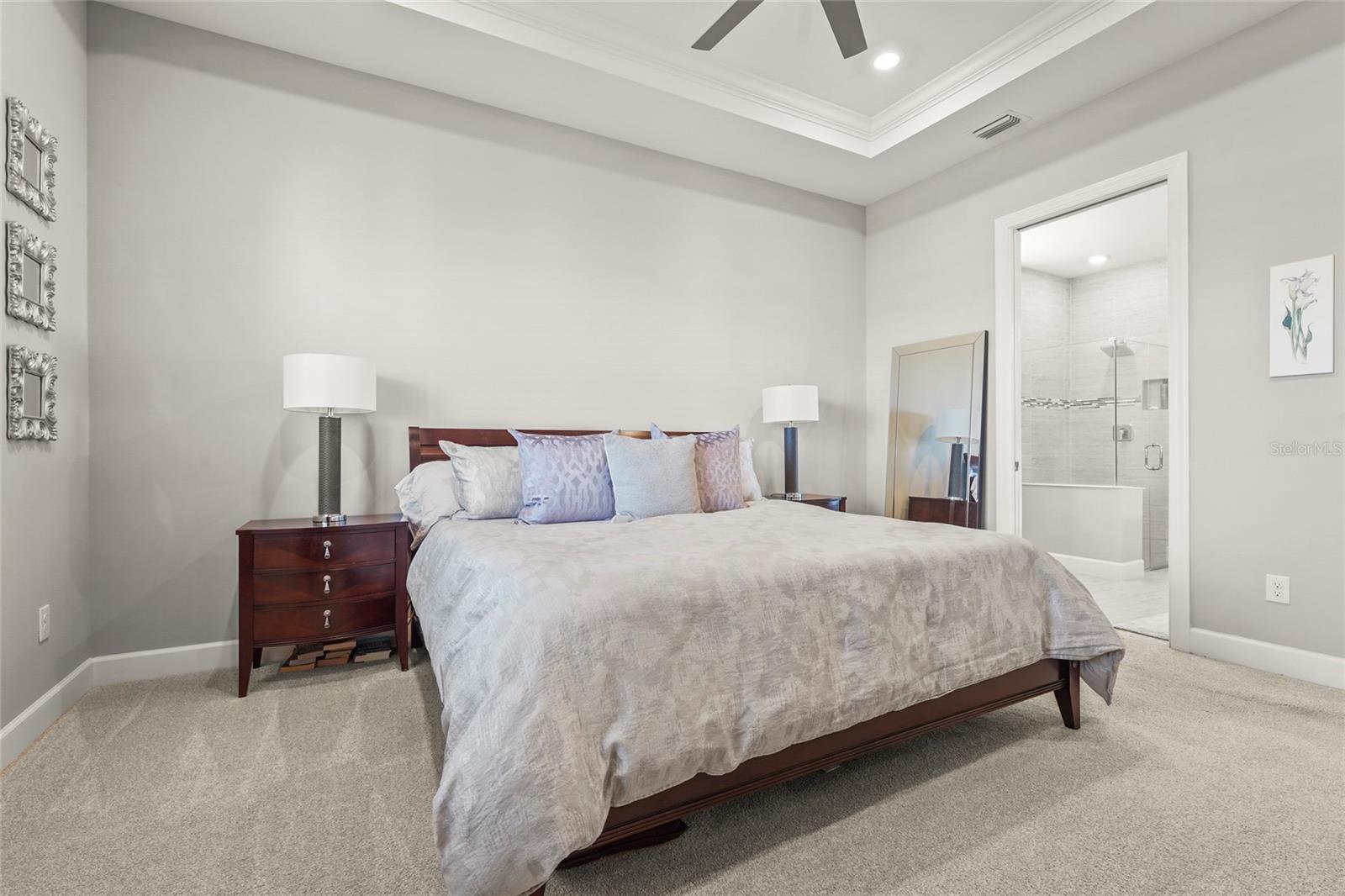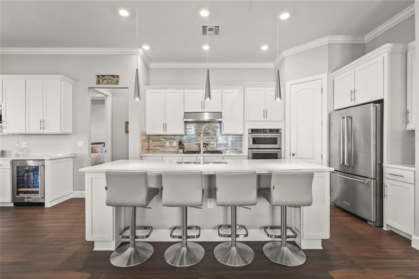 Welcome to luxury living in the sought-after Shoreview at Waterside community! This stunning 3-bedroom, 2-bathroom home offers an exceptional lifestyle with top-tier design elements and captivating water views. Situated on a low-traffic loop with green space across the street and serene water views behind, this residence blends elegance with privacy. Residents enjoy private access to community amenities just across the street in an exclusive enclave.Step inside to find wood-look tile flooring, plantation shutters, and coffered ceilings that add both style and warmth. The spacious primary suite features a custom walk-in closet and a spa-like en-suite bath with dual vanities. A private den/office provides the perfect work-from-home space.The chef's kitchen impresses with quartz countertops, a KitchenAid stainless-steel appliance suite, gas range, and an arched entryway that opens to the family and dining areas. Enjoy a built-in dry bar and wine station with custom cabinetry, perfect for entertaining. The bump-out family room is anchored by a three-sided fireplace, adding ambiance to multiple spaces.Outdoor living shines with a fully equipped summer kitchen featuring a granite backsplash and stainless-steel countertops, a gas hookup, outdoor hood, and plenty of room to relax or entertain. The 3-car garage with an oversized bay and paver driveway offer both function and curb appeal.Additional highlights include laundry room built-ins, wiring and gas line installed for a future whole-house generator.Don't miss your opportunity to own this beautifully appointed home in one of Lakewood Ranch's premier communities.