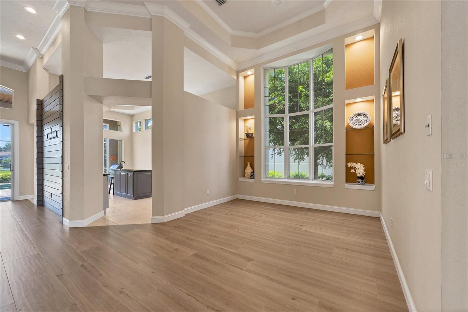 One or more photo(s) has been virtually staged. Situated in the highly sought-after maintenance-free community of Queens Harbour, behind the gates of Bay Isles, this updated lakefront home perfectly captures the ease of Florida living. A 2023 tile roof adds peace of mind, while a smart split floor plan includes three en-suite bedrooms, a half bath, and a versatile den/office that can serve as a fourth bedroom. The interiors feel bright and welcoming with 12-15' ceilings, neutral tones, and elegant architectural details. New wood-look porcelain tile flooring enhances the living room, dining room, den/office, and first-floor bedrooms, combining durability with style. The kitchen features stainless steel appliances, a center island with second sink, updated hardware, and a breakfast nook with bay window views of the pool and lake. The primary suite enjoys direct lanai access, tranquil water views, and a spa-like bath with dual vanities, soaking tub, and walk-in shower. Outdoors, the screened lanai offers a heated pool and spa with a peaceful lake backdrop, plus a refreshed covered sitting area with a new tongue-and-groove ceiling and accent wall--perfect for relaxing or entertaining year-round. Residents enjoy exclusive access to the Bay Isles Beach Club, with its private beachfront, cabanas, and members-only amenities, along with optional memberships for golf, tennis, and the Harbourside Marina with deepwater slips. This home sustained no hurricane damage or water intrusion. This is Longboat Key living made simple--beautiful, low-maintenance, and ready to enjoy.