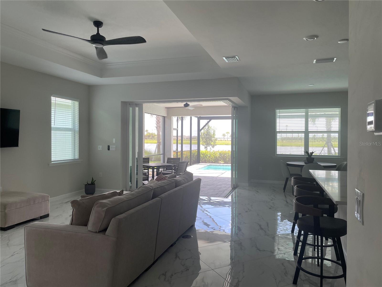 Location! Location! Location! Live a vacation lifestyle every day at your new home in the heart of Babcock Ranch, America's pioneering solar-powered town, where innovation meets sustainability.This impeccably maintained 2 years new, custom-built single story home boasts over 2,000 square feet of living space, with 4 spacious bedrooms, one of which can be used as a den/office/flex room with double 8-lite glass doors plus 2 full bathrooms. This home includes an oversized two car garage with an extra 4' of space, full epoxy coated floor and keyless garage entry. This home also includes quartz countertops in the kitchen and bathrooms, tray ceiling in living area with zero corner slider doors opening to the lanai, making the dream indoor/outdoor lifestyle become a reality. The seamless picture screened lanai patio, with freshly sealed pavers, encloses a low-maintenance saltwater inground pool overlooking a private lake and beyond that, direct views of Lake Babcock and Founder's Square. Lanai also has an extra privacy wall and is fully equipped for an outdoor kitchen. The generous primary bedroom is a true retreat, complete with oversized walk-in closet and an ensuite bathroom featuring a large walk-in shower and oversized soaking tub. Second and third bedrooms are equally spacious and versatile, with adjacent full bathroom, perfect for kids, guests or in-law suite. Both bathrooms have been upgraded to rectangle sinks and all black hardware and faucets. Numerous upgrades throughout this home include a dual whole house water filtration system, extra-large 24" carenza polished porcelain tile throughout the entire home (with 0.5% or less water absorption) with grout recently sealed, all exterior windows and doors are high impact glass, all interior doors include upgraded black hardware, black minimalist remote controlled ceiling fans in every room, including two larger fans in the outside lanai, upgraded laundry room with full upper and lower cabinets, countertop and built-in utility sink.As a resident of Babcock Ranch, you'll have access to two resort-style pools with clubhouses, open nature walking trails, dog parks, community gardens, basketball, tennis and pickleball courts and many shopping and dining options. In addition, you have access to weekly events such as Food Truck Fridays and live music, Farmer's Market Sundays and many many more events daily! Experience the lifestyle you've always dreamed of, where sustainability, leisure, and convenience come together so you can live your best life!