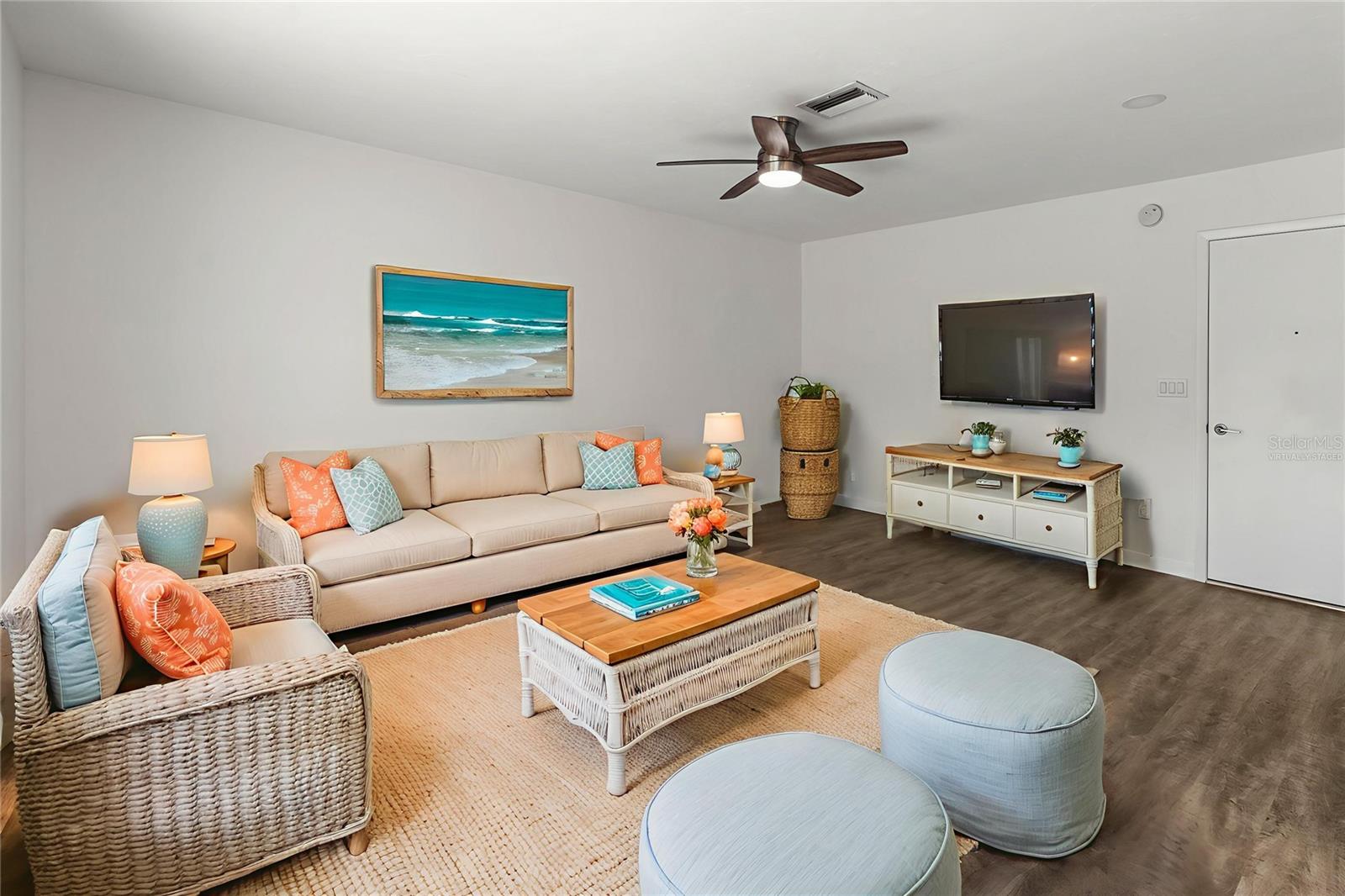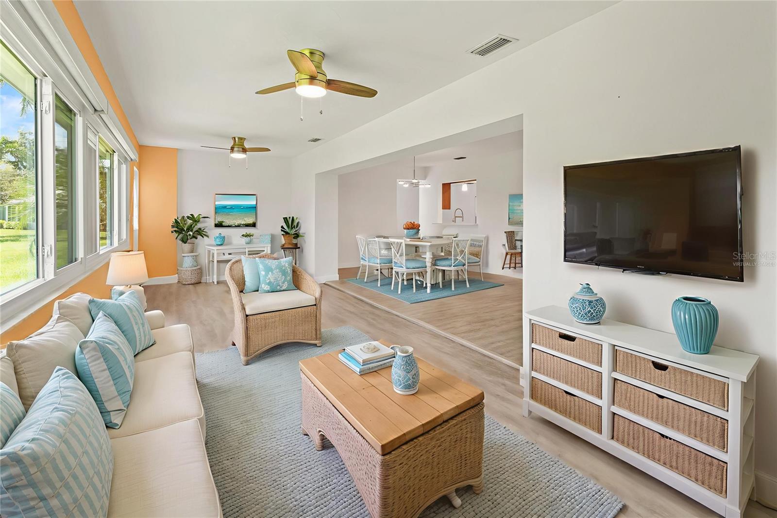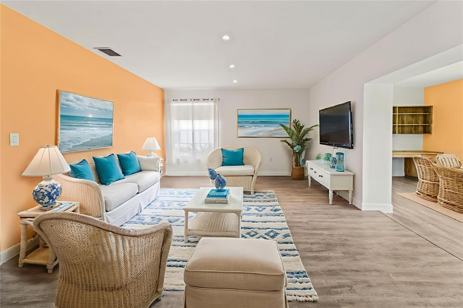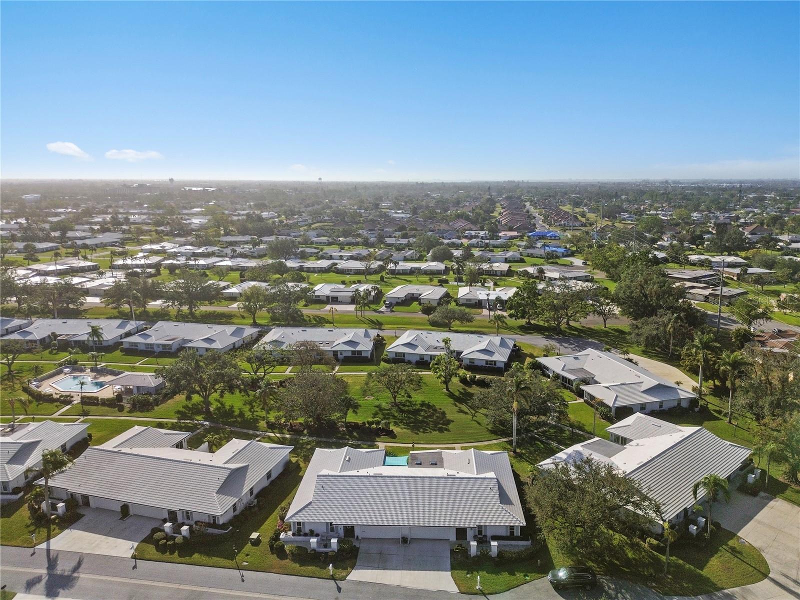 One or more photo(s) has been virtually staged. Welcome to your dream 55+ community in charming West Bradenton! This beautifully maintained condo, nestled on a quiet cul-de-sac in the sought-after Village Green community, offers the perfect blend of comfort, convenience, and peace of mind. Built in one of the most desirable high-and-safe locations. Securely located in Flood Zone X and Evacuation Zone E. With over 1900 sq. ft. of versatile living space, this home features 2 spacious bedrooms, 2 updated bathrooms, and a large galley-style kitchen with new quartz countertops, striking herringbone backsplash, and classic mid-century modern cabinetry. Expansive living areas include bright living/dining room, cozy family room, and a sun-filled Florida room. A roomy 2-car garage with built-in cabinets and shelving, perfect for storage or workspace. Recent updates make this home truly move-in ready with luxury vinyl flooring, nearly all-new windows, refreshed bathrooms, and exterior upgrades including new driveway and charming paver walkway and patio. Step outside and you're moments from the sparkling community pool, perfect for relaxing or socializing. The location can't be beat - minutes from Anna Maria Island's beaches, excellent medical facilities, shopping, dining, and outdoor escapes like Robinson Preserve, Palma Sola Botanical Park, and DeSoto Park. This home is ideal for both relaxation and entertaining, offering a lifestyle that's as practical as it is enjoyable. Don't just dream about Florida living--make it your reality!