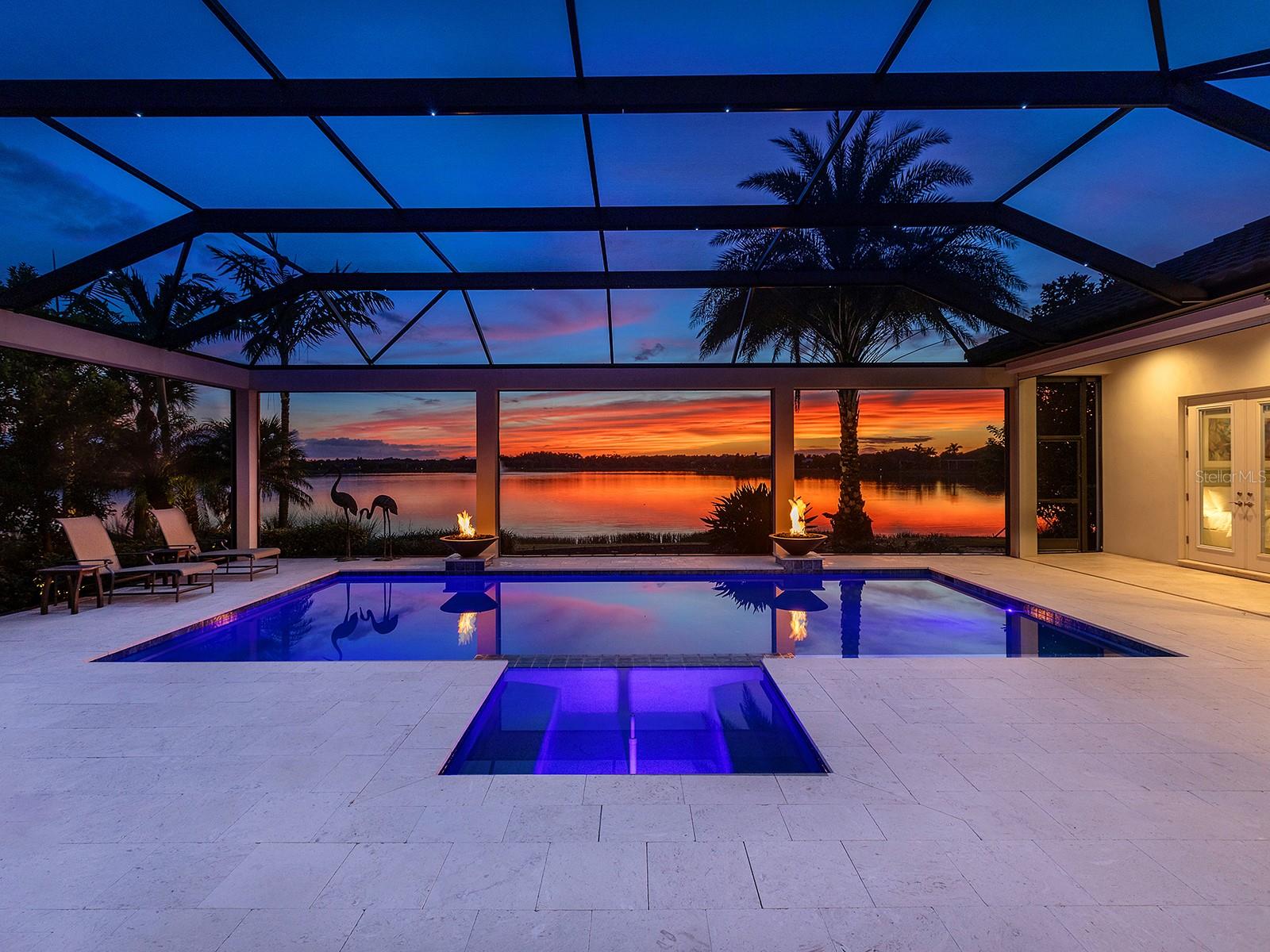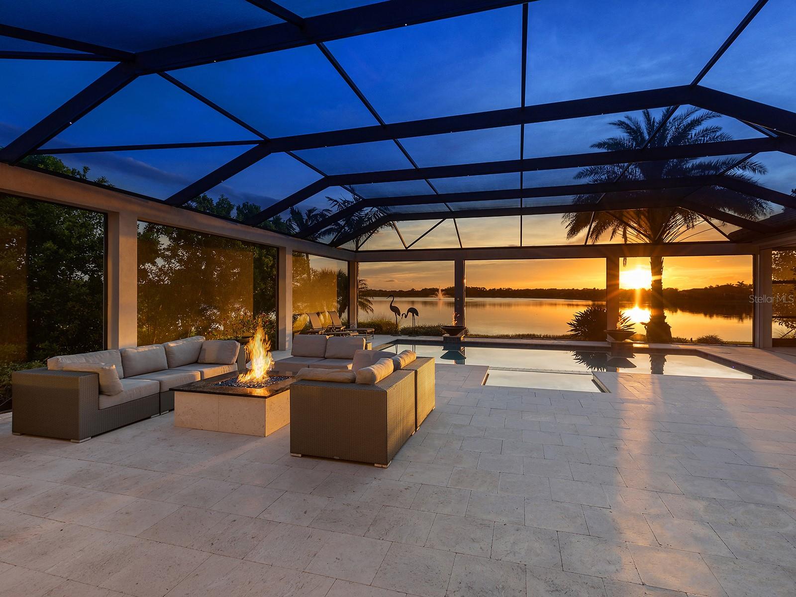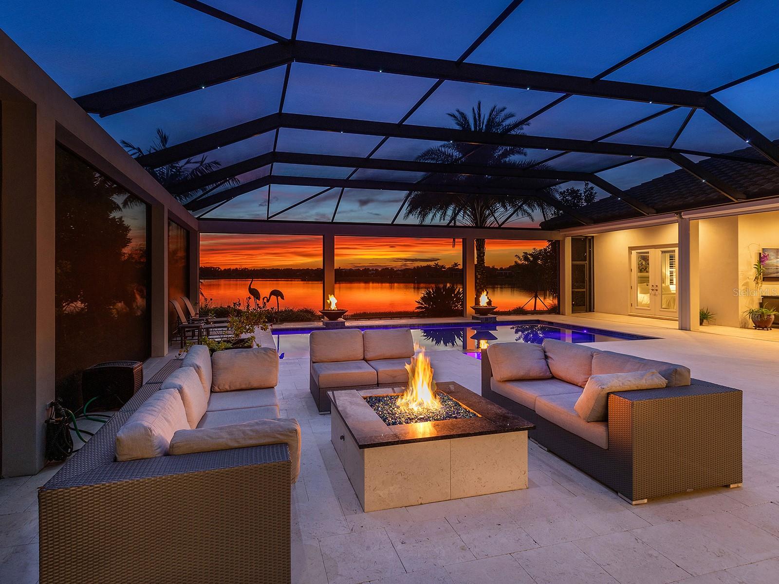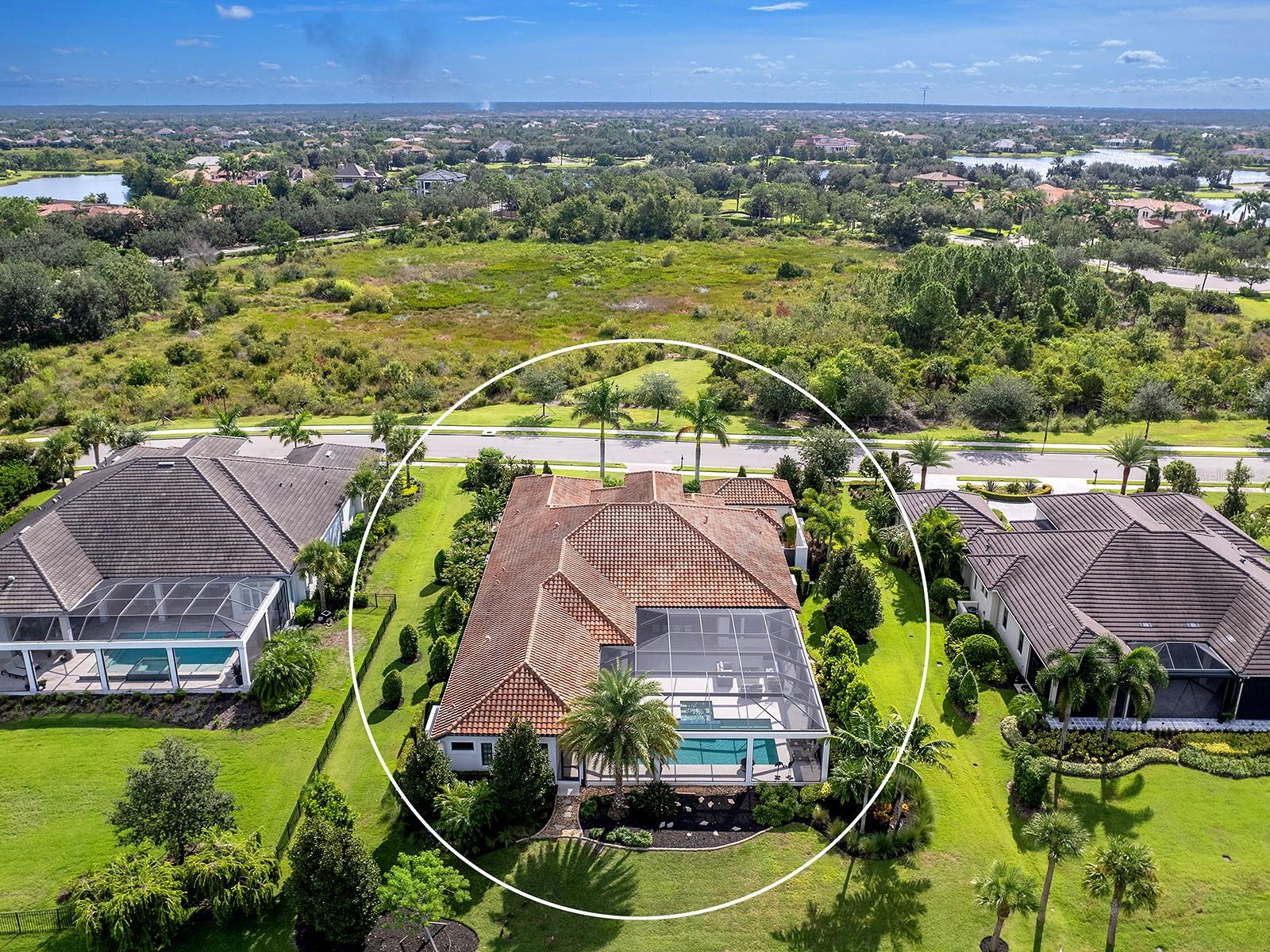 Enjoy the best of what The Lake Club has to offer with this resplendent lakeside residence. From this 2019 Arthur Rutenberg custom home the perfect Florida lifestyle comes to life with western sunset views over the expansive lake from the lanai and peaceful conservation just outside the front door. Gracing over 0.5 acres, this perfectly poised property offers privacy, lush Florida landscaping and a luxurious residence with hand selected details in every room. With over 4,100 SF of living space, this open and modern floor plan offers 4 en-suite bedrooms and 4.5 bathrooms, including a private study, flexible bonus room, and a desirable separate casita guesthouse with kitchenette. The paver driveway invites you home between towering palms and 3-car split bay garages each with their own air conditioning. Enter from the 2024 iron double door to impressive lake views from the moment you step inside where you will be enchanted by luxe upgrades including polished marble flooring, cove crown molding, designer light fixtures and custom window treatments. The great room sparkles with a custom feature wall of stacked stone, gas fireplace and custom coffered ceiling with lighting. Through impact pocketing sliding glass doors, the outdoors are seamlessly integrated into the floor plan featuring wood ceilings, travertine pavers, classic colonnade screen enclosure, 2023 Nebula star lights integrated into the pool cage, 2022 hurricane shades and outstanding lake views. The pool and spa are the perfect place to relax with sunken 360-edge spa with fountain and dual fire bowls, or spend evenings gathered around the gas firepit or dine alfresco from the outdoor kitchen. Inside the Chef's kitchen will delight with completely custom wood cabinetry, large island with quartz counters, designer pendant lights, full height quartz backsplash, reverse osmosis, and a cleverly hidden oversized walk-in pantry with paneled door, abundant custom shelving and an additional full-size refrigerator. Cooking is a breeze with a stainless-steel appliance suite including Wolf gas range with Venta hood, Bosch dishwasher, Sub-Zero refrigerator, Wolf wall oven, Wolf microwave and Sub-Zero wine refrigerator. The dining room showcases disappearing corner impact sliders, designer light fixture, and custom dry bar with Sub-Zero wine refrigerator and stacked stone feature wall that mirrors the great room. The resplendent upgrades continue into the primary suite with engineered hardwood flooring, designer wallpaper and light fixtures, stunning lake views and dual walk-in closets. The spa-like bathroom will make you feel like you're at the Ritz every day with a large vanity featuring dual sinks, thick stone counters, and designer lighting; modern freestanding soaking tub; glass enclosed walk-in rain shower; and private outdoor courtyard oasis. Two split guest suites offer privacy, walk-in closets and fully upgraded en-suite bathrooms; plus, there is a separate casita guesthouse with a private entrance, morning bar kitchenette, walk-in closet and en-suite bath. Additional spaces in this exceptional home include an impressive study with 2023 custom built-ins, large bonus room, powder bath, laundry with plentiful cabinetry and separate walk-in storage. Peace of mind is secured with impact windows/doors, whole-home generator, and whole-home water filtration system. The Lake Club is an exclusive premier, gated community with a Grande Clubhouse, restaurant, pool, tennis, pickleball and more.