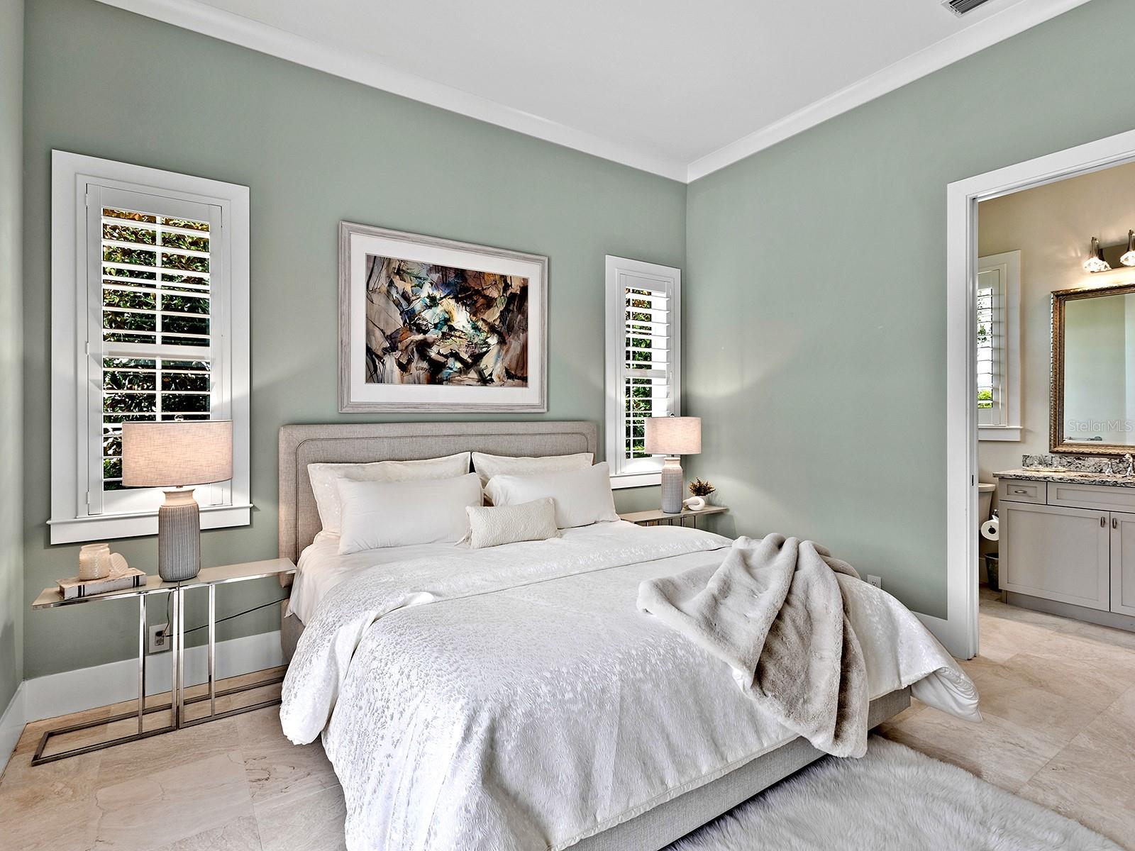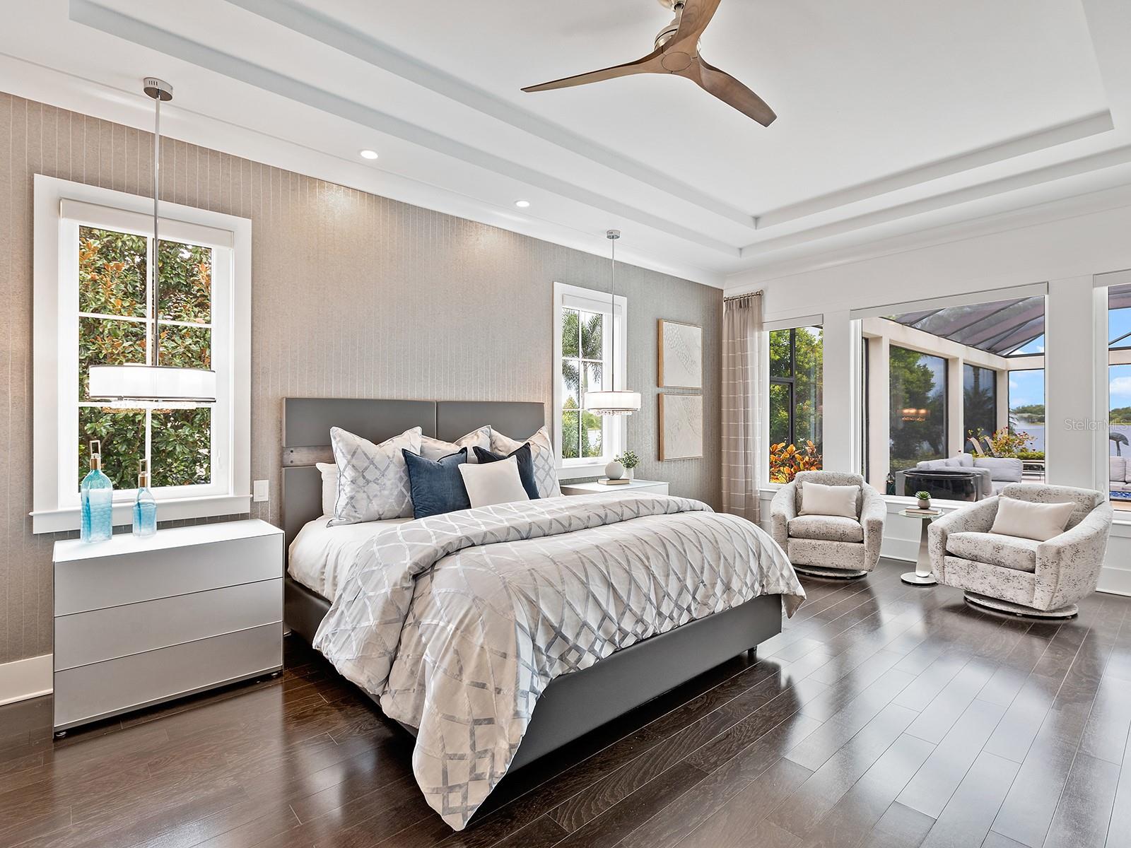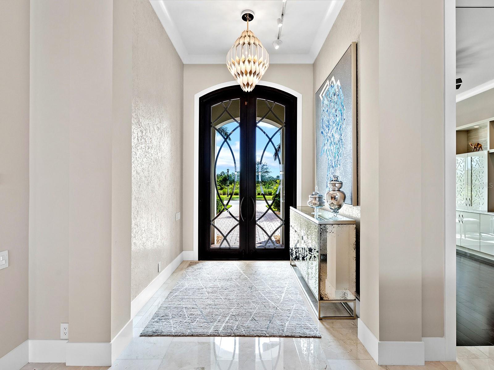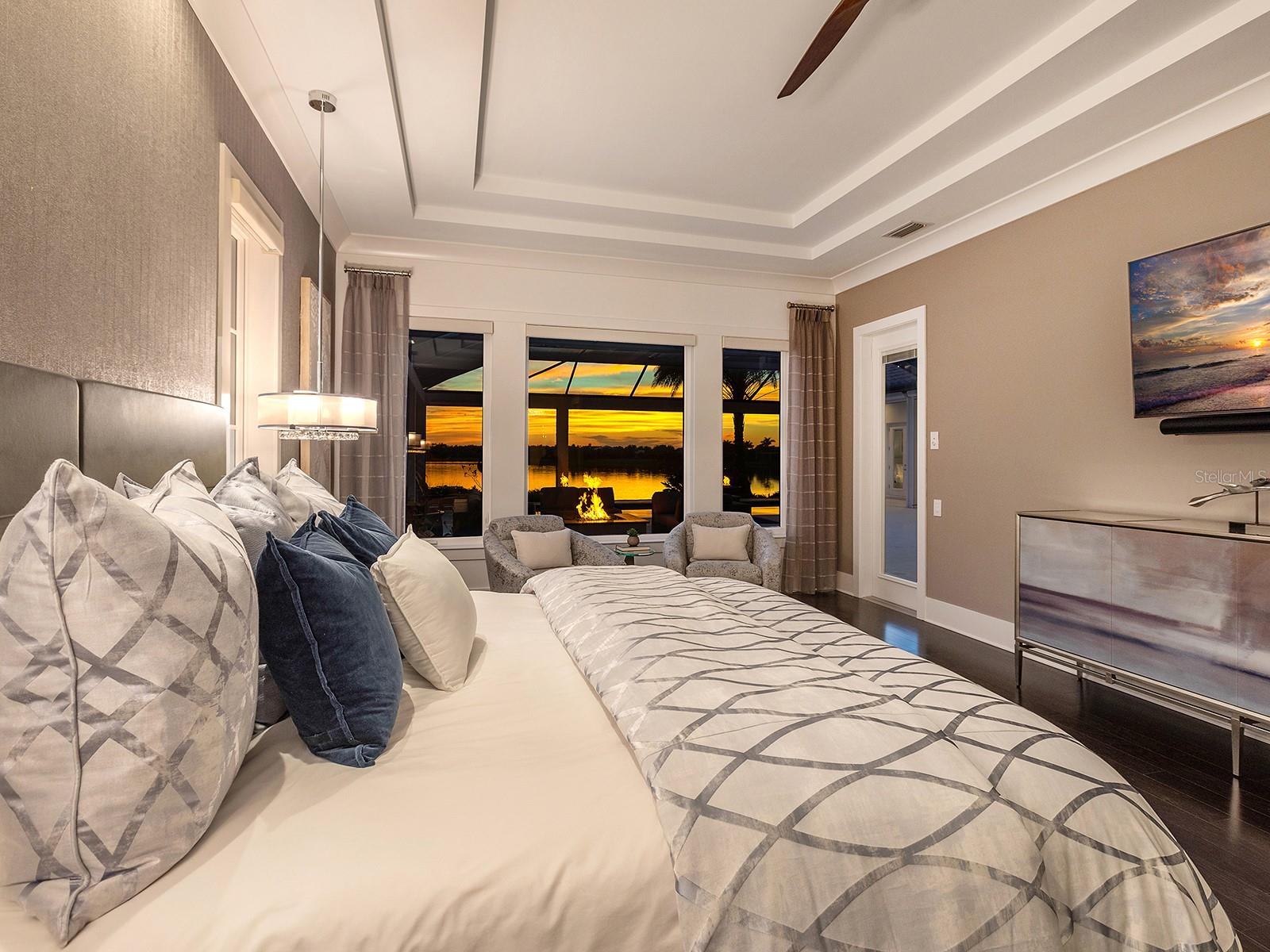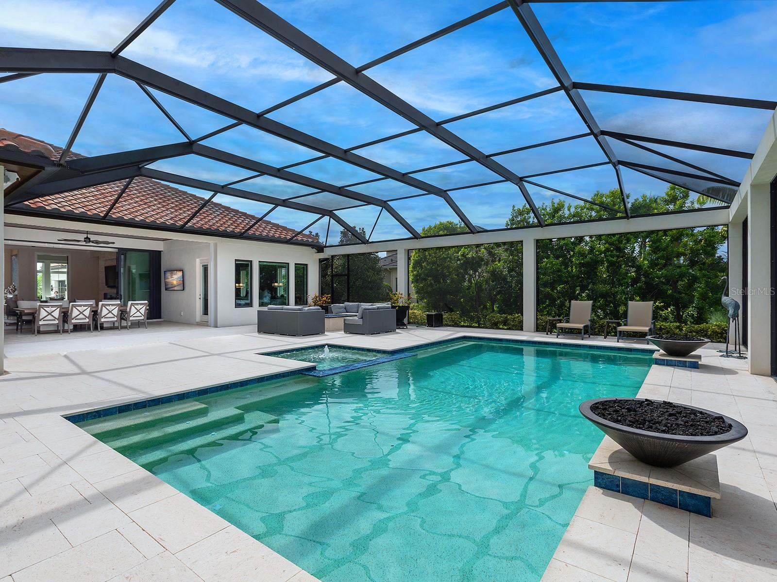 Enjoy the best of what The Lake Club has to offer with this resplendent lakeside residence. From this 2019 Arthur Rutenberg custom home the perfect Florida lifestyle comes to life with western sunset views over the expansive lake from the lanai and peaceful conservation just outside the front door. Gracing over 0.5 acres, this perfectly poised property offers privacy, lush Florida landscaping and a luxurious residence with hand selected details in every room. With over 4,100 SF of living space, this open and modern floor plan offers 4 en-suite bedrooms and 4.5 bathrooms, including a private study, flexible bonus room, and a desirable separate casita guesthouse with kitchenette. The paver driveway invites you home between towering palms and 3-car split bay garages each with their own air conditioning. Enter from the 2024 iron double door to impressive lake views from the moment you step inside where you will be enchanted by luxe upgrades including polished marble flooring, cove crown molding, designer light fixtures and custom window treatments. The great room sparkles with a custom feature wall of stacked stone, gas fireplace and custom coffered ceiling with lighting. Through impact pocketing sliding glass doors, the outdoors are seamlessly integrated into the floor plan featuring wood ceilings, travertine pavers, classic colonnade screen enclosure, 2023 Nebula star lights integrated into the pool cage, 2022 hurricane shades and outstanding lake views. The pool and spa are the perfect place to relax with sunken 360-edge spa with fountain and dual fire bowls, or spend evenings gathered around the gas firepit or dine alfresco from the outdoor kitchen. Inside the Chef's kitchen will delight with completely custom wood cabinetry, large island with quartz counters, designer pendant lights, full height quartz backsplash, reverse osmosis, and a cleverly hidden oversized walk-in pantry with paneled door, abundant custom shelving and an additional full-size refrigerator. Cooking is a breeze with a stainless-steel appliance suite including Wolf gas range with Venta hood, Bosch dishwasher, Sub-Zero refrigerator, Wolf wall oven, Wolf microwave and Sub-Zero wine refrigerator. The dining room showcases disappearing corner impact sliders, designer light fixture, and custom dry bar with Sub-Zero wine refrigerator and stacked stone feature wall that mirrors the great room. The resplendent upgrades continue into the primary suite with engineered hardwood flooring, designer wallpaper and light fixtures, stunning lake views and dual walk-in closets. The spa-like bathroom will make you feel like you're at the Ritz every day with a large vanity featuring dual sinks, thick stone counters, and designer lighting; modern freestanding soaking tub; glass enclosed walk-in rain shower; and private outdoor courtyard oasis. Two split guest suites offer privacy, walk-in closets and fully upgraded en-suite bathrooms; plus, there is a separate casita guesthouse with a private entrance, morning bar kitchenette, walk-in closet and en-suite bath. Additional spaces in this exceptional home include an impressive study with 2023 custom built-ins, large bonus room, powder bath, laundry with plentiful cabinetry and separate walk-in storage. Peace of mind is secured with impact windows/doors, whole-home generator, and whole-home water filtration system. The Lake Club is an exclusive premier, gated community with a Grande Clubhouse, restaurant, pool, tennis, pickleball and more.