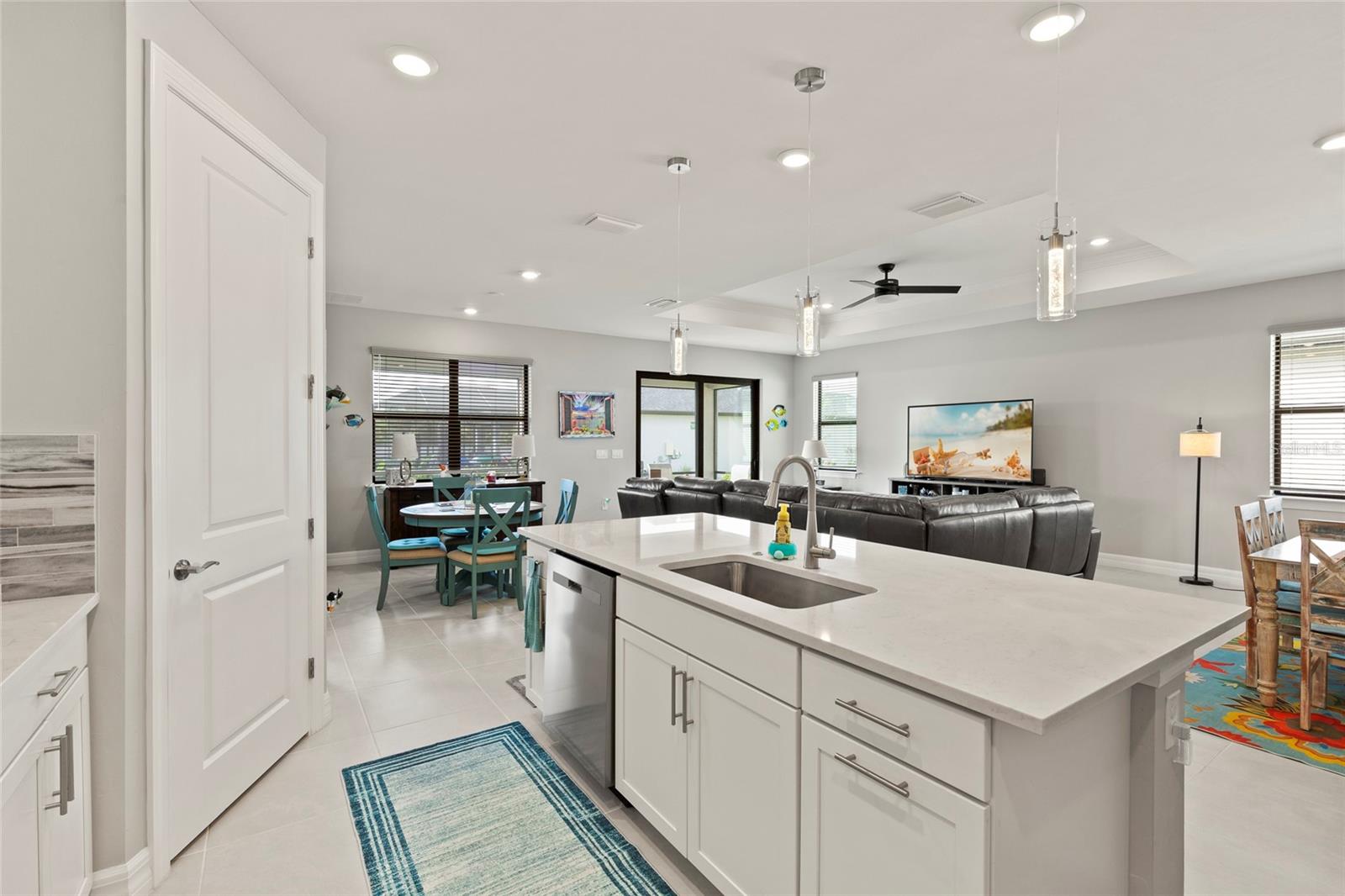 WELCOME TO THIS BEAUTIFUL 2-YEAR-OLD HOME! Offers 1% lender credit at closing. This 3-bedroom plus den, 2-bath home is located in the desirable community of Cedar Grove at the Woodlands, which offers a community pool and playground just minutes from the Gulf beaches. Enjoy great curb appeal with upgraded landscaping that sets the tone for what's inside.Enter through the hurricane-rated etched glass door and find 8-foot doors, hurricane-impact windows, and custom window treatments throughout. The open floor plan is perfect for entertaining and everyday living, featuring high-quality ceiling fans and plenty of natural light.The kitchen offers quartz countertops, a large island, tile backsplash, 42" upper cabinets, and an upgraded appliance package. The guest bedrooms and den share a stylish bathroom with quartz countertops and a tall vanity.The primary suite overlooks the pond and includes a walk-in shower with floor-to-ceiling tile, dual vanities with quartz countertops, and a large walk-in closet.Additional features include a laundry room with cabinets and sink, an extended 4-foot garage with overhead storage racks, and a covered lanai for relaxing outdoors.