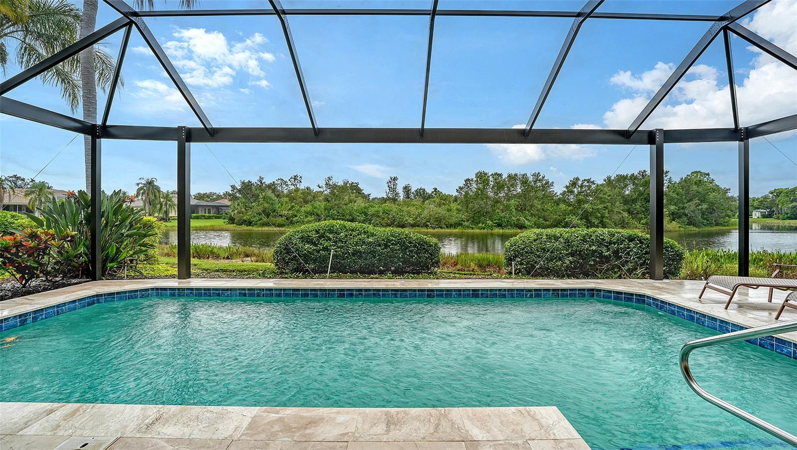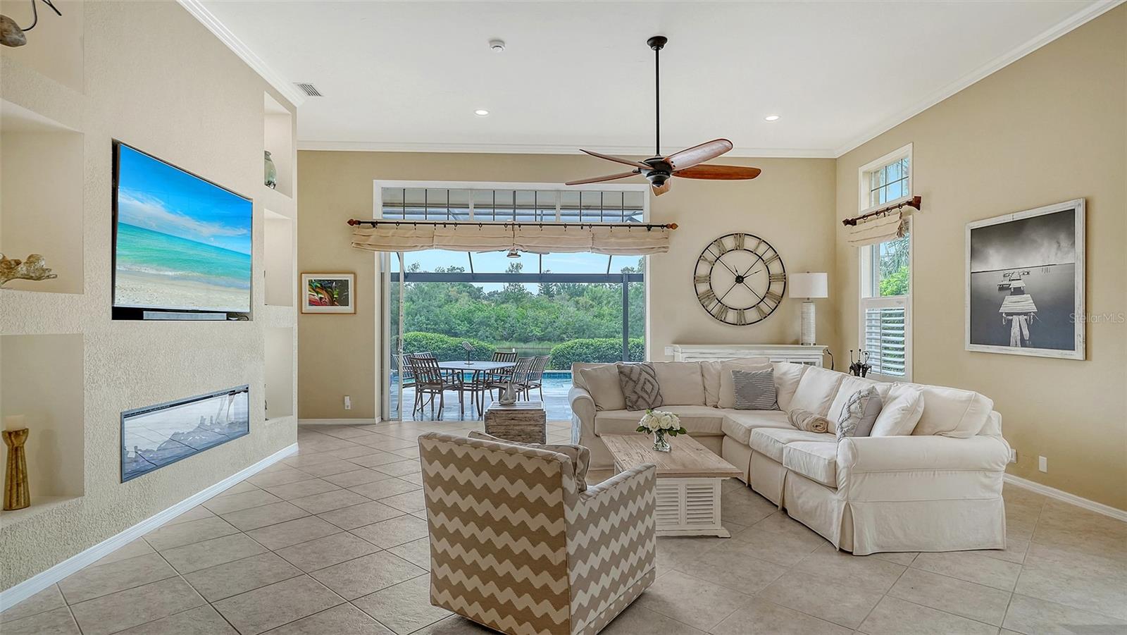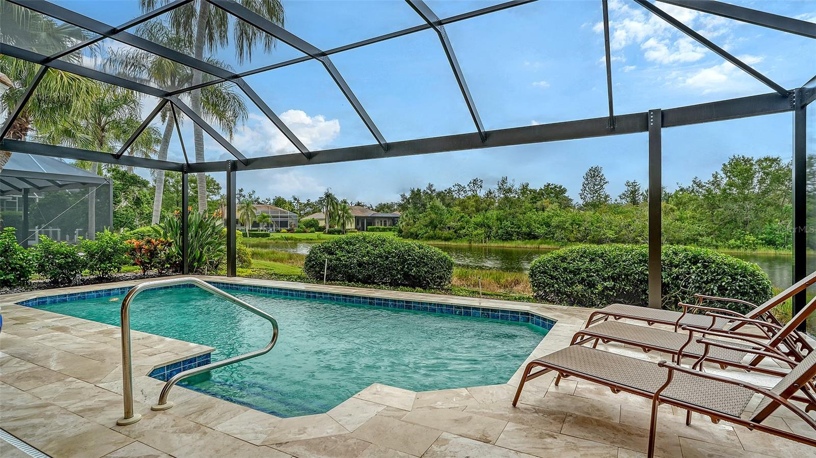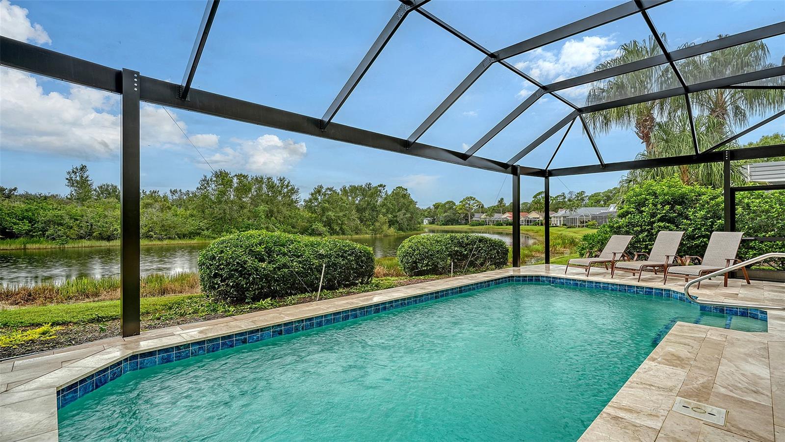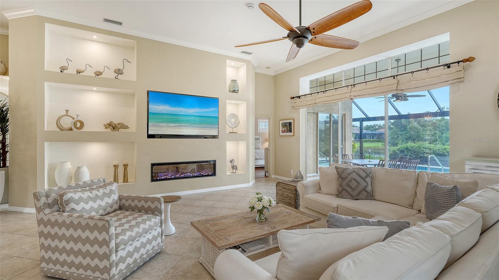 Welcome to this beautifully maintained and tastefully updated 3-bedroom, 2.5-bath home with an office, located in the award-winning University Park Country Club. From the moment you arrive, the tropical landscaping, pavered walkway, and sleek glass-paneled double doors with transom window set the stage for the inviting atmosphere inside.The open-concept living and dining room is filled with natural light and features soaring ceilings, modern lighting, designer ceiling fans, and diagonal tile flooring that flows seamlessly throughout much of the home. The spacious eat-in kitchen is a chef's delight, offering a center island with gas cooktop, granite countertops, tiled backsplash, built-in oven and microwave, pantry closet, recessed lighting, and abundant cabinetry. A breakfast bar, charming window seat, and desk area add function and character. The adjacent laundry room includes a washer and dryer, sink, storage closet and access to the two-car garage.The living area is anchored by an electric fireplace framed with built-in nooks and elegant crown molding. Just off the living space, a private office/study offers flexibility as a den or formal dining room. Expansive fully-retractable sliding doors extend the living space outdoors to the lanai.The primary suite is a retreat with hardwood floors, tray ceiling, Bermuda shutters, retractable sliders to the lanai, and a stunningly renovated ensuite bath. Here you'll find quartz countertops with dual sinks and a makeup vanity, a free-standing soaking tub, zero-entry walk-in shower, double frosted glass doors to a large closet, and sleek designer finishes. Two guest bedrooms with hardwood floors, shutters, and ceiling fans share an updated bath with granite countertops and a tub/shower combination with glass enclosure.Step outside to the expansive lanai, designed for both relaxation and entertaining. Featuring leather marble pavers, a grill area, sparkling pool, and infinity screened enclosure with serene lake views, it also includes a convenient pool half-bath.Peace of mind comes with a NEW ROOF (2023), HVAC (2018), and NEW POOL EQUIPMENT, pump, and heater. As part of the maintenance-free Virginia Water neighborhood, residents also enjoy a community pool and a carefree lifestyle.This home combines elegance, functionality, and resort-style living--all within the renowned University Park Country Club community.University Park Country Club is consistently ranked one of the top courses in Florida featuring 27 holes of championship golf; tennis and pickleball; fitness center, croquet - as well as an array of social and group activities. Just a short drive outside this peaceful enclave is downtown Sarasota, with shopping, arts & theatres, museums, dining and entertainment, top-ranked healthcare, beaches and SRQ International Airport.