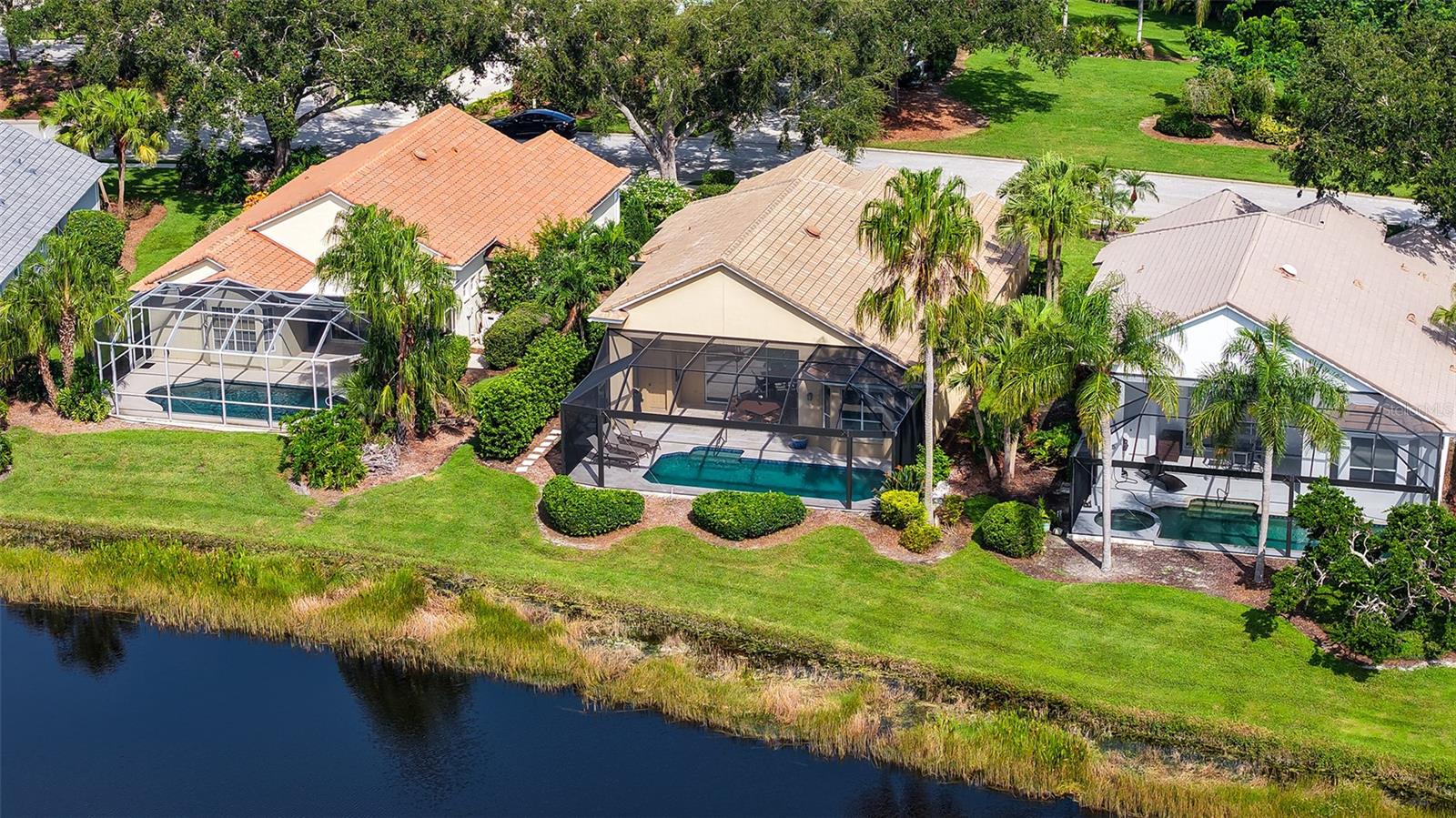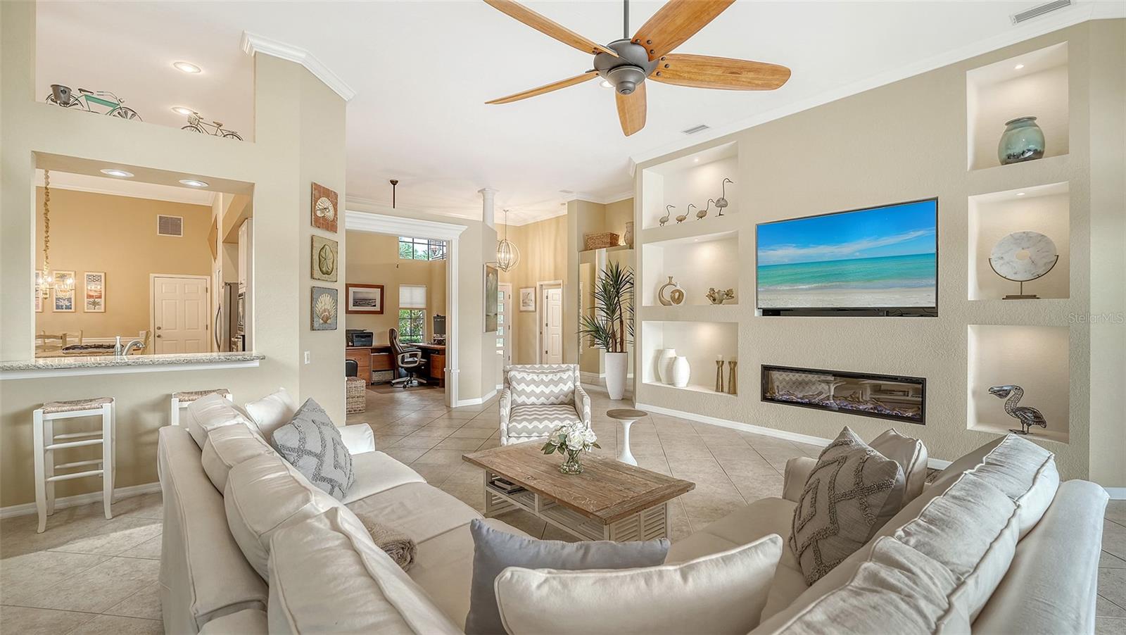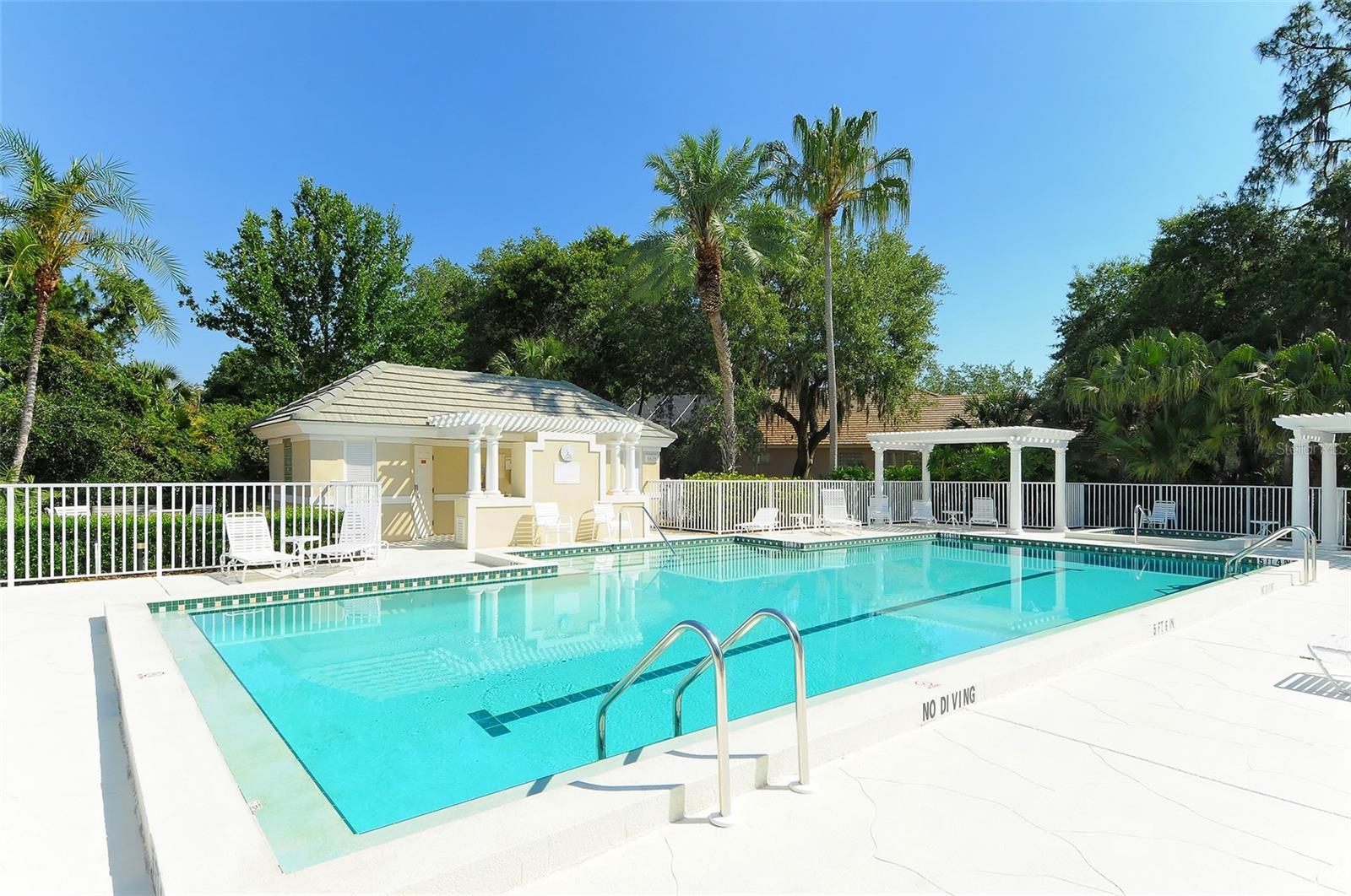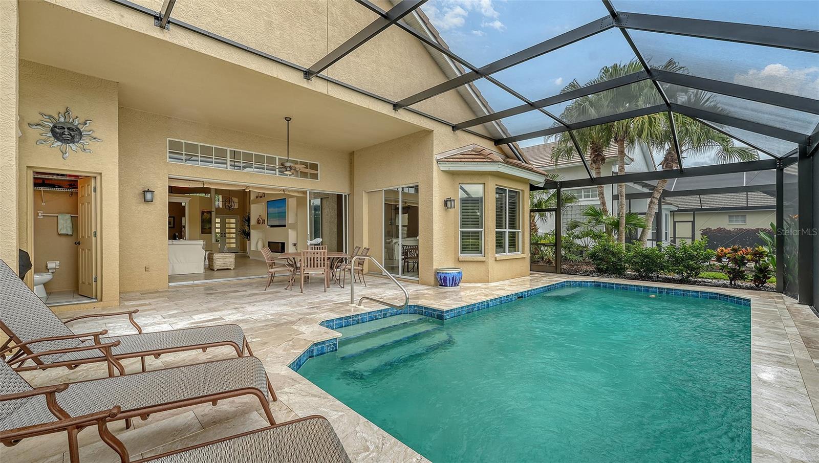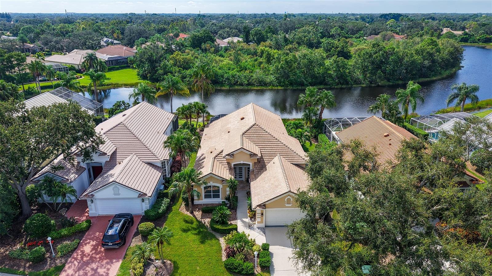 Welcome to this beautifully maintained and tastefully updated 3-bedroom, 2.5-bath home with an office, located in the award-winning University Park Country Club. From the moment you arrive, the tropical landscaping, pavered walkway, and sleek glass-paneled double doors with transom window set the stage for the inviting atmosphere inside.The open-concept living and dining room is filled with natural light and features soaring ceilings, modern lighting, designer ceiling fans, and diagonal tile flooring that flows seamlessly throughout much of the home. The spacious eat-in kitchen is a chef's delight, offering a center island with gas cooktop, granite countertops, tiled backsplash, built-in oven and microwave, pantry closet, recessed lighting, and abundant cabinetry. A breakfast bar, charming window seat, and desk area add function and character. The adjacent laundry room includes a washer and dryer, sink, storage closet and access to the two-car garage.The living area is anchored by an electric fireplace framed with built-in nooks and elegant crown molding. Just off the living space, a private office/study offers flexibility as a den or formal dining room. Expansive fully-retractable sliding doors extend the living space outdoors to the lanai.The primary suite is a retreat with hardwood floors, tray ceiling, Bermuda shutters, retractable sliders to the lanai, and a stunningly renovated ensuite bath. Here you'll find quartz countertops with dual sinks and a makeup vanity, a free-standing soaking tub, zero-entry walk-in shower, double frosted glass doors to a large closet, and sleek designer finishes. Two guest bedrooms with hardwood floors, shutters, and ceiling fans share an updated bath with granite countertops and a tub/shower combination with glass enclosure.Step outside to the expansive lanai, designed for both relaxation and entertaining. Featuring leather marble pavers, a grill area, sparkling pool, and infinity screened enclosure with serene lake views, it also includes a convenient pool half-bath.Peace of mind comes with a NEW ROOF (2023), HVAC (2018), and NEW POOL EQUIPMENT, pump, and heater. As part of the maintenance-free Virginia Water neighborhood, residents also enjoy a community pool and a carefree lifestyle.This home combines elegance, functionality, and resort-style living--all within the renowned University Park Country Club community.University Park Country Club is consistently ranked one of the top courses in Florida featuring 27 holes of championship golf; tennis and pickleball; fitness center, croquet - as well as an array of social and group activities. Just a short drive outside this peaceful enclave is downtown Sarasota, with shopping, arts & theatres, museums, dining and entertainment, top-ranked healthcare, beaches and SRQ International Airport.