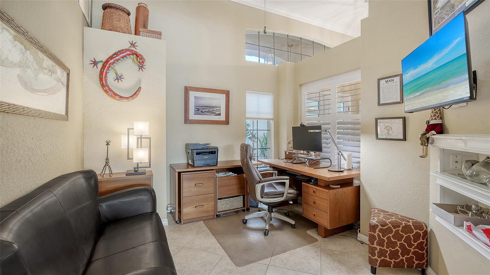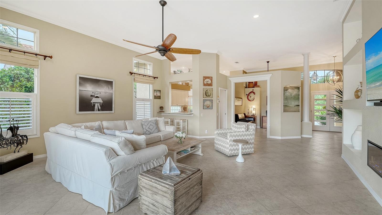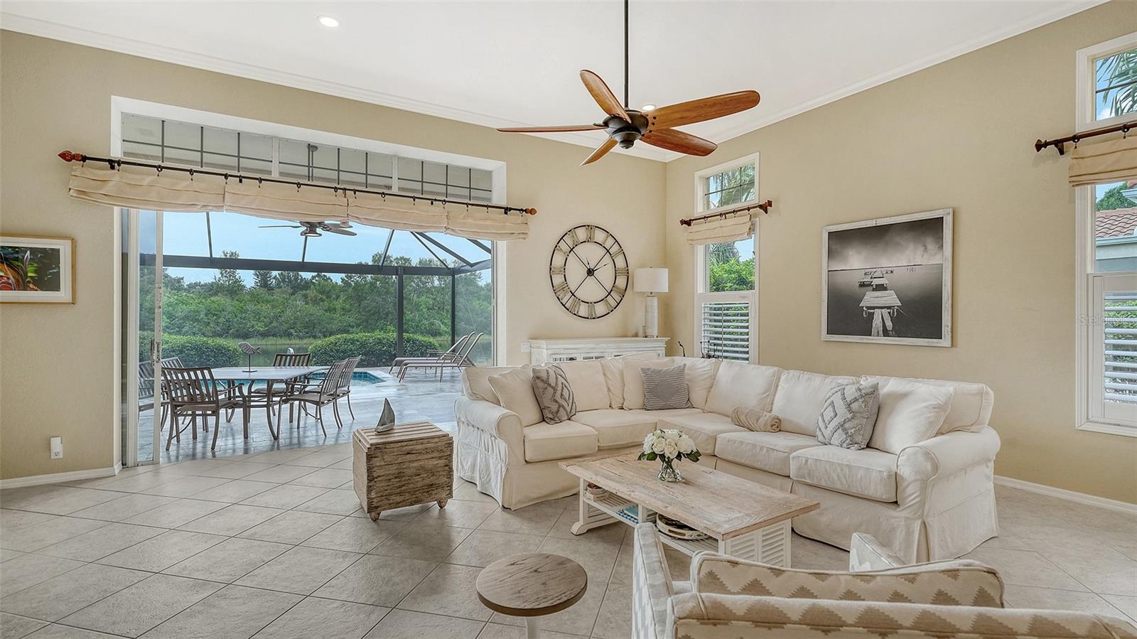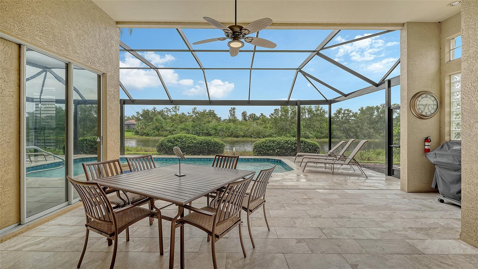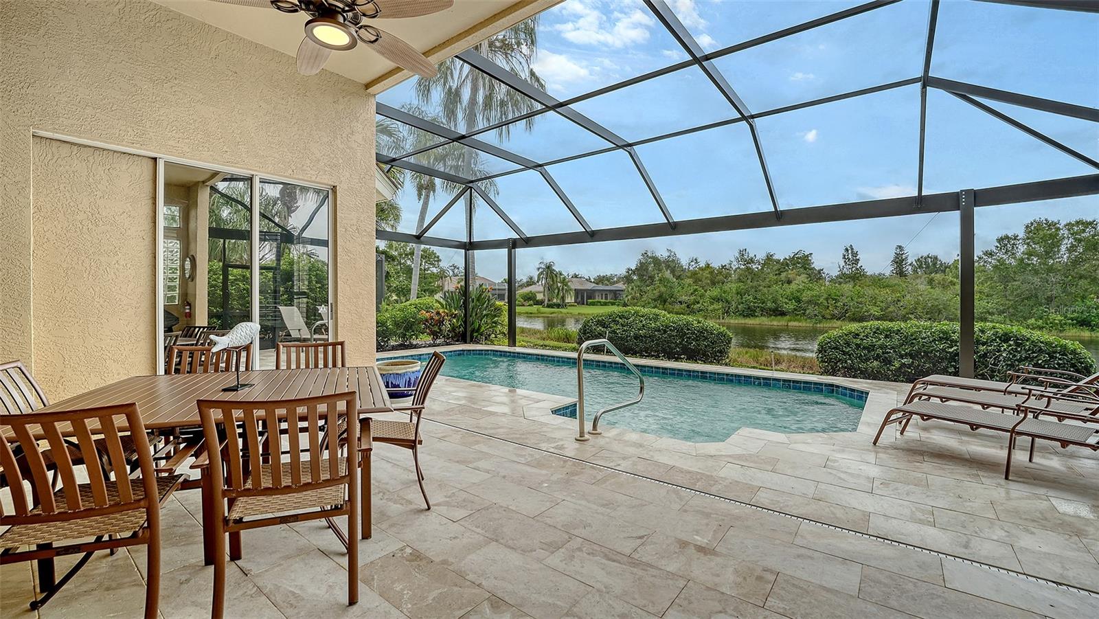 Welcome to this beautifully maintained and tastefully updated 3-bedroom, 2.5-bath home with an office, located in the award-winning University Park Country Club. From the moment you arrive, the tropical landscaping, pavered walkway, and sleek glass-paneled double doors with transom window set the stage for the inviting atmosphere inside.The open-concept living and dining room is filled with natural light and features soaring ceilings, modern lighting, designer ceiling fans, and diagonal tile flooring that flows seamlessly throughout much of the home. The spacious eat-in kitchen is a chef's delight, offering a center island with gas cooktop, granite countertops, tiled backsplash, built-in oven and microwave, pantry closet, recessed lighting, and abundant cabinetry. A breakfast bar, charming window seat, and desk area add function and character. The adjacent laundry room includes a washer and dryer, sink, storage closet and access to the two-car garage.The living area is anchored by an electric fireplace framed with built-in nooks and elegant crown molding. Just off the living space, a private office/study offers flexibility as a den or formal dining room. Expansive fully-retractable sliding doors extend the living space outdoors to the lanai.The primary suite is a retreat with hardwood floors, tray ceiling, Bermuda shutters, retractable sliders to the lanai, and a stunningly renovated ensuite bath. Here you'll find quartz countertops with dual sinks and a makeup vanity, a free-standing soaking tub, zero-entry walk-in shower, double frosted glass doors to a large closet, and sleek designer finishes. Two guest bedrooms with hardwood floors, shutters, and ceiling fans share an updated bath with granite countertops and a tub/shower combination with glass enclosure.Step outside to the expansive lanai, designed for both relaxation and entertaining. Featuring leather marble pavers, a grill area, sparkling pool, and infinity screened enclosure with serene lake views, it also includes a convenient pool half-bath.Peace of mind comes with a NEW ROOF (2023), HVAC (2018), and NEW POOL EQUIPMENT, pump, and heater. As part of the maintenance-free Virginia Water neighborhood, residents also enjoy a community pool and a carefree lifestyle.This home combines elegance, functionality, and resort-style living--all within the renowned University Park Country Club community.University Park Country Club is consistently ranked one of the top courses in Florida featuring 27 holes of championship golf; tennis and pickleball; fitness center, croquet - as well as an array of social and group activities. Just a short drive outside this peaceful enclave is downtown Sarasota, with shopping, arts & theatres, museums, dining and entertainment, top-ranked healthcare, beaches and SRQ International Airport.