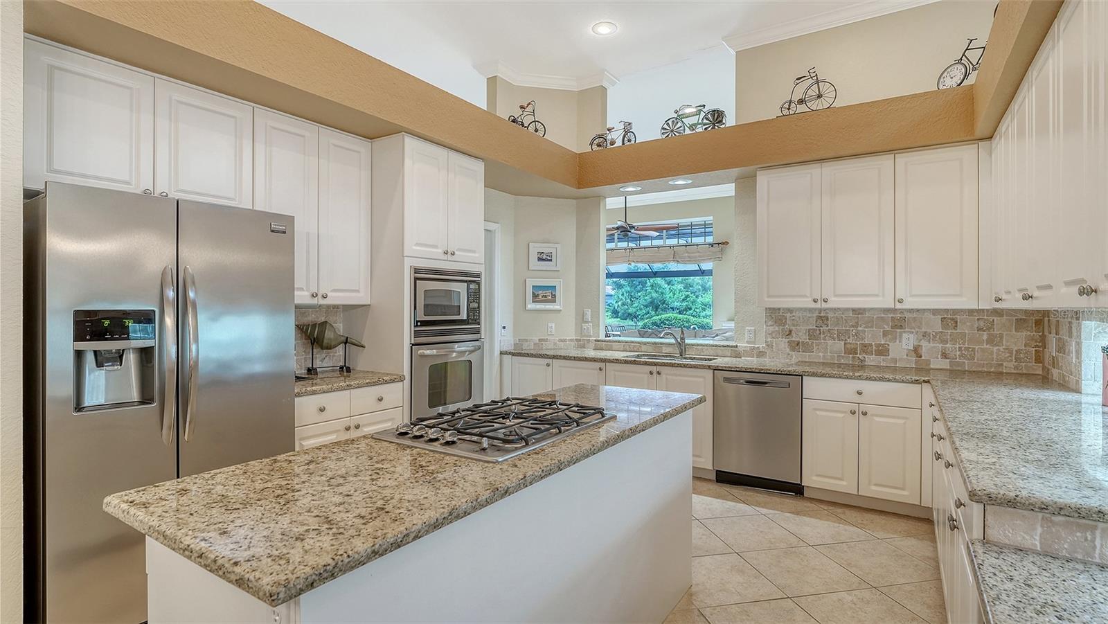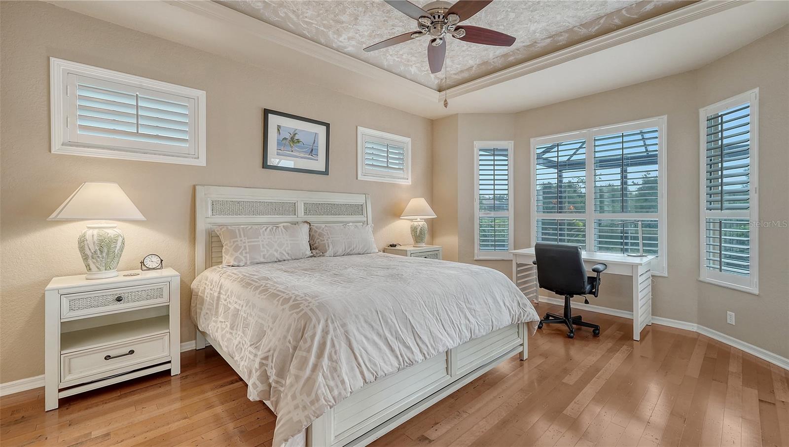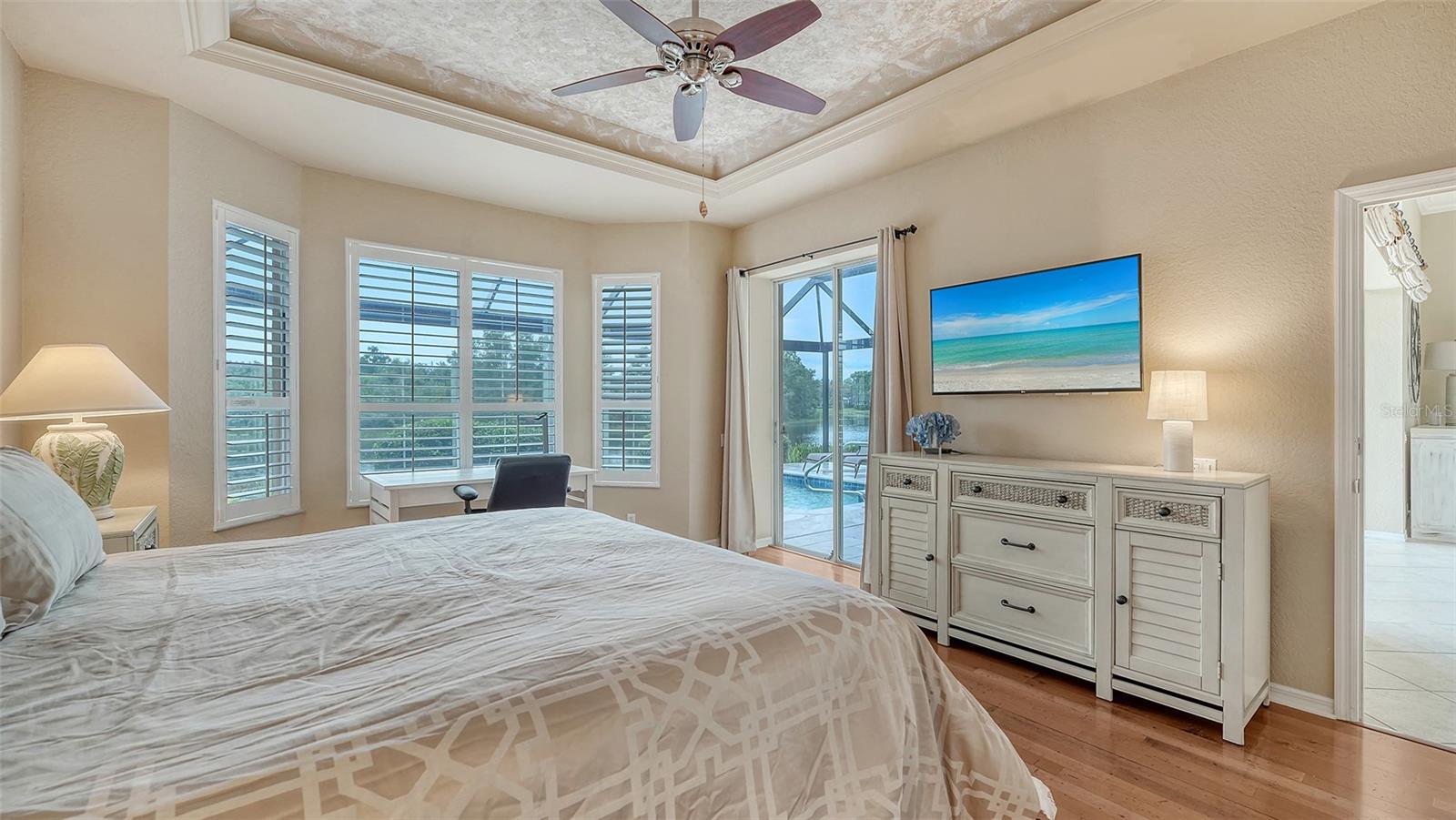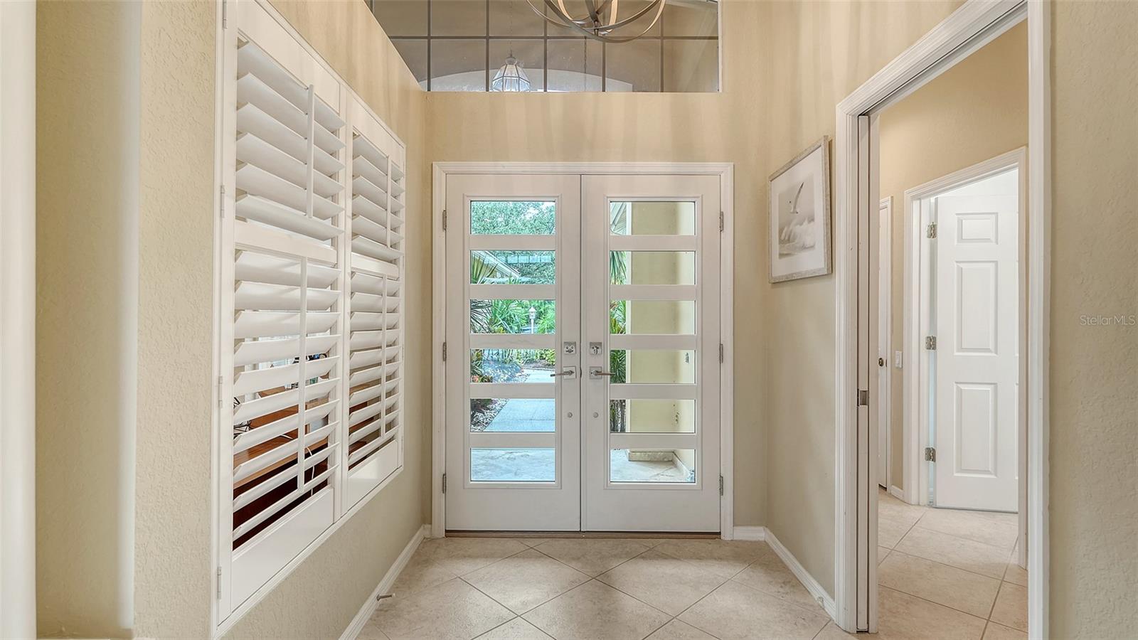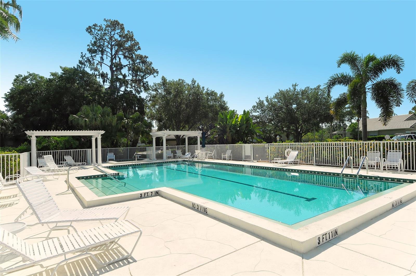 Welcome to this beautifully maintained and tastefully updated 3-bedroom, 2.5-bath home with an office, located in the award-winning University Park Country Club. From the moment you arrive, the tropical landscaping, pavered walkway, and sleek glass-paneled double doors with transom window set the stage for the inviting atmosphere inside.The open-concept living and dining room is filled with natural light and features soaring ceilings, modern lighting, designer ceiling fans, and diagonal tile flooring that flows seamlessly throughout much of the home. The spacious eat-in kitchen is a chef's delight, offering a center island with gas cooktop, granite countertops, tiled backsplash, built-in oven and microwave, pantry closet, recessed lighting, and abundant cabinetry. A breakfast bar, charming window seat, and desk area add function and character. The adjacent laundry room includes a washer and dryer, sink, storage closet and access to the two-car garage.The living area is anchored by an electric fireplace framed with built-in nooks and elegant crown molding. Just off the living space, a private office/study offers flexibility as a den or formal dining room. Expansive fully-retractable sliding doors extend the living space outdoors to the lanai.The primary suite is a retreat with hardwood floors, tray ceiling, Bermuda shutters, retractable sliders to the lanai, and a stunningly renovated ensuite bath. Here you'll find quartz countertops with dual sinks and a makeup vanity, a free-standing soaking tub, zero-entry walk-in shower, double frosted glass doors to a large closet, and sleek designer finishes. Two guest bedrooms with hardwood floors, shutters, and ceiling fans share an updated bath with granite countertops and a tub/shower combination with glass enclosure.Step outside to the expansive lanai, designed for both relaxation and entertaining. Featuring leather marble pavers, a grill area, sparkling pool, and infinity screened enclosure with serene lake views, it also includes a convenient pool half-bath.Peace of mind comes with a NEW ROOF (2023), HVAC (2018), and NEW POOL EQUIPMENT, pump, and heater. As part of the maintenance-free Virginia Water neighborhood, residents also enjoy a community pool and a carefree lifestyle.This home combines elegance, functionality, and resort-style living--all within the renowned University Park Country Club community.University Park Country Club is consistently ranked one of the top courses in Florida featuring 27 holes of championship golf; tennis and pickleball; fitness center, croquet - as well as an array of social and group activities. Just a short drive outside this peaceful enclave is downtown Sarasota, with shopping, arts & theatres, museums, dining and entertainment, top-ranked healthcare, beaches and SRQ International Airport.