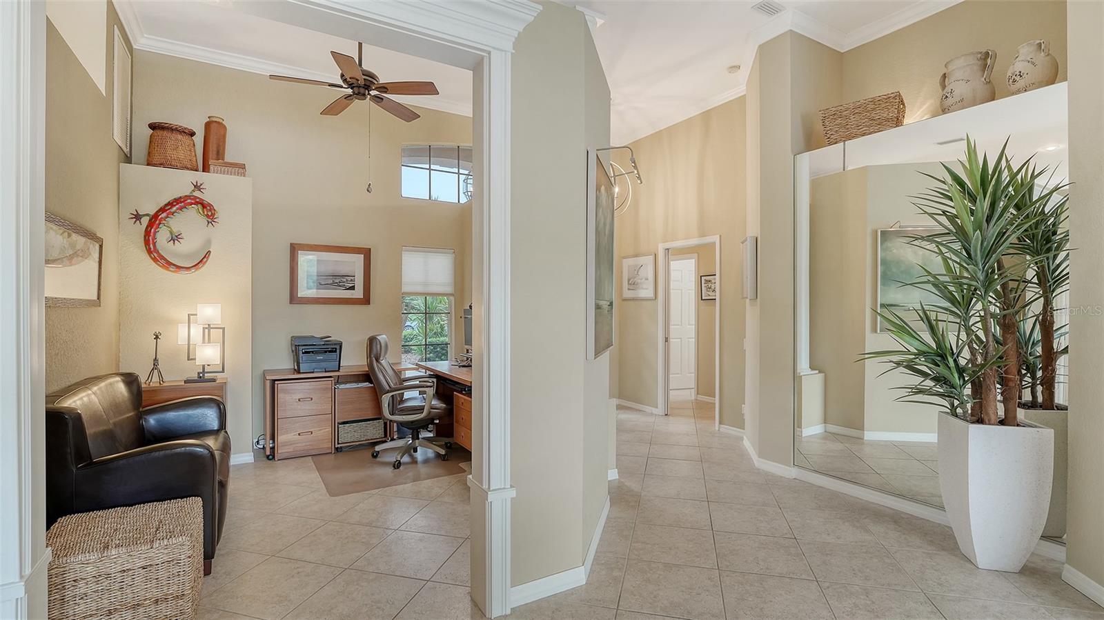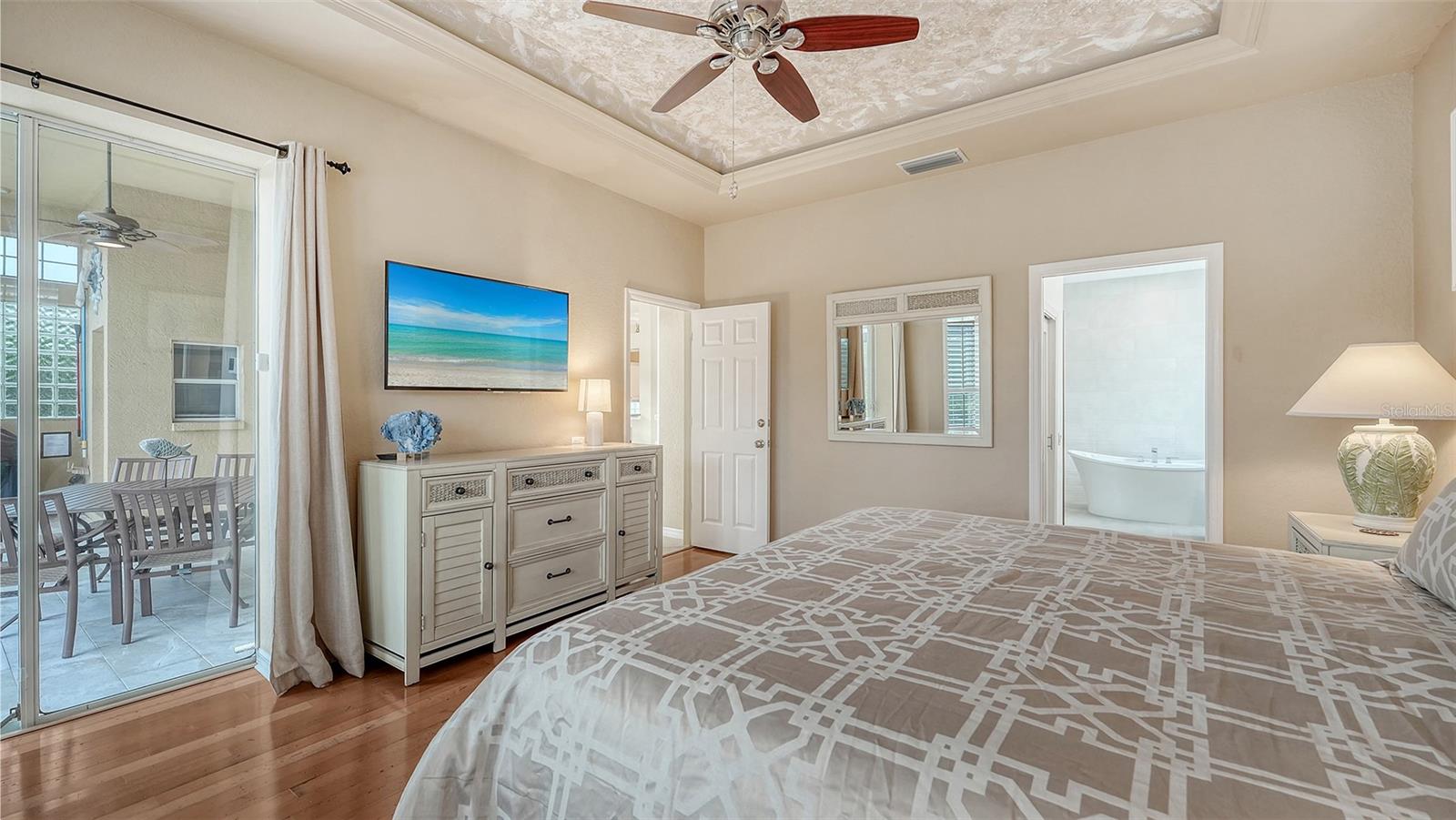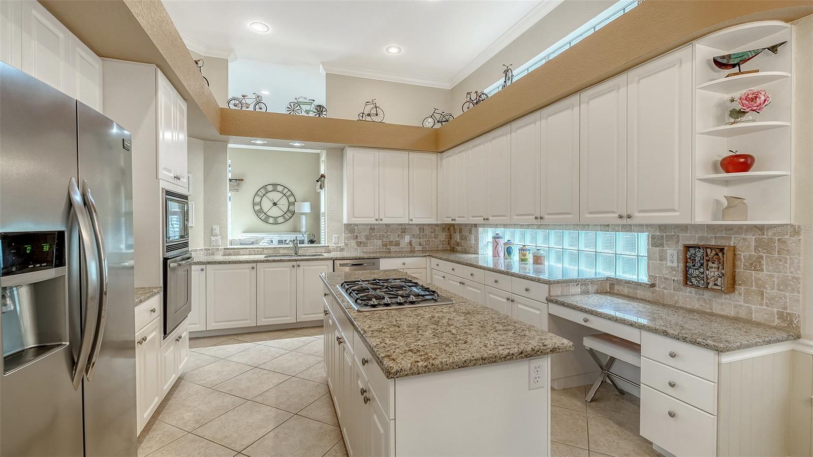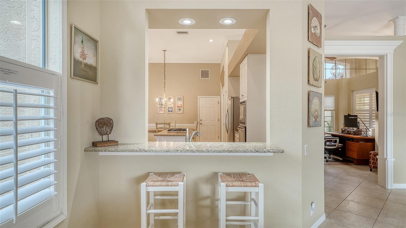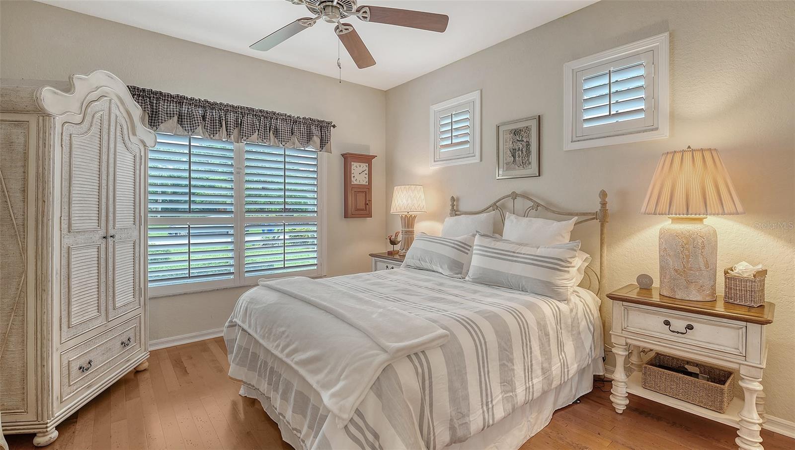 Welcome to this beautifully maintained and tastefully updated 3-bedroom, 2.5-bath home with an office, located in the award-winning University Park Country Club. From the moment you arrive, the tropical landscaping, pavered walkway, and sleek glass-paneled double doors with transom window set the stage for the inviting atmosphere inside.The open-concept living and dining room is filled with natural light and features soaring ceilings, modern lighting, designer ceiling fans, and diagonal tile flooring that flows seamlessly throughout much of the home. The spacious eat-in kitchen is a chef's delight, offering a center island with gas cooktop, granite countertops, tiled backsplash, built-in oven and microwave, pantry closet, recessed lighting, and abundant cabinetry. A breakfast bar, charming window seat, and desk area add function and character. The adjacent laundry room includes a washer and dryer, sink, storage closet and access to the two-car garage.The living area is anchored by an electric fireplace framed with built-in nooks and elegant crown molding. Just off the living space, a private office/study offers flexibility as a den or formal dining room. Expansive fully-retractable sliding doors extend the living space outdoors to the lanai.The primary suite is a retreat with hardwood floors, tray ceiling, Bermuda shutters, retractable sliders to the lanai, and a stunningly renovated ensuite bath. Here you'll find quartz countertops with dual sinks and a makeup vanity, a free-standing soaking tub, zero-entry walk-in shower, double frosted glass doors to a large closet, and sleek designer finishes. Two guest bedrooms with hardwood floors, shutters, and ceiling fans share an updated bath with granite countertops and a tub/shower combination with glass enclosure.Step outside to the expansive lanai, designed for both relaxation and entertaining. Featuring leather marble pavers, a grill area, sparkling pool, and infinity screened enclosure with serene lake views, it also includes a convenient pool half-bath.Peace of mind comes with a NEW ROOF (2023), HVAC (2018), and NEW POOL EQUIPMENT, pump, and heater. As part of the maintenance-free Virginia Water neighborhood, residents also enjoy a community pool and a carefree lifestyle.This home combines elegance, functionality, and resort-style living--all within the renowned University Park Country Club community.University Park Country Club is consistently ranked one of the top courses in Florida featuring 27 holes of championship golf; tennis and pickleball; fitness center, croquet - as well as an array of social and group activities. Just a short drive outside this peaceful enclave is downtown Sarasota, with shopping, arts & theatres, museums, dining and entertainment, top-ranked healthcare, beaches and SRQ International Airport.