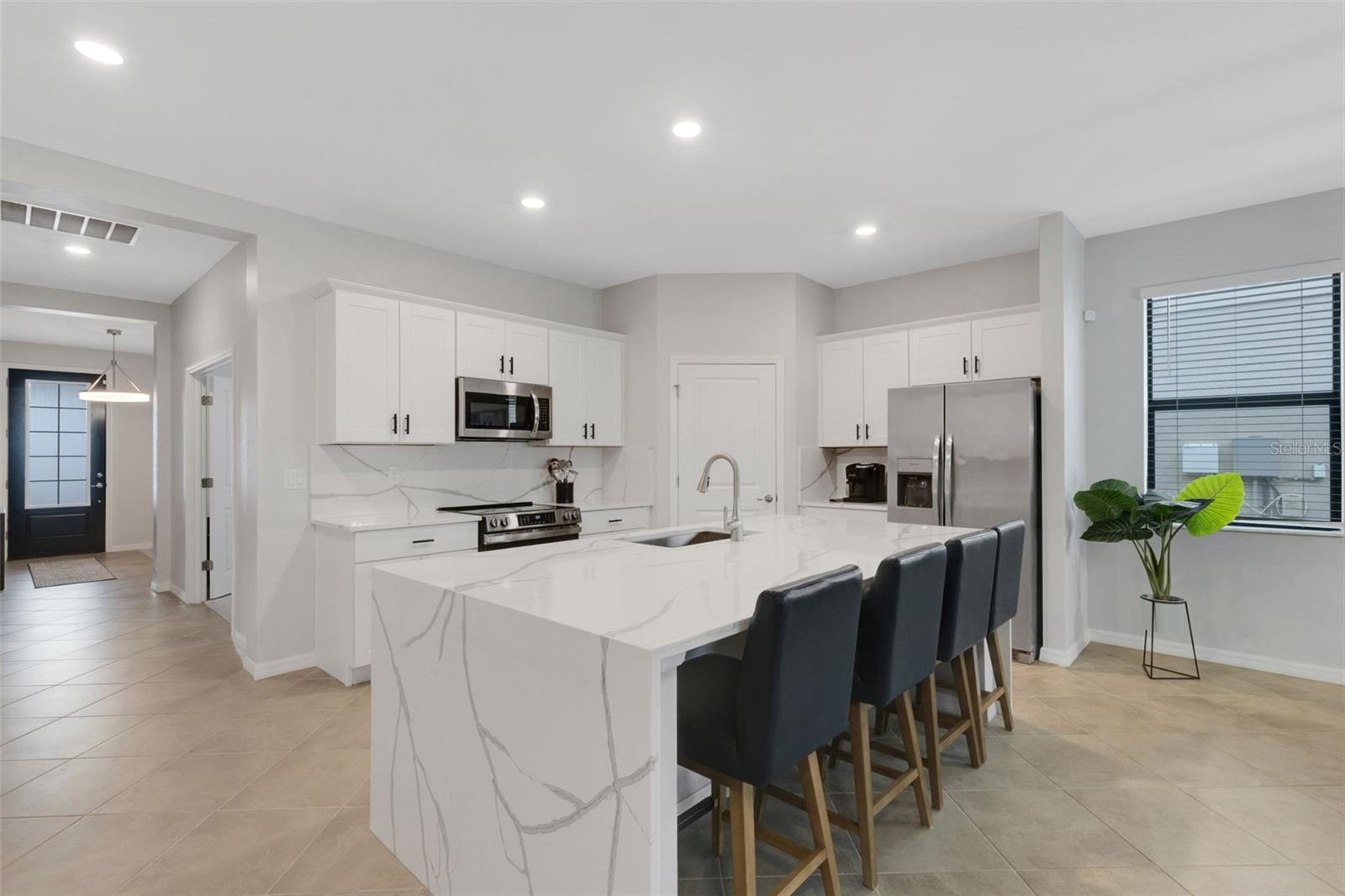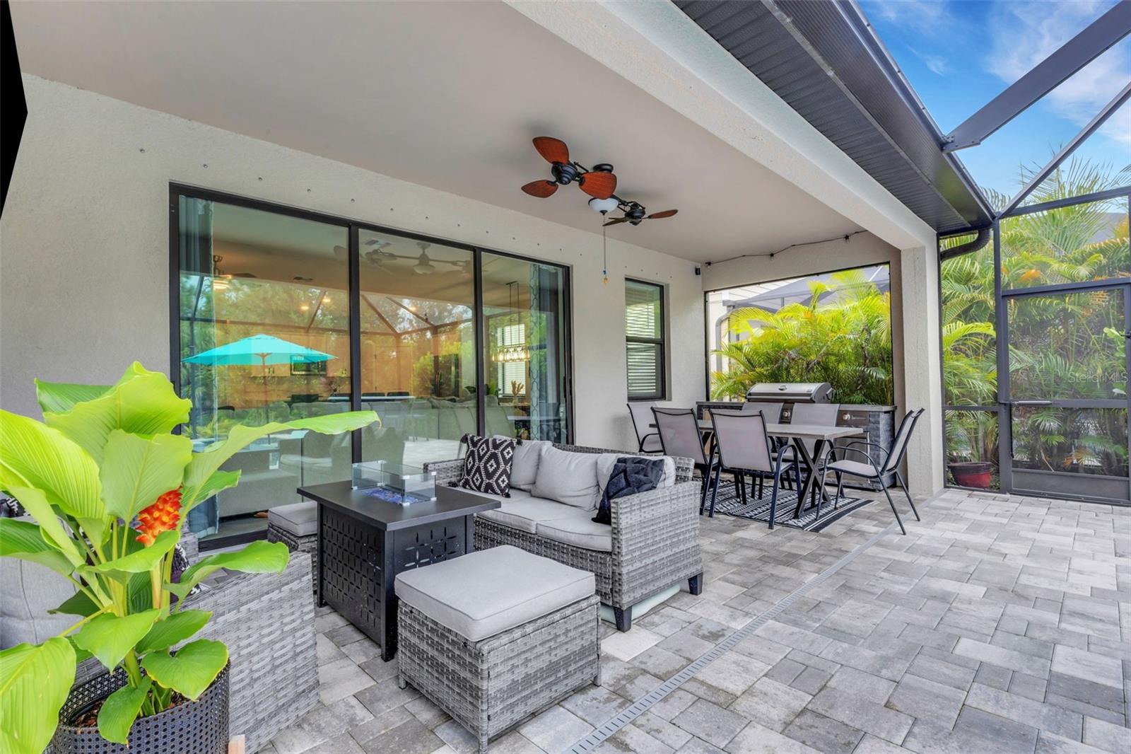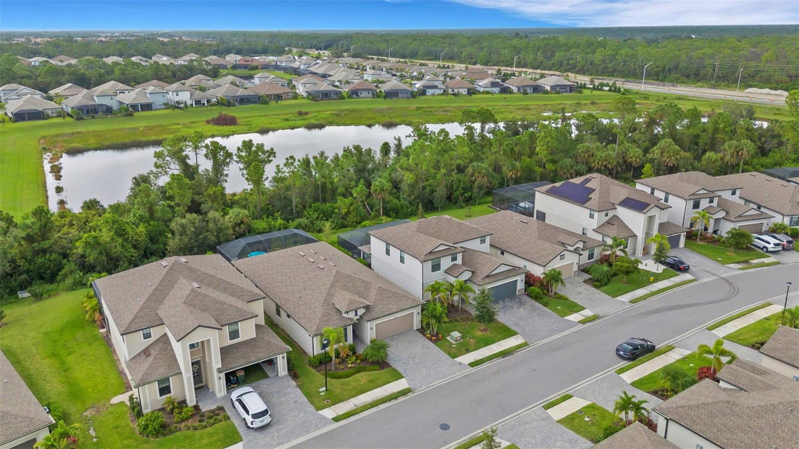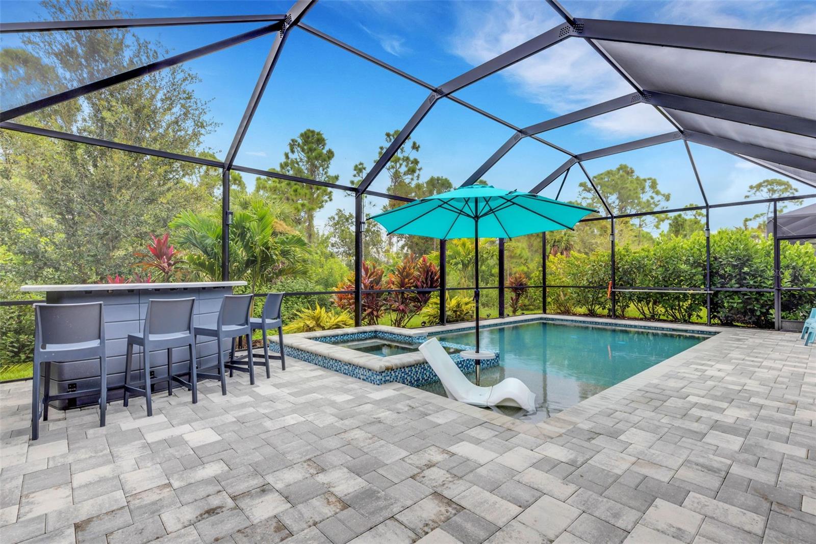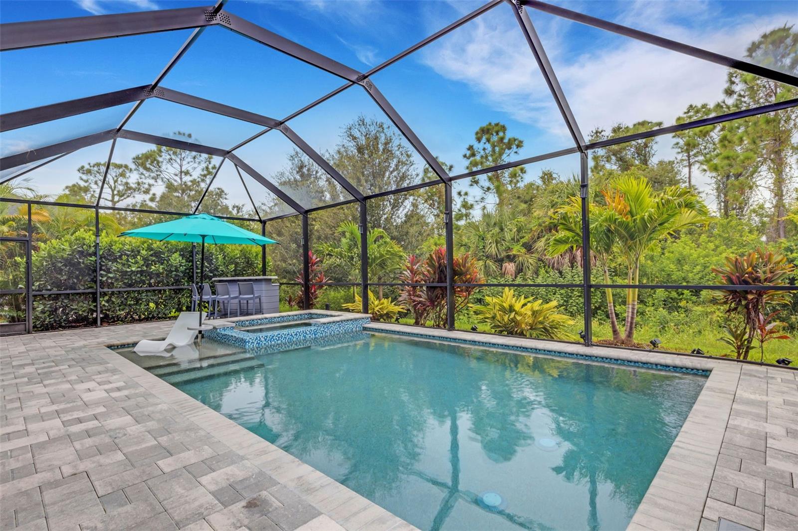 Exquisite model like home located in a X FLOOD ZONE, no flood required and LOW HOA COSTS! With Designer Finishes & Private Resort-Style Pool and Spa with Preserve Views in Wellen Park! Welcome to this beautifully designed 3-bedroom, 3-bathroom home with a versatile den/flex room, located in one of Wellen Park's most sought-after, golf cart, family-friendly communities and maintenance free! The extended driveway allows for plenty of parking. Step into the grand foyer with custom wall detailing, soaring ceilings throughout, and an abundance of natural light that sets the tone for sophistication. The CHEFS GOURMET KITCHEN features white shaker cabinetry with top moulding and designed with convenient pullout drawers for pots and pans and trash bin.CUSTOM CALACATTA QUARTZ WATERFALL COUNTERTOPS AND BACKSPLASH, an abundance of cabinets and counters for the entertainers dream, EXTENDED CENTER ISLAND, stainless steel appliances, and a spacious WALK-IN pantry--perfect for culinary enthusiasts. The open layout seamlessly flows into the dining and living areas, opening through 8' TRIPLE SLIDERS to the expansive lanai with serene preserve views, creating the perfect backdrop for breathtaking sunset evenings over the preserve and birdlife.The luxurious primary suite offers a serene retreat with TWO walk-in closets, a spa-inspired bath with soaking tub, dual sinks with granite countertops, and a tremendous large glass-enclosed shower. The junior en suite is ideal for guests or in-laws, featuring its own private bathroom with a walk-in shower. A third bedroom with a nearby full bath provides comfort and convenience for family or visitors.Enjoy the spacious den/flex room with French doors, a well-appointed laundry room with utility sink and cabinetry, this home offers peace of mind with a touch of luxury. The lanai includes outdoor lighting, paver decking, and a CUSTOM BRAND NEW ELECTRIC KEVLAR HURRICANE SCREEN SYSTEM for added protection, while the CUSTOM SALTWATER HEATED, PEBBLE TEC, SPILLOVER SPA WITH SUN-SHELF INCLUDES GLASS MOSAIC TILE transform the backyard into a PRIVATE OASIS ideal for entertaining or relaxation on one of the most secluded and peaceful lots in the community. HOA fee includes lawn mowing, mulching, trimming, fertilizing, cable and internet, irrigation and gated entry. Located just a golf cart or walking distance from Costco, Downtown Wellen Park, CoolToday Baseball Park, restaurants, shopping, and more--there's always something to do! From farmers markets, baseball games, fireworks, special events, walking groups, yoga, zumba, cycling groups, and endless recreation--this is the lifestyle you've been waiting for!