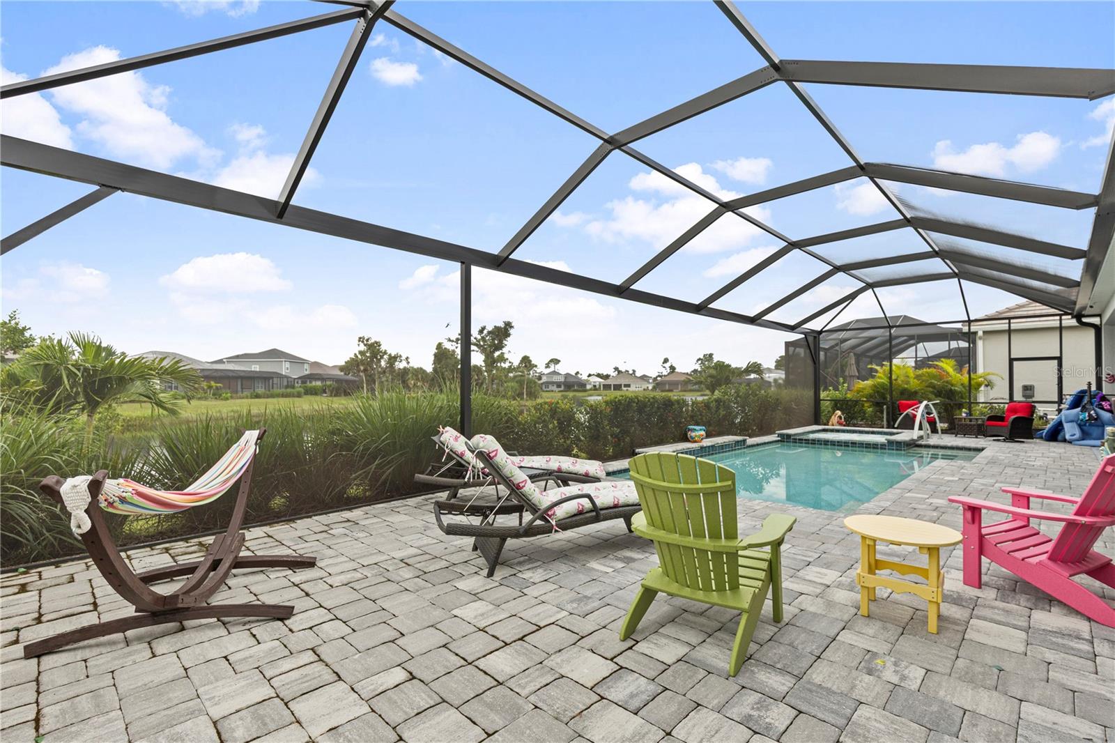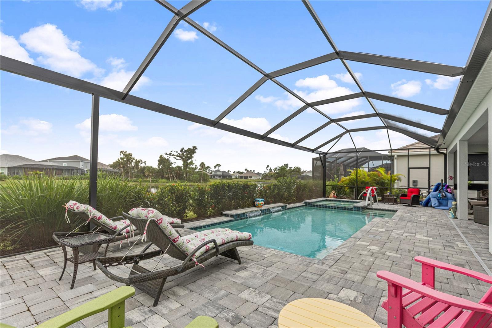 Welcome to just under 3,000 sq. ft. of refined living in this 4-bedroom plus flex room with a game room overlooking the pool and 3 full-bathroom home, oversized lot, built in 2023 and enhanced with upgrades for today's lifestyle. Set within Grand Palm, recognized as one of the Top 10 Best Master-Planned Communities in the U.S., this residence perfectly balances style, function, and peace of mind.The open design is filled with natural light and elevated by crown molding, upgraded lighting, and statement chandeliers. The kitchen is equipped with all GE Smart appliances, including a GE Smart dishwasher, and a serving window for effortless entertaining. Hurricane-rated windows, electric shades, and Guardian protection with life alert add both comfort and security.Step outdoors to your private retreat: a spacious lanai with southern exposure, an 18' x 34' saltwater pool, and an 8' x 8' spa, all operated remotely through iAqua. There is also a direct entrance to the pool from the bonus room, adding convenience and flow for indoor-outdoor living. Exceptional landscaping, a large lot, and unobstructed views provide privacy and serenity.Additional highlights include a $20,000 Generac whole-house generator (natural gas), water filtration system, and a second gated entrance for exclusivity.As a Grand Palm resident, you'll enjoy resort-style pools, a state-of-the-art fitness center, Adventure Lake with kayak launch, 28 miles of trails, pickleball, tennis, bocce, basketball, volleyball, multiple dog parks, playgrounds, and expansive green spaces.Homes with this combination of large lot, saltwater pool, spa, southern exposure, and extensive upgrades are rarely available. This is more than a home, it's a lifestyle and a lasting investment in one of not just Sarasota County's but the U.S.'s most desirable communities.Schedule your private showing today and step into the life you've been waiting for.