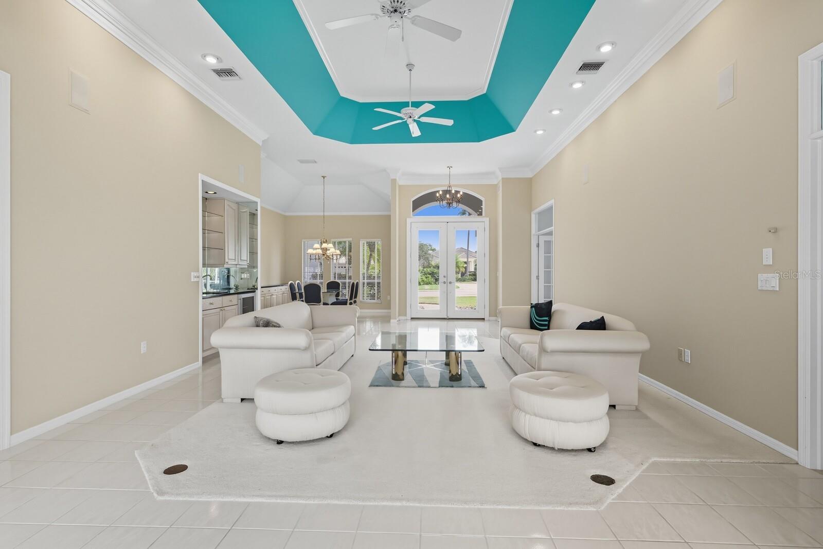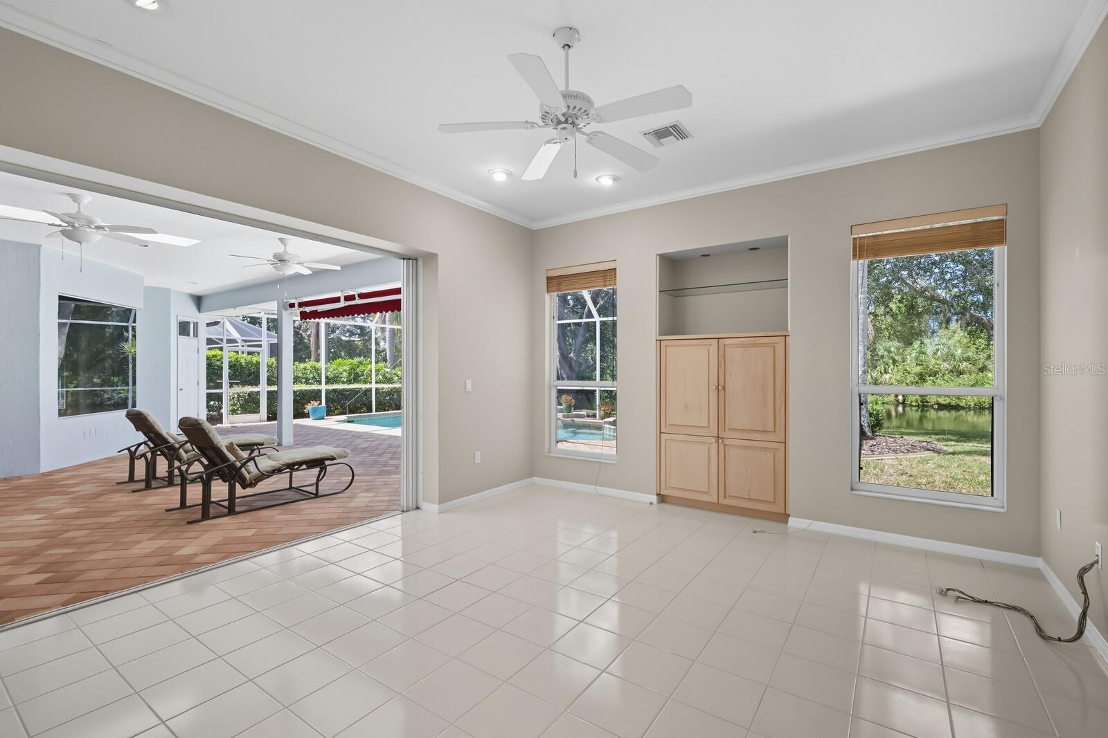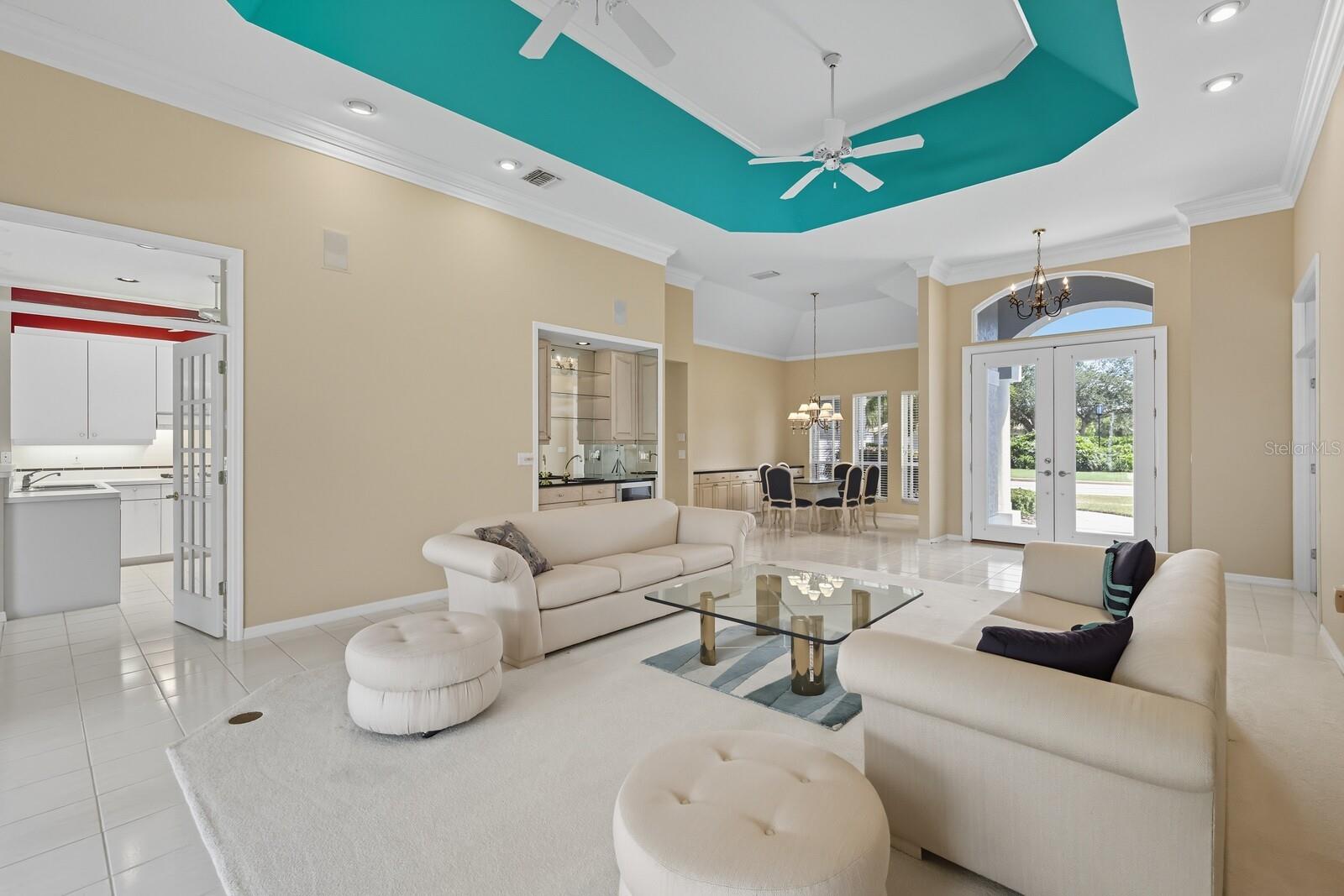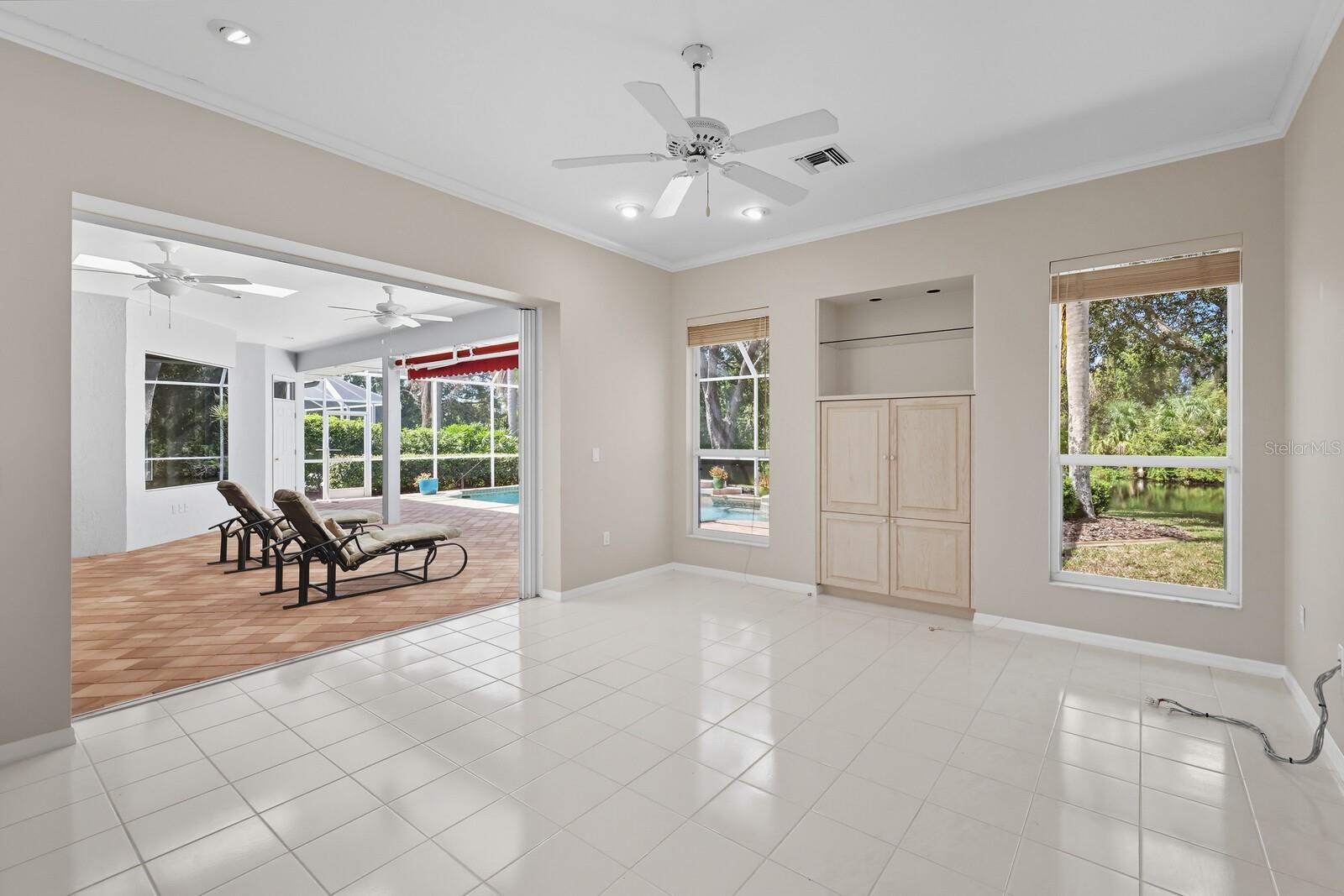 THIS LOVELY LAKEFRONT HOME IS SITUATED IN EATON PLACE, WHICH IS CLOSE TO UNIVERSITY PARK'S CLUBHOUSE AND IS IN A VERY QUIET PART OF UNIVERSITY PARK COUNTY CLUB. THE LAKEVIEW IS SPECIAL WITH NO HOMES ACROSS THE LAKE, JUST WATER AND BEAUTIFUL MATURE TREES! LOVELY FRONT ELEVATION AND LANDSCAPING. DOUBLE FRONT GLASS ENTRY DOORS OPEN TO HIGH TRAY CEILINGS AND CROWN MOLDING. THE LIVING ROOM IS OUTFITTED WITH A WET BAR, BUILT-IN CABINETS AND WINE COOLER. SEPARATE DINING ROOM WITH BUILT-IN CABINETS AND CONVENIENT COUNTERTOP SERVING AREA. OPEN KITCHEN TO FAMILY ROOM DESIGN HAS POOL AND WATER VIEWS. A CATHEDRAL CEILING ACCENTS THE DEN/OFFICE. THIS IS THE VERY POPULAR SPLIT BEDROOM PLAN, 2 FULL BATHROOMS AND A POWDER ROOM, PLUS A VERY CONVENIENT POOL BATH. BEAUTIFUL LANAI ACCENTED BY BRICK PAVERS, HEATED POOL AND SPA AND WITH FABULOUS WATER VIEW. SPACIOUS 2 CAR GARAGE PLUS SEPARATE GARAGE DOOR FOR YOUR GOLF CART!