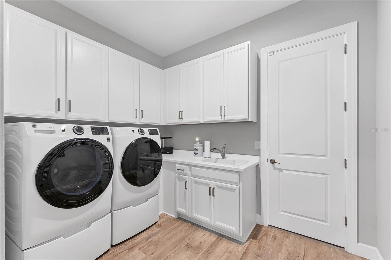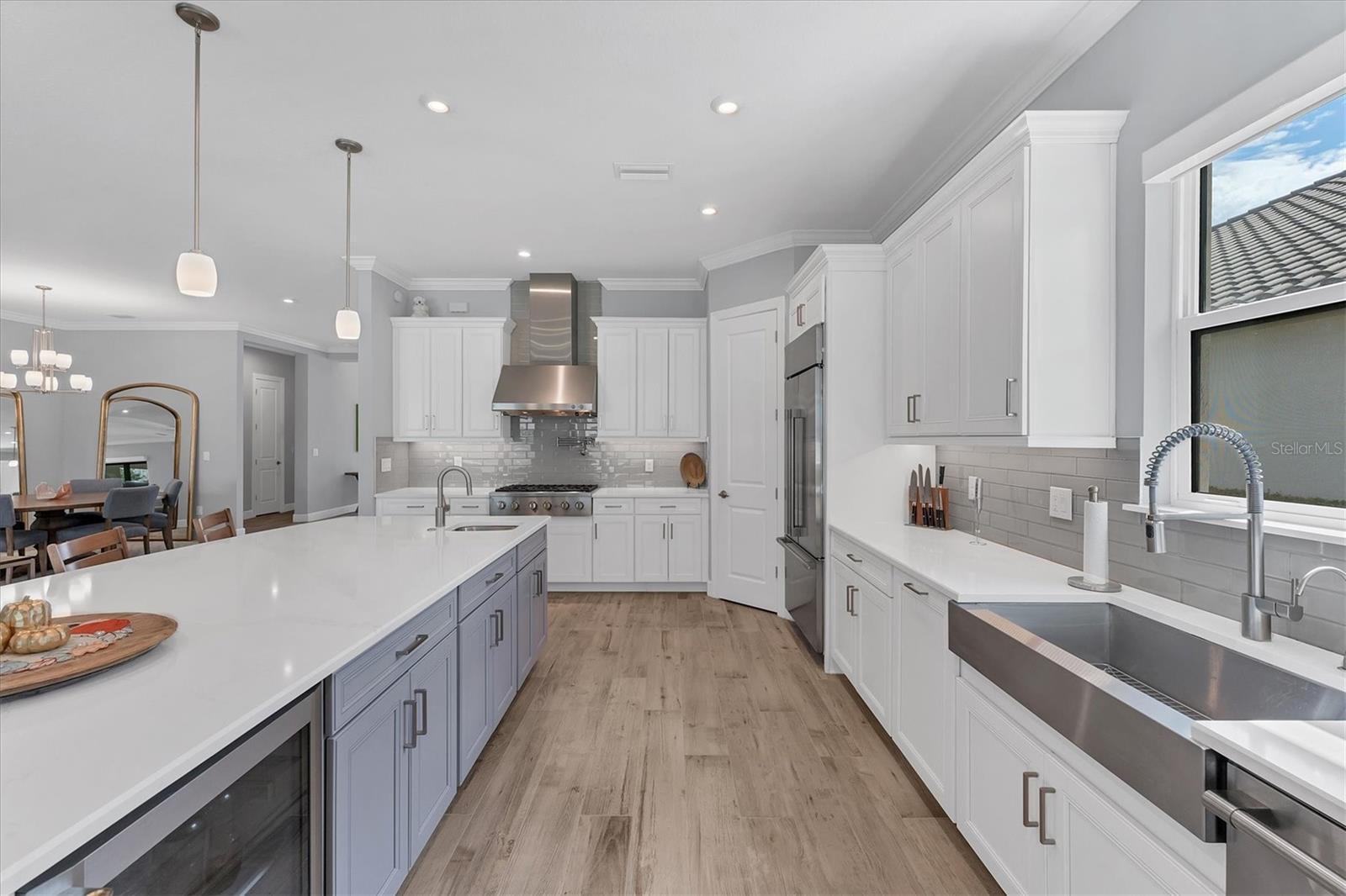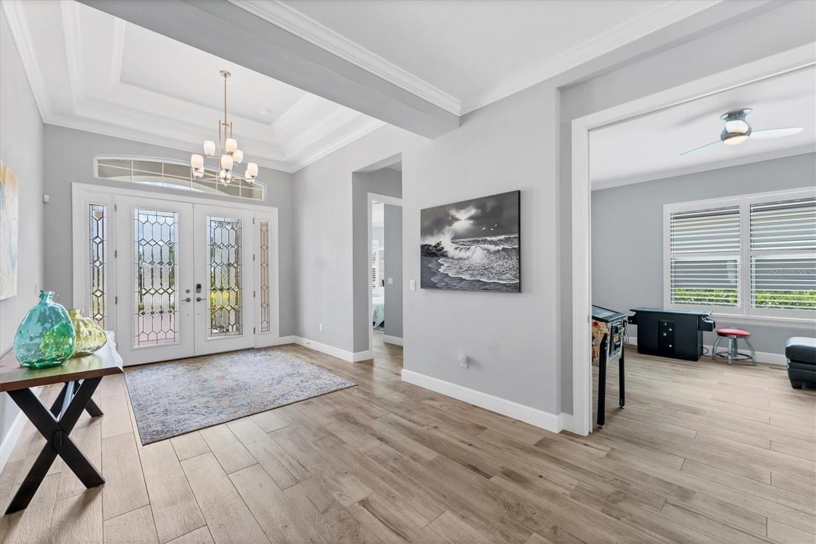 EXQUISITELY DESIGNED POOL HOME IN THE PREMIERE GOLF COMMUNITY OF ESPLANADE AT AZARIO, OFFERING MAGNIFICENT GOLF COURSE VIEWS AND GOLF CLUB MEMBERSHIP IS INCLUDED! This beautifully appointed residence showcases a unique blend of luxury and design, featuring a spacious Great Room overlooking picturesque golf course vistas that seamlessly transition to an exceptional outdoor living space thoughtfully designed for contemporary living. Expansive Travertine Shellstone Lanai surface, Covered Gathering areas, an OUTDOOR KITCHEN WITH BAR, GAS FIREPLACE, SPARKLING SALTWATER HEATED POOL AND SPA with Pebbletec finish and Panoramic Clear Vue Screen overlooking golf and water views is ideal for embracing the Florida lifestyle. Elegant interior finishes include PORCELAIN TILE FLOORS, TRAY CEILINGS, CROWN MOLDING, QUARTZ COUNTERTOPS, 8 FOOT DOORS, and IMPACT WINDOWS AND DOORS throughout along with plantation shutters and motorized shades in great room and kitchen. This area integrates a dining space and a gourmet-style kitchen, perfect for both entertaining and relaxation. The chef's kitchen is equipped with wood cabinetry, tile backsplash, a generous island with a breakfast bar for casual dining, additional prep sink, GE MONOGRAM APPLIANCES including a built-in refrigerator and oven, 6 burner gas cooktop with pot filler, professional series range hood with warming lamps, R.O. water filtration, walk-in pantry, and a beverage center. Retreat to the private owner's suite with bay window providing serene outdoor views and a lavish bath featuring a dual bowl vanity with dedicated makeup area, an expansive walk-in shower with multiple shower heads and a generous built-in closet. The desirable split bedroom and bath plan ensures privacy for family and guests, with an ensuite bedroom and bath and front bedroom adjacent to the hall bath which includes a king-size Murphy bed. The versatile study is ideal for a home office, game room, or your favorite hobbies. A separate laundry room includes a convenient drop-in sink, upper and lower cabinets, and front-load washer and dryer. The three-car tandem garage, complete with an epoxy finish floor, offers ample space for a golf cart. Complimented by a paver drive and walkway, outdoor lighting, gutters, barrel tile roof, whole house KOHLER GENERATOR and TANKLESS GAS WATER HEATER with RECIRCULATING PUMP, this exceptional home is conveniently situated across the street from a satellite pool, dog park, and community garden. The highly amenitized community boasts a socially active resident CLUBHOUSE, state-of-the-art FITNESS CENTER, Spa and SALON, TENNIS and PICKLEBALL courts, RESORT STYLE POOL with BAHAMA BAR, CULINARY CENTER, BARREL HOUSE BISTRO and an 18-HOLE CHAMPIONSHIP GOLF COURSE, PRO-SHOP and AQUA DRIVING RANGE. Experience life in Lakewood Ranch, the nation's #1 multi-generational community, where you are minutes to dining, shopping and events at Lakewood Ranch Main Street and Waterside Place. The location offers close proximity to the UTC Shopping Mall, Benderson Rowing Park, New Mote Marine Aquarium, and I-75 for convenient travel north and south, and you are approximately 30 minutes from downtown Sarasota's vibrant cultural venues, diverse dining options, and our stunning Gulf Coast Beaches!