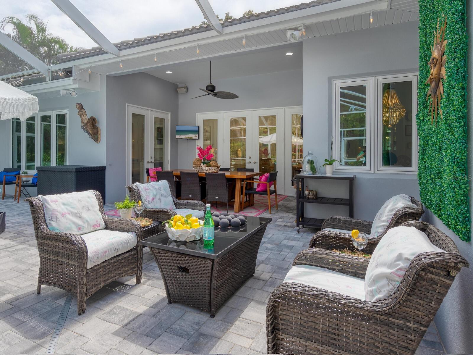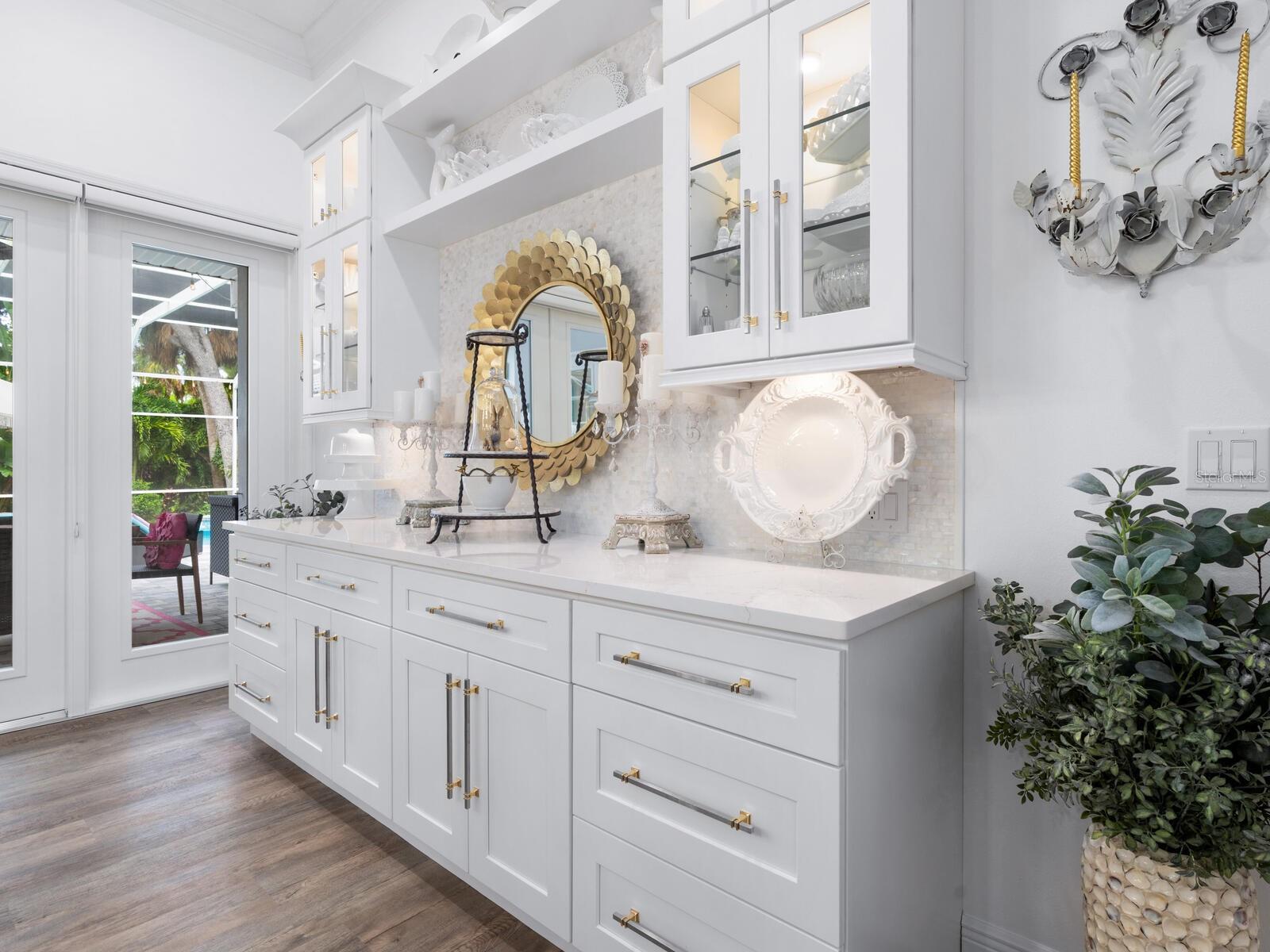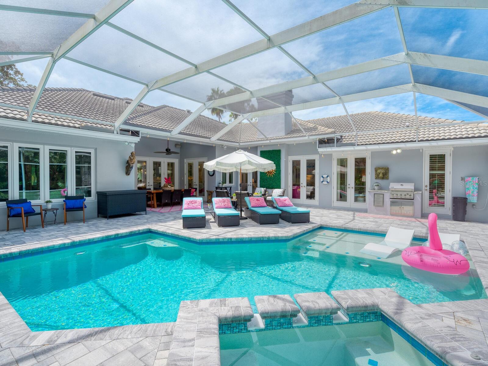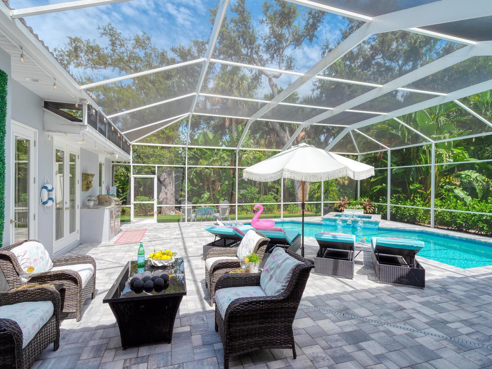 Step into this captivating home, a meticulously renovated open floor plan with soaring ceilings, four spacious bedrooms and three full baths. The perfect home for hosting effortless events, with a gorgeous, formal dining room, complete with a comfortable gathering spot, a sleek bar and French doors that open out to the covered dining area. The home flows effortlessly for indoor and outdoor entertaining. The open concept kitchen overlooks the family room with both a cozy breakfast nook and a large bar that seats six. If you're staying in, the kitchen is equipped with a six-burner gas stove, top-tier appliances, expansive countertops and custom pull-out cabinetry. The butler's pantry makes take-out a breeze and also offers a prep station for holidays and large parties. Stepping into the owners retreat, you will find a sanctuary in the spa-like en suite bath. With private access to the pool, you can grab your coffee at the morning bar and head out for a swim. Snuggle in front of the fireplace or relax in the plush seating area. Meanwhile your guests will love the large in-law suite with a private entrance, alongside two additional bedrooms. Cool off in the stunning pool, completely renovated with a spa, LED lighting and a pavered deck, nestled in a serene, private setting. In the evening, take a walk or a bike ride and explore this beautiful gated community. This fully finished masterpiece is the ultimate move-in ready retreat.