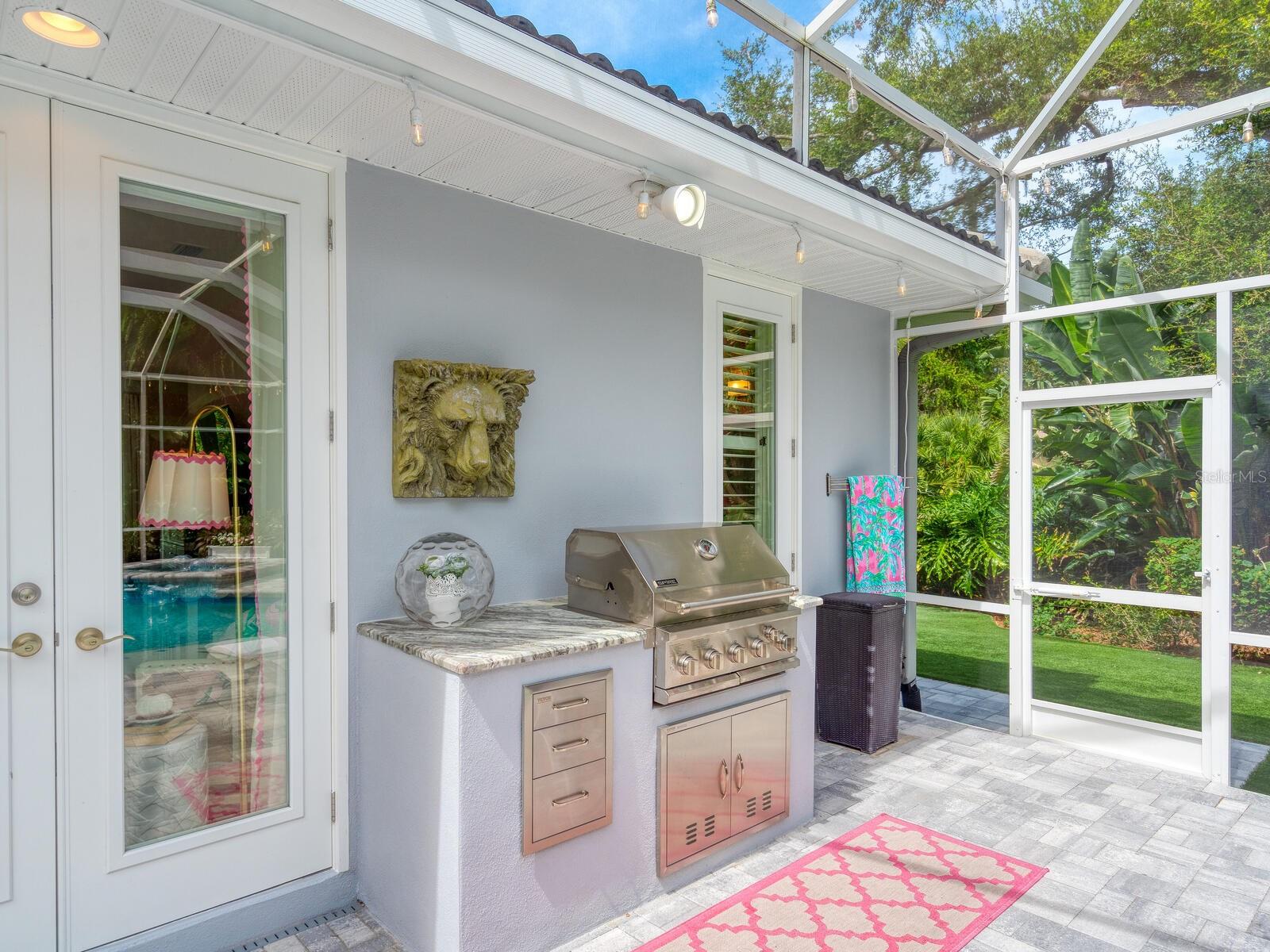 Exterior: French Doors, Garden, Lighting, Outdoor Grill, Outdoor Kitchen, Private Mailbox, Rain Gutters, Sidewalk