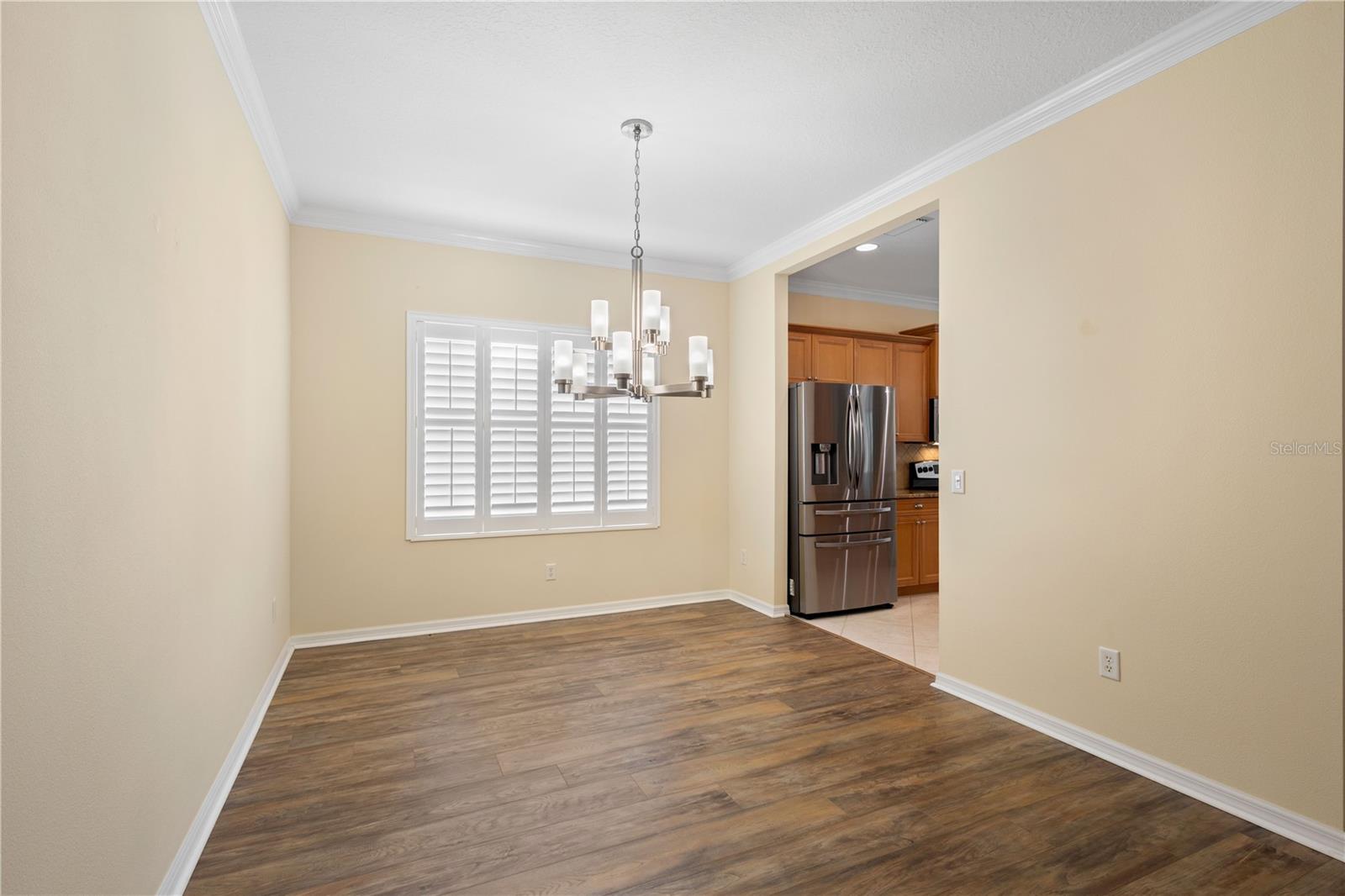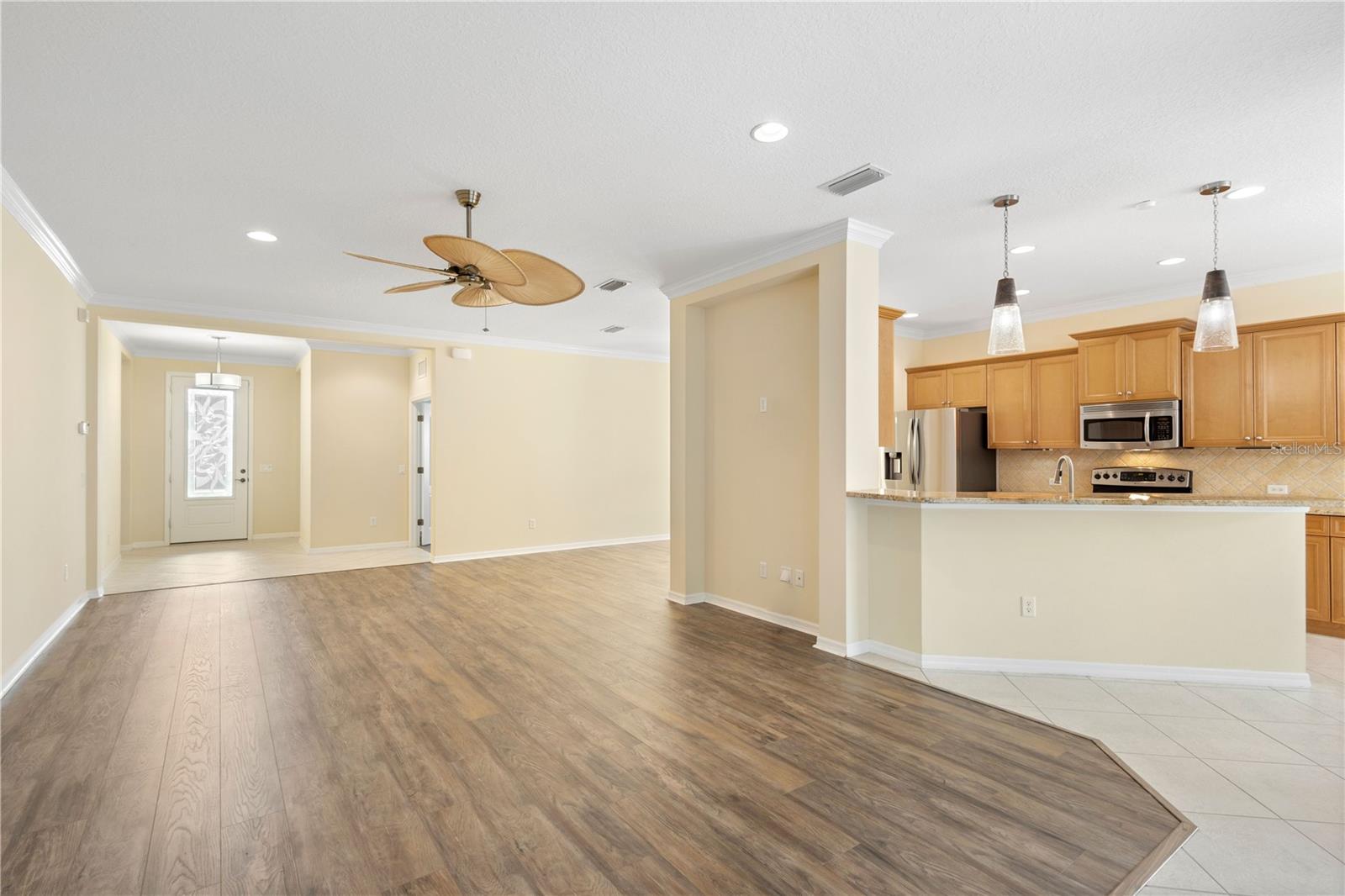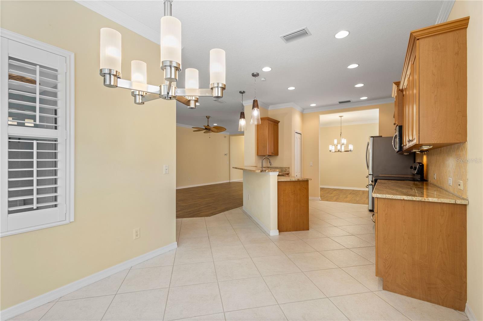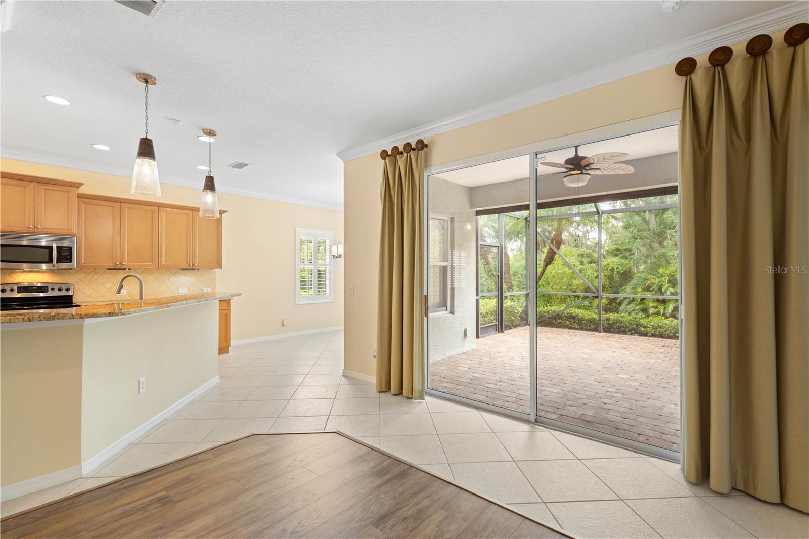 One or more photo(s) has been virtually staged. Tucked within the gated community of Forest Creek, this 3 bedroom, 2 bathroom plus a den home is perfectly situated on a peaceful preserve, offering serene views and a private backdrop for everyday living. As you step inside, you'll notice the thoughtful layout featuring updated luxury vinyl plank flooring, crown molding, plantation shutters, and an abundance of natural light . From there, the home flows seamlessly into the living room where you'll notice the formal dining room, and spacious kitchen that is designed for both style and functionality with granite countertops, a tasteful tile backsplash, plenty of cabinetry, plus a bright breakfast nook that looks out toward the preserve. The primary suite serves as a quiet retreat, while two additional bedrooms share a guet bathroom with a beautifully updated walk-in shower. Your very own private oasis awaits as you step outside to the extended lanai, complete with a hurricane-rated roll-down screen and tranquil views--perfect for coffee in the morning or entertaining in the evening. Recent updates include a newer roof (November 2024) and A/C system (2023), both with transferrable warranties. This lovely Florida Costal inspired home combines modern upgrades with peace of mind. With low HOA fees and plenty of amenities such as a pool, clubhouse, walking trails, and scenic lakes, all in a location convenient to shopping, dining, and I-75.