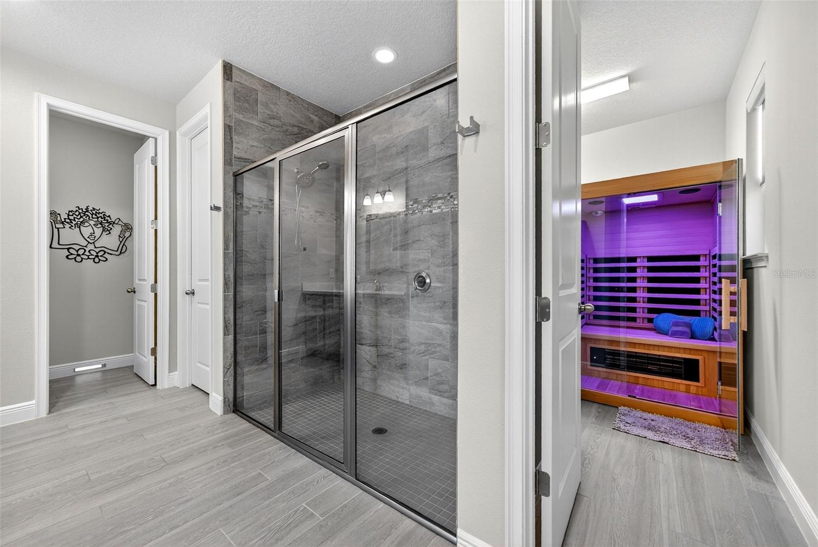 Exterior: Garden, Hurricane Shutters, Lighting, Outdoor Grill, Outdoor Kitchen, Rain Gutters, Sauna, Sidewalk, Sliding Doors, Tennis Court(s)