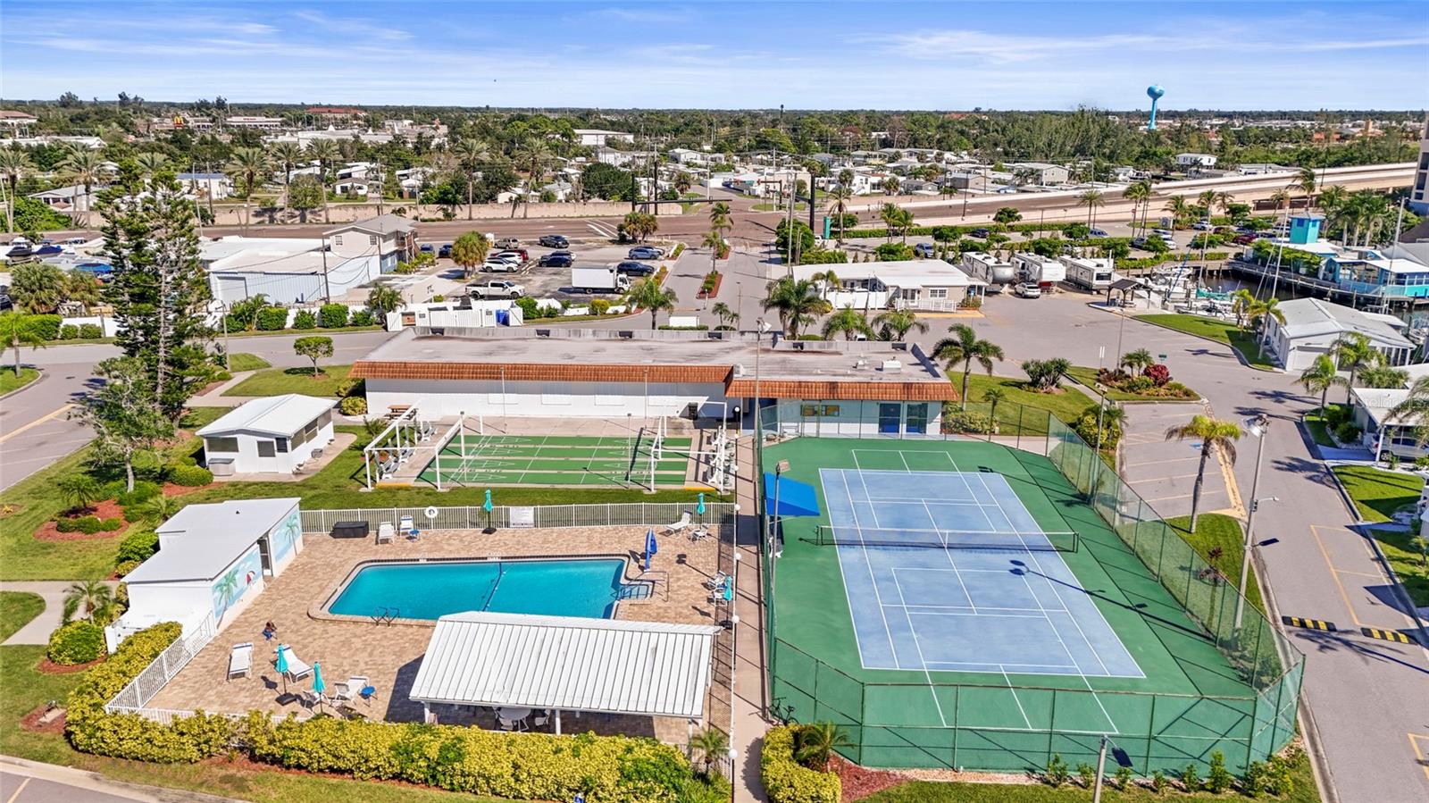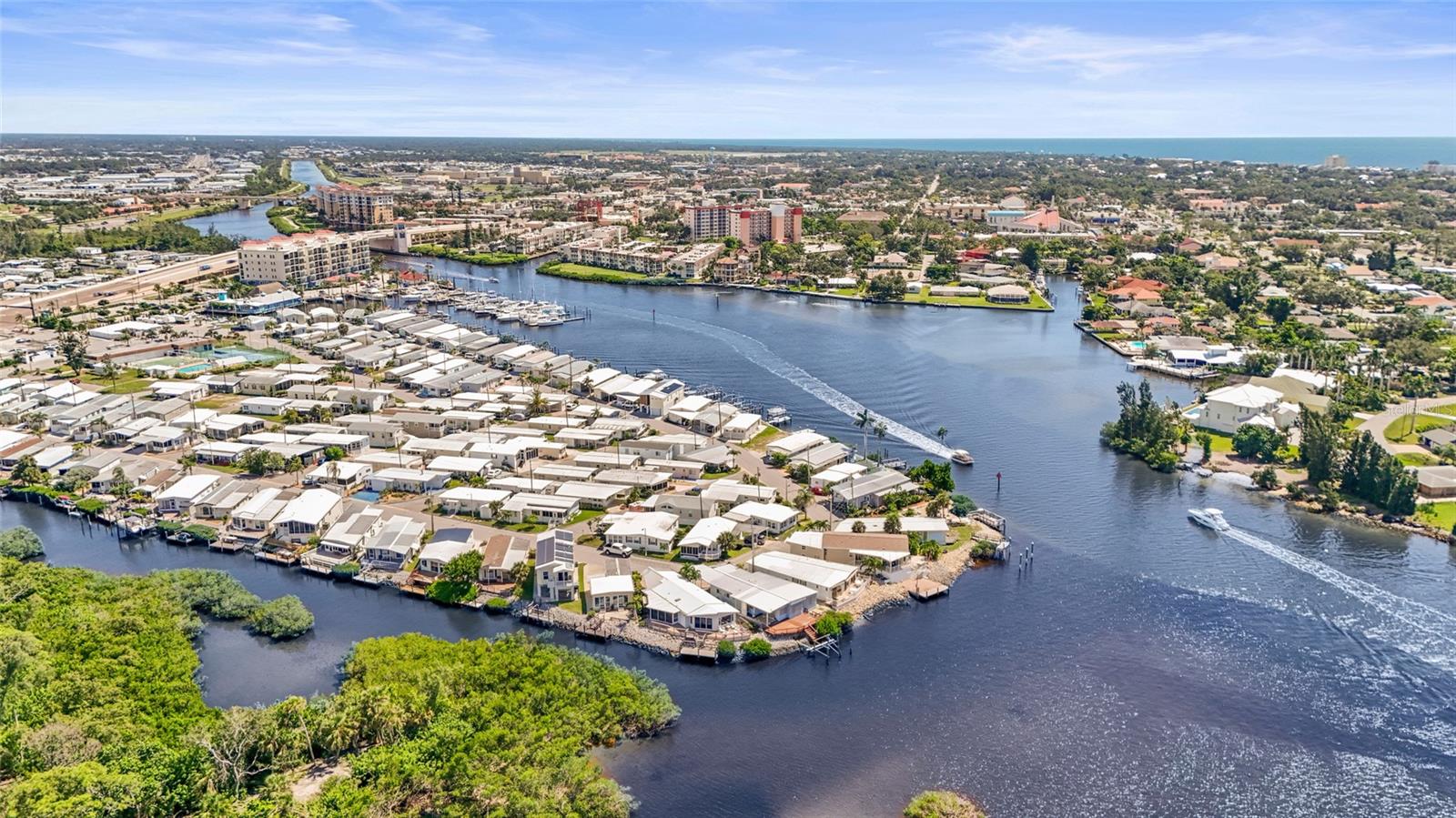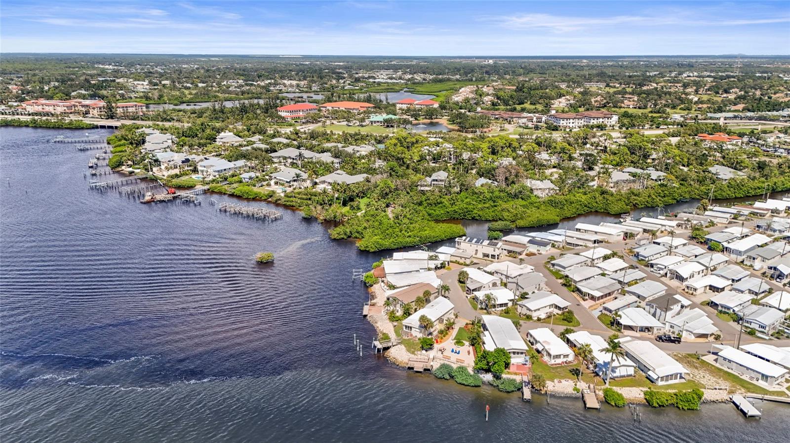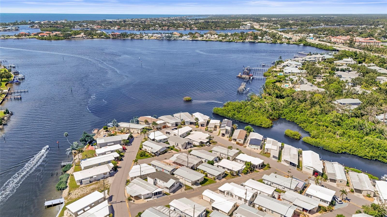 Enjoy stunning panoramic views of Roberts Bay from three hurricane-rated sliding doors. Watch dolphins, manatees, and seabirds from your own backyard! Opportunity to add a boat lift or dock in this sailboat water access and take a 5-minute ride to the Gulf of Mexico -- no bridges!This home features a large deck for dining, entertaining, and relaxing while overlooking the bay. Electric retractable Sunbrella awnings provide shade, and the sunsets are nothing short of spectacular.Inside you'll find 1,400 sq. ft. of open living space, 2 bedrooms, 2 full baths, and brand-new porcelain tile. The kitchen boasts granite countertops, newer appliances, and a great flow into the dining and living room. The guest room doubles as an office with a Murphy bed. The home also includes a full-size laundry room, mirrored walls to reflect water views, and a built-in wet bar.Additional upgrades include newer A/C, track lighting, and a large covered carport with paver driveway, tool/work room, and storage.Located in a vibrant 55+ waterfront community with low HOA fees, resort-style pool, tennis, clubhouse, and daily activities. Move-in ready, meticulously maintained, and perfect for entertaining -- watch fireworks from your deck. Enjoy and easy walk across the Venice Bridge and stroll through Downtown Venice Ave. Pets are welcome!