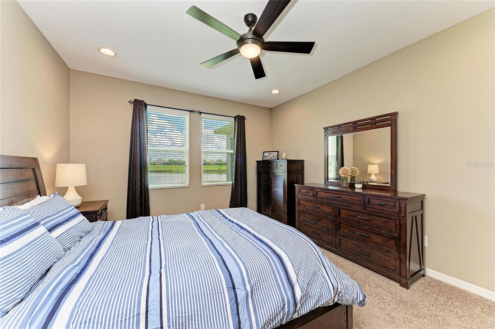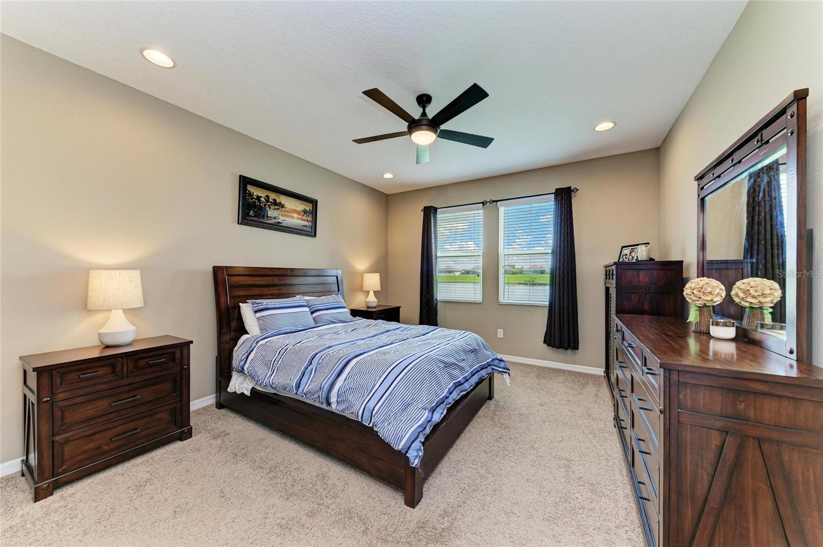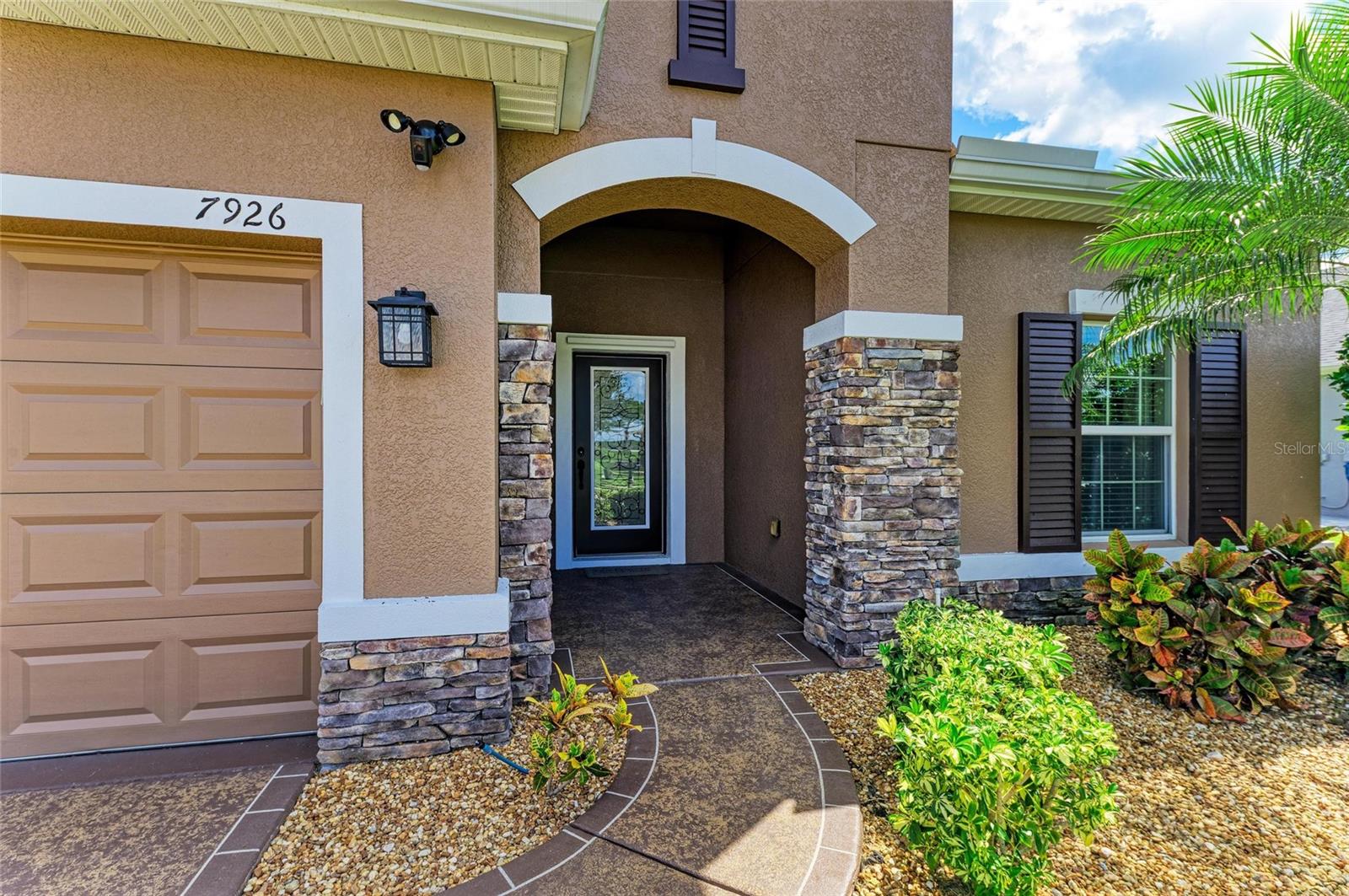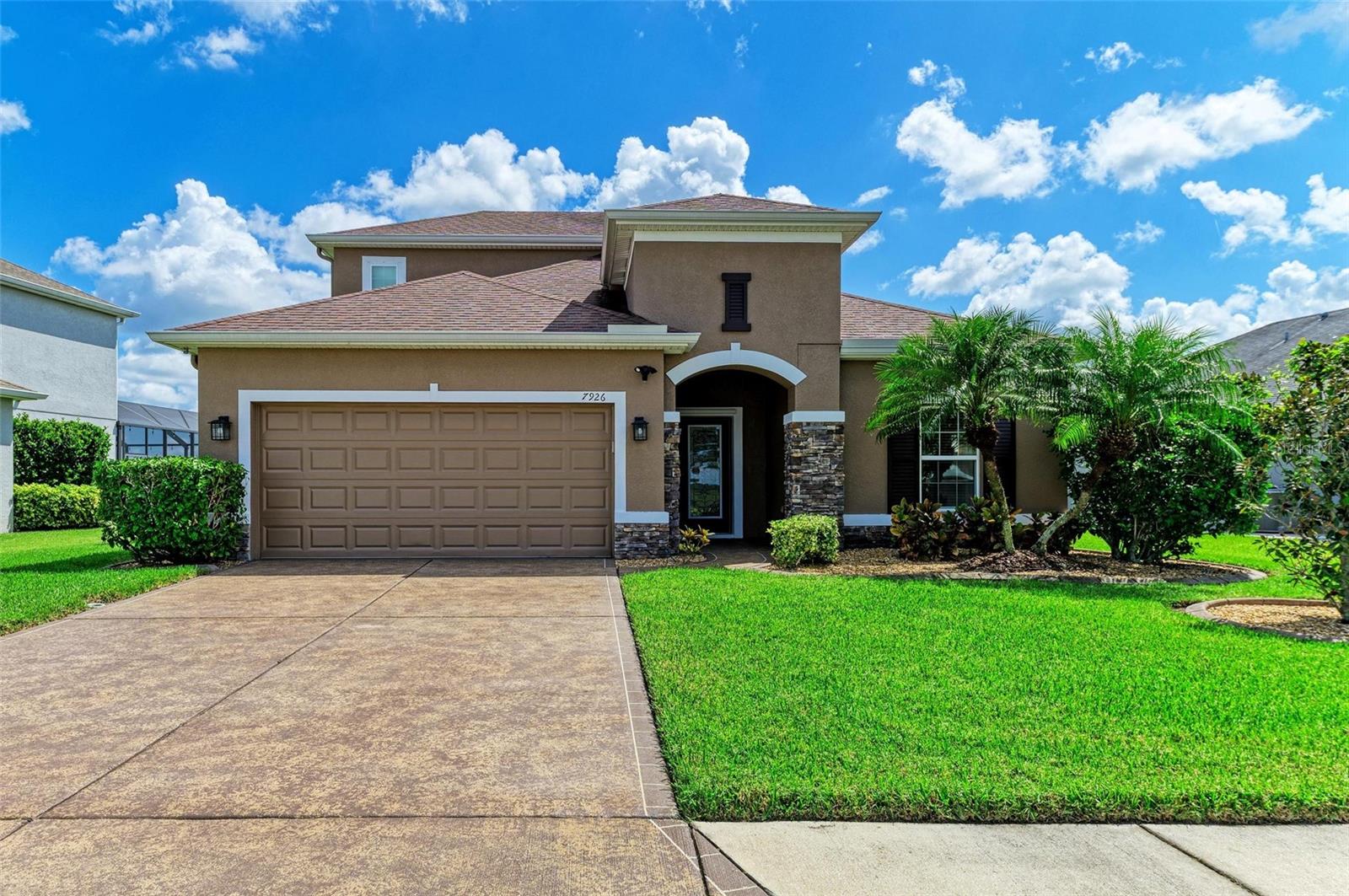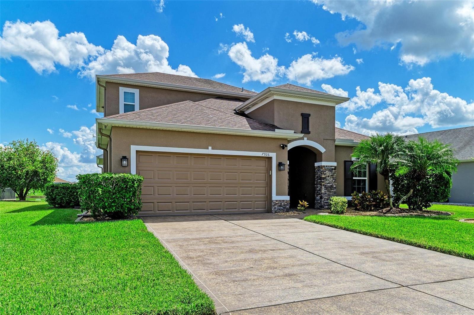 Welcome to this beautifully maintained 4-bedroom, 3-bathroom home with a 2-car garage and nearly 2,400 sq ft of living space, located in the highly desirable gated community of Copperstone. From the moment you arrive, you'll notice the professional landscape curbing, a decorative stained driveway, and a stunning glass front door. Inside, the home features a split floor plan with the master suite privately tucked away and offering peaceful water views, a spacious walk-in closet, and a spa-like bath with dual sinks, granite countertops, and a tiled walk-in shower. On the opposite end of the home, you'll find three additional bedrooms along with a full bathroom featuring dual sinks, granite counters, and a tiled shower/tub combo. The main living areas are finished with tile flooring throughout for easy care and style. The gourmet kitchen overlooks the family room, making it perfect for entertaining. The kitchen is equipped with granite countertops, pendant lighting, a tiled backsplash, stainless steel appliances, and tall espresso cabinets with crown molding. Just off the kitchen, enjoy easy access to the screened lanai, where you can relax and take in sunrises over the water. The oversized backyard has plenty of room for a pool and can be fenced for additional privacy. Upstairs, a large bonus area with a full bathroom offers endless possibilities--ideal for a home theater, playroom, or guest suite. Additional features include gutters, hurricane shutters, and an irrigation system. The home is ideally situated on a quiet dead-end street with minimal traffic for added peace of mind. Copperstone residents enjoy a wealth of community amenities including two resort-style pools, a playground, sport courts, a clubhouse, and secure gated access. Families will love being within walking distance to a new elementary school and high school. Perfectly located, Copperstone is just minutes from shopping, dining, Fort Hamer boat launch, and two new county parks. With quick access to I-75, you'll be at the beaches, Tampa, St. Pete, Sarasota, or two major airports within 45 minutes or less. This home offers the perfect balance of space, style, and community living. Don't miss your chance to call Copperstone home!
